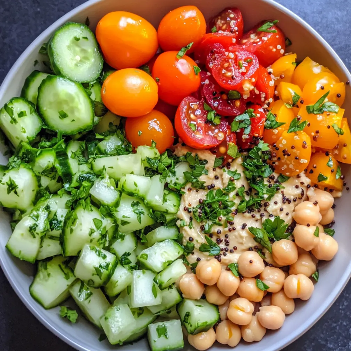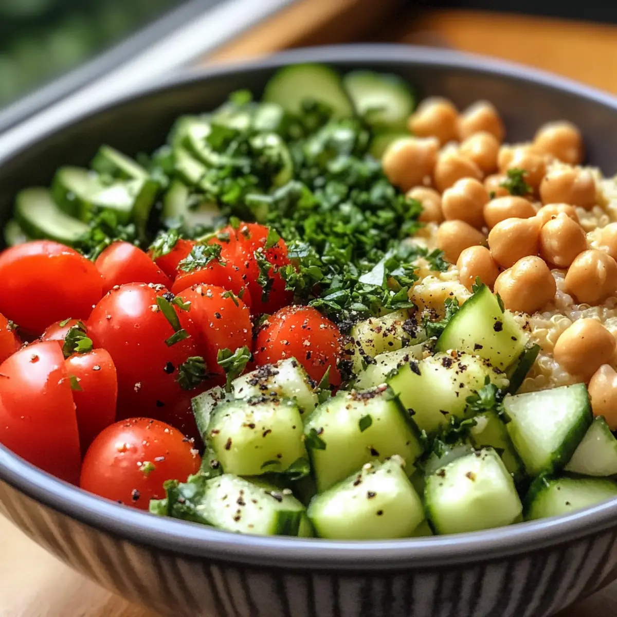 Jump to Recipe Print RecipeIn just five minutes, you can whip up a vibrant 5-Minute Mediterranean Bowl that transforms your lunch routine! Picture a colorful mix of crunchy cucumbers, juicy tomatoes, and creamy hummus all star players in this nutrient-packed, vegan delight. One of the best perks? It’s perfect for meal prep, allowing you to savor a wholesome, gluten-free meal whenever you’re in a pinch. Plus, with so many ingredient variations, you can customize it to fit your taste and dietary needs effortlessly. Are you ready to explore how easy it is to create your new favorite dish? Let’s dive in! Why Is This Bowl a Must-Try? Quick and Easy: In just five minutes, you can have a colorful, nutritious meal ready to enjoy. Perfect for busy days! Flavor Explosion: The combination of fresh vegetables, creamy hummus, and zesty seasonings creates a delicious culinary experience. Meal Prep Hero: Ideal for meal prepping, this bowl stays fresh and tasty for several days, making weekday lunches a breeze. Customizable: With endless variations, you can swap ingredients like quinoa for brown rice or even add feta for richer flavors. If you’re looking for more healthy salads, check out our Mediterranean Chickpea Feta recipe! Nutrition Packed: High in fiber and antioxidants, this bowl supports your wellness goals while being totally satisfying. 5-Minute Mediterranean Bowl Ingredients Discover the essential ingredients for a delicious 5-Minute Mediterranean Bowl that will elevate your meal prep game! For the Salad Cucumber – Adds crunch and hydration; ensure it’s fresh and diced for the best texture. Tomatoes – Provide juiciness and sweetness; cherry tomatoes can be a fun substitute. Spring Onions – Offer a mild onion flavor and crunch; yellow onions can work in a pinch. Parsley – Fresh herb for flavor and color; cilantro is a great alternative if preferred. For the Oils & Seasoning Olive Oil – Adds healthy fats and richness; feel free to substitute with avocado oil for a different taste. Salt – Enhances the flavors of all ingredients; remember to adjust to your taste preference. For the Protein & Grains Chickpeas – Supply plant protein and fiber; using canned chickpeas makes preparation a breeze. Quinoa – A gluten-free grain that adds protein; you can substitute with brown rice or omit for fewer carbs. For the Creamy Toppings Hummus – Creamy base that adds flavor; homemade is wonderful, but store-bought is just as easy. Tzatziki – Adds a refreshing element; use either dairy or non-dairy versions based on your preference. For the Extras Olives – Provide a briny flavor; feel free to omit if olives aren’t your favorite. Step‑by‑Step Instructions for 5-Minute Mediterranean Bowl Step 1: Prepare the Salad Begin by dicing a fresh cucumber, halving cherry tomatoes, and finely slicing spring onions. Chop a handful of parsley for a burst of flavor. In a medium mixing bowl, combine these vibrant ingredients with a drizzle of olive oil and a sprinkle of salt. Toss gently to ensure everything is evenly coated, creating a colorful salad base for your 5-Minute Mediterranean Bowl. Step 2: Assemble the Bowl Take a large bowl or plate and layer your prepared salad mixture as the base. Aim to fill the bowl halfway with the chopped vegetables, allowing their bright colors to shine through. This step sets the stage for your Mediterranean Bowl, providing a foundation that is both healthy and visually appealing. Step 3: Add Proteins Open a can of chickpeas and drain them thoroughly. Measure about 1/3 cup of these protein-packed legumes and sprinkle them generously on top of your salad. The chickpeas not only contribute essential nutrients but also add a hearty texture to your 5-Minute Mediterranean Bowl, making it satisfying and delicious. Step 4: Include Grains Next, measure out 2-3 tablespoons of cooked quinoa. Gently scatter the quinoa over the chickpeas and salad, allowing it to intersperse beautifully. This gluten-free grain complements the other components perfectly and enhances the protein content of your Mediterranean Bowl, creating a well-rounded meal. Step 5: Finish With Spreads Now it’s time to add the creamy elements! Take 2 tablespoons of hummus and dollop it onto the top of your bowl, letting it mingle with the other ingredients. Then, add 1 teaspoon of tzatziki for an extra layer of refreshing flavor. The creamy textures bring a delightful contrast to the crunchy and vibrant vegetables in your 5-Minute Mediterranean Bowl. Step 6: Season and Serve Finally, give your bowl a fresh touch by grinding black pepper over the top to taste. This adds an aromatic finish that enhances the overall flavor profile. You can serve your 5-Minute Mediterranean Bowl chilled or at room temperature, making it a perfect quick meal or snack option ready to enjoy! How to Store and Freeze 5-Minute Mediterranean Bowl Fridge: Store your salad components separately in airtight containers for up to 1-2 days, keeping the ingredients fresh and crisp. Freezer: While it’s best to consume this bowl fresh, you can freeze the chickpeas and quinoa together for up to 3 months. Thaw overnight in the fridge before use. Reheating: If you prefer warmed ingredients, gently heat the chickpeas and quinoa on the stovetop or in the microwave, but avoid heating the fresh salad components to maintain their crunch. Meal Prep Reminder: For the best results, prepare the elements of your 5-Minute Mediterranean Bowl in advance and assemble them just before serving. This way, every bite is deliciously fresh! What to Serve with 5-Minute Mediterranean Bowl? Elevate your 5-Minute Mediterranean Bowl into a full, satisfying meal with delicious pairings that enhance its vibrant flavors! Garlic Bread: The buttery crunch of garlic bread complements the bowl’s freshness, making for a comforting Italian twist. Roasted Vegetables: A mix of seasonal veggies brings caramelized sweetness, creating a delightful contrast to the bowl’s