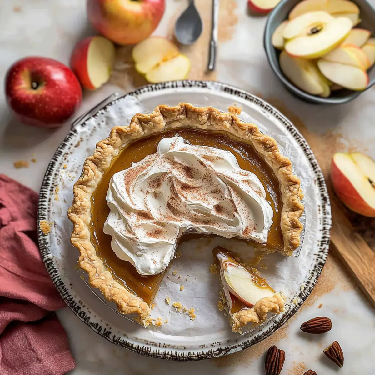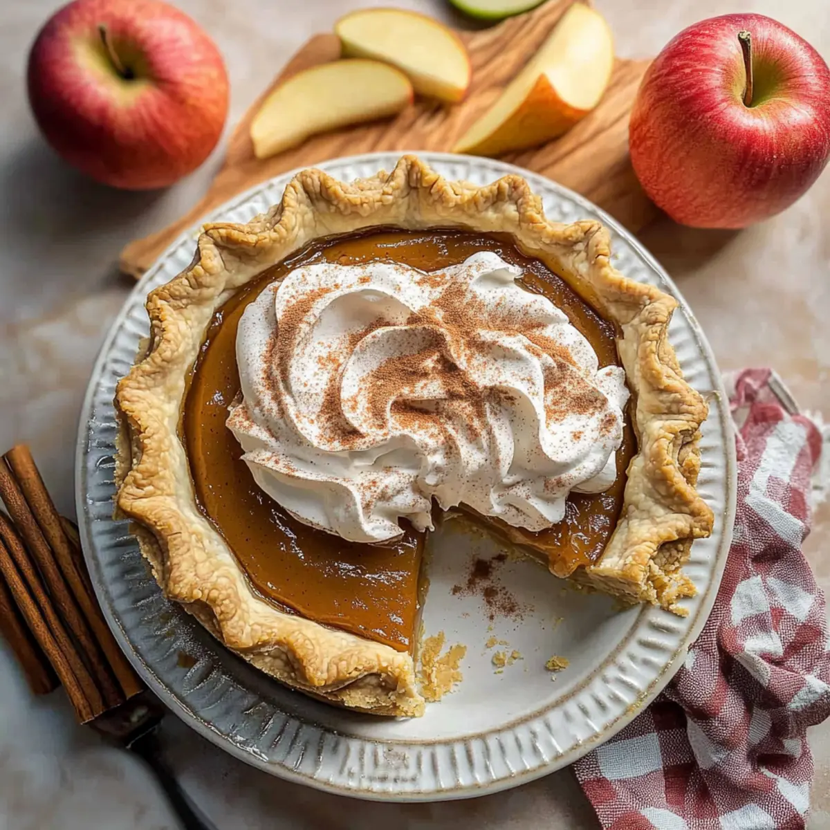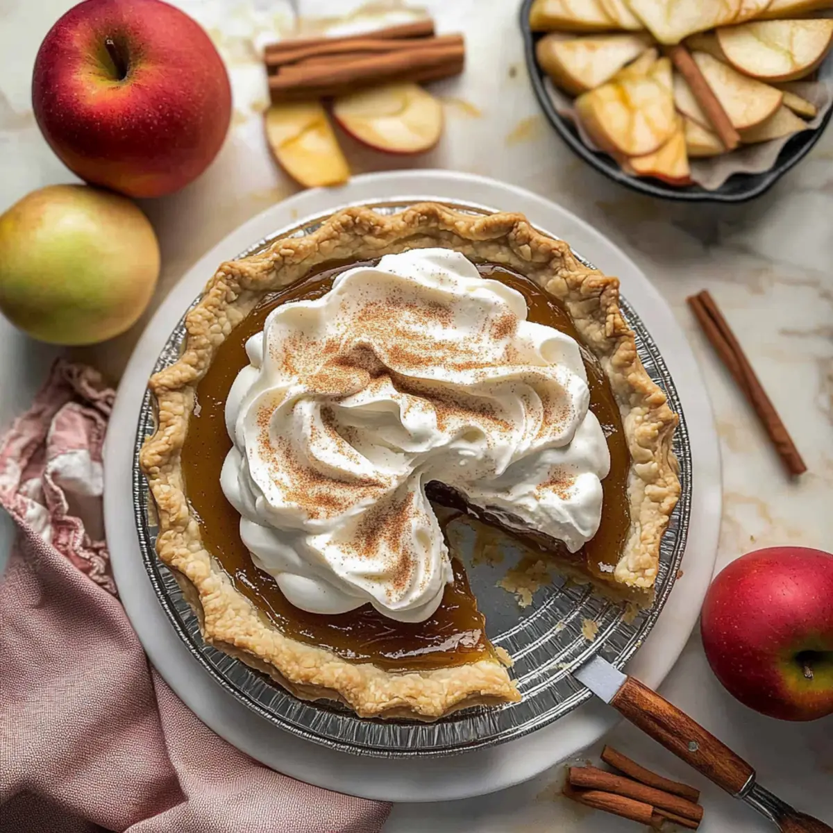 Jump to Recipe Print RecipeAs I pulled the warm pie out of the oven, a wave of cinnamon and caramelized sugar enveloped my kitchen, instantly wrapping me in the cozy essence of autumn. This Apple Butter Pie with Cinnamon Whipped Cream is not just another dessert; it’s an easy pie recipe that reflects the heart of Thanksgiving and family gatherings. With a creamy custard base infused with luscious apple butter, this pie brings a delightful twist to traditional flavors while promising a silky texture that rivals pumpkin pie. It’s a stress-free yet elegant crowd-pleaser that will have your guests coming back for seconds, or even thirds! Ready to impress your loved ones and create new holiday traditions? Let’s dive into this delicious recipe that’s perfect for making memories around the table. Why is this pie a crowd-pleaser? Creamy Texture: The silken custard filling made with apple butter creates a luxurious mouthfeel that melts in your mouth. Autumn Flavors: This pie is infused with warm spices like cinnamon, evoking the essence of cozy fall nights. Easy to Make: You don’t need to be a professional chef—this is a simple pie recipe that yields impressive results. Perfect for Gatherings: Ideal for Thanksgiving, this pie will captivate your guests and spark delightful conversations. Pair it with a scoop of vanilla ice cream or serve with additional apple butter for an elevated experience! If you’re in the mood for more fall-inspired desserts, check out this mouthwatering Brie Cheddar Apple or the decadent Pumpkin Spice Gooey cake! Apple Butter Pie Ingredients For the Crust • All-Purpose Flour – Provides structure for the pie crust; substitute with whole wheat or a gluten-free blend for a different taste. • Unsalted Butter – Adds richness and flakiness; can be replaced with coconut oil for a dairy-free option. • Kosher Salt – Enhances flavor balance; regular salt works just fine if that’s all you have. • Ice Water – Binds the dough effectively; ensure it’s very cold to help achieve a flakier crust. For the Filling • Apple Butter – The star of the pie that offers sweetness and moisture; feel free to use homemade or store-bought varieties. • Large Eggs – They provide structure and stability to the filling; it’s best to bring them to room temperature first. • Dark Brown Sugar – Infuses caramel notes into the filling, but light brown sugar can be used in its place. • Vanilla Paste/Extract – Imparts a warm vanilla flavor to the custard; almond extract offers a different twist if you prefer. • Sweetened Condensed Milk – This ingredient ensures a creamy texture; if unavailable, evaporated milk can work, but add extra sugar to taste. For the Topping • Heavy Whipping Cream – Essential for a light whipped topping; vegan option can be coconut cream instead. • Powdered Sugar – Adds sweetness and stability to the whipped cream; you can blend granulated sugar for a smoother finish. • Ground Cinnamon – Introduces warmth and spice; experiment with nutmeg for a unique flavor profile! This Apple Butter Pie with Cinnamon Whipped Cream will undoubtedly become a cherished addition to your holiday desserts! Step‑by‑Step Instructions for Apple Butter Pie with Cinnamon Whipped Cream Step 1: Make the Pie Crust In a food processor, combine all-purpose flour and kosher salt. Cut in the unsalted butter until the mixture resembles pea-sized crumbs, about 10 pulses. Gradually add ice water, mixing until the dough comes together but is still shaggy. Transfer the dough to a floured surface, shape into a disc, wrap in plastic, and chill in the fridge for 1-2 hours. Step 2: Par-Bake the Crust Preheat your oven to 375°F (190°C). Roll out the chilled pie crust into a 12-inch circle and fit it into a 9-inch pie plate. Freeze the crust for 15 minutes, then dock the bottom with a fork and fill it with pie weights. Bake for 15 minutes with weights, remove weights, and bake for an additional 5 minutes until lightly golden. Allow the crust to cool on a wire rack. Step 3: Prepare the Filling Lower the oven temperature to 325°F (163°C). In a large mixing bowl, whisk together the apple butter, large eggs, dark brown sugar, and vanilla until smooth. Gradually mix in the sweetened condensed milk, stirring until fully combined. This luscious mixture will create the creamy custard for your Apple Butter Pie, so ensure there are no lumps. Step 4: Bake the Pie Pour the filling into the cooled pie crust, spreading it evenly. Bake for 30 minutes on the middle rack, then shift the pie to the bottom of the oven for an additional 10-15 minutes. The custard should be set but still slightly jiggly in the center when done. Remove it from the oven and let it cool completely on a wire rack. Step 5: Cool and Top After approximately 3 hours, the pie should be completely cool. In a medium bowl, whip the heavy whipping cream, powdered sugar, ground cinnamon, and vanilla extract together until stiff peaks form. Spread the fluffy cinnamon whipped cream over the cooled Apple Butter Pie, and feel free to drizzle some extra apple butter on top for an added touch of flavor. Step 6: Slice and Serve Carefully slice the pie with a sharp knife, cleaning the knife between cuts to maintain clean edges. Serve your beautiful Apple Butter Pie with Cinnamon Whipped Cream at room temperature or chilled. Watch as friends and family delight in this cozy dessert, perfect for gatherings or a sweet family treat! Apple Butter Pie with Cinnamon Whipped Cream Variations Feel free to get creative with this recipe and customize your pie to suit your taste and dietary preferences! Pumpkin Twist: Substitute apple butter with pumpkin puree for a classic fall flavor that’s slightly different yet delightful. The creamy texture remains, giving you a unique custard experience. Vegan Option: Use coconut oil for the crust and coconut cream for the whipped topping to make a completely dairy-free pie. This twist keeps