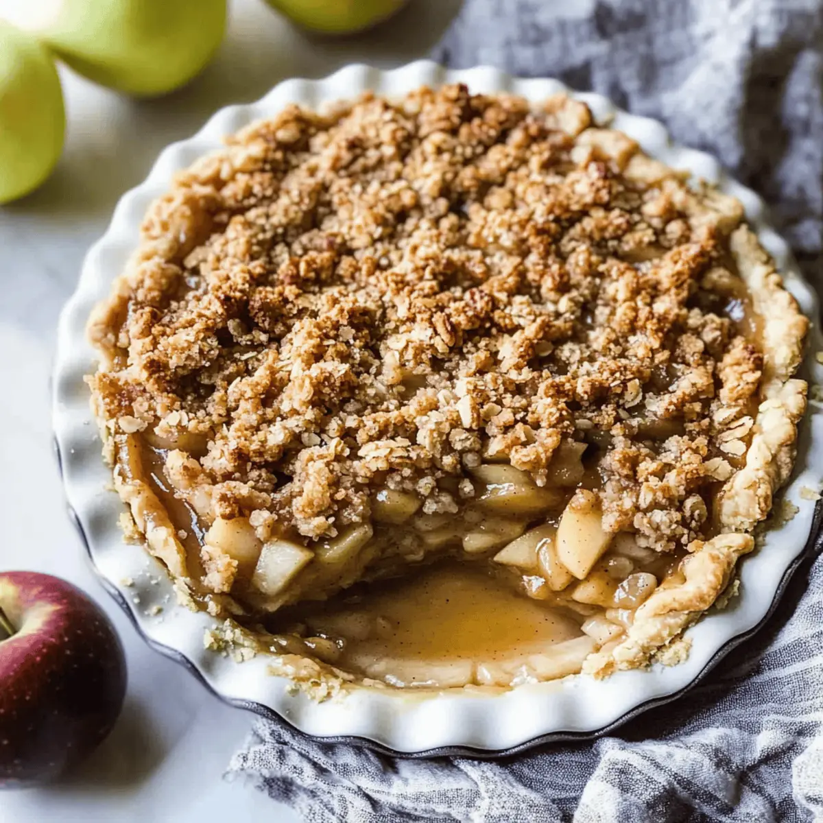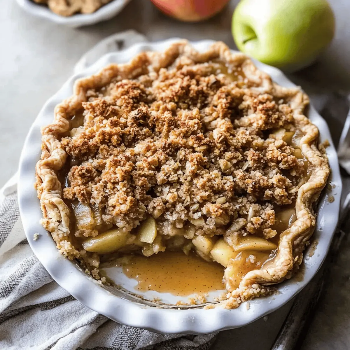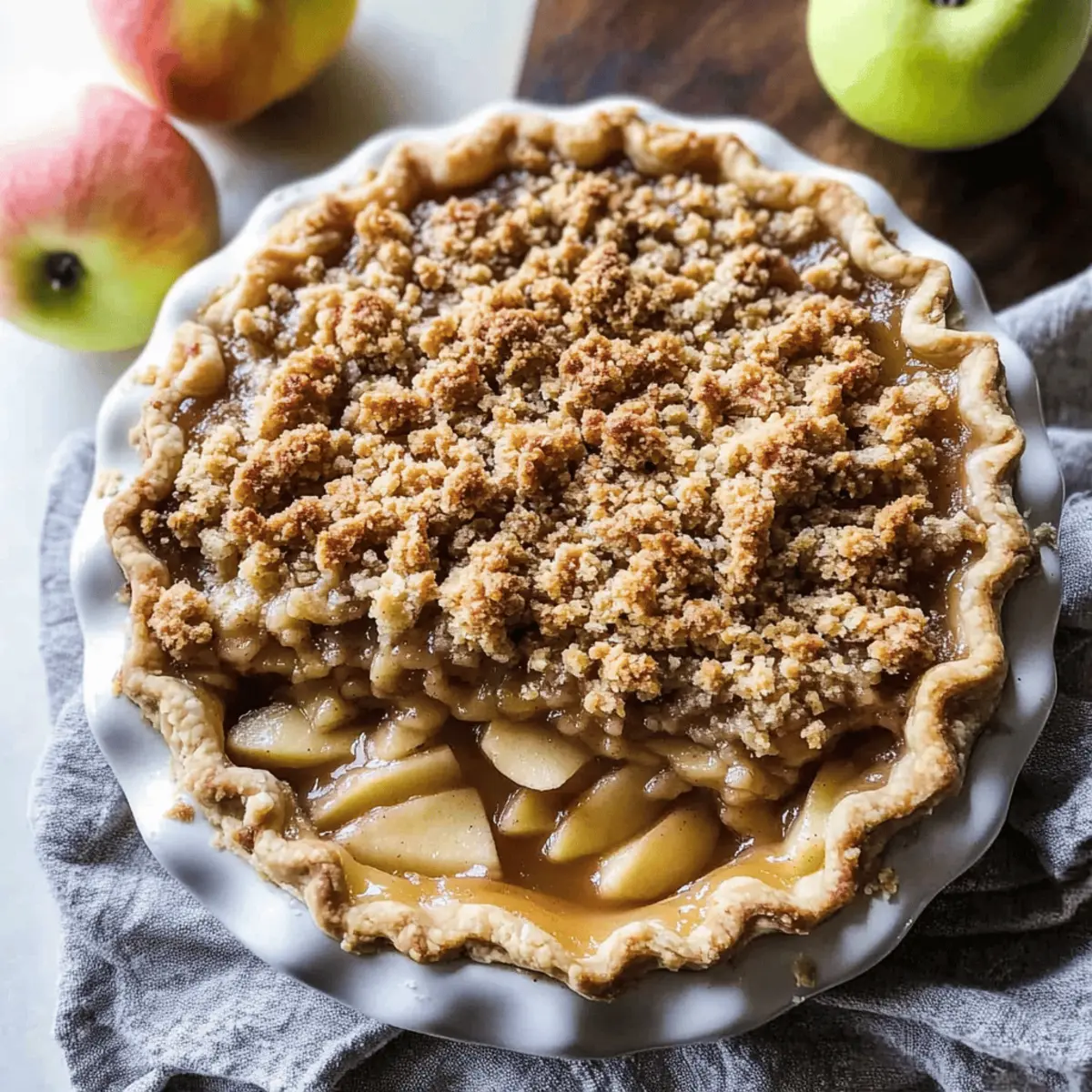 Jump to Recipe Print RecipeAs I savored the last bite of a slice of pie, I couldn’t help but think about how food holds the power to bring us together. This Buttermilk Apple Custard Pie with Crumble Topping invites you on a nostalgic journey through autumn flavors—where tangy buttermilk meets the sweet embrace of tender apples. Perfect for fall gatherings and Thanksgiving celebrations, this classic dessert isn’t just a crowd-pleaser but also a quick-to-prepare treat that will have your home filled with the warm, inviting aroma of cinnamon and buttery goodness. With its creamy custard and crispy crumble topping, it’s the ideal way to transition into the cozy season. Are you ready to turn those apples into something extraordinary? Let’s dive into this delicious recipe! Why is this pie a must-try? Irresistible Flavor: The fusion of tangy buttermilk and sweet apples creates a lovely balance that dances on your palate, making every bite pure bliss. Effortless Preparation: With simple steps, even novice bakers can master this luscious pie, delighting family and friends without the stress. Seasonal Delight: Ideal for autumn, this dessert captures the spirit of fall gatherings, reminiscent of cozy evenings and heartfelt celebrations. Crowd Favorite: Whether at Thanksgiving or a weekend get-together, this pie is guaranteed to impress and satisfy everyone at the table. Versatile Indulgence: Pair it with vanilla ice cream or a drizzle of caramel for an extra touch of decadence! Apple Buttermilk Custard Pie Ingredients • Dive into the deliciousness of this homemade delight with the essential components! For the Crust Pie Crust – Use either homemade or store-bought for a hassle-free base. For the Filling Unsalted Butter (3 tbsp) – Adds richness and enhances the flavor profile of the custard. Apples (2 lbs) – Opt for tart varieties like Granny Smith or Honeycrisp for the best balance of sweet and tangy. Granulated Sugar (1 cup, divided) – Sweetens the apples and custard, adjust according to your taste preferences. Ground Cinnamon (½ tsp + ¼ tsp) – Brings warmth and depth to every bite. Cornstarch (1 tbsp) – Aids in thickening the custard filling to prevent it from being runny. Salt (¼ tsp) – Elevates the overall flavor of the pie. Large Eggs (3) – Provides structure and creaminess to the custard filling. Full Fat Buttermilk (1 ¾ cups) – Infuses the custard with a delightful tang and richness. Vanilla Extract (1 tsp) – Enhances the sweet aroma and flavor of the custard. For the Crumble Topping Brown Sugar (1 cup) – Adds a rich, caramel-like sweetness to the crumble. All-Purpose Flour (¾ cup) – Gives structure to the delicate crumble topping. Old Fashioned Oats (¼ cup) – Contributes texture and a hearty crunch. Diced Butter (¼ cup) – Ensures the perfect crumbly finish that everyone loves. Embrace the joy of homemade goodness with this Apple Buttermilk Custard Pie With Crumble Topping, and get ready for a cozy culinary experience! Step‑by‑Step Instructions for Apple Buttermilk Custard Pie With Crumble Topping Step 1: Prepare the Pie Crust Begin by preheating your oven to 325°F (160°C). Grease a pie plate with cooking spray or melted butter, then carefully line it with your pie crust, ensuring it fits snugly. For easier handling, place the crust in the freezer while you prepare the filling and crumble topping, which will prevent it from shrinking during baking. Step 2: Make the Crumble Topping In a mixing bowl, combine brown sugar, all-purpose flour, old-fashioned oats, and ½ teaspoon of ground cinnamon. Use a fork or your fingers to mix in the diced butter until the mixture resembles coarse crumbs. This crumble topping adds a delightful crunch to your Apple Buttermilk Custard Pie, so set it aside once fully combined. Step 3: Prepare the Apples While the crumble topping rests, peel, core, and slice the apples into thin wedges, aiming for about ¼ inch thick. To keep the apples vibrant, soak them in a bowl of cold water mixed with a squeeze of lemon juice for 10 minutes. This simple step prevents browning, ensuring your pie looks as beautiful as it is delicious. Step 4: Cook the Apples In a large skillet, melt 3 tablespoons of unsalted butter over medium heat. Once melted, add the sliced apples, ¼ cup of granulated sugar, and ¼ teaspoon of cinnamon. Sauté the mixture for about 10 minutes, stirring occasionally, until the apples are tender and coated in a lovely syrup. Allow the mixture to cool slightly before using. Step 5: Prepare the Custard Filling In a mixing bowl, whisk together the remaining ¾ cup of granulated sugar, cornstarch, and ¼ teaspoon of salt. Crack in the 3 large eggs and add 1¾ cups of full-fat buttermilk and 1 teaspoon of vanilla extract. Whisk until the mixture becomes smooth and well combined, creating a creamy foundation for your Apple Buttermilk Custard Pie. Step 6: Assemble the Pie Now it’s time to bring everything together! First, layer the cooked apples evenly in the prepared pie crust, forming a beautiful base. Pour the custard filling over the apples, ensuring it covers them completely. Finally, sprinkle the crumble topping generously on top of the custard layer, creating an irresistible crispy layer that finishes off your pie perfectly. Step 7: Bake the Pie Cover the pie loosely with aluminum foil and place it in the preheated oven. Bake for 30 minutes, then remove the foil to allow the topping to brown. Bake for an additional 25-30 minutes, or until the custard sets and is firm to the touch, giving it a golden-brown appearance. Your Apple Buttermilk Custard Pie is nearly ready! Step 8: Cool and Serve Once baked, remove the pie from the oven and let it cool on a wire rack for at least 30 minutes. This cooling time allows the custard to firm up properly. Serve your warm Apple Buttermilk Custard Pie plain or with a scoop of vanilla ice cream to take it to the next level of deliciousness. Make Ahead Options These delici