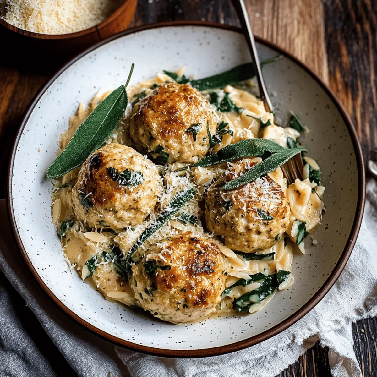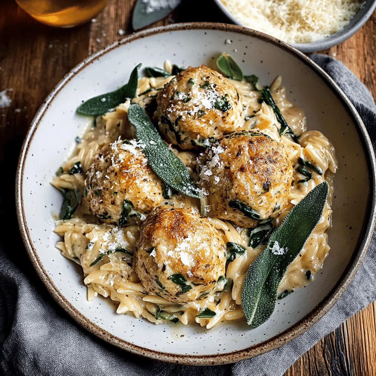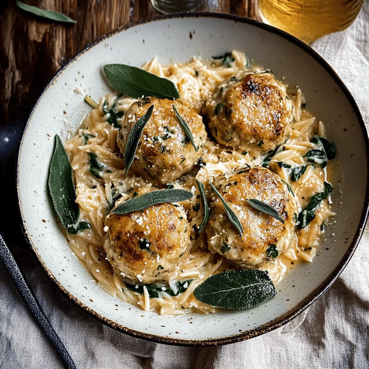 Jump to Recipe Print RecipeAs the leaves turn and the air turns crisp, my craving for cozy, comforting meals ramps up—nothing says autumn dish quite like Baked Sage Chicken Meatballs over Creamy Parmesan Orzo. This dish effortlessly marries juicy ground chicken thighs with the aromatic warmth of sage, creating a flavor profile that will wrap you in a hug. Not to mention, it’s incredibly easy to whip up, making it the perfect weeknight dinner that the whole family will love. As you savor each bite, picture the creamy orzo dancing on your palate, enhanced by rich parmesan and vibrant spinach. Are you ready to transform your dinner routine into something heartwarming and delightful? Let’s dive in! Why Trust This Chicken Meatball Recipe? Expertise: Crafted with precision, this recipe combines juicy ground chicken thighs and fresh sage for that essential autumn flavor. Quick and Easy: With minimal prep time and straightforward instructions, it’s perfect for busy weeknights. Family-Friendly: Kids and adults alike will love the tender meatballs and creamy orzo — a dish perfect for all ages. Comfort in Every Bite: The rich, savory flavors create a warm, homely atmosphere as you gather around the table. Versatile: Feel free to swap out ingredients based on what you have—substitute ground turkey for a lighter option or use kale instead of spinach. Pair this dish with a refreshing side salad or maybe some Garlic Parmesan Baked for something extra special! Baked Sage Chicken Meatballs Ingredients • Discover the flavors that make this dish exceptional! For the Meatballs Ground Chicken Thigh – Adds flavor and juiciness; substitute with ground turkey thigh for a leaner option. Shallots – Provide a sweet onion flavor; can replace with yellow onion if needed. Garlic – Enhances overall flavor profile; fresh or minced garlic can be used. Fresh Sage – Key herb for flavor; two tablespoons provide a warming essence akin to fall. Substitute with dried sage (1 tablespoon) if fresh is not available. Fresh Parsley – Offers freshness to balance flavors; optional if unavailable. Parmesan Cheese – Adds sharpness and depth; can use pecorino Romano for a stronger flavor. Italian/French Bread – Provides moisture to the meatballs; soak in warm water for a minimum of 5 minutes. Crusty bread works best. Olive Oil – Helps to brown the meatballs and adds richness; use any neutral oil if preferable. Crushed Red Pepper – Introduces mild heat; omit for a milder dish. For the Creamy Orzo Spinach – Adds color and nutrients; substitute with kale or Swiss chard if desired. Orzo Pasta – Serves as a creamy base; substituting with rice or other types of pasta is possible, though cooking times may vary. White Wine – Adds acidity and depth; replace with chicken stock for an alcohol-free version. Transform your dinner with these Baked Sage Chicken Meatballs with Parmesan Orzo, ensuring a cozy and delightful meal the family will treasure! Step‑by‑Step Instructions for Baked Sage Chicken Meatballs with Parmesan Orzo Step 1: Preheat the Oven Begin by preheating your oven to 450°F (232°C). While it’s heating, line a baking sheet with parchment paper for easy cleanup and to prevent the meatballs from sticking. This preparation sets the stage for your Baked Sage Chicken Meatballs, ensuring they have a golden, crispy exterior. Step 2: Soak the Bread In a medium bowl, combine diced Italian or French bread with warm water. Allow the bread pieces to soak for at least 5 minutes, or until they become soft but not overly soggy. This step will infuse your meatballs with moisture, keeping them tender and juicy throughout the baking process. Step 3: Prepare the Aromatics Heat a skillet over medium heat and add a tablespoon of butter. Once melted, add finely chopped shallots and minced garlic, sautéing until they soften, which should take about 3-4 minutes. This aromatic mix will greatly enhance the flavor of your Baked Sage Chicken Meatballs. Step 4: Combine Meatball Ingredients In a large mixing bowl, combine the soaked bread, ground chicken thighs, grated Parmesan, chopped fresh sage, optional parsley, and the sautéed shallot and garlic mixture. Gently mix everything together until just combined, avoiding overmixing for tender meatballs. Step 5: Form the Meatballs Using your hands, form the mixture into approximately 15 evenly sized meatballs, tightly compacting them for the best texture. Place the meatballs on the prepared baking sheet in a single layer. Drizzle lightly with olive oil to promote browning during baking. Step 6: Bake the Meatballs Bake the meatballs in the preheated oven for 25-30 minutes, or until they are golden brown and the internal temperature reaches 165°F (74°C). Baking them properly will ensure a crispy exterior while remaining juicy and flavorful inside. Step 7: Cook the Orzo While the meatballs are baking, use the same skillet and melt another tablespoon of butter over medium heat. Add fresh sage leaves and sauté until crisp, then remove them from the pan. Next, add the remaining shallots, followed by the orzo, stirring to coat before pouring in the white wine. Bring the mixture to a gentle simmer. Step 8: Add Chicken Stock Stir in the chicken stock and continue to cook the orzo mixture for about 6 minutes, or until the orzo is tender and has absorbed most of the liquid. Keep an eye on it, adding more stock if necessary, and then mix in the cream, fresh spinach, and grated Parmesan until creamy and smooth. Step 9: Serve To serve, create a generous bed of creamy Parmesan orzo on each plate and top with your freshly baked sage chicken meatballs. Garnish with the crispy sage leaves from earlier and a sprinkle of freshly cracked black pepper for added flavor. This delightful presentation ensures a comforting meal everyone will love. How to Store and Freeze Baked Sage Chicken Meatballs Fridge: Store leftover baked sage chicken meatballs in an airtight container for up to 3 days. 