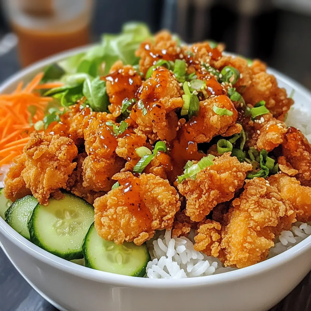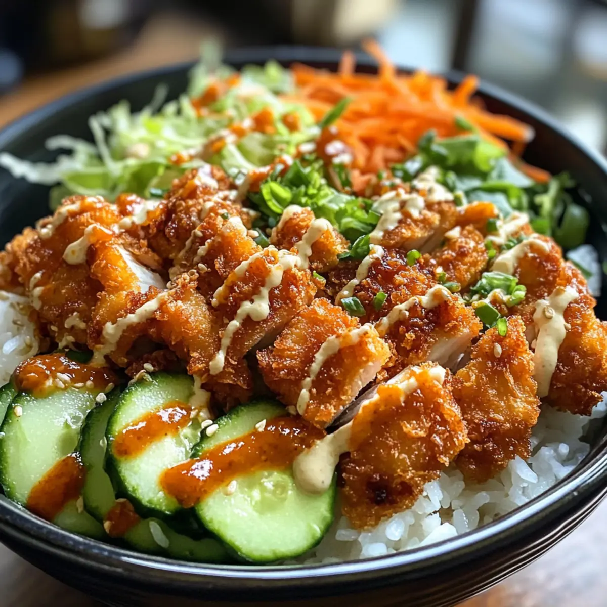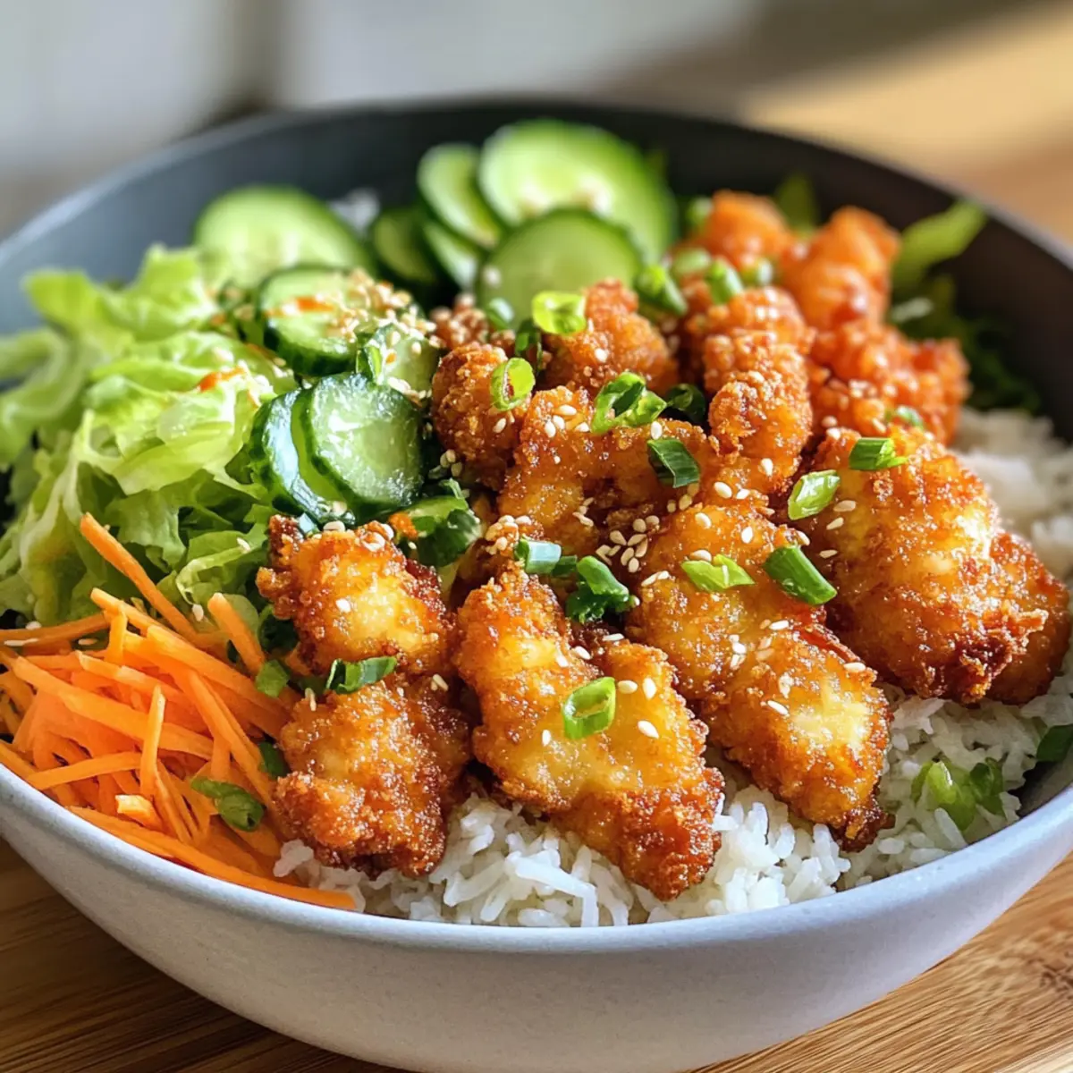 Jump to Recipe Print RecipeHave you ever been caught in the rush of a hectic weeknight, yearning for a delicious home-cooked meal but feeling too pressed for time? Enter the 30-Minute Crispy Bang Bang Chicken Bowl—a vibrant dish that transforms your kitchen into a bustling restaurant. With crispy chicken, crunchy veggies, and a creamy, spicy sauce drizzled over fluffy jasmine rice, this recipe not only satisfies cravings but also allows for plenty of customization to match your taste and dietary preferences. Whether you’re looking to whip up a quick dinner or impress guests, this meal is a true crowd-pleaser. Plus, it’s easily adaptable, so you can swap ingredients to keep things fresh and exciting. Ready to dive into flavors that will have your taste buds dancing? Let’s get cooking! Why Is Bang Bang Chicken Bowl Amazing? Flavor Explosion: The combination of crispy chicken and zesty sauce creates a mouthwatering experience that you won’t forget. Quick & Easy: Ready in just 30 minutes, this dish is perfect for busy weeknights when you crave homemade goodness without the hassle. Customizable Delight: Adjust spice levels or swap in ingredients like tofu or chickpeas to cater to different diets, ensuring everyone at the table is happy. Nutritional Balance: Loaded with fresh veggies and protein, this bowl is not only delicious but also a wholesome meal option, fitting perfectly into any healthy eating plan. Relish in this quick dish alongside other favorites like Thai Chicken Salad or Greek Ground Chicken for a well-rounded menu! Crowd-Pleaser: It’s a surefire way to impress family and friends, making it the ideal recipe for gatherings or cozy dinners alike. Bang Bang Chicken Bowl Ingredients • Discover the key components for this flavorful dish below! For the Bowl Cooked Jasmine Rice – Serves as the fluffy base; feel free to substitute with brown rice for added health benefits. Boneless Skinless Chicken Breasts – The star of the dish; cut into bite-sized pieces for even cooking. Cornstarch – Key for achieving that crunchy coating on the chicken; don’t skip this! Salt – Elevates flavor; using sea salt or kosher salt enhances taste even more. Black Pepper – Adds a nice subtle kick; freshly cracked is always preferred. Garlic Powder – Infuses aromatic flavor; fresh minced garlic is a great alternative if you have it on hand. Paprika – Adds a hint of sweetness and vibrant color; try smoked paprika for a different flavor profile. Vegetable Oil – Necessary for frying; olive oil or avocado oil can be used as healthier alternatives. For the Sauce Mayonnaise – The creamy base of the spicy sauce; swap with Greek yogurt for a lighter version. Sweet Chili Sauce – The star ingredient that brings sweet and tangy elements to the sauce. Sriracha – Adds heat; adjust the quantity based on your spice tolerance. For the Toppings Shredded Lettuce – Offers a refreshing crunch; feel free to mix in your favorite greens! Diced Cucumber – Adds a crisp and hydrating element to the bowl. Shredded Carrots – Brings sweetness and vibrant color; toss in some colors for a hearty crunch! Chopped Green Onions – Perfect for garnish and an added flavor boost. Sesame Seeds – Optional but highly recommended for texture and an appealing finish. Ready to create this indulgent Bang Bang Chicken Bowl? Gather your ingredients and let’s get started! Step‑by‑Step Instructions for Bang Bang Chicken Bowl Step 1: Prepare Chicken Coating In a large mixing bowl, combine cornstarch, salt, black pepper, garlic powder, and paprika to create a flavorful dry mix. Toss the cut boneless skinless chicken breasts in the mixture until they are evenly coated. This step not only adds crispiness to the chicken but ensures a delicious flavor throughout, which is key for your Bang Bang Chicken Bowl. Step 2: Fry Chicken Heat about 1/4 cup of vegetable oil in a skillet over medium-high heat until shimmering, indicating it’s ready for frying. Carefully place the coated chicken pieces in the skillet, making sure not to overcrowd them. Fry for about 5-7 minutes, turning occasionally, until the chicken is golden brown and reaches an internal temperature of 165°F (74°C). Once cooked, remove the chicken from the skillet and set it aside on a paper towel to drain excess oil. Step 3: Make Sauce In a small mixing bowl, combine the mayonnaise, sweet chili sauce, and sriracha to create a creamy and spicy sauce. Stir the mixture until it’s smooth and well incorporated. Taste and adjust the sriracha for your preferred spice level. This zesty sauce is the perfect complement to your crispy chicken, bringing that signature flavor to your Bang Bang Chicken Bowl. Step 4: Assemble Bowl Start building your Bang Bang Chicken Bowl by placing a generous layer of cooked jasmine rice as the base. Next, layer on the crispy chicken pieces, followed by a colorful mix of shredded lettuce, diced cucumber, and shredded carrots. Finally, sprinkle chopped green onions on top for an extra burst of flavor and a pop of color. Step 5: Drizzle with Sauce Generously drizzle the homemade spicy sauce over the assembled bowl, ensuring every component gets a taste of that creamy goodness. You can also sprinkle sesame seeds on top for added texture and visual appeal. Serve the Bang Bang Chicken Bowl immediately while the chicken is warm and crispy, providing a delightful contrast to the fresh vegetables. Expert Tips for the Best Bang Bang Chicken Bowl Coating Consistency: Ensure chicken is well-coated with cornstarch to achieve that perfect crispiness. A light, even coating is key for a delicious crunch. Fry in Batches: Avoid overcrowding the skillet while frying the chicken. This ensures even cooking and helps maintain that ideal crispy texture for your Bang Bang Chicken Bowl. Adjust Your Spice: If you’re unsure about the heat level, start with less sriracha in the sauce and add gradually. You can always increase spice later, but it’s to