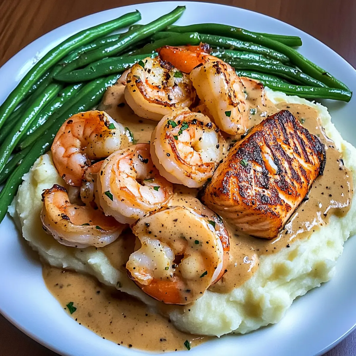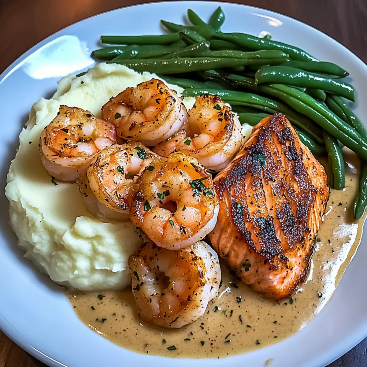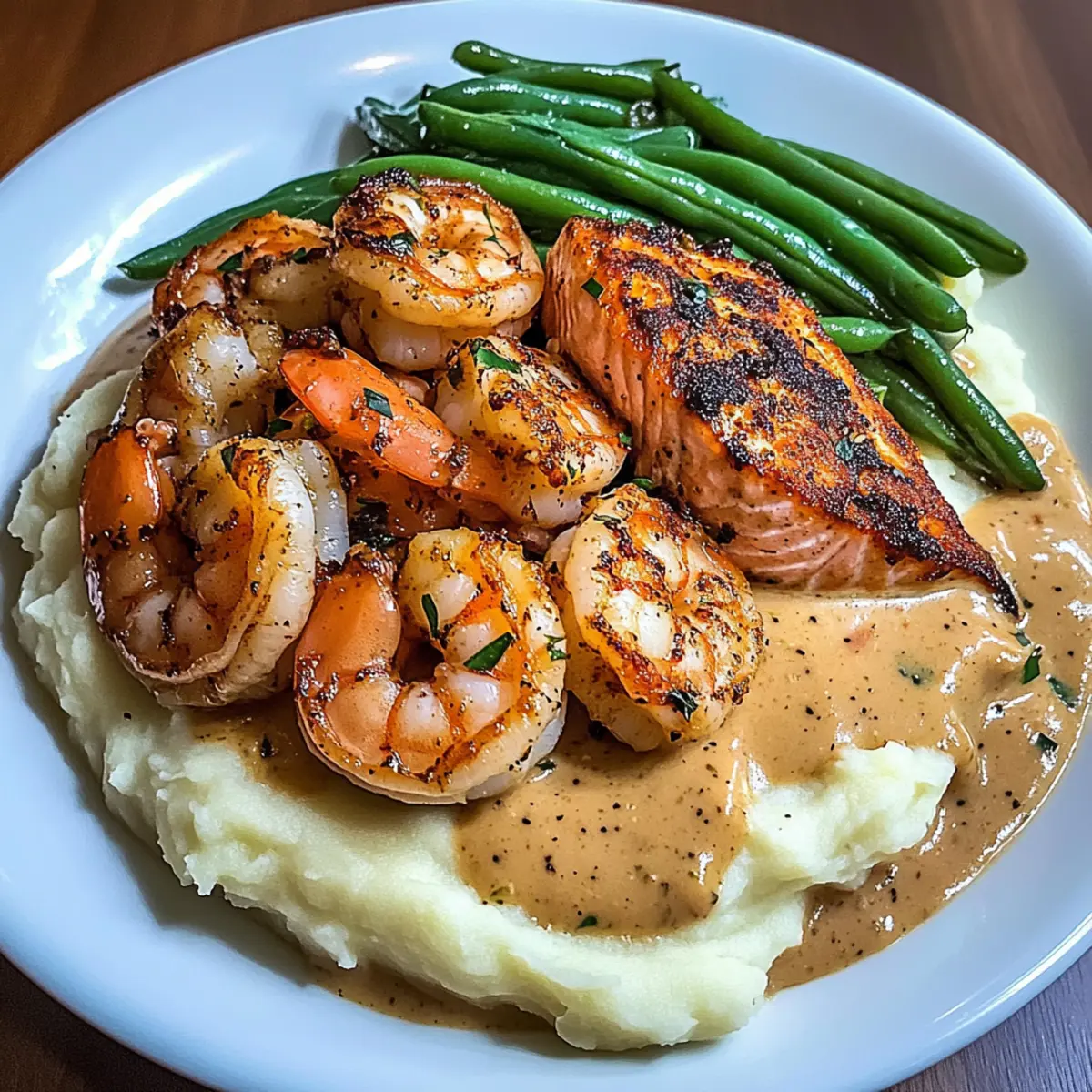 Jump to Recipe Print RecipeAs I stood in my kitchen, the scent of garlic mingled with the bold spices of the Cajun seasoning, instantly transporting me to a bustling Southern kitchen. Today, I’m excited to share my Cajun Shrimp and Salmon recipe topped with a luscious garlic cream sauce, paired perfectly with buttery mashed potatoes and crisp green beans. Not only does this dish cater to seafood lovers, but it’s also a comforting, versatile entrée that impresses friends and family alike. With quick prep and the option to customize your protein choices, it’s a weeknight win or weekend delight! Curious about how to transform your dinner into a flavor-packed experience that evokes joy with every bite? Let’s dive in! Why is Cajun Shrimp and Salmon irresistible? Bold Flavors: Experience a fusion of Cajun spices with tender shrimp and salmon, creating a vibrant explosion of taste. Ease of Preparation: With simple steps, you can whip up a gourmet meal in no time—perfect for busy weeknights! Comforting Sides: Complement your seafood with creamy mashed potatoes and crisp green beans that balance the dish beautifully. Versatile Options: Feel free to mix up your proteins by using scallops or chicken for diverse flavors. Crowd-Pleasing Delight: Whether for family dinners or special occasions, this recipe is bound to impress, making it a favorite around the dinner table. For more seafood inspiration, check out my Parmesan Baked Shrimp or dive into the comforting goodness of Cajun Potato Soup. Cajun Shrimp and Salmon Ingredients For the Seafood Cajun Shrimp – Provides a spicy, flavorful protein; you can substitute with scallops, lobster tails, or chicken for different tastes. Salmon – Rich in Omega-3 fatty acids, adding a smooth texture; other fish varieties can work as a swap if desired. For the Garlic Cream Sauce Butter – Creates a rich base for the sauce; feel free to use vegan butter for a dairy-free option. Garlic – Adds essential flavor; roast the garlic for a mellow sweetness. Heavy Cream – Forms the creamy foundation of the sauce; coconut milk and dairy-free butter can be used for a lighter, dairy-free alternative. Seasoning – Perfectly balances the creaminess; add cayenne pepper for an extra kick. For the Sides Mashed Potatoes – A comforting and creamy accompaniment; can be made ahead of time and reheated when ready to serve. Green Beans – Provides a vibrant color and crisp texture; fresh or frozen green beans can be used interchangeably. Delicious Cajun Shrimp and Salmon awaits! Don’t forget to prepare these ingredients ahead so you can focus on creating a flavor-packed meal. Enjoy! Step‑by‑Step Instructions for Cajun Shrimp and Salmon Step 1: Prep Seafood Begin by seasoning your shrimp and salmon with Cajun spices. Use about 1 tablespoon of seasoning per pound of seafood for a vibrant flavor. Allow the fish to marinate for at least 15 minutes, maximizing the infusion of those bold Cajun tastes. During this time, prepare your other ingredients to streamline the cooking process. Step 2: Cook Potatoes Fill a large pot with water and add a pinch of salt, bringing it to a boil. Add peeled and cubed potatoes and boil for 15–20 minutes, or until fork-tender. Drain the potatoes thoroughly and return them to the pot. Mash them with butter and cream until smooth and creamy, seasoning to taste with salt and pepper. Step 3: Sauté Green Beans In a separate skillet, heat a tablespoon of olive oil over medium heat. Add your fresh or frozen green beans and sauté for about 5–7 minutes until they are bright green and tender-crisp. Season with a pinch of salt and pepper to enhance their natural flavor, then set the sautéed green beans aside while you prepare the sauce. Step 4: Make Sauce In the same skillet, reduce heat to medium-low and melt 2 tablespoons of butter. Add minced garlic and sauté for about 1 minute until fragrant. Carefully pour in 1 cup of heavy cream, stirring constantly. Let the sauce thicken for about 3–5 minutes, adding a sprinkle of salt, pepper, and any cayenne for extra heat to create a luxurious garlic cream sauce. Step 5: Combine Seafood and Sauce Add the seasoned shrimp and salmon to the skillet, cooking for an additional 3-4 minutes or until the shrimp turn pink and the salmon is cooked through and flakes easily. Ensure the seafood is well-coated with your rich garlic cream sauce, checking the internal temperature reaches 145°F for safe eating. Step 6: Serve To serve, plate a generous scoop of creamy mashed potatoes as your base, then artfully place the Cajun shrimp and salmon on top, drizzled with extra sauce for visual appeal. Arrange the sautéed green beans on the side, creating a colorful and inviting presentation to impress your family and guests. How to Store and Freeze Cajun Shrimp and Salmon Fridge: Store leftovers in an airtight container for up to 2 days to maintain freshness. Keep the Cajun shrimp and salmon separate from the creamy sauce if possible. Freezer: For longer storage, freeze the cooked Cajun shrimp and salmon in a freezer-safe container for up to 3 months. When ready to enjoy, thaw overnight in the refrigerator. Reheating: Gently reheat in a skillet over low heat, adding a splash of cream or broth to revive the sauce without curdling. Aim for an internal temperature of 165°F before serving. Make Ahead Options These Cajun Shrimp and Salmon are perfect for meal prep, making your busy weeknights a breeze! You can marinate the shrimp and salmon with Cajun spices up to 24 hours in advance, allowing the flavors to penetrate for maximum deliciousness. The mashed potatoes can be made ahead and stored in the fridge for up to 3 days; just reheat them gently with a splash of cream or milk to maintain their creamy texture. Also, sauté the green beans ahead of time, refrigerate, and warm them up before serving. When you’re ready to enjoy this flavorful dish, simply combine the seafood with the sauce and serve over freshly re