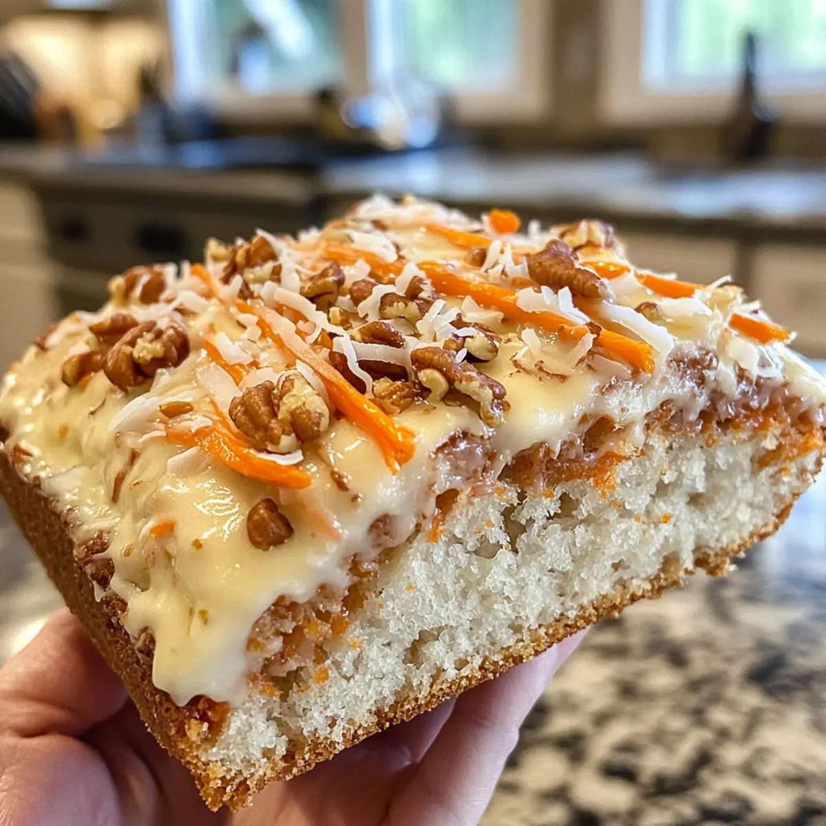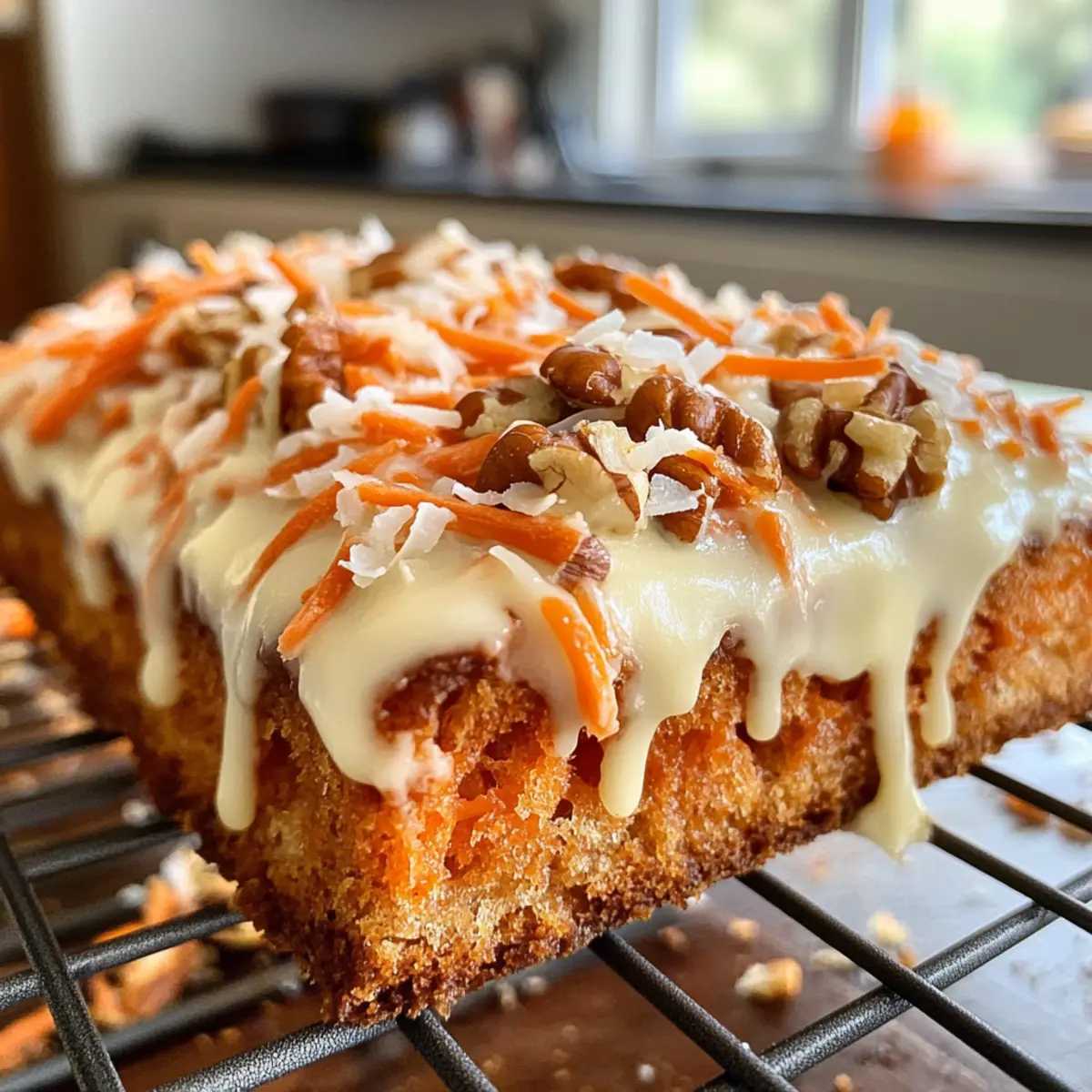 Jump to Recipe Print RecipeAs the aroma of warm spices wafts through the kitchen, I can’t help but smile, thinking about how this Carrot Cake Sourdough Focaccia Bread with Cream Cheese Glaze will become a new favorite. This isn’t your typical bread; it’s a beautiful blend of carrot cake flair wrapped up in the beloved texture of focaccia. Perfect for those Easter brunches or cozy afternoon teas, this low-sugar delight is not only easy to whip up but also a wholesome twist on a classic treat. It satisfies your sweet tooth while embracing the comforts of homemade goodness. What could be better than serving this delightful creation fresh from the oven? Let’s dive into this comforting recipe that will make your taste buds dance! Why is this bread so special? Uniqueness: This Carrot Cake Sourdough Focaccia Bread boasts the soft, chewy texture of focaccia while delightfully incorporating the warm flavors of carrot cake. Low-Sugar Option: With reduced sugar, it’s a guilt-free treat that still satisfies your craving for something sweet. Versatile Serving: Perfect as a stand-alone treat or served alongside a cup of tea or coffee, it’s ideal for gatherings or brunches. For an even tastier experience, consider pairing it with delicious dishes like Cheesy Baked Potatoes with Broccoli Cheese Sauce or a refreshing Greek Potatoes Feta. Simple Preparation: The method is straightforward, requiring just a bit of patience while the dough rises. Crowd-Pleaser: Its aromatic spices and luscious cream cheese glaze make it a guaranteed hit, sure to impress family and friends alike! Carrot Cake Sourdough Focaccia Bread Ingredients For the Dough Flour – Use unbleached all-purpose or bread flour for best results. Sourdough Starter – Requires active starter for optimal rise and flavor. Honey – Enhances sweetness; can substitute with maple syrup if needed. Salt – Vital for balancing flavors in sourdough. Spices – Cinnamon, ginger, and nutmeg bring warmth and traditional carrot cake notes. Carrots – Use freshly peeled and grated carrots for moisture and texture. Oil/Butter – Olive oil or melted butter enrich the dough’s flavor. For the Glaze Cream Cheese – Brick-style cream cheese is best for a thick glaze. Powdered Sugar – Ensures a smooth texture and sweetness in the glaze. Milk – A splash helps achieve the perfect drizzle consistency. For Toppings (Optional) Toasted Coconut – Adds a delightful crunch and tropical flavor. Pecans – Offer an added crunch and nutty flavor that pairs beautifully. This Carrot Cake Sourdough Focaccia Bread combines irresistible flavors and textures, making it perfect for your next brunch or special occasion! Step‑by‑Step Instructions for Carrot Cake Sourdough Focaccia Bread with Cream Cheese Glaze Step 1: Prepare the Dough In a large mixing bowl, combine your active sourdough starter with warm water and melted butter. Gradually add in the unbleached flour, salt, cinnamon, ginger, and nutmeg. Stir everything together until a shaggy dough forms, ensuring no dry flour remains visible. This step typically takes about 5 minutes. Step 2: Autolyse Phase Cover the bowl with a damp cloth and let the dough rest for 30 minutes. This autolyse phase allows the flour to hydrate and enzymes to activate, resulting in a dough that will develop better texture and flavor. After the resting period, the dough will look slightly smoother. Step 3: Stretch and Fold Perform a set of stretch and folds by grabbing the edge of the dough, stretching it upward, and folding it over itself. Rotate the bowl and repeat this action four times, covering the dough afterward. Let it rest for another 30 minutes to allow gluten development, essential for your Carrot Cake Sourdough Focaccia Bread. Step 4: Add Grated Carrots After the resting period, incorporate half of the grated carrots into the dough using the same stretch and fold method. Ensure the carrots are evenly distributed throughout the dough. Cover the bowl again and let it rest for 30 minutes, allowing the carrots to infuse moisture and flavor. Step 5: Bulk Fermentation Cover the bowl tightly and allow the dough to rise at room temperature until it doubles in size, which typically takes about 6 hours (longer if your kitchen is cool). Keep an eye on the dough; it should look puffy and bubbly at the end of this fermentation. Step 6: Refrigerate Overnight Once doubled, lightly oil a bowl and transfer the dough into it, ensuring it’s well sealed. Refrigerate your dough overnight for 8 to 36 hours to develop deeper flavors. This cold fermentation enhances the texture and taste of your Carrot Cake Sourdough Focaccia Bread. Step 7: Prepare for Baking After refrigeration, remove the dough from the fridge and let it rest at room temperature for 2 hours. While it rests, prepare a baking sheet by greasing it with oil or melted butter, ensuring a non-stick surface for the focaccia. Step 8: Preheat the Oven Preheat your oven to 425°F (220°C) during the last 30 minutes of the dough’s resting time. This ensures that the oven is hot when you bake your focaccia, resulting in a beautifully golden crust and perfect texture. Step 9: Shape and Bake Gently dimple the surface of the dough using your fingers, creating small indentations. Drizzle more oil or melted butter over the top for added richness. Bake your Carrot Cake Sourdough Focaccia Bread in the preheated oven for approximately 25 minutes or until golden brown and puffed. Step 10: Prepare the Cream Cheese Glaze While the focaccia is baking, prepare your cream cheese glaze by whisking together brick-style cream cheese, powdered sugar, and a splash of milk until smooth. The glaze should be pourable but thick enough to cling to the bread when drizzled. Step 11: Glaze and Serve Once the focaccia is golden and baked through, remove it from the oven and drizzle the cream cheese glaze generously over the warm bread. For added texture and flavor, sprinkle with toasted coconut and pecans. 