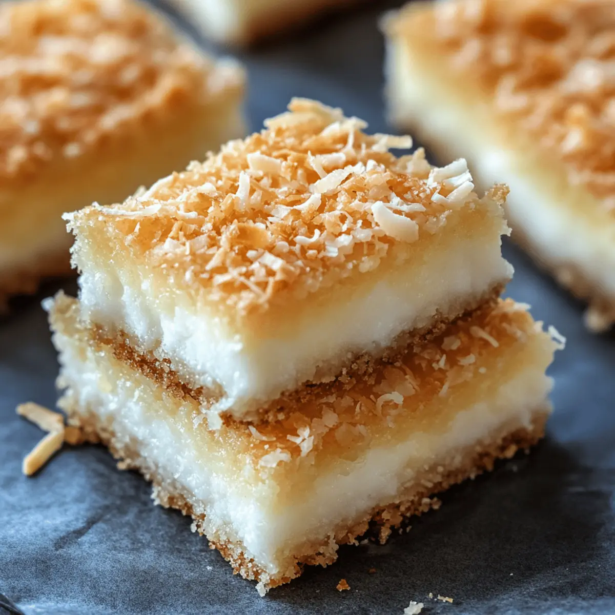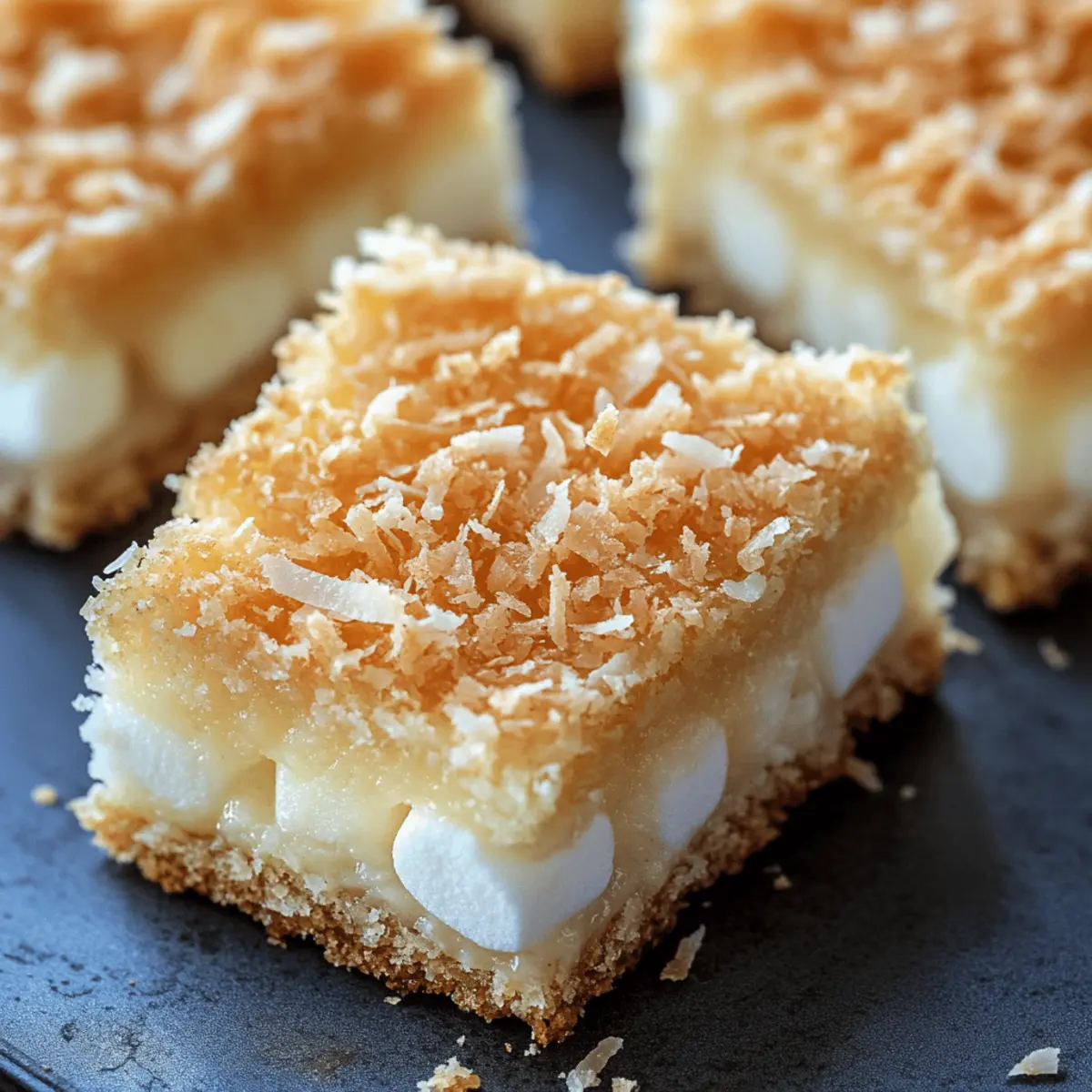 Jump to Recipe Print RecipeAs I was rummaging through my pantry one afternoon, a lightbulb moment struck: what if I combined my love for coconut and my craving for something sweet into one irresistible treat? Enter my Chewy Coconut Bars with Marshmallows. The blend of rich butter and tropical coconut flakes creates a delightful dessert that’s both soft and chewy. With just 10 minutes of prep time and a total of 30 minutes from start to finish, I can whip up these bars whenever I fancy a quick indulgence or need a crowd-pleasing treat for guests. And let’s not forget the joy of serving them warm alongside a scoop of vanilla ice cream! Now, who’s ready to dive into a blissful bite of these chewy delights? Why Are Chewy Coconut Bars Irresistible? Simplicity: Just a handful of ingredients means you can whip up these bars quickly, making them a go-to recipe for any sweet craving. Irresistible Texture: The chewy marshmallows combined with rich coconut flakes create a melt-in-your-mouth experience that you won’t be able to resist. Versatile Delight: Enjoy them as a snack, dessert, or even breakfast treat! Pairing these bars with a hot cup of coffee or tea makes the perfect afternoon pick-me-up. Crowd-Pleased: Whether for a casual get-together or a festive occasion, these bars are sure to impress friends and family. Quick Indulgence: With only 10 minutes of prep time, you’ll always have a delightful treat on hand, just like my Layer Everything Bars that also comes together in a flash! Chewy Coconut Bars Ingredients • Prepare to create the perfect chewy treat with these essential components! For the Batter Butter (Melted) – Adds richness, ensuring a buttery, melt-in-your-mouth texture that binds the ingredients together. Use unsalted butter for control over saltiness. Marshmallows – The secret ingredient providing unique chewiness and a soft, gooey layer. Use mini marshmallows for easier melting. Sugar – Sweetens the bars and balances the coconut’s natural flavor. Granulated sugar is standard, but you can substitute brown sugar for a deeper flavor. Eggs – Provide structure and help achieve a tender crumb. Use large eggs for consistency. Vanilla Extract – Enhances flavor with a beautiful vanilla undertone. Dominican Vanilla is preferred, but any pure vanilla extract will suffice. Flour – Acts as the base, providing texture and structure. All-purpose flour works best; gluten-free flour is untested. Salt – Enhances sweetness and elevates flavor. A pinch of sea salt can complement the other ingredients. Unsweetened Coconut Flakes – The star ingredient providing texture and rich coconut flavor. Use large flakes for more texture or sweetened for a different taste profile. Step‑by‑Step Instructions for Chewy Coconut Bars Step 1: Melt the Butter and Marshmallows In a medium saucepan over medium-low heat, combine the melted butter and mini marshmallows. Stir continuously with a whisk until the mixture is smooth and all marshmallows are fully melted, about 5 minutes. Keep the mixture warm, as it will be added to the wet ingredients shortly. Step 2: Combine Wet Ingredients In a stand mixer, combine granulated sugar, large eggs, vanilla extract, and a pinch of salt. Mix on medium speed until the mixture is fluffy and well combined, which should take about 2 minutes. Gradually pour in the warm butter and marshmallow mixture while the mixer is running, blending until everything is thoroughly incorporated. Step 3: Incorporate Dry Ingredients With the mixer on low speed, gradually add all-purpose flour and unsweetened coconut flakes to the wet mixture. Continue to mix until the dough is smooth and well-combined, approximately 2 minutes. Make sure there are no dry pockets of flour, ensuring a perfect texture for your Chewy Coconut Bars. Step 4: Bake the Bars Preheat your oven to 325°F and line a 13 x 9 x 1-inch baking sheet with parchment paper, allowing some to hang over the edges for easy removal. Spread the dough evenly into the prepared baking sheet, smoothing the top with a spatula. Bake for 20-25 minutes, or until the edges start to turn a light golden brown and the center is set. Step 5: Cool and Cut Once baked, remove the Chewy Coconut Bars from the oven and let them cool in the pan for about 30 minutes. After cooling, use the parchment paper to lift the bars out carefully. Transfer to a cutting board and slice into squares or rectangles as desired, serving them warm or at room temperature. Chewy Coconut Bars Variations Feel free to unleash your creativity and customize your Chewy Coconut Bars with these delightful tweaks! Choco-Coconut Twist: Add a handful of chocolate chips to the batter for a delicious chocolate-coconut combination. Nutty Crunch: Substitute half of the coconut flakes with chopped nuts like almonds or walnuts for a satisfying crunch. Tropical Fruit Fusion: Mix in some crushed pineapple or mango bits for a refreshing, fruity twist that brightens up each bite. Spiced Up Flavor: Sprinkle in a touch of cinnamon or nutmeg to warm up the flavors. It’ll add a cozy holiday essence! Coconut Cream Delight: Top your bars with a drizzle of coconut cream before serving for extra indulgence. It’s heavenly! Layered Bars: For a decadent treat, create layers by alternating between the chewy coconut mixture and a layer of melted chocolate, just as you would with my 3-Ingredient Chewy Chocolate Oat Cookies. Gluten-Free Option: Use a gluten-free flour blend instead of all-purpose flour for a gluten-free version. You’ll still enjoy the same delightful texture! What to Serve with Chewy Coconut Bars Indulging in these sweet coconut bars opens the door to pairing possibilities that elevate your dessert experience. Vanilla Ice Cream: The creamy richness of vanilla ice cream complements the bars’ chewy texture beautifully, creating a delightful contrast. Fresh Berries: A burst of tartness from fresh blueberries or raspberries adds a refreshing balance to the sweetness, 