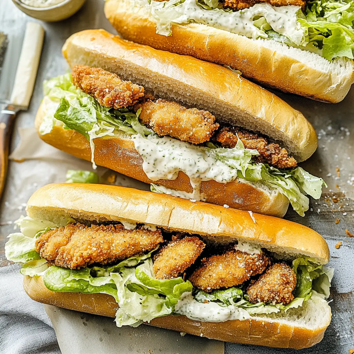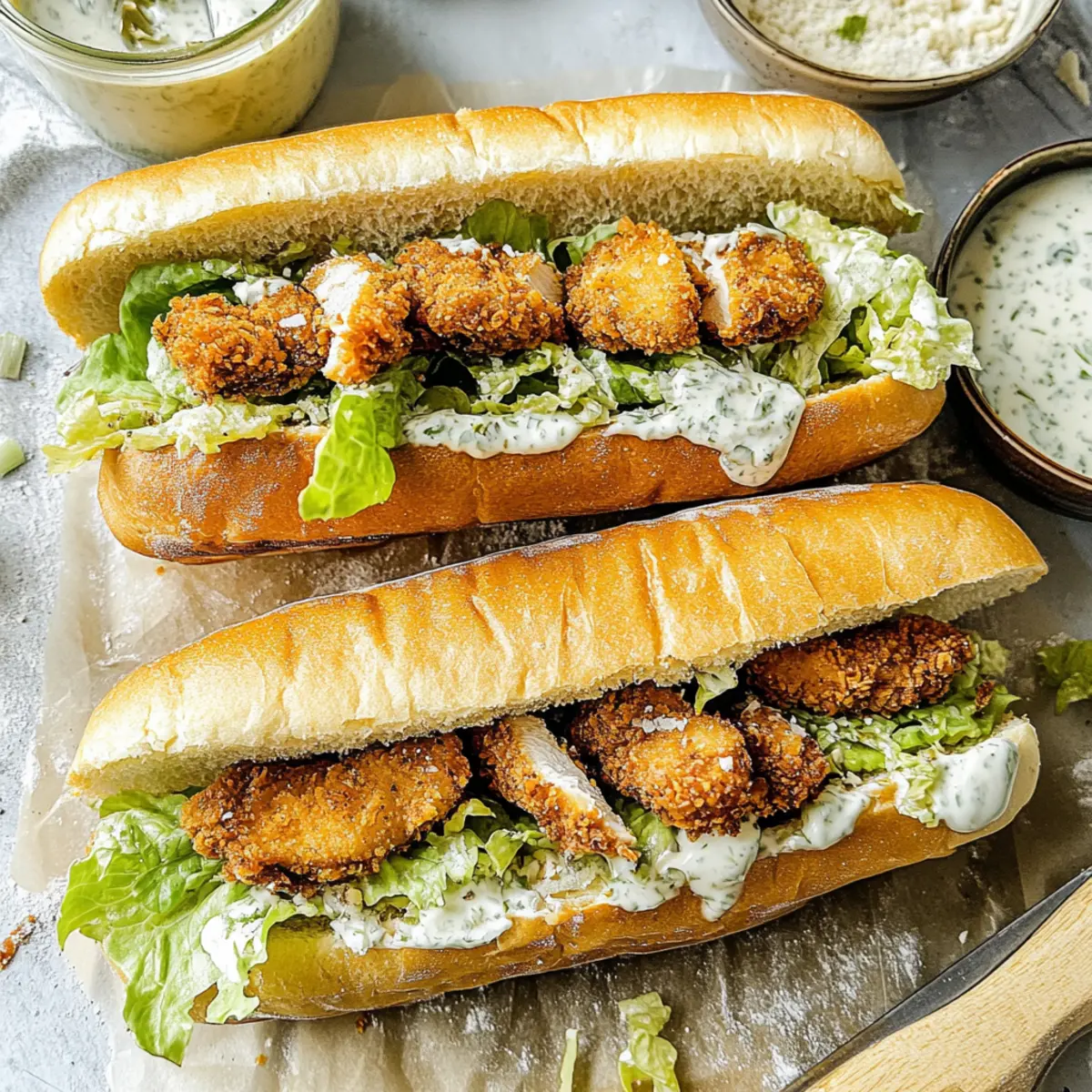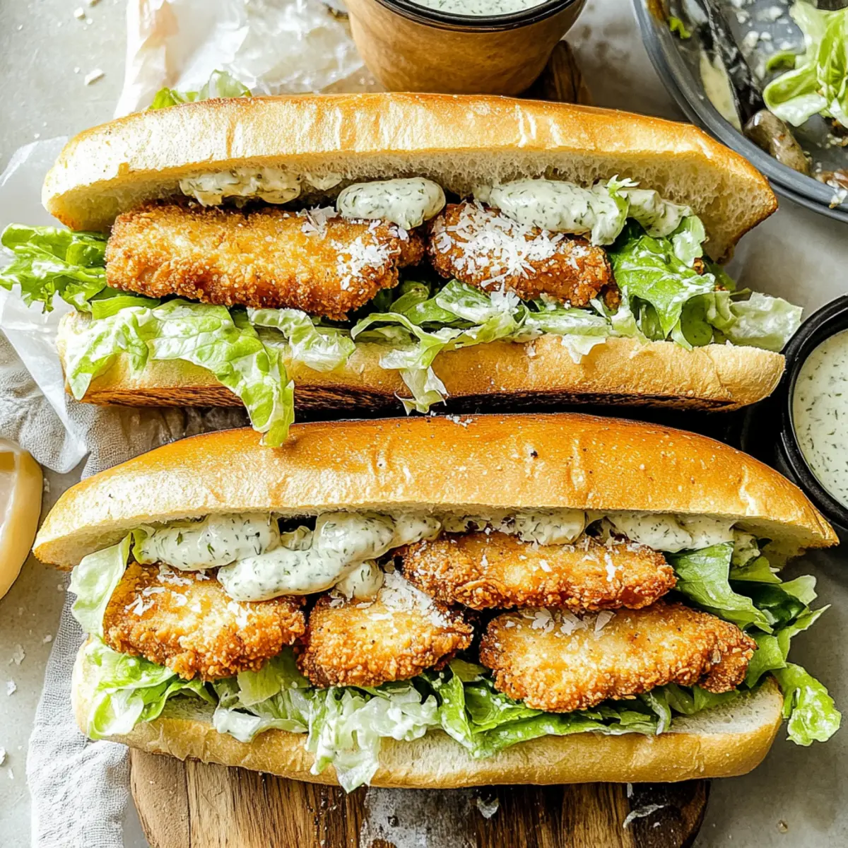 Jump to Recipe Print RecipeAs I stood in my kitchen, the tantalizing aroma of garlic butter sizzling away clashed with the serene sounds of a lazy afternoon. This isn’t just any sandwich; it’s a delightful Chicken Caesar Sandwich that elevates your lunch or dinner game in under 30 minutes! With crispy chicken cutlets nestled in soft, golden hoagies, and a creamy Caesar dressing that’s truly addictive, it effortlessly combines convenience with a gourmet twist. Plus, it’s a wonderful option for anyone looking to escape the fast-food rut while still enjoying a rich, satisfying meal. Ready to impress your taste buds and whip up some deliciousness? Let’s dive into this easy recipe that’s bound to become a family favorite! Why are Chicken Caesar Sandwiches a must-try? Flavor Explosion: The crispy chicken coupled with creamy Caesar dressing creates a party of flavors that will have you craving more with every bite. Quick and Easy: Perfect for busy weeknights, these sandwiches come together in just 30 minutes, making them a go-to for quick meals. Customizable: Whether you prefer crispy bacon for added richness or a veggie version with roasted vegetables, this recipe allows for endless creativity. Crowd-Pleaser: These sandwiches are sure to impress family and friends, making them ideal for gatherings, lunch, or even a cozy dinner. Gourmet Touch: Skip the fast food! With this recipe, you can achieve gourmet taste straight from your kitchen. Pair them with classic sides like potato chips or a fresh side salad for a complete meal. Chicken Caesar Sandwiches Ingredients For the Chicken Chicken Breasts – The main protein for the sandwich, providing a hearty base; fresh or frozen works well. Egg with Milk – Binds the breadcrumbs to the chicken, creating a crispy coating; any milk will work, including plant-based options. Breadcrumbs & Panko – Creates that irresistible crunchy coating; if unavailable, use crushed crackers as a substitute. Garlic Powder, Salt, Pepper – Enhances flavor; adjust seasoning to taste for a personal touch. For the Garlic Butter Bread Salted Butter – Used for the garlic butter spread; unsalted butter is a good alternative if you prefer to control the salt level. Garlic – Fresh minced adds robust flavor; pre-minced garlic or garlic powder can work too. Fresh Parsley – Optional, adds freshness and color to the garlic butter; skip if you prefer less herbaceous flavor. Hoagies or Baguette – The base of the sandwich; can replace with whole grain or gluten-free bread if desired. For the Caesar Dressing Mayonnaise – Forms the creamy base of the dressing; Greek yogurt can substitute for a healthier twist. Parmesan Cheese – Adds sharp, salty flavor in the dressing and topping the sandwich; vegan Parmesan can be a substitute. Sour Cream/Greek Yogurt – Provides creaminess in the dressing; either can replace the other based on availability. Lemon Juice & Dijon Mustard – Incorporates acidity and tang, elevating the dressing; vinegar is an alternative if lemon is not available. Anchovy Paste & Worcestershire Sauce – Provide umami depth in the dressing; can omit for vegetarian versions. For the Fresh Component Romaine Lettuce – Adds crunch and nutrition to the sandwich; substitute with spinach or mixed greens as preferred. This cohesive arrangement of ingredients highlights the essential components that make Chicken Caesar Sandwiches a true delight. Enjoy crafting your sandwich masterpiece! Step‑by‑Step Instructions for Chicken Caesar Sandwiches Step 1: Prepare Chicken Cutlets Begin by slicing the chicken breasts into thin cutlets, about 1/2 inch thick for even cooking. In a bowl, whisk together an egg and a splash of milk, seasoning with garlic powder, salt, and pepper to taste. Dip each cutlet into the egg mixture, ensuring they are well-coated, then dredge in breadcrumbs mixed with panko for that extra crunch. Heat 1-inch of vegetable oil in a skillet over medium-high heat, and fry the cutlets for about 5 minutes on each side until they are golden brown and crispy. Step 2: Make Garlic Butter Bread While the chicken is cooking, prepare the garlic butter for the hoagies. In a small bowl, mix softened salted butter with minced garlic and fresh parsley, creating a flavorful spread. Carefully slice the hoagies lengthwise, but don’t cut all the way through. Generously spread the garlic butter mixture inside the bread. Preheat your oven to 450°F and place the prepared hoagies on a baking sheet. Toast in the oven for 3-4 minutes until the edges are golden and aromatic. Step 3: Prepare Dressing In a separate bowl, combine mayonnaise, sour cream or Greek yogurt, Parmesan cheese, lemon juice, Dijon mustard, and, if desired, anchovy paste and Worcestershire sauce. Whisk until smooth and creamy, adjusting the seasoning with salt, pepper, and additional lemon juice to taste. The dressing should be rich and tangy, perfect for complementing the Chicken Caesar Sandwiches. Set aside until you’re ready to assemble. Step 4: Assemble Sandwich Once the chicken cutlets are golden and crispy, and the garlic butter bread is toasted, it’s time to assemble your Chicken Caesar Sandwiches. Begin by layering a generous amount of romaine lettuce on the bottom section of each hoagie. Then, add the fried chicken cutlets, followed by a drizzle of the creamy Caesar dressing, ensuring each bite is packed with flavor. Finish with a sprinkle of additional Parmesan cheese on top for that final touch of decadence. Step 5: Serve Immediately After assembling your sandwiches, serve them right away for the best taste and texture. Each Chicken Caesar Sandwich should be warm, with the crispy chicken alongside the fresh, crunchy lettuce, all enveloped in the buttery, toasty bread. This is the moment to gather around the table and enjoy the deliciousness of your creation, full of vibrant flavors that everyone will love! How to Store and Freeze Chicken Caesar Sandwiches Fridge: Store assem
