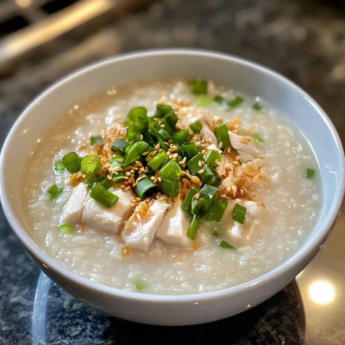 Jump to Recipe Print RecipeAs the warmth of simmering broth begins to envelop the kitchen, I can’t help but feel like I’ve traveled straight to a bustling street market in China. Today, I’m excited to share my recipe for Chicken Congee—a beloved comfort food that is both simple to prepare and profoundly satisfying. This silky smooth dish is not just a meal; it’s a warm hug in a bowl, perfect for nourishing the soul on chilly days or when you need a cozy pick-me-up. Plus, using an Instant Pot makes this delightful recipe incredibly quick and hassle-free, allowing you to enjoy authentic flavors without spending hours in the kitchen. Whether you’re recovering from a cold or simply craving something hearty, this Chicken Congee ticks all the boxes. Curious how to make this soul-soothing dish? Let’s dive into the recipe! Why is Chicken Congee a Must-Try? Comforting, heartwarming dish: Chicken Congee is often referred to as a “hug in a bowl,” providing a rich, soothing experience that warms both body and soul. Quick preparation: Utilizing an Instant Pot, this recipe allows you to dive into deliciousness effortlessly, making it perfect for busy weeknights or spontaneous cravings. Endless customization: Feel free to add your favorite toppings like pickled vegetables or a drizzle of soy sauce to personalize your bowl. Perfect for all occasions: Whether it’s a cozy dinner, a rainy day treat, or even a remedy when you’re under the weather, congee effortlessly adapts to your needs. Gluten-free adaptable: This dish caters to diverse dietary preferences, ensuring everyone can indulge in its comforting goodness. Chicken Congee Ingredients For the Congee • Chicken Breast or Thigh (8 oz) – Provides protein and flavor; chicken thighs are preferred for richness, while breasts offer a leaner alternative. • Shaoxing Wine (2 tsp + 1 tbsp) – Enhances flavor and tenderizes chicken; if unavailable, dry sherry makes a suitable substitute. • Salt (½ tsp) – Elevates overall taste; feel free to adjust based on personal preference. • Cornstarch (1 tsp) – Keeps marinated chicken tender and juicy; no substitutes needed here. • Short Grain White Rice (½ cup) – Forms the base for congee, releasing starch for that silky smooth texture; medium grain can work, but avoid long grain. • Chicken Broth (4 cups) – The flavorful liquid base for your congee; a rich broth, like Kirkland Signature Organic Chicken Stock, is highly recommended. • Ginger (2 large slices) – Contributes aromatic depth; fresh ginger only, please—avoid dried or frozen forms. • Green Onions (2, thinly sliced) – Adds brightness and freshness to the dish; always use fresh green onions for best results. • Chicken Bouillon (¼ tsp or to taste) – Enhances the broth’s flavor if necessary; additional salt is a fine alternative if preferred. • Toasted Sesame Oil (1 tsp) – Offers a nutty aroma and flavor; use as instructed for the best taste. Step‑by‑Step Instructions for Chicken Congee Step 1: Rinse the Rice Start by placing the short grain white rice in a bowl, filling it with cold water. Swirl the rice around with your hands, rinsing it a few times until the water runs clear, which removes excess starch. Drain the rice well and set it aside; this step is vital for achieving that silky smooth texture in your Chicken Congee. Step 2: Instant Pot Method In your Instant Pot, combine the rinsed rice, chicken broth, 2 teaspoons of Shaoxing wine, and the ginger slices. Seal the lid and set the pot to cook on high pressure for 15 minutes. Once cooking is complete, allow a natural pressure release for 10 minutes to let the congee thicken before performing a quick release of any remaining pressure. Step 3: Stovetop Method If you prefer to cook on the stovetop, bring a large pot over medium heat and add the rinsed rice, ginger slices, and 4 cups of chicken broth. Once it starts to simmer, cover with a lid slightly ajar to allow steam to escape. Reduce the heat to low and let it cook gently for about 30 minutes, stirring regularly to avoid sticking or burning. Step 4: Marinate Chicken While the congee is cooking, take your chicken breast or thigh and cut it into thin bite-sized pieces. In a bowl, mix the chicken with 1 tablespoon of Shaoxing wine, ½ teaspoon of salt, and 1 teaspoon of cornstarch. Allow it to marinate for the remainder of the cooking time, as this will help keep the chicken tender and juicy for your Chicken Congee. Step 5: Add Chicken and Season Once your congee reaches a creamy consistency, it’s time to add the marinated chicken pieces, thinly sliced green onions, and chicken bouillon. Increase the heat to medium and stir gently for about 2 minutes, or until the chicken is just cooked through. Keep an eye on the pot to ensure everything is well combined in your Chicken Congee. Step 6: Finalize the Dish Remove the pot from the heat and stir in 1 teaspoon of toasted sesame oil, enhancing the flavor with its nutty aroma. Taste the Chicken Congee and adjust the seasoning if necessary. Serve the congee hot, allowing its comforting warmth to envelop your senses, creating a truly cozy dining experience. Chicken Congee Variations & Substitutions Feel free to get creative and customize your Chicken Congee to suit your taste buds! Brown Rice: Swap in brown rice for a whole grain option, though it may yield a chewier texture. Incorporating brown rice not only adds health benefits but also provides a slightly nutty flavor that can enhance the dish. Vegetarian Tofu: Replace chicken with firm tofu for a plant-based version. This twist maintains that comforting feel while offering a protein-rich alternative for veggie lovers. Spicy Kick: Add a dash of chili oil or fresh sliced jalapeños to spice things up. The heat will contrast beautifully with the creamy congee, creating an invigorating flavor profile that warms your soul. Savory Mushroom: Stir in some sautéed mushrooms for an umami boost. Mushroom