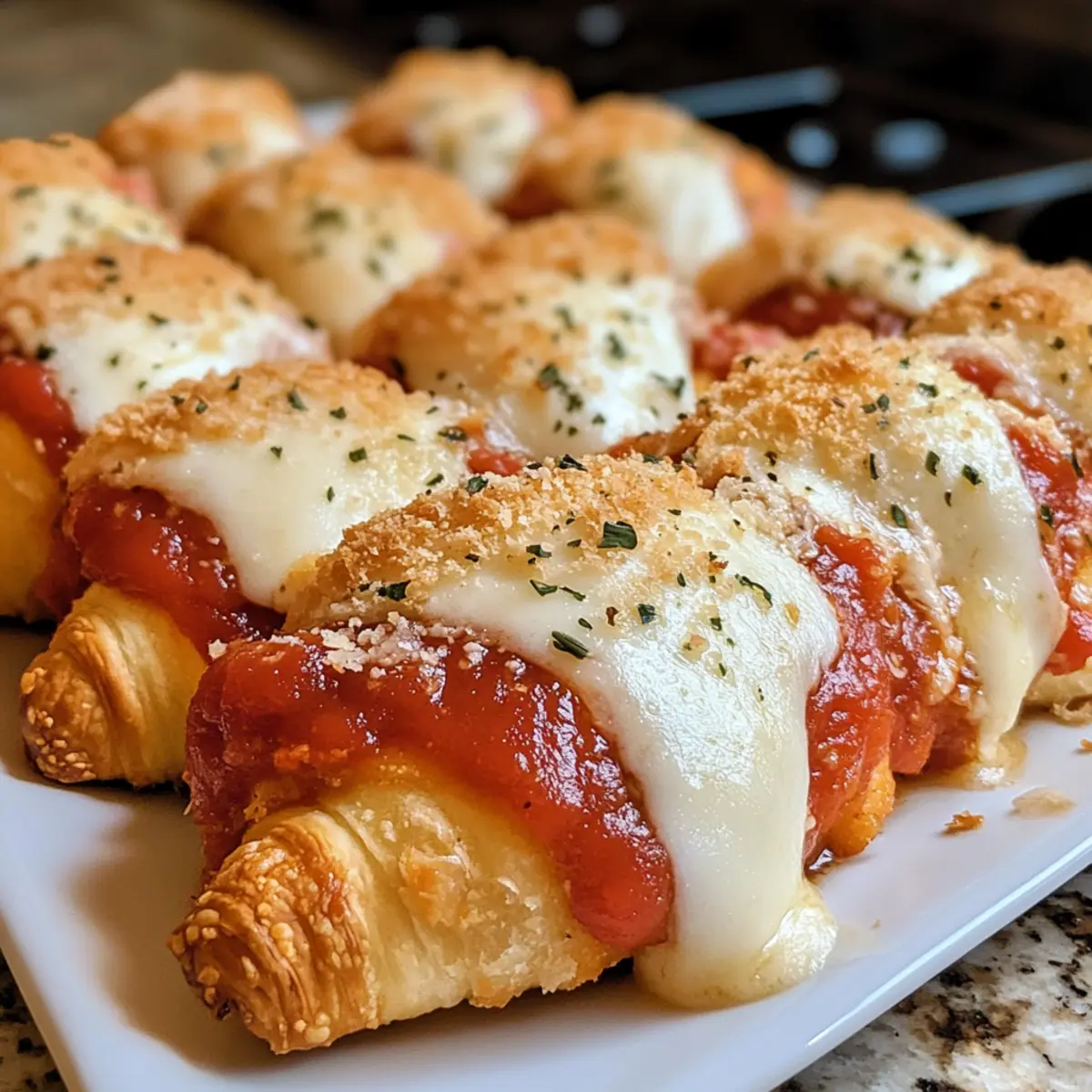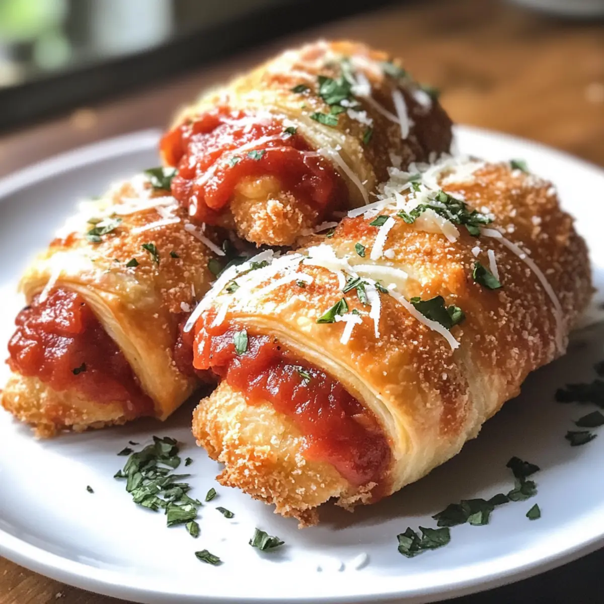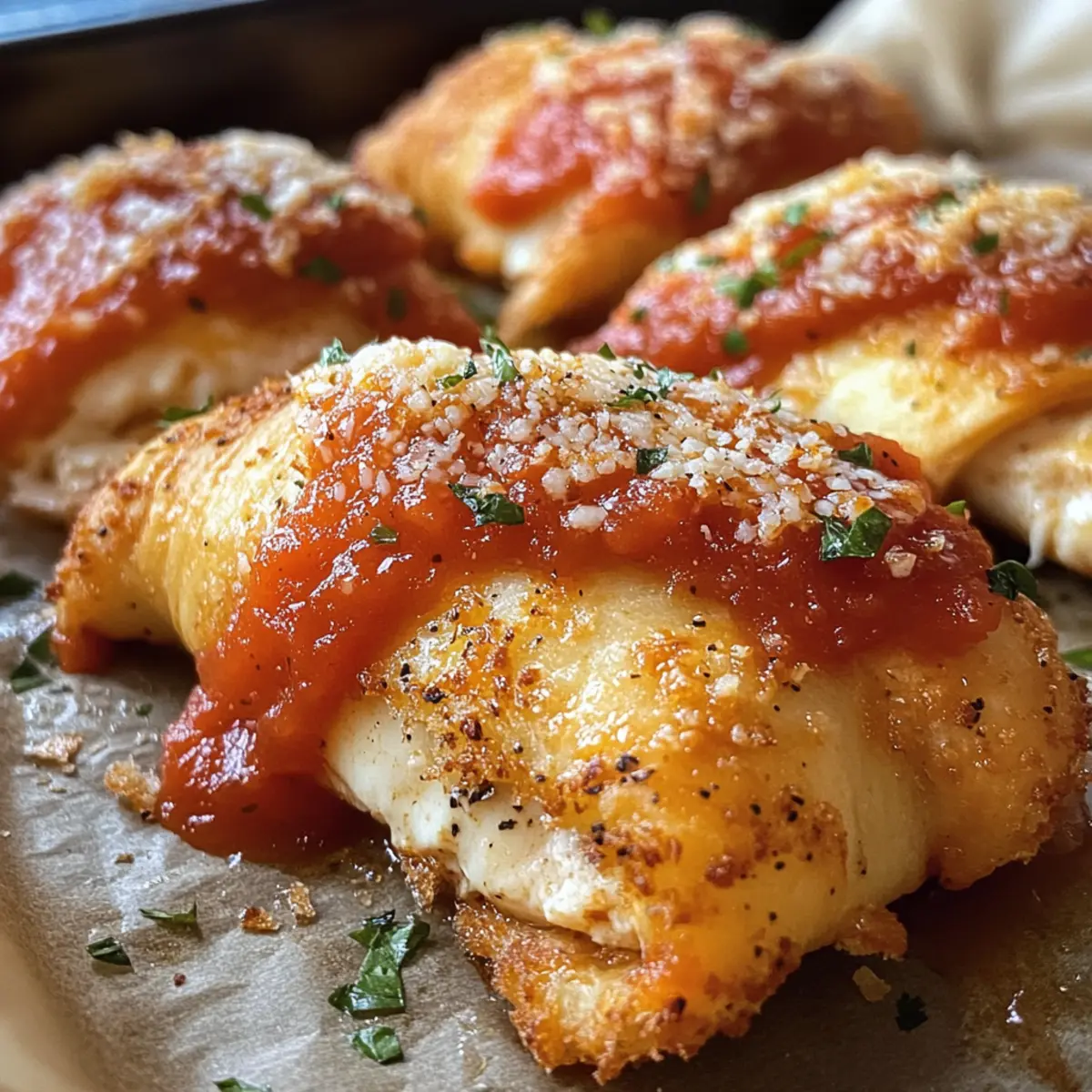 Jump to Recipe Print RecipeThe aroma of melted cheese and crisp pastry wafting through your kitchen can instantly transform a hectic weeknight into a comforting culinary experience. These Quick and Easy Chicken Parmesan Crescent Rolls are not just a meal; they’re a delightful little package of joy that comes together in under 30 minutes. Perfect for families and busy individuals alike, this recipe is a kid-friendly favorite that reimagines traditional chicken parmesan into a flaky, hand-held delight. With the option to customize sauces and cheeses, you’ll discover just how many tasty variations await you. So, what’s stopping you from making your next mealtime magic? Grab those ingredients and let’s roll! Why Will You Love These Rolls? Quick Preparation: You can whip up these Chicken Parmesan Crescent Rolls in under 30 minutes, making them a fantastic option for busy weeknights. Kid-Friendly Appeal: With familiar flavors and a fun, portable shape, they’re sure to please even the pickiest eaters. Versatile Variations: Whether you prefer marinara, pesto, or alfredo, you can easily switch up the sauce and cheese to suit your family’s taste. Flaky Goodness: Enjoy the perfect balance of crispy pastry and gooey cheese that elevates the classic chicken parmesan experience. Crowd-Pleasing Treat: Ideal for family dinners or casual gatherings, these rolls are guaranteed to disappear quickly, leaving everyone asking for more. Pair them with a simple salad or some delicious Garlic Parmesan Baked Shrimp for a complete, satisfying meal! Chicken Parmesan Crescent Rolls Ingredients For the Filling Frozen Chicken Strips – A convenient main protein source; opt for breaded chicken for extra crunch. Marinara Sauce – Adds moisture and flavor; feel free to substitute with pesto or alfredo for a tasty twist. Mozzarella Cheese – The melty topping essential for that classic chicken parmesan flavor; use provolone or cheddar for a different taste. For the Dough Crescent Roll Dough – Provides a flaky, buttery base; puff pastry can be used in a pinch if desired. For Finishing Touches Butter – Brush on before baking to add flavor and enhance browning; try adding a sprinkle of garlic powder or Italian seasoning for extra zest! These Chicken Parmesan Crescent Rolls combine delightful flavors and textures, perfect for a quick meal! Step‑by‑Step Instructions for Chicken Parmesan Crescent Rolls Step 1: Preheat and Prepare Begin by preheating your oven to 375°F (190°C) and lining a baking sheet with foil for easy cleanup. This ensures that your Chicken Parmesan Crescent Rolls will bake evenly. Arrange your workspace with all ingredients handy, including the frozen chicken strips, crescent roll dough, marinara sauce, and shredded mozzarella. Step 2: Bake Chicken Strips While the oven heats, place the frozen chicken strips in a single layer on the prepared baking sheet. Bake them in the preheated oven for 10 minutes or until they are heated through and slightly crispy. This step adds a delightful crunch, setting the perfect foundation for your rolls. Step 3: Prepare Crescent Roll Dough Once the chicken strips are baked, remove them from the oven and let them cool for a moment. Meanwhile, unroll the crescent roll dough on a clean surface. Gently separate the dough into triangles, ensuring they maintain their shape. This flaky base is essential for wrapping your chicken. Step 4: Assemble the Rolls Take each chicken strip and cut it in half, then place the halves at the wide end of each dough triangle. Add about a spoonful of marinara sauce on top of the chicken and sprinkle two pieces of mozzarella cheese for that classic flavor. This step is where the magic of the Chicken Parmesan Crescent Rolls begins! Step 5: Roll and Seal Starting from the wide end, carefully roll the dough around the chicken filling, pinching the edges to seal each roll securely. Arrange the rolled crescents on the lined baking sheet, ensuring they have enough space in between to expand. This helps achieve that stunning golden-brown color when baked. Step 6: Bake the Rolls Place the assembled rolls in the preheated oven and bake for 10–12 minutes. Keep an eye on them; you want them to turn a beautiful golden brown and the cheese to melt and bubble gently. The aroma will fill your kitchen, making it hard to resist! Step 7: Add Finishing Touches Once baked, remove the rolls from the oven and immediately brush them with melted butter for added flavor and gloss. If desired, sprinkle with a pinch of garlic powder and Italian seasoning to elevate the taste of your Chicken Parmesan Crescent Rolls. Let them cool for a few moments before serving. Chicken Parmesan Crescent Rolls Variations Feel free to personalize your Chicken Parmesan Crescent Rolls with these delightful twists that will tickle your taste buds! Pesto Swap: Replace marinara with pesto for a vibrant, herb-packed flavor that brightens your rolls. The combination of pesto and mozzarella offers a fresh take on the classic. Alfredo Magic: Use creamy alfredo sauce instead of marinara for a rich and indulgent variation. Pair it with a sprinkle of parmesan cheese for an extra cheesy delight! Vegetable Boost: Add sautéed spinach or roasted red peppers for a nutritious and colorful upgrade. These veggies not only enhance flavor but also provide a delicious texture contrast in each bite. Cheese Variety: Experiment with different cheeses! Swap mozzarella for provolone, gouda, or pepper jack for an exciting flavor twist. Each cheese brings its unique character to the rolls, making every batch a new discovery. Crunchy Extras: Top the rolls with breadcrumbs for added texture before baking. This will give them a crispy exterior that complements the soft inside perfectly. Spice It Up: For a kick, sprinkle some crushed red pepper flakes or a dash of hot sauce into the filling. This adds just the right amount of heat to wake up your taste buds! Stuffed Options: Try stuffing them with a m