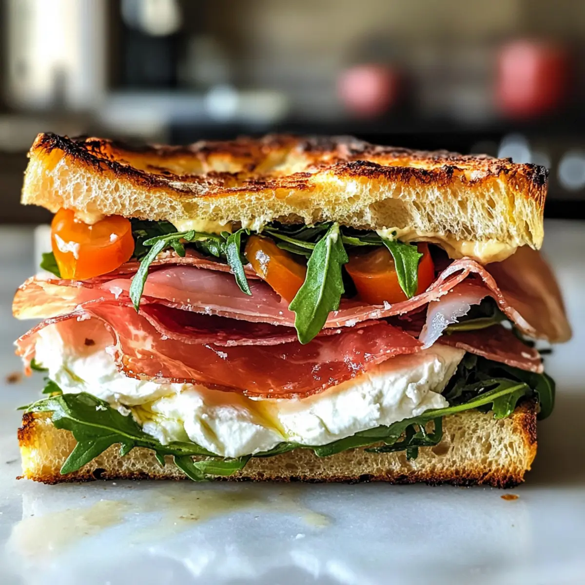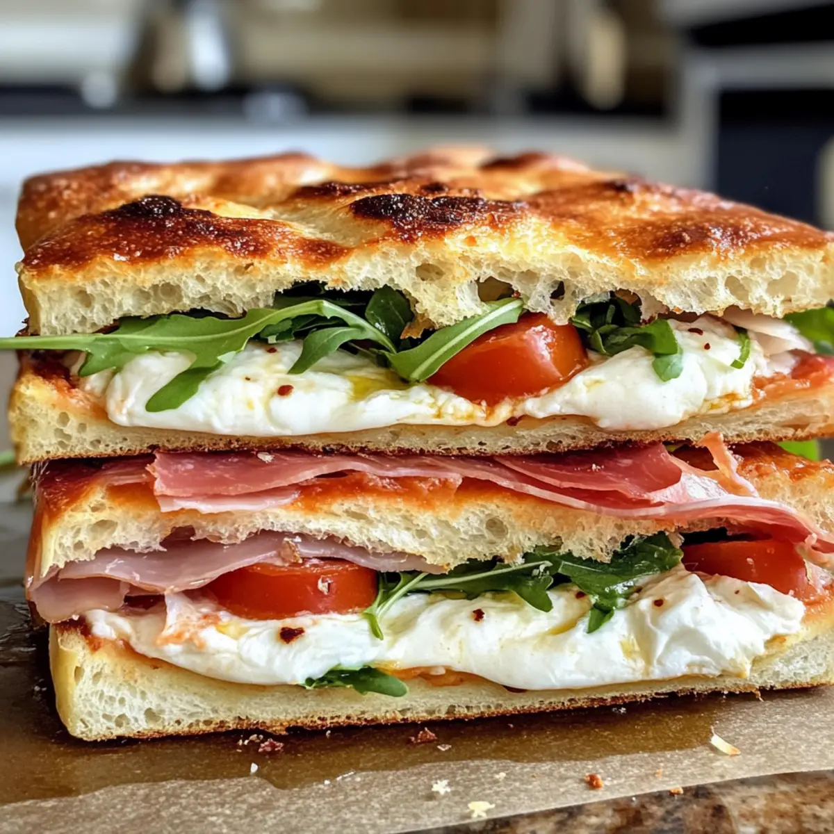 Jump to Recipe Print RecipeAs I stepped into my kitchen, the warm aroma of freshly baked focaccia wrapped around me like a comforting hug. I couldn’t resist the allure of crafting a Classic Italian Focaccia Sandwich with Burrata & Prosciutto, a delightful creation that dances between a hearty meal and elegant indulgence. This recipe is not only a quick lunch solution but, with its layers of creamy burrata, perfectly salty prosciutto, and crisp arugula, it’s also a showstopper for entertaining friends or family. Plus, the customization options allow you to mix and match ingredients to suit your taste, making each sandwich uniquely yours. Curious about how this Italian delight can brighten up your next meal? Let’s dive into the details! Why is this Focaccia Sandwich a Must-Try? Uniquely Delicious: This Classic Italian Focaccia Sandwich bursts with flavors, thanks to the creamy burrata and savory prosciutto, creating a mouthwatering experience you won’t forget. Quick and Easy: The recipe is uncomplicated, requiring minimal prep time, making it perfect for busy weekdays or last-minute gatherings. Customizable: With endless variation options, from swapping in fresh mozzarella to adding roasted veggies, you can personalize each sandwich to match your cravings. Crowd-Pleaser: Whether it’s for a casual lunch or an elegant dinner, this sandwich will impress everyone on your guest list. Pair it with a refreshing salad or homemade Italian wedding soup for a complete meal. Don’t miss out on making this delicious sandwich paired with some Hal’s NY Backyard BBQ Chips for that perfect crunch! Classic Italian Focaccia Sandwich Ingredients For the Focaccia Base • Focaccia – A flavorful, airy bread; store-bought or homemade works beautifully, but fresh is best. For the Layers • Pesto Sauce – Adds bright basil notes; spread a thin layer to avoid sogginess. • Burrata – This creamy cheese elevates the sandwich; serve at room temperature for easy spreading. • Prosciutto – Offers a savory, salty kick; opt for thinly sliced to enhance texture. • Salami – Provides depth; again, use thin slices for effortless layering. • Arugula – Adds a crunchy, peppery freshness; season with olive oil, salt, and pepper to boost flavor. For the Finishing Touches • Olive Oil – A high-quality extra virgin oil drizzled over arugula adds richness. • Hal’s NY Backyard BBQ Chips (optional) – A delightful crunchy side that perfectly complements the soft textures of the sandwich. This Classic Italian Focaccia Sandwich is a symphony of flavors and textures just waiting to be enjoyed! Step‑by‑Step Instructions for Classic Italian Focaccia Sandwich Step 1: Slice the Focaccia Using a serrated knife, carefully slice the focaccia in half lengthwise. Aim for a clean, even cut to maintain the structure of the sandwich. Lay the focaccia cut side up on a flat surface or cutting board, making it easy to add your delicious layers. Step 2: Spread the Pesto Take a spatula or the back of a spoon to spread a thin layer of pesto sauce over the bottom half of the focaccia. This vibrant basil paste will complement the sandwich wonderfully without making it soggy. Ensure the layer is even, covering all corners to enhance every bite of your classic Italian focaccia sandwich. Step 3: Add the Burrata Gently tear the burrata into pieces and layer them over the pesto, distributing the creamy texture evenly. The burrata should be at room temperature for easy spreading, allowing it to meld with the pesto. Be sure to season the cheese with a pinch of salt and freshly cracked black pepper to elevate the flavors. Step 4: Layer the Prosciutto Drape thinly sliced prosciutto evenly over the creamy burrata. The salty richness of the prosciutto adds a delightful depth to your classic Italian focaccia sandwich. Arrange the slices artfully, ensuring each bite has an enjoyable balance of flavors. Step 5: Add the Salami Now, layer thin slices of salami on top of the prosciutto, further enhancing the savory profile of your sandwich. Position the salami evenly to create a hearty layer that complements the other ingredients. This addition not only adds flavor but also brings additional texture to your creation. Step 6: Scatter the Arugula Generously scatter fresh arugula over the salami, giving a peppery crunch to every bite. For an extra boost of flavor, drizzle the arugula with high-quality extra virgin olive oil and sprinkle a pinch of salt and pepper. This step brightens the sandwich and adds a fresh finish. Step 7: Assemble the Sandwich Carefully place the top half of the focaccia onto your beautifully layered ingredients. Gently press down to secure everything together, ensuring the layers are compact yet not squished. You can slice the assembled focaccia sandwich into manageable portions for serving. Step 8: Serve Immediately Slice the sandwich into quarters for easy handling, or serve it whole for a more impressive presentation. Enjoy your classic Italian focaccia sandwich immediately for the best texture and flavor, optionally paired with Hal’s NY Backyard BBQ Chips for that perfect crunch! Storage Tips for Classic Italian Focaccia Sandwich Room Temperature: If enjoyed the same day, keep the sandwich at room temperature for up to 2 hours. A covering with a clean kitchen towel can help maintain freshness. Fridge: Store any leftovers wrapped tightly in plastic wrap or placed in an airtight container. They’ll stay fresh in the fridge for up to 3 days, though the texture may soften slightly. Freezer: For longer storage, freeze individual sandwich portions wrapped securely in foil, followed by plastic wrap. This ensures they stay fresh for up to 2 months. Thaw in the fridge before reheating. Reheating: To enjoy your Classic Italian Focaccia Sandwich warm, gently reheat in a toaster oven or oven at 350°F (175°C) for about 10 minutes, until warmed through but not soggy. Make Ahead Options These Classic Italian Focaccia