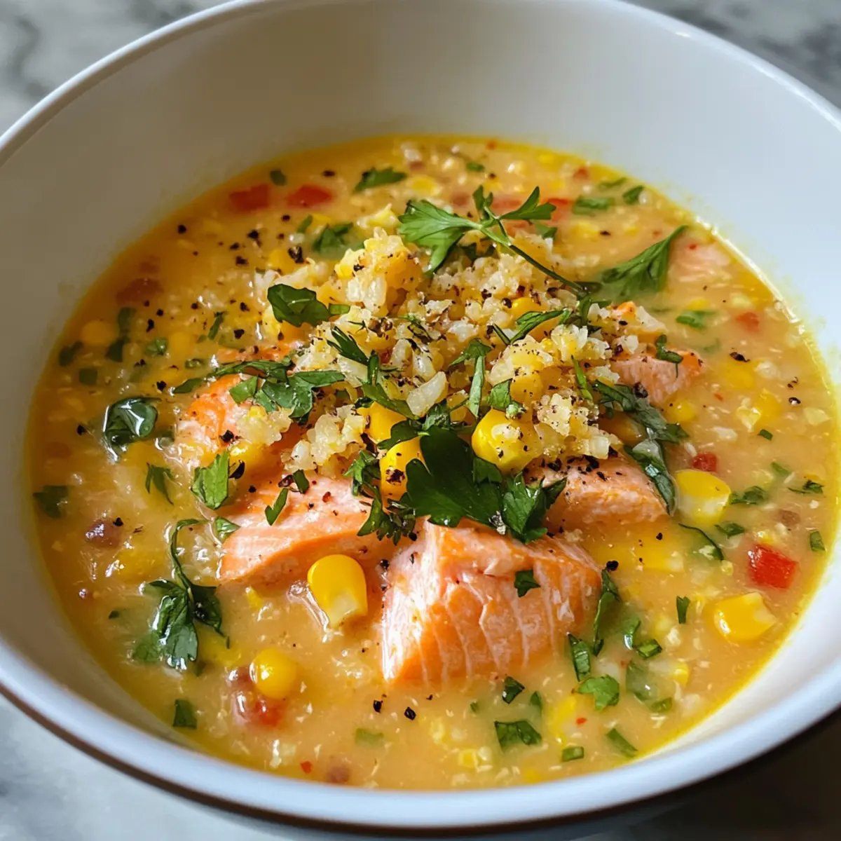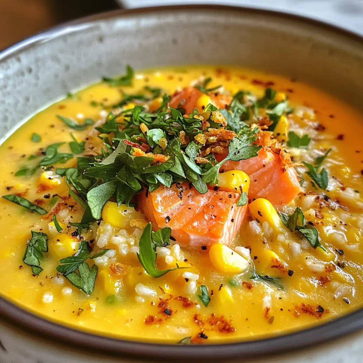 Unique Flavors: This Corn Gazpacho with Salmon & Crispy Rice captivates with its perfect balance of sweet and spicy, delivering a refreshing twist on traditional cold soup.
