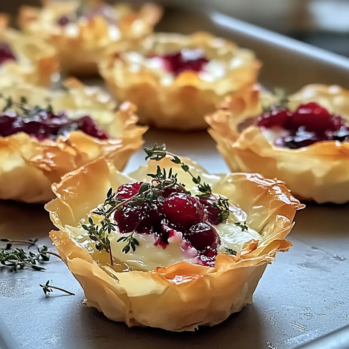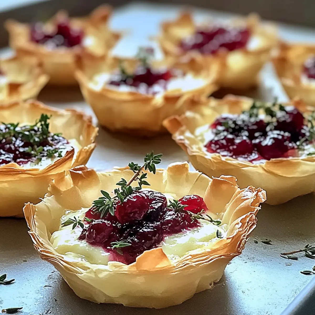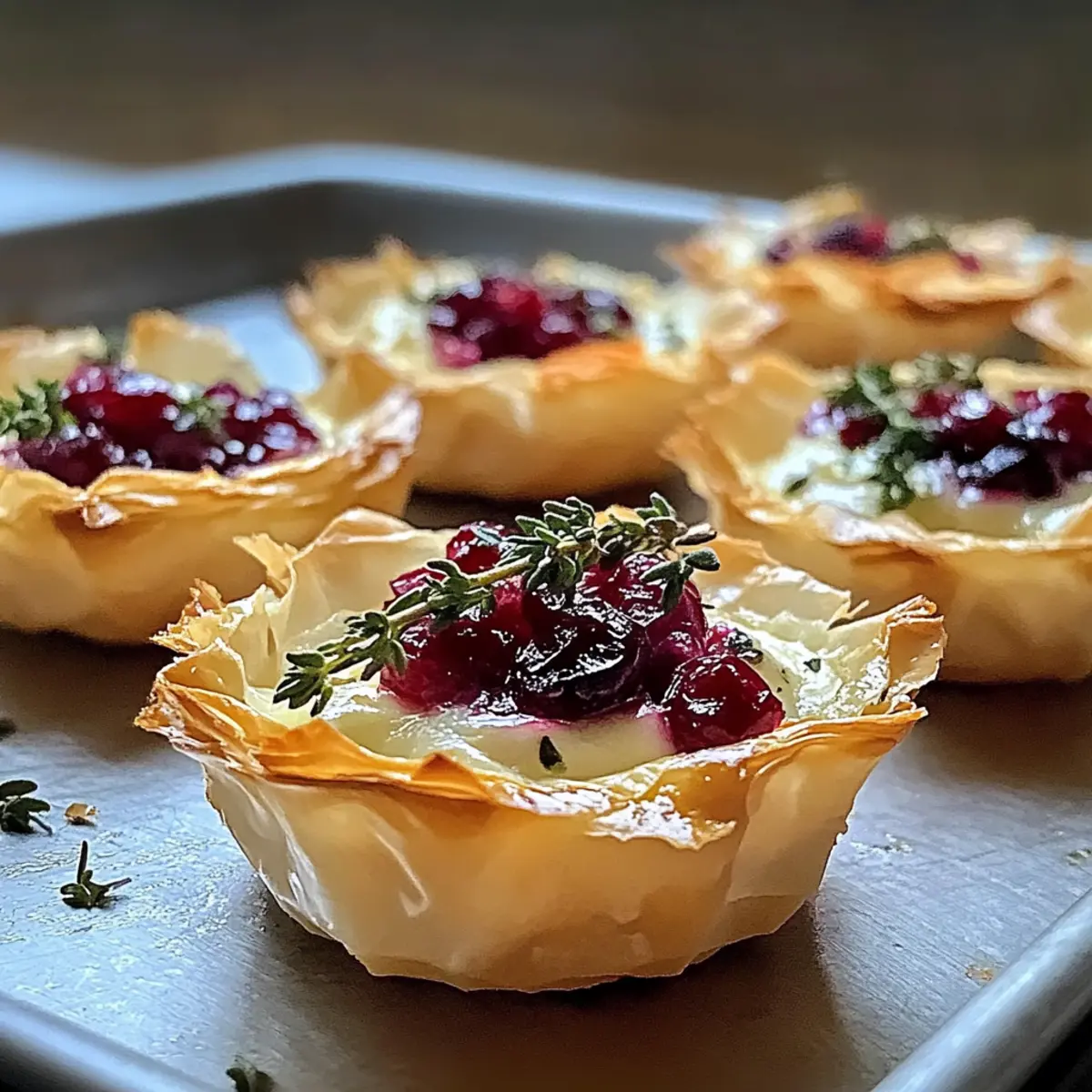 These Cranberry, Brie & Thyme Phyllo Cups are elegant appetizers that combine creamy Brie, tart cranberries, and aromatic herbs for a delightful bite.