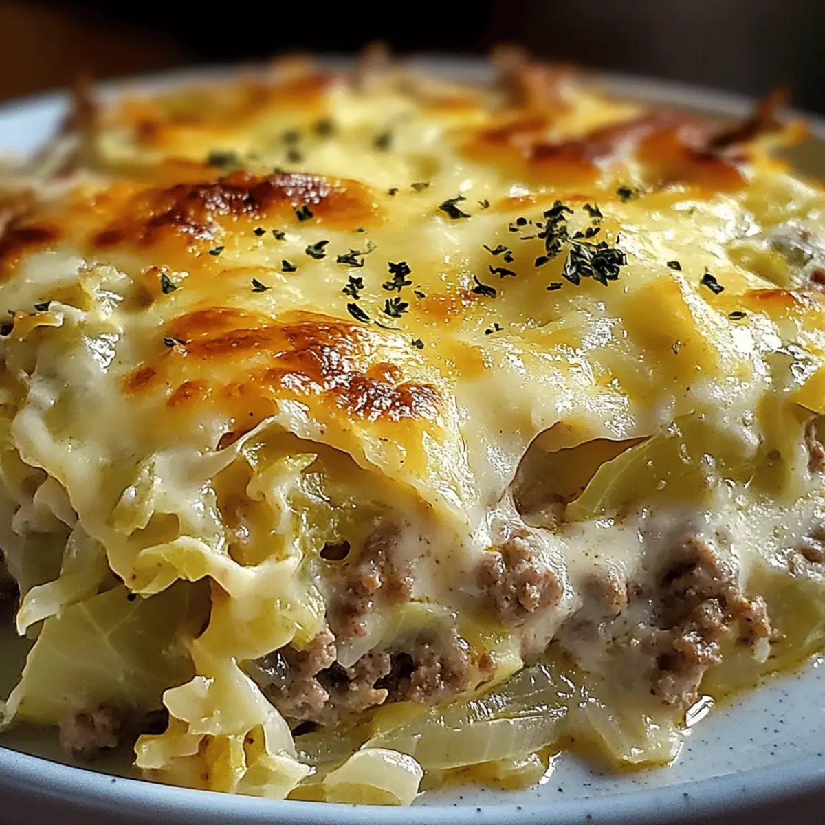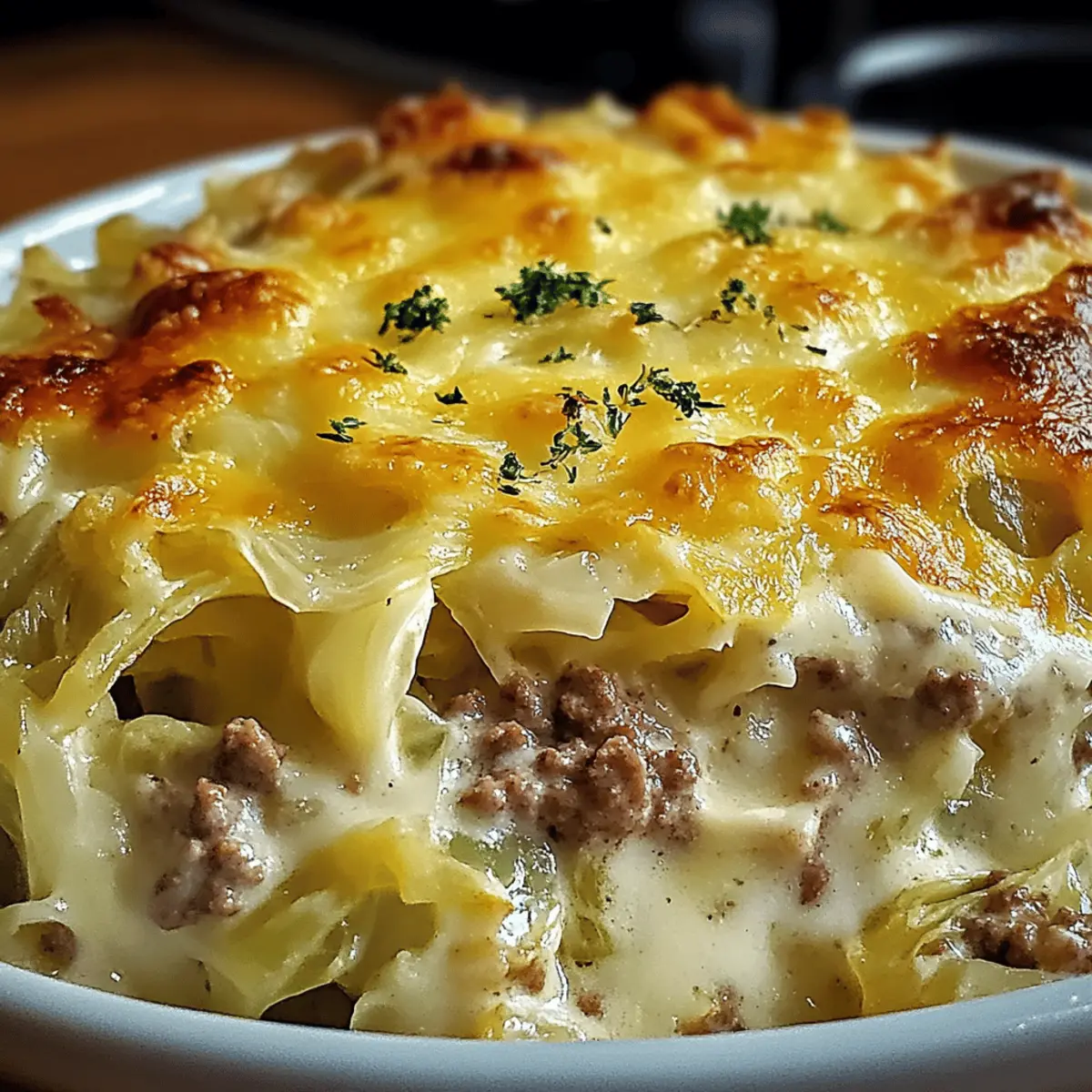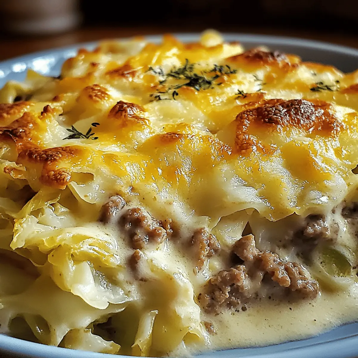 Jump to Recipe Print RecipeAs I rummaged through my pantry one rainy evening, the sight of a head of cabbage and a couple of ground beef packages whispered comfort to me. That’s when I decided to create my Creamed Cabbage and Ground Beef Casserole, a warm embrace in a dish! Rich and creamy, this recipe is not only a crowd-pleaser perfect for family dinners but also impressively budget-friendly. Whether you’re looking to whip up a cozy weeknight meal or simply want to break free from fast food, this casserole offers a creative twist on comfort food that everyone will love. Plus, if you’re watching your carbs, it’s easily adaptable to fit into a low-carb lifestyle. Are you ready to discover how simple it can be to create a satisfying home-cooked meal? Let’s dive in! Why is this casserole a must-try? Budget-Friendly: This Creamed Cabbage and Ground Beef Casserole is kind to your wallet while still delivering fantastic flavor. Hearty and Filling: With ground beef and melty cheese, it satisfies even the hungriest of appetites. Easy Preparation: You can whip this up with minimal effort, making weeknight dinners a breeze. Customizable: Feel free to add your favorite veggies or swap the beef for turkey, allowing for endless variations. Crowd-Pleaser: Whether it’s family night or a gathering with friends, this comforting dish is sure to impress. Enjoy it paired with a crisp green salad or warm dinner rolls for a complete meal! Creamed Cabbage and Ground Beef Casserole Ingredients • Let’s gather everything you need for this delightful dish! For the Casserole • Ground beef – Offers a hearty texture and protein; opt for 80/20 for the best flavor. • Olive oil – Essential for sautéing; feel free to substitute with your favorite cooking oil. • Onion – Adds sweetness and depth; a small yellow onion works perfectly. • Garlic – Infuses the dish with flavor; fresh minced garlic brings out the best taste. • Cabbage – The star of the show! Green cabbage is preferred, but red cabbage also works. • Cream of mushroom soup – Serves as the creamy base; can be replaced with cream of chicken for variation. • Sour cream – Adds delicious tanginess; Greek yogurt can be used as a low-fat substitute. • Heavy cream or milk – Helps to thin the sauce; for a lighter option, use milk. • Cheddar cheese – Brings a sharp and comforting flavor; fresh shredded is the way to go. • Mozzarella cheese – Adds a creamy texture; Monterey Jack is a great substitute if you prefer. For Seasoning • Salt – Enhances all the flavors in the casserole. • Black pepper – Adds a bit of warmth; adjust according to your taste! • Smoked paprika – Provides a delightful smoky note that elevates the dish. • Dried thyme – A classic herb for that comforting flavor profile. For Topping (Optional) • Crushed crackers or breadcrumbs – Adds a lovely crunch; feel free to omit for a low-carb option. This Creamed Cabbage and Ground Beef Casserole is a warm embrace on a chilly night, packing in layers of flavor and comfort that are sure to please everyone at the table! Step‑by‑Step Instructions for Creamed Cabbage and Ground Beef Casserole Step 1: Preheat and Prepare Begin by preheating your oven to 375°F (190°C). While it heats, grab a 9×13-inch baking dish and grease it lightly with cooking spray or butter to prevent sticking. This Creamed Cabbage and Ground Beef Casserole will benefit from a well-prepped dish, setting the stage for a bubbling, golden masterpiece. Step 2: Brown the Beef and Onions In a large skillet over medium-high heat, pour in a splash of olive oil. Once shimmering, add the ground beef and diced onion, cooking for about 5-7 minutes. Stir frequently until the beef is perfectly browned and the onion becomes translucent. Drain any excess fat to keep the casserole nice and light. Step 3: Add Garlic and Seasonings Stir in the minced garlic along with salt, black pepper, smoked paprika, and dried thyme into the skillet. Continue cooking for about a minute, allowing the fragrant notes to fill your kitchen. This blend of seasonings will elevate your Creamed Cabbage and Ground Beef Casserole, enhancing every bite with robust flavor. Step 4: Sauté the Cabbage Next, toss in the chopped cabbage, stirring everything together. Sauté for approximately 5 minutes until the cabbage starts to soften but still maintains a slight crunch. The vibrant green should wilt down a bit, fitting snugly amongst the beef and spices, building a hearty foundation for the casserole. Step 5: Mix the Creamy Base While the cabbage cooks, grab a mixing bowl and combine the cream of mushroom soup, sour cream, and heavy cream or milk. Whisk until smooth and fully blended. This creamy sauce will provide the delightful richness that binds all the ingredients in your Creamed Cabbage and Ground Beef Casserole together beautifully. Step 6: Combine Everything in the Skillet Pour the creamy mixture into the skillet with the beef and cabbage. Stir everything gently to ensure the creamy base evenly coats the ingredients. This-step is crucial for achieving that luscious texture and flavor throughout, making it the star of your comforting dish. Step 7: Transfer and Top Now, spoon the mixture into your prepared baking dish, spreading it out evenly. Generously top with freshly shredded cheddar and mozzarella cheese, covering the entire surface. If you love a little crunch, sprinkle crushed crackers or breadcrumbs on top to enhance the texture of your Creamed Cabbage and Ground Beef Casserole. Step 8: Bake to Perfection Place the casserole in your preheated oven and let it bake uncovered for 25-30 minutes. You’re looking for a bubbly, golden top that invites you to dig in. The kitchen will fill with irresistible aromas as the cheese melts into a gooey delight. Step 9: Rest Before Serving Once baked, remove the casserole from the oven and allow it to sit for 5-10 minutes. This resting time is essential as it hel