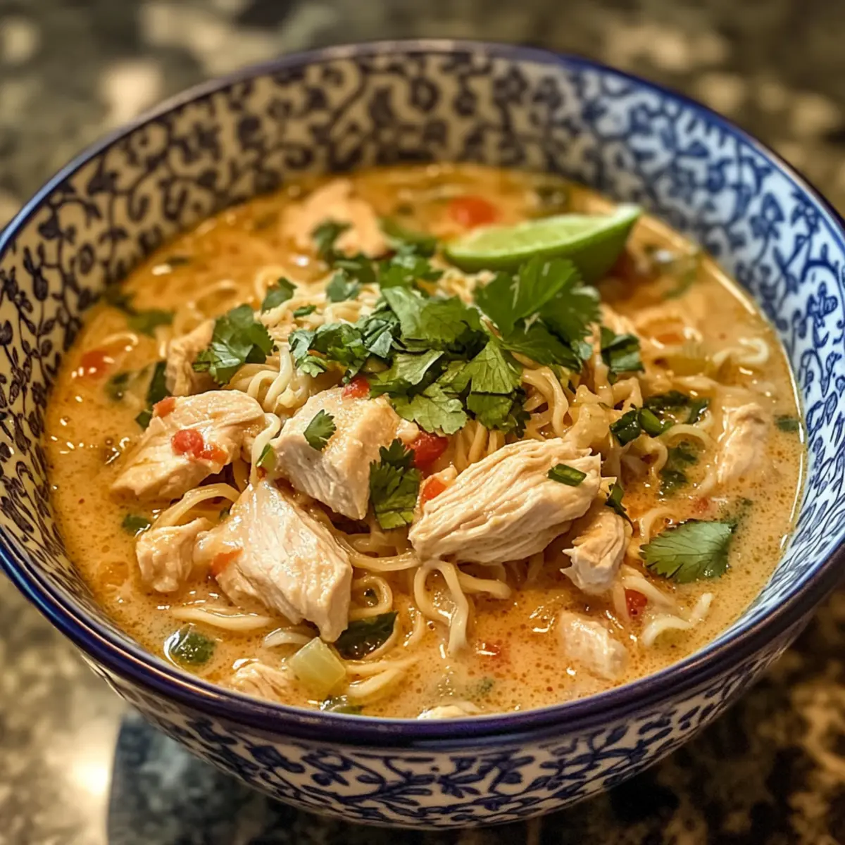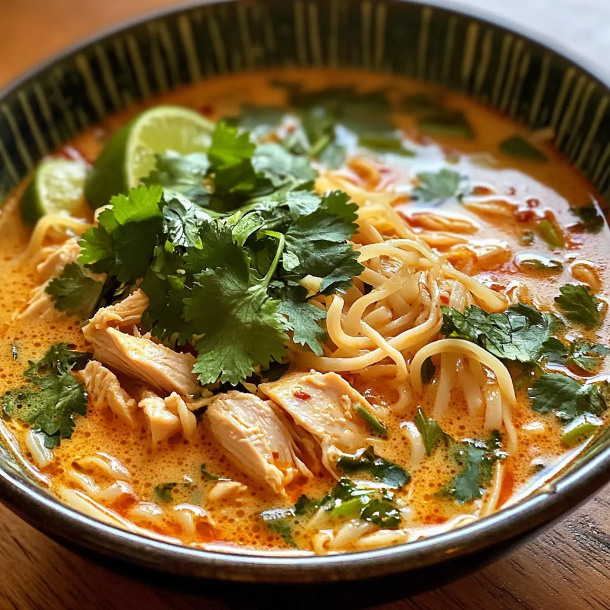 Jump to Recipe Print RecipeAs I stirred the pot, the fragrance of coconut milk and spices danced in the air, transporting me to a bustling market in Thailand. This Thai-Inspired Creamy Chicken Noodle Soup is my go-to solution for those evenings when I crave comfort but don’t have hours to spend in the kitchen. With the rich creaminess of coconut milk and the delightful chew of ramen noodles, this dish is not just a meal; it’s a warm embrace in a bowl. Perfect for busy weeknights, you can whip it together in under 30 minutes while using leftover rotisserie chicken to make it even quicker. Ready to discover the ultimate comfort food recipe that will redefine your weeknight dinners? Let’s dive in! Why is this soup a must-try? Creamy Texture: The luscious coconut milk creates an irresistible velvety broth that envelops tender chicken and chewy ramen noodles. Speedy Preparation: Ready in under 30 minutes, this recipe is perfect for busy weekdays, allowing you to enjoy a hearty meal without sacrificing time. Flavor Fusion: Infused with aromatic Thai spices, this soup offers a unique take on a classic comfort food, delighting your taste buds with every spoonful. Versatility: Whether using rotisserie chicken, leftovers, or fresh chicken, you can adapt this recipe to fit your pantry staples, making it an easy choice for any night. Crowd-Pleaser: This soup is a hit among family and friends, offering a delightful twist that will impress and satisfy every palate. Enhance it further by serving with fresh herbs like cilantro or a squeeze of lime for added brightness! Creamy Chicken Noodle Soup Ingredients For the Soup Base • Coconut Oil – Makes a great base for sautéing, adding a subtle hint of flavor; olive oil works as a good substitute. • Red Onion – Offers a sweet depth to the soup; feel free to use yellow onion if that’s what you have. • Red Bell Pepper – Adds a pop of color and sweetness; yellow or orange peppers can provide even more sweetness. • Carrot – Brings natural sweetness and a satisfying crunch; pre-boiling can soften it up nicely. • Garlic – Essential for that aromatic flavor; adjust the quantity based on your love for garlic. • Kosher Salt – Enhances the overall flavor; sea salt or regular salt can be used, just adjust to your taste. For the Creamy Element • Coconut Milk – Gives the soup its creamy texture and sweetness; full-fat gives more richness, but light can be used to cut calories. • Water or Broth – Needed to form the soup base; warm water or chicken/vegetable broth both work wonderfully. For the Protein • Rotisserie Chicken – A convenient option already cooked and shredded; leftover or fresh chicken can substitute seamlessly. For the Noodles • Ramen Noodles – Quick-cooking and delightful; be sure to discard the seasoning packet. Alternatives include rice noodles or soba for a different texture. For Seasoning • Turmeric – Adds a comforting warmth and vibrant color; curry powder can work in a pinch. • Sweet Paprika – Provides a mild warmth; for an extra flavor kick, consider using smoked paprika. • Hot Sauce – Essential for elevating the flavor profile; adjust according to your heat preference. Get ready for a delightful bowl of Creamy Chicken Noodle Soup that warms your soul and satisfies any craving! Step‑by‑Step Instructions for Creamy Chicken Noodle Soup Step 1: Pre-Boil the Carrots Begin by bringing a small pot of water to a boil over high heat. Once boiling, add the chopped carrot pieces and let them cook for about 3-5 minutes until they are slightly tender but still crisp. Drain the carrots and set them aside, allowing their vibrant orange color to enhance the visual appeal of your creamy chicken noodle soup. Step 2: Sauté the Aromatics In a large pan, heat 2 tablespoons of coconut oil over medium heat until shimmering. Add the chopped red onion and sauté for 4-5 minutes, stirring frequently, until the onion becomes soft and translucent. This fragrant base will complement the rich flavors of your soup, filling your kitchen with warmth and inviting aromas. Step 3: Add Garlic and Chicken Stir in 2 minced garlic cloves and cook for an additional minute, ensuring to stir constantly to prevent burning. Next, add the shredded rotisserie chicken and chopped red bell pepper to the pan. Sprinkle in half a teaspoon of turmeric and sweet paprika, mixing everything thoroughly to coat the ingredients in those vibrant spices. Step 4: Combine Remaining Ingredients Add the pre-boiled carrots back into the pan along with a splash of hot sauce for a kick of flavor. Stir the mixture well to combine all the ingredients and allow them to infuse the base with their unique tastes for a couple of minutes over medium heat. Step 5: Add Coconut Milk and Broth Pour in one can of coconut milk, stirring it into the mixture even before the chicken has fully cooked through. Fill the empty coconut milk can with either water or chicken broth and add it directly to the pan. This will create the creamy, rich base that defines your creamy chicken noodle soup. Step 6: Bring to a Simmer Increase the heat to medium-high and bring the soup to a gentle simmer. Once simmering, lower the heat slightly and allow it to gently bubble for 5-7 minutes, letting the flavors meld beautifully while the soup thickens, creating a luxurious texture. Step 7: Cook the Ramen Noodles Add the ramen noodles to the soup, ensuring they are submerged in the creamy mixture. Cook for about 3-4 minutes, stirring occasionally, until the noodles are tender but still chewy. Be careful not to overcook the noodles, as they are best when they still have a bit of bite. Step 8: Serve and Enjoy Once the noodles are cooked, ladle the creamy chicken noodle soup into bowls. For an added touch, consider garnishing with fresh herbs like cilantro or basil and a squeeze of lime to brighten the flavors. Serve hot, and revel in the comforting warmth of this delightful Thai-inspired creati