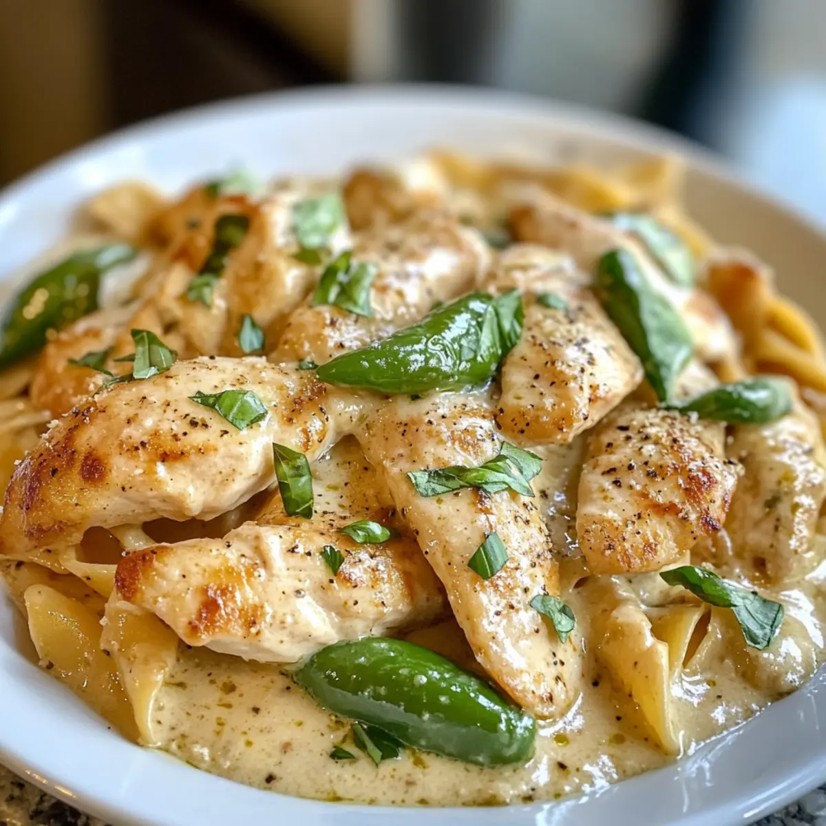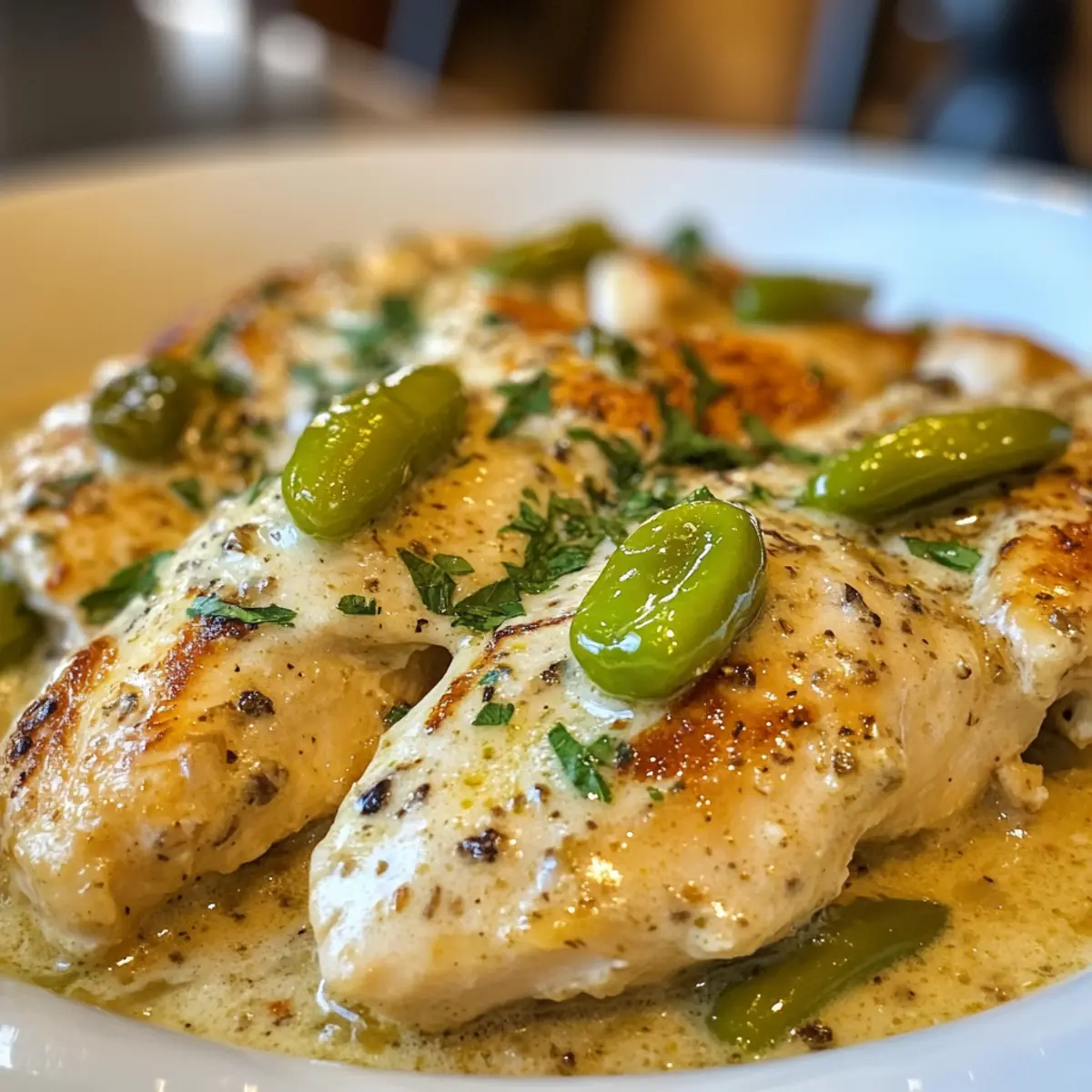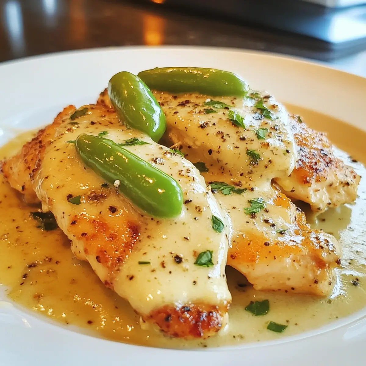 Jump to Recipe Print RecipeAs I stood in my kitchen, the aroma of sizzling chicken mingling with garlic and onion transported me back to family dinners filled with laughter and warmth. This Creamy Pepperoncini Chicken Skillet is a dish that’ll quickly become a favorite in your home as it brings together the rich, velvety flavors of Parmesan cream and the vibrant zest from pepperoncini peppers. In just 30 minutes, you can whip up this easy dinner that is perfect for those busy weeknights when you crave warmth and comfort instead of fast food. Plus, it’s not only a crowd-pleaser but also allows for delightful variations to suit your tastes. Ready to dive into a hearty bowl of deliciousness? Let’s get cooking! Why is This Skillet Recipe a Must-Try? Quick Cooking Time: In just 30 minutes, you can prepare a delicious meal without the hassle of extensive cooking. Perfect for busy weeknights! Versatile Ingredients: This dish easily adapts to your pantry staples. Swap chicken for turkey or use any seasonal veggies like spinach or mushrooms to enhance it! Comfort in Every Bite: The creamy, rich sauce combined with the zesty kick of pepperoncini offers a satisfying experience, reminiscent of comforting Italian-American classics. Crowd-Pleasing Appeal: Serve this Creamy Pepperoncini Chicken Skillet at family gatherings or casual dinner parties, and watch it disappear! Paired with a crisp salad or a glass of Sauvignon Blanc, it’s a guaranteed hit. Dairy-Free Option Available: For those with dietary restrictions, simply replace the heavy cream with coconut cream and Parmesan with nutritional yeast for a delicious dairy-free alternative! Creamy Pepperoncini Chicken Skillet Ingredients For the Sauce Butter – Adds richness and flavor; can use olive oil for a lighter version. Chicken (2 lbs, cut into thin strips) – Main protein source that makes the dish hearty; chicken thighs can be a juicier alternative. Heavy Cream (1 cup) – Creates a creamy texture for the sauce; can swap with coconut cream for a dairy-free version. Parmesan Cheese (½ cup, shredded) – Adds savory umami; can experiment with mozzarella for a milder taste. Chicken Stock (½ cup) – Provides base flavor for the sauce; vegetable or beef stock can be substituted. For the Flavors Sea Salt (1 tsp) – Enhances flavors of the chicken and sauce; adjust based on your palate. Ground Pepper (1 tsp) – Adds seasoning depth; freshly ground is preferred for more flavor. Italian Seasoning (1 tbsp) – Blends flavors and herbs; can replace with individual herbs like oregano and basil. For the Veggies White Onion (1, diced) – Provides sweetness and aromatic depth when sautéed; yellow onion may be substituted. Garlic (2 tbsp, diced) – Imparts flavor and richness; can use garlic powder (1 tsp) if fresh is not available. Roasted Red Pepper (½ cup, sliced) – Adds sweetness and color; can use fresh bell peppers if preferred. Pepperoncini Peppers (½ cup, drained) – Gives the dish a tangy zest; substitute with jalapeños for extra heat. This Creamy Pepperoncini Chicken Skillet recipe will surely bring warmth and joy to your table! Step‑by‑Step Instructions for Creamy Pepperoncini Chicken Skillet Step 1: Prepare Chicken Begin by cutting the chicken into thin strips, ensuring all pieces are similar in size for even cooking. Season the strips generously with sea salt and freshly ground pepper to enhance their flavor. This seasoning step is crucial for a flavorful Creamy Pepperoncini Chicken Skillet. Step 2: Cook Chicken In a large skillet, melt 2 tablespoons of butter over medium-high heat. Once the butter is bubbling, add the seasoned chicken strips to the skillet. Sauté the chicken for about 8 minutes, turning occasionally, until it’s golden brown on all sides. When the chicken is nicely browned, remove it from the skillet and set it aside. Step 3: Sauté Aromatics Using the same skillet with the remaining juices, add the diced white onion and minced garlic. Sauté these aromatics over medium heat for around 5 minutes, or until the onions are translucent and slightly golden. The enticing aromas will fill your kitchen, setting the stage for the creamy sauce to come. Step 4: Simmer Sauce Pour in ½ cup of chicken stock and add the sliced roasted red peppers to the skillet, scraping up any browned bits from the bottom. Allow the mixture to simmer for about 5 minutes, letting it reduce by half and intensifying the flavors. This reduction is key to achieving a rich base for your Creamy Pepperoncini Chicken Skillet. Step 5: Incorporate Cream Remove the skillet from heat and stir in 1 cup of heavy cream along with ½ cup of shredded Parmesan cheese. Mix until smooth and creamy, creating a luscious sauce that will envelop the chicken. This rich creaminess is what makes this dish so comforting and satisfying. Step 6: Add Seasonings Return the skillet to medium heat and sprinkle in 1 tablespoon of Italian seasoning and the drained pepperoncini peppers. Stir well to combine all the ingredients, allowing the flavors to meld beautifully. This step gives your Creamy Pepperoncini Chicken Skillet its signature tangy kick. Step 7: Finish Cooking Add the browned chicken back into the skillet, stirring until it’s coated with the creamy sauce. Cook for an additional 4-5 minutes, stirring frequently, until the chicken is cooked through and reaches an internal temperature of 165°F. The sauce will thicken slightly during this time, creating a delightful consistency. Step 8: Serve Once everything is well combined and cooked through, remove the skillet from heat. Serve the Creamy Pepperoncini Chicken Skillet hot over your choice of rice, pasta, or steamed vegetables for a complete meal. Enjoy the comforting flavors of this hearty dish! Make Ahead Options These Creamy Pepperoncini Chicken Skillets are perfect for busy weeknight meal prep! You can slice the chicken, dice the onions, and prepare the garlic up to 24 hours in advance, storing them in