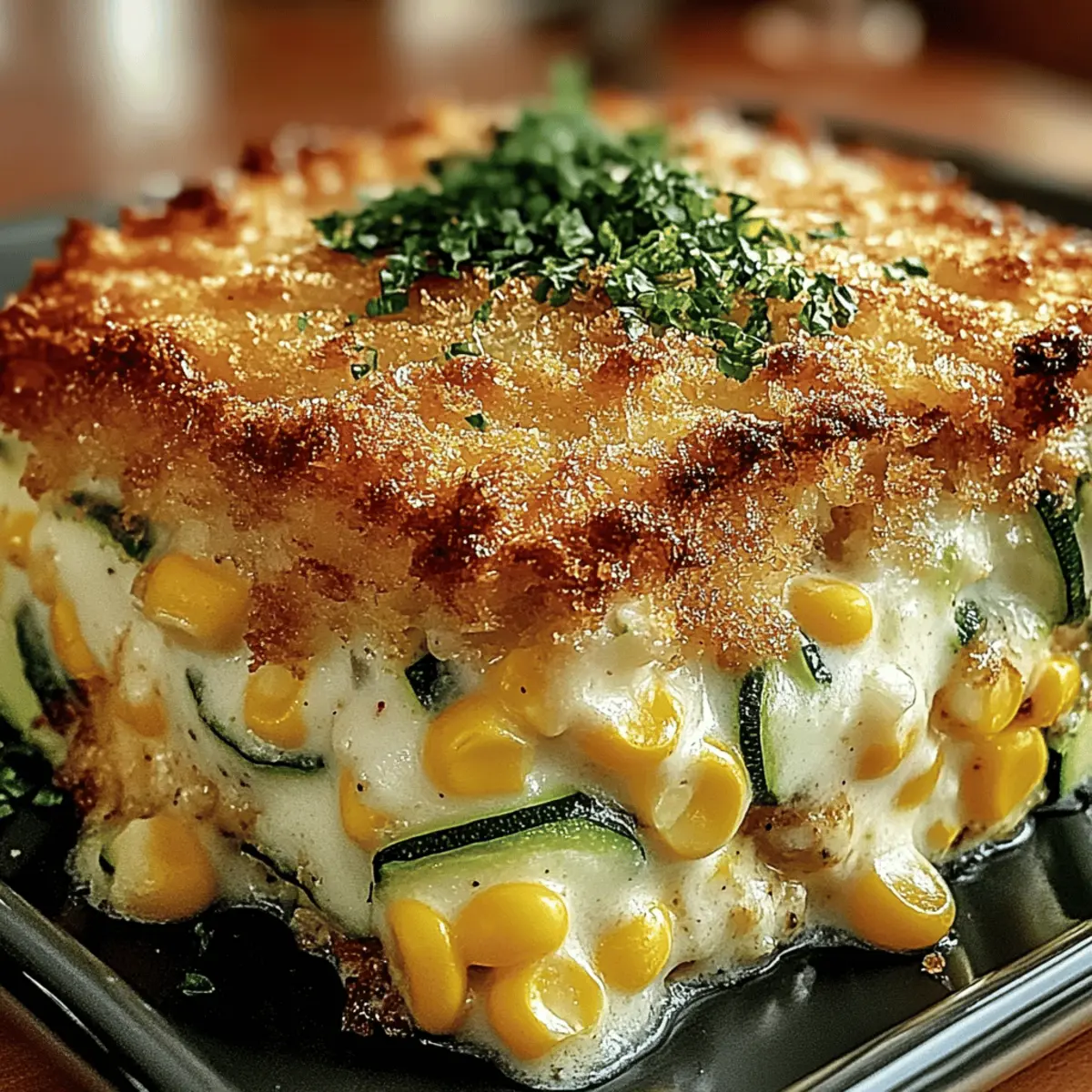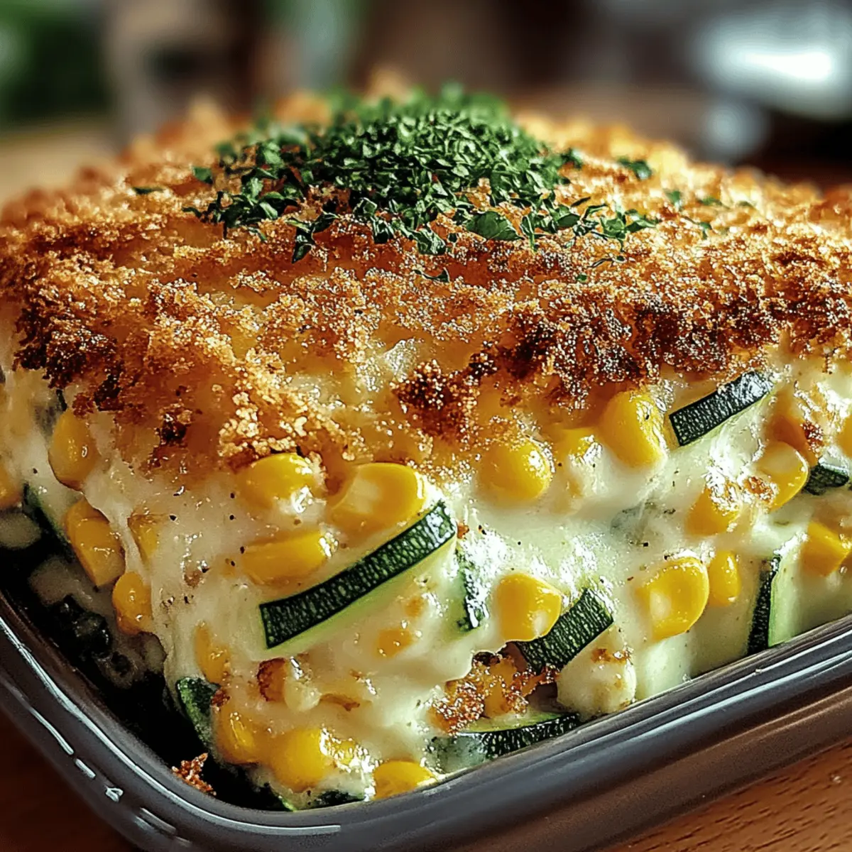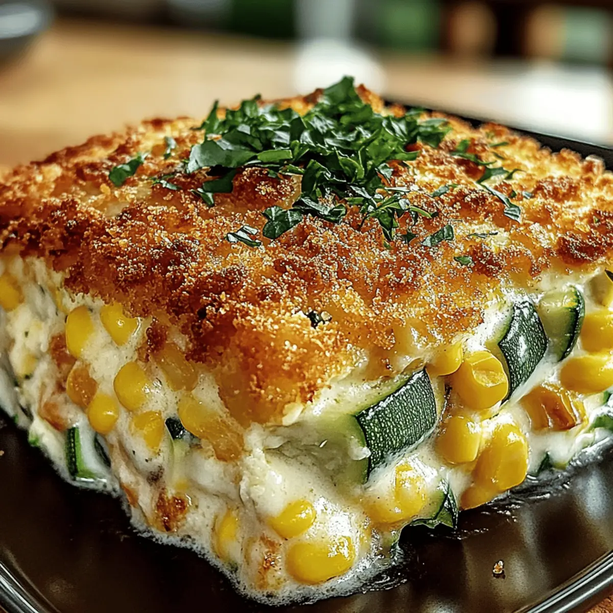Jump to Recipe Print RecipeAs I stood in my kitchen, the sweet aroma of summer filled the air and drew me back to sunny picnics and laughter. That’s when I decided to whip up a batch of my Creamy Zucchini & Sweet Corn Casserole, a dish that perfectly captures those vibrant flavors. This vegetarian delight is not only a comforting comfort food but also a fantastic way to use up seasonal produce with minimal effort. It features a creamy and cheesy interior, beautifully complemented by a crunchy breadcrumb topping. Whether you’re enjoying a family dinner or looking to impress guests at your next potluck, this casserole is sure to be a crowd-pleaser. Plus, it’s easy to make gluten-free or even vegan, making it a versatile option for everyone. Curious to see how this dish comes together? Let’s dive into the recipe! Why is this casserole a must-try? Flavorful Layers: Each bite of the Creamy Zucchini & Sweet Corn Casserole bursts with delightful sweetness from seasonal corn, perfectly balanced with the mild earthiness of zucchini. Comforting Texture: The velvety filling beneath a crunchy breadcrumb topping creates a satisfying contrast that makes every serving irresistible. Quick Prep Time: Ready in under an hour, this dish is perfect for busy weeknights or last-minute gatherings without compromising on quality. Versatility Awaits: Easily adapt it to suit your dietary needs! Try Vegetarian Casserole Caesar for another scrumptious twist. Crowd-Pleasing Appeal: Ideal for gatherings, this casserole is bound to win hearts, making leftovers unlikely! Serve it alongside a crisp side salad for a complete meal. Creamy Zucchini & Sweet Corn Casserole Ingredients For the Casserole Base Zucchini – Adds moisture; be sure to squeeze out excess liquid for best results. Sweet Corn – Fresh or frozen works beautifully, lending natural sweetness to the dish. Ricotta Cheese – Delivers creaminess and binds the casserole; for a vegan option, use plant-based cheese. Shredded Mozzarella Cheese – Essential for that gooey texture; consider dairy-free mozzarella for a vegan choice. Grated Parmesan Cheese – Provides a salty flavor boost; nutritional yeast makes a great vegan alternative. Large Eggs – Acts as a binder; substitute with flaxseed meal or an egg replacer for a vegan version. Milk – Enhances creaminess; almond milk or any dairy-free milk can be used as a substitute. Garlic Powder – Adds savory depth; fresh garlic may give a bolder flavor if preferred. Onion Powder – Brings aromatic sweetness; fresh onions can be used but will change the texture. Dried Oregano – Offers herbaceous notes; thyme can be a lovely substitute in this casserole. Smoked Paprika (optional) – Introduces a hint of smokiness; feel free to omit if you’re without it. For the Topping Breadcrumbs – Offers that delightful crunch; panko yields a lighter texture, while gluten-free panko is a great alternative. Olive Oil – Moistens the topping while amplifying flavors; don’t skip this for that magical crispiness. Fresh Parsley – Use for garnish, lending a pop of color and freshness to your creamy zucchini & sweet corn casserole creation. Step‑by‑Step Instructions for Creamy Zucchini & Sweet Corn Casserole Step 1: Preheat the Oven Begin by preheating your oven to 375°F (190°C). While it’s heating up, take a 9×13-inch baking dish and grease it generously with olive oil, ensuring every corner is coated. This will help prevent the delicious Creamy Zucchini & Sweet Corn Casserole from sticking and allow for easy serving later. Step 2: Prepare the Zucchini Next, grate the zucchini using a box grater and place it in a clean kitchen towel. Twist the towel to squeeze out excess moisture, as removing this liquid is crucial to prevent a soggy casserole. You should be left with moist, yet drier grated zucchini ready to be mixed with other ingredients. Step 3: Mix the Base Ingredients In a large mixing bowl, combine the prepared zucchini with sweet corn, ricotta cheese, beaten eggs, and milk. Add garlic powder, onion powder, oregano, smoked paprika, salt, and pepper. Using a spatula, mix these ingredients vigorously until the mixture is smooth and creamy, showcasing the bright, fresh flavors of the Creamy Zucchini & Sweet Corn Casserole. Step 4: Incorporate the Cheeses Gently fold in half of the shredded mozzarella and grated Parmesan cheese to the zucchini mixture. Be careful not to overmix; you want those lovely pockets of cheese that will melt beautifully. This step ensures your casserole has that rich, cheesy goodness in every bite, enhancing the dish’s overall creaminess. Step 5: Transfer Mixture to Dish Pour the creamy zucchini and corn mixture into the greased baking dish, spreading it evenly with a spatula. This helps ensure an even bake throughout the casserole. As you spread the mixture, make sure to reach the edges, creating a nice layer that will hold together beautifully once baked. Step 6: Prepare the Topping In a separate bowl, mix the breadcrumbs with the remaining mozzarella, Parmesan, olive oil, and a pinch of salt. Combine these ingredients until the breadcrumbs are well-coated and evenly distributed. This topping will add a crunchy, golden layer atop your Creamy Zucchini & Sweet Corn Casserole, providing the perfect contrast to the soft filling below. Step 7: Top the Casserole Sprinkle the breadcrumb mixture evenly over the top of the casserole. Use your hands or a spatula to ensure that the topping covers the entire surface, ensuring every bite has that delightful crunch. This step is essential for achieving the ideal texture that complements the creamy filling. Step 8: Bake the Casserole Place the baking dish in your preheated oven and bake for 35-40 minutes. Keep an eye on it during the last 10 minutes; you’re looking for a golden-brown topping with bubbling cheese. The casserole should be set in the middle while offering a divine aroma that fills your kitchen. Step 9: Cool & Serve Once