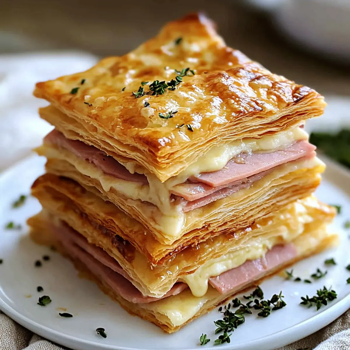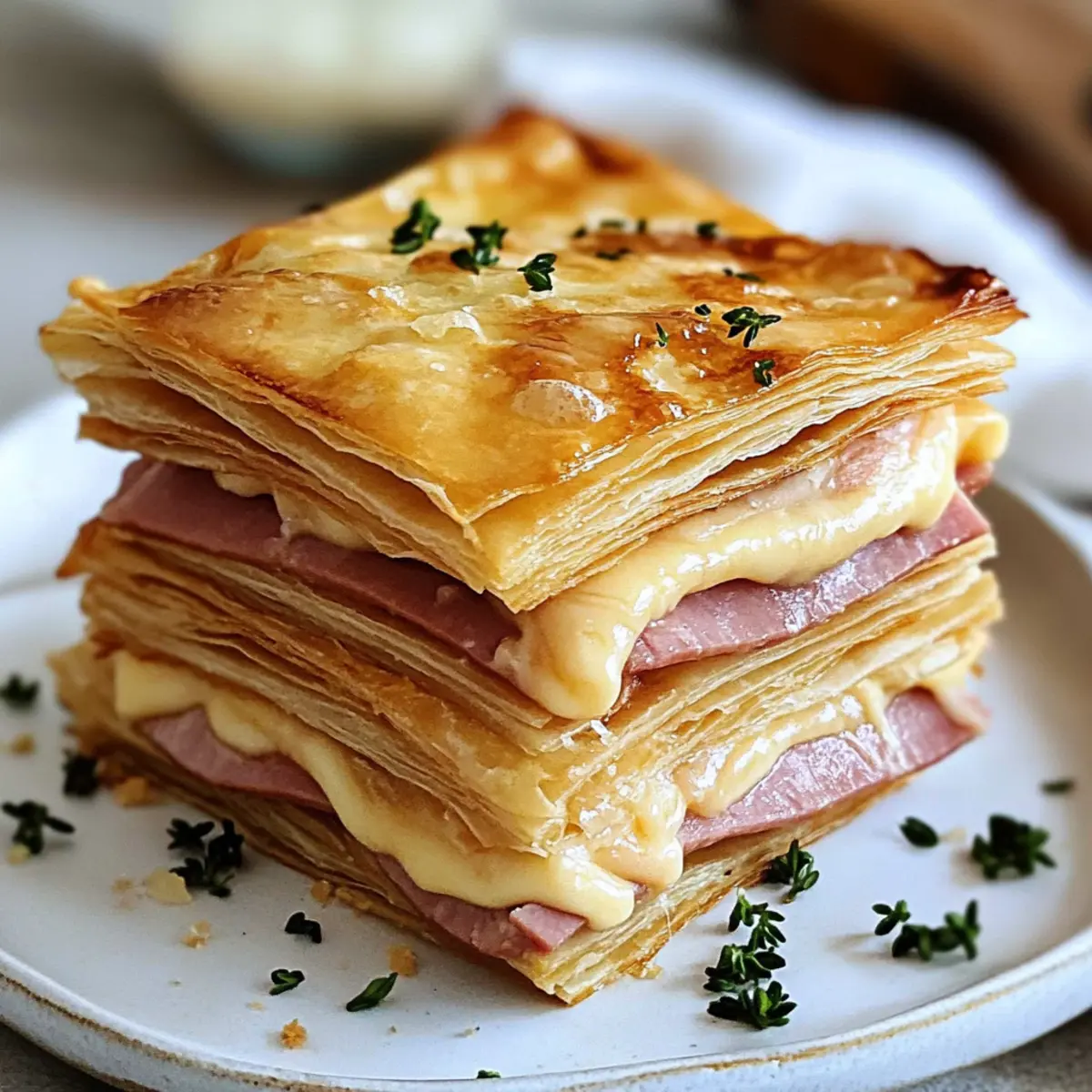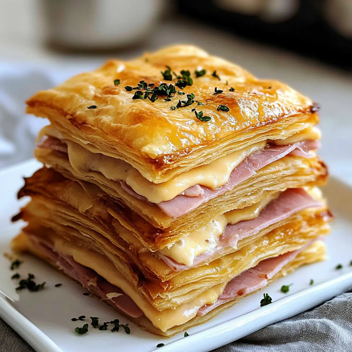 Jump to Recipe Print RecipeIn an age of constant distractions, there’s nothing quite like the comforting aroma of freshly baked pastry wafting through my kitchen. Today, I’m excited to share my favorite recipe for Crispy Ham & Cheese Puff Pastry Stacks—an elegant yet effortless appetizer that elevates any gathering. With just four ingredients and less than an hour of your time, these delightful stacks are the perfect solution for those busy nights or spontaneous guests. They’re not only a crowd-pleaser but also an easy way to impress with a touch of French flair. With their flaky layers giving way to gooey cheese and savory ham, every bite is a mini celebration. Ready to bring a bit of sophistication to your next snack time? Let’s dive into the recipe! Why are these stacks so irresistible? Simplicity and Elegance: With just four ingredients, you’ll whip these stacks up in no time, proving that gourmet doesn’t have to be complicated. Incredible Flavor: The savory ham beautifully complements the melty cheese, creating a taste sensation that’s sure to satisfy. Impress Your Guests: Perfect for game day or any gathering, these crispy bites elevate your appetizer game and leave a lasting impression. Versatile Options: Feel free to play with different cheeses or add herbs for a personalized touch. Enjoy them solo or paired with a light salad for a complete meal! Make Ahead Flexibility: Prepare them in advance; they freeze beautifully, allowing you to serve gourmet snacks anytime. You might also enjoy pairing these with Antipasto Cream Cheese Log for a delightful spread! Crispy Ham & Cheese Puff Pastry Stacks Ingredients • With these four simple ingredients, you’ll be well on your way to a deliciously easy appetizer! For the Puff Pastry Puff Pastry – Use butter-based for a richer flavor; ensure it’s thawed overnight in the fridge for easy handling. For the Filling Ham (Black Forest or Virginia) – Thinly sliced for even distribution, it adds a savory depth that will delight every palate. Cheese (Gruyère, Swiss, or Cheddar) – Choose a melting cheese that pairs well with ham for that creamy, gooey goodness. Dijon Mustard (optional) – Adds a tangy kick to the filling; feel free to omit if you prefer a milder taste. For Finishing Touches Egg (for egg wash) – Brush the tops with beaten egg for a beautiful golden finish when baked. Get ready to present your guests with these delectable crispy ham & cheese puff pastry stacks! Step‑by‑Step Instructions for Crispy Ham & Cheese Puff Pastry Stacks Step 1: Preheat the Oven Begin by preheating your oven to 400°F (200°C). This allows for a quick and even bake, helping your crispy ham & cheese puff pastry stacks achieve that golden-brown perfection. While the oven heats, gather your ingredients and prep your workspace for a smooth cooking experience. Step 2: Roll Out the Puff Pastry Once your oven is preheated, take your thawed puff pastry and roll it out on a lightly floured surface. Aim for a thickness of about 1/8 inch to ensure it bakes evenly. Use a rolling pin to gently flatten the pastry, being careful not to overstretch it, as you want those lovely buttery layers to remain intact for a flaky texture. Step 3: Assemble the Stacks Layer one sheet of rolled puff pastry on a baking sheet lined with parchment paper. Begin by evenly distributing thin slices of ham over the pastry, ensuring complete coverage. Follow this with your choice of cheese, adding a few optional dollops of Dijon mustard for extra flavor. Make sure the fillings are spread evenly to achieve consistent bites as you cut the final stacks. Step 4: Top and Seal the Pastry Place a second sheet of puff pastry on top of the filling to create a delicious sandwich. Firmly press the edges together, sealing in the savory goodness. Use a fork to crimp the edges; this not only secures the filling but also adds a decorative touch to your crispy ham & cheese puff pastry stacks. Step 5: Brush with Egg Wash Prepare an egg wash by whisking one egg in a small bowl. Using a pastry brush, gently coat the top of the stacked pastry with the beaten egg. This step is essential for achieving a shiny, golden crust once baked. The egg wash will also help the layers stick together beautifully, creating an impressive presentation. Step 6: Bake to Perfection Place the assembled stacks in the preheated oven and bake for 20-25 minutes, or until they are puffed up and golden brown. Keep a close eye during the last few minutes, as the color will deepen quickly. You’ll know they’re ready when you see a beautifully golden exterior and a delicious aroma fills your kitchen. Step 7: Cool and Cut Once your crispy ham & cheese puff pastry stacks are out of the oven, let them cool on the baking sheet for about 5 minutes. This allows the interior to set, making them easier to cut. Use a sharp serrated knife to slice them into squares or rectangles; this will help keep those delicious layers intact while serving. Expert Tips for Crispy Ham & Cheese Puff Pastry Stacks Thaw Thoughtfully: Always thaw puff pastry overnight in the fridge for better handling and texture. This prevents it from becoming sticky or tearing. Perfect Slicing: Use a sharp serrated knife to cut your baked stacks. This will ensure clean lines without squishing the flaky layers of your crispy ham & cheese puff pastry stacks. Chill Before Baking: If assembled, chilling the stacks for 30 minutes before baking helps maintain their shape, resulting in perfectly puffed pastries. Watch the Bake: Keep an eye on your stacks during the last few minutes of baking. They can go from golden to burnt quickly, so don’t leave them unattended! Egg Wash Benefits: An egg wash not only gives a golden sheen but also helps bind the layers together, creating a visually appealing finish. How to Store and Freeze Crispy Ham & Cheese Puff Pastry Stacks Fridge: Store baked stacks in an airtight container for up to 3 days. Reheat in a 350°F (175°C)