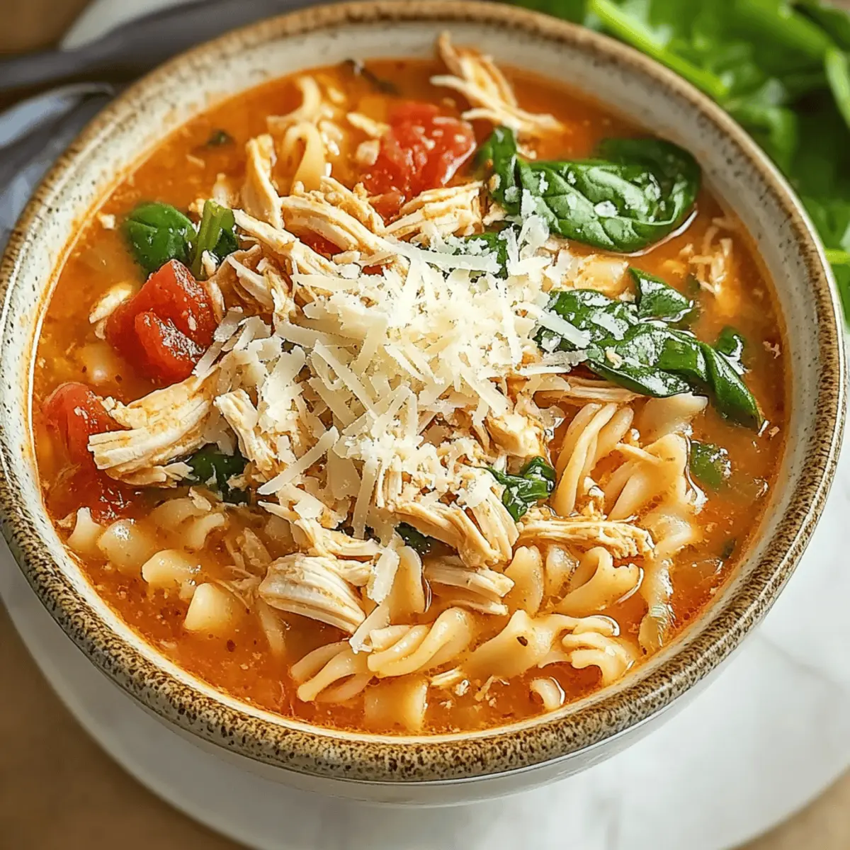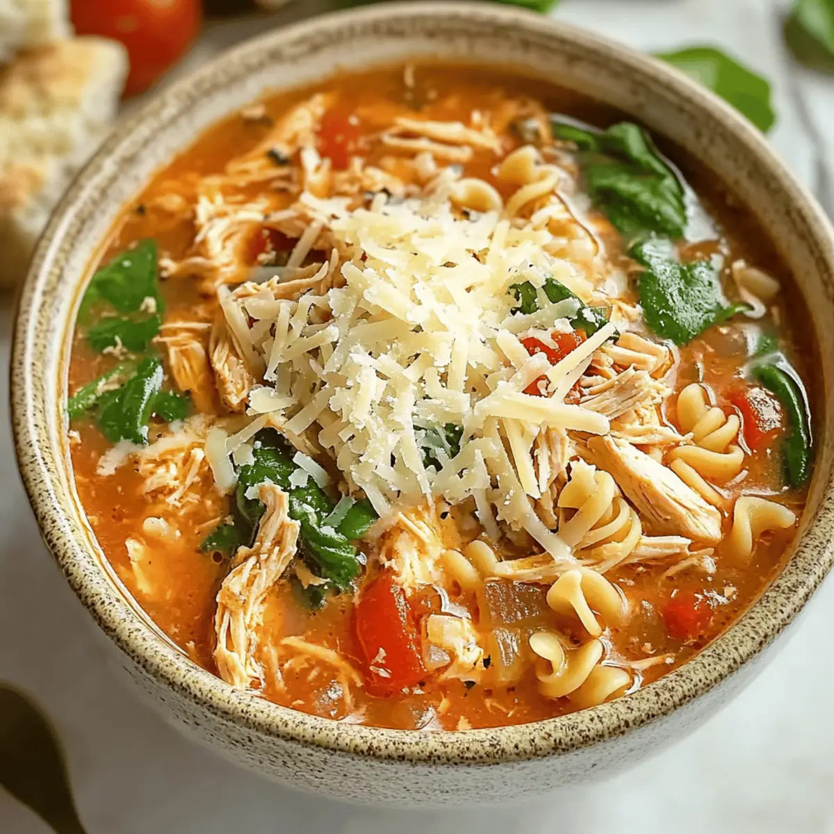 Jump to Recipe Print RecipeOn a chilly evening, nothing wraps you in warmth quite like a hearty bowl of soup, and today I’m excited to share my Easy Crockpot Chicken Parmesan Soup. This delightful dish marries tender chicken with a rich tomato broth, delivering all the comfort of a classic Chicken Parmesan but with far less fuss. Not only is it wonderfully simple to prepare, but it also caters to a variety of dietary needs—whether you’re gluten-free, dairy-free, or following a low-carb lifestyle. With just a little time in your slow cooker, you’ll create a comforting meal that will leave your family begging for seconds. Curious about how to transform everyday ingredients into a cozy Italian-inspired dinner? Let’s dive in! What makes this soup a must-try? Hearty and Flavorful: This Crockpot Chicken Parmesan Soup packs a punch with the robust flavors of tomatoes, chicken, and savory Italian herbs. Effortlessly Easy: Simply toss your ingredients into the crockpot and let it work its culinary magic while you enjoy your day. Diet Friendly: With easy variations for gluten-free, dairy-free, and keto diets, everyone can enjoy a bowl! Crowd-Pleasing: This dish is perfect for family dinners or entertaining friends, making meal-time a breeze. Comforting Aroma: The delightful smell wafting through your home will make everyone gather in anticipation for dinner. Dive into cozy culinary bliss with this recipe and check out my other comforting soup recipes for more warming ideas! Crockpot Chicken Parmesan Soup Ingredients For the Base Chicken Breast – A key protein that adds heartiness; use fresh, pink-tinged cuts for the best flavor. Tomato Sauce – Forms the rich base of the soup; opt for high-quality canned varieties for maximum taste. Onions & Garlic – Essential aromatics that create a robust flavor; sauté until translucent for optimum aroma. Olive Oil – Used for cooking the aromatics; it adds a lovely richness to the overall dish. For the Seasoning & Flavor Dried Herbs (Basil & Oregano) – Elevate the flavors beautifully; store in a cool, dark place to maintain freshness. Salt & Pepper – Crucial for seasoning; adjust to your personal taste for the perfect balance. For Texture Pasta – Short pasta like elbows adds delicious texture; be sure to adjust cooking time to keep it al dente. Vegetables (Spinach or Kale) – Toss in towards the end for added nutrition and vibrant color; fresh options work best. For a Rich Finish Parmesan Cheese – Adds a savory, nutty flavor that enhances the soup; for depth, use authentic Parmesan and keep it stored properly. This Crockpot Chicken Parmesan Soup recipe offers a satisfying meal that will not only warm your heart but is also adaptable for various dietary preferences. Whether you’re looking for a quick family dinner or a comforting dish for entertaining, you’re sure to delight everyone at the table! Step‑by‑Step Instructions for Crockpot Chicken Parmesan Soup Step 1: Sauté Aromatics In a large skillet, heat 2 tablespoons of olive oil over medium heat. Add one finely chopped onion and 3 minced garlic cloves, sautéing for about 5 minutes until the onion becomes translucent and fragrant. This aromatic base will enhance the depth of flavor in your Crockpot Chicken Parmesan Soup, so stir occasionally to prevent browning. Step 2: Combine Main Ingredients Transfer the sautéed onions and garlic into your crockpot. Add 1 pound of chicken breast, 28 ounces of tomato sauce, 2 teaspoons of dried basil, 1 teaspoon of dried oregano, and season with salt and pepper to taste. Stir well to ensure the chicken is coated evenly in the flavorful mixture, creating a delightful foundation for your soup. Step 3: Add Broth and Cook Pour in 4 cups of chicken broth to the crockpot, mixing everything together gently. Set the slow cooker to low heat and let it cook for about 4 hours. As it simmers, the chicken will become tender and flavorful, making your kitchen smell incredible—an inviting cue that dinner is on its way! Step 4: Incorporate Pasta and Vegetables Around 20 minutes before serving, add 1 cup of your favorite short pasta (like elbow macaroni) and 2 cups of fresh spinach or kale to the soup. Stir gently to combine, ensuring the pasta gets submerged in the broth. This final addition of the pasta and leafy greens adds texture and nutrition to your Crockpot Chicken Parmesan Soup. Step 5: Shred Chicken and Finish Once the chicken reaches an internal temperature of 165°F, carefully remove the chicken breasts from the crockpot. Shred the chicken using two forks and then stir it back into the soup. This way, the shredded chicken absorbs all the robust flavors, enhancing your comforting bowl of soup. Step 6: Serve and Garnish Ladle the hot Crockpot Chicken Parmesan Soup into bowls, generously garnishing each serving with freshly grated Parmesan cheese and a sprinkle of additional herbs if desired. The melted cheese will melt slightly into the soup, adding a touch of creaminess, perfect for warm and cozy family nights around the dinner table. Make Ahead Options These Crockpot Chicken Parmesan Soup preparations are perfect for busy weeknights! You can chop your onions, mince garlic, and even measure out your spices up to 24 hours in advance. Simply store them in an airtight container in the refrigerator to keep them fresh. Additionally, you can place the chicken breast, tomato sauce, and broth into the crockpot insert ahead of time; just cover it and refrigerate it until you’re ready to start cooking. When it’s time to enjoy the soup, take out the crockpot from the fridge, set it up, and let it cook as instructed in the recipe. This way, you’ll have a comforting meal ready with minimal effort and just as delicious as if made fresh! What to Serve with Easy Crockpot Chicken Parmesan Soup The delightful flavors of Italian comfort food can shine even brighter when paired with the right sides. Garlic Bread: Offers a crunchy texture that complements t