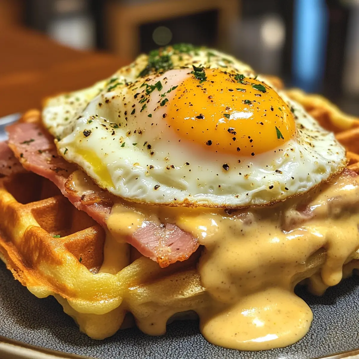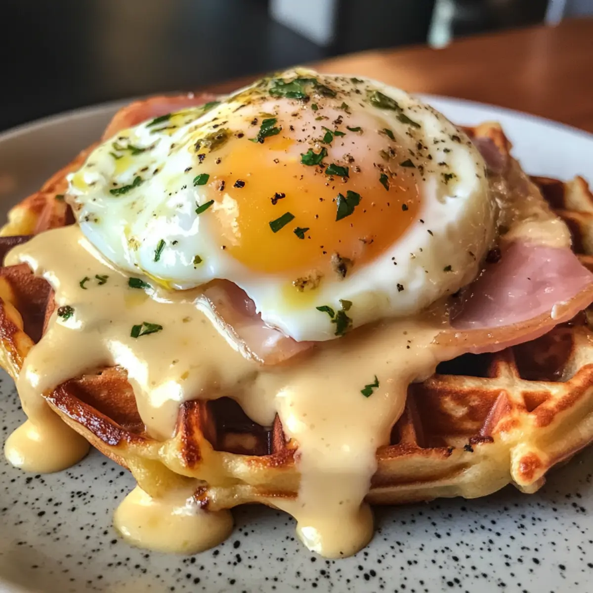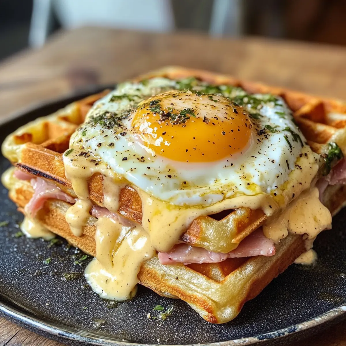 Jump to Recipe Print RecipeAs I stood over the waffle maker, the savory scent of melting cheese and ham danced through my kitchen, promising a delicious breakfast. My excitement peaked when I unveiled my latest culinary adventure: Croque Madame Waffles. This delightful twist on the classic French dish transforms familiar flavors into a crispy, comforting feast that’s perfect for brunch or a cozy dinner. With the convenience of quick prep and the allure of gourmet appeal, these savory waffles, topped with a creamy Dijon bechamel and a perfectly poached egg, are sure to impress family and friends alike. Are you ready to elevate your morning routine and indulge in this delightful creation? Why Are Croque Madame Waffles So Irresistible? Unique Twist: These waffles marry the classic flavors of a Croque Madame with the fun texture of waffles, creating a dish that’s both familiar and exciting. Savory Indulgence: Filled with rich ham and melted cheese, each bite is a comforting hug for your taste buds. Effortless Gourmet: Perfect for impressing guests at brunch or enjoying a cozy dinner, they bring a touch of sophistication without fuss. Crowd-Pleaser: Kids and adults alike will enjoy this delightful spin on comfort food—serve them with a side of mixed greens for a balanced meal. For even more brunch inspiration, check out my delicious Cider Pumpkin Waffles! Flexibility: Easily customize with different cheeses or fillings to match your family’s preferences, making them a versatile star in your recipe repertoire! Croque Madame Waffles Ingredients For the Waffles Butter – Adds richness and helps in making the waffles crispy; margarine can work as a substitute. All Purpose Flour – Provides structure for the waffles; gluten-free flour can be used for a gluten-free version. Whole Milk – Keeps the batter moist; almond milk is a great lactose-free option. Baking Powder – Ensures the waffles rise and become fluffy; no substitutes are recommended for leavening. Salt – Enhances overall flavor; adjust to your taste preferences. Eggs – Essential for structure and moisture; necessary for both the waffle batter and poached topping. Shaved Ham – Adds savory flavor and protein to the waffles; bacon can be an excellent substitute. Gruyere Cheese – Melts beautifully and enriches flavor; Swiss cheese or gouda can also be used. For the Bechamel Sauce Butter – Forms the base for the sauce and adds richness; you can use margarine if needed. Dijon Mustard – Introduces a tangy flavor to the bechamel; spicy brown mustard is a suitable alternative. Salt – Provides seasoning to the sauce; balance to taste. For Serving Chives – Optional garnish that adds a fresh touch to your dish. Eggs – Perfectly poached to crown the waffles for a delightful finish. These savory Croque Madame Waffles are not just a feast for the palate but also a canvas for creativity—mix up the fillings or play around with cheese to make them your own! Step‑by‑Step Instructions for Croque Madame Waffles Step 1: Make the Bechamel Sauce Start by melting 2 tablespoons of butter in a saucepan over medium heat, allowing it to foam. Whisk in 2 tablespoons of all-purpose flour and cook for 1-2 minutes until lightly golden. Gradually add 1 cup of whole milk, whisking constantly to avoid lumps, and continue cooking until thickened—about 3-5 minutes. Stir in 2 tablespoons of Dijon mustard, salt, and pepper to taste, then set aside to keep warm. Step 2: Prepare the Waffle Batter In a large mixing bowl, combine 1 cup of all-purpose flour, 2 teaspoons of baking powder, and a pinch of salt. Whisk together until well mixed. In another bowl, beat 2 eggs and mix in 1 cup of whole milk and 4 tablespoons of melted butter. Pour the wet ingredients into the dry ingredients, mixing gently until just combined—a few lumps are okay and will keep the Croque Madame Waffles fluffy. Step 3: Add Fillings Carefully fold in 1 cup of chopped shaved ham and 1 cup of grated Gruyere cheese to the waffle batter. Ensure the ingredients are evenly distributed without overmixing, which could make the waffles dense. This savory filling will enhance the flavors of your Croque Madame Waffles, creating a deliciously rich texture for every bite. Step 4: Cook the Waffles Heat your waffle maker on medium-high (around 375°F) and lightly grease it with cooking spray or brush some oil for easier release. Pour about ¾ cup of the waffle batter into the center of the preheated waffle iron, closing the lid gently. Cook until the waffles are golden brown and crisp, approximately 3-5 minutes, or until the indicator light on your waffle maker signals they’re ready. Step 5: Assemble the Dish Once the waffles are cooked, place them on a baking sheet. Top each waffle generously with the Dijon bechamel sauce, ensuring even coverage. Sprinkle additional shaved ham and Gruyere cheese on top, then broil them in the oven for 2-3 minutes until the cheese is melted and bubbly, perfecting your Croque Madame Waffles. Step 6: Finish with Poached Eggs While the waffles are under the broiler, prepare your poached eggs. Bring a pot of water to a gentle simmer and add a splash of vinegar. Crack each egg into a small bowl, then gently slide into the water, poaching for 4-5 minutes until the whites are set. Remove with a slotted spoon and let drain briefly before placing one on each assembled waffle for a stunning finish. What to Serve with Savory Croque Madame Waffles? Imagine a brunch table filled with mouthwatering delights, where each dish enhances the warm, savory experience of your Croque Madame Waffles. Mixed Greens Salad: A light, crisp salad adds freshness and balances the richness of the waffles. Toss with a simple vinaigrette for a delightful contrast. Crispy Bacon: The salty crunch of bacon complements the creamy bechamel and savory ham, bringing a satisfying texture to each bite. Roasted Asparagus: Tender, seasoned asparagus provides a pop of color and earthiness, cre