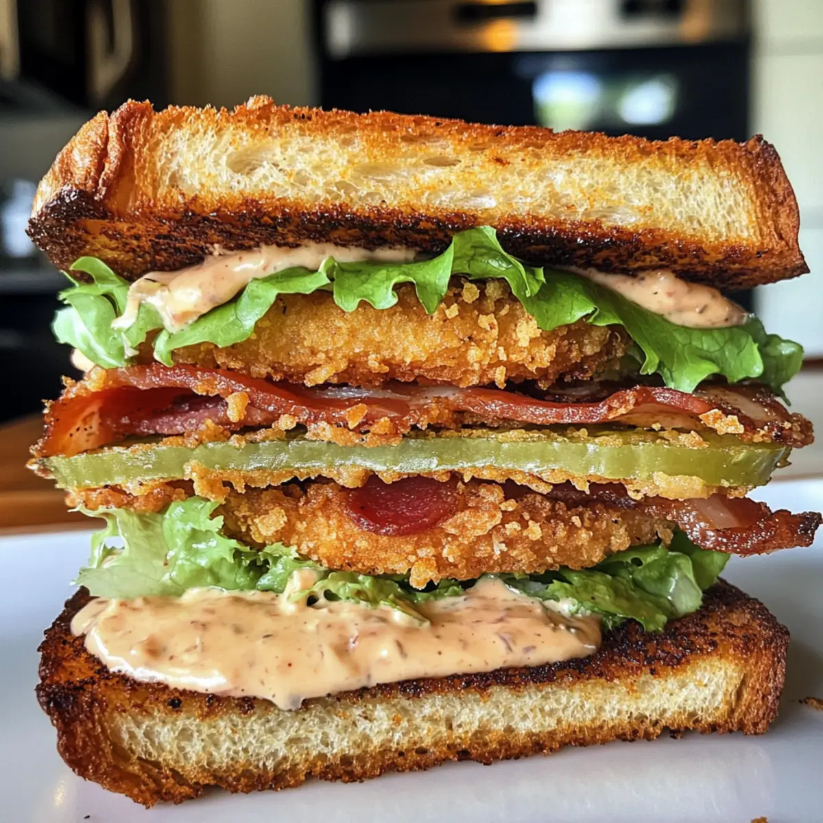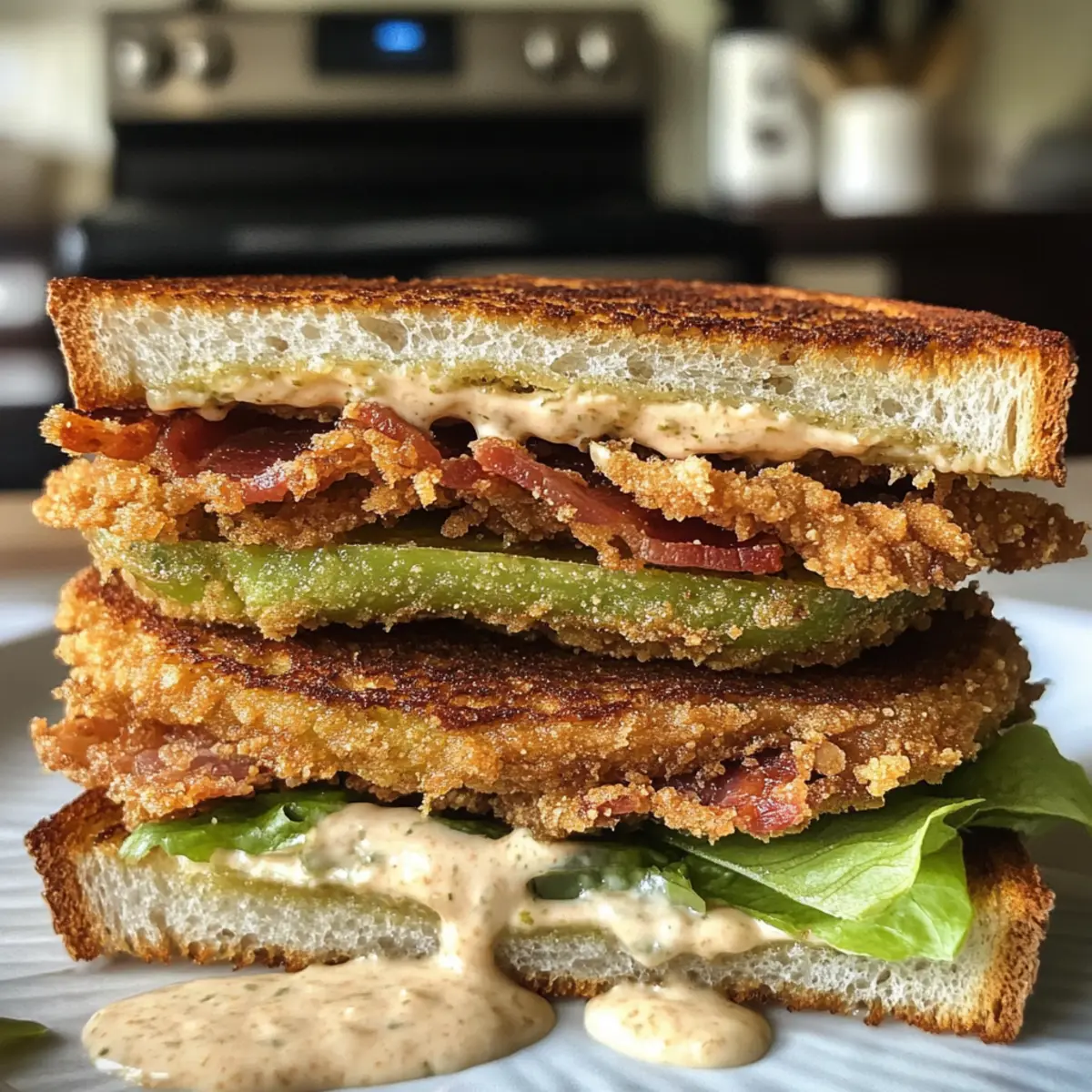 8. Step 8: Assemble Your Sandwich: Layer remoulade on toasted bread, followed by lettuce, fried tomatoes, and bacon.