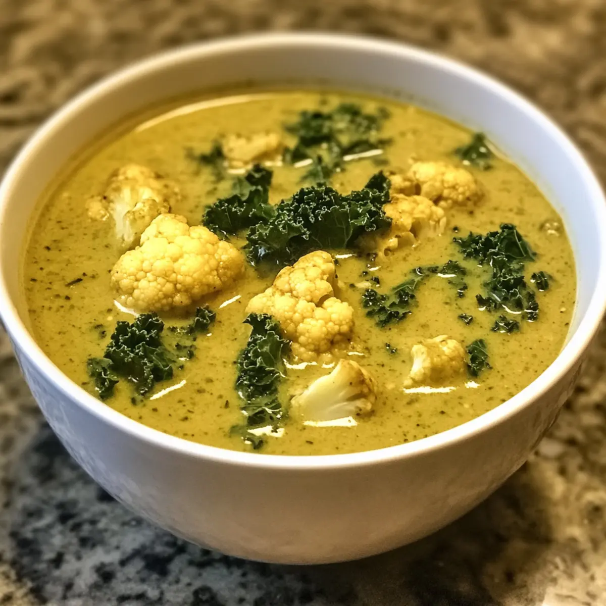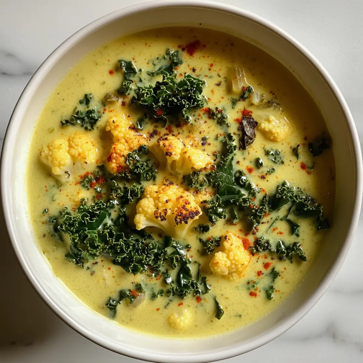Jump to Recipe Print RecipeAs I ladled a steaming bowl of curried cauliflower and kale soup, I was instantly enveloped in the warm, inviting aroma of spices that danced through my kitchen. This nourishing bowl is not just a soup; it’s a comforting hug on a chilly day, offering the delightful fusion of turmeric, ginger, and garlic in every bite. Perfect for those of us seeking healthier options, this paleo and vegan soup not only nourishes the body but is also quick to whip up during busy weeknights. Rich in vitamins and fiber, it’s a guaranteed crowd-pleaser that’s both incredibly filling and gut-friendly. Who said healthy eating couldn’t be delicious? Ready to discover how to make this heartwarming dish that will surely become a staple in your home? Let’s dive in! Why You’ll Love This Soup Recipe Nourishing Comfort: This curried cauliflower and kale soup is a warm hug in a bowl, making it the perfect remedy for chilly nights. Flavor Explosion: The delightful blend of turmeric, ginger, and garlic creates a robust flavor profile that excites your taste buds. Diet-Friendly: Whether you’re eating paleo, vegan, or gluten-free, this recipe caters to all, ensuring everyone can enjoy it. Quick Prep Time: With its easy instructions, you can have dinner on the table in no time—ideal for busy weeknights. Pair it with a slice of Cauliflower Gratin Gruyere for a complete meal! Crowd-Pleaser: Even the pickiest eaters will love this flavorful dish that promotes healthy eating without sacrificing taste. Plus, leftovers are just as good, making it a winning recipe to keep on repeat! Combine it with a side of Maple Brie Soup for an unforgettable dining experience. Curried Cauliflower and Kale Soup Ingredients For the Soup • Cauliflower – 1 head, chopped into florets: Provides a hearty base and texture. Can substitute with broccoli for a different flavor. • Kale – 1 bunch, stems removed and chopped: Adds nutrition and bitterness, which balances the soup’s creaminess. Spinach can be used as an alternative. • Carrots – 2 to 3, diced: Adds sweetness and color. Substituting with parsnips can introduce a different sweetness. • Yellow Onion – 1, diced: Builds flavor base with aromatic depth. Shallots can also work. • Fresh Ginger – 1 tbsp, minced: Adds warmth and brightness. Ground ginger can be used in a pinch. • Garlic – 2 cloves, minced: Offers savory richness. Garlic powder can replace, but fresh is preferred for flavor. • Curry Powder – 2 tbsp: Delivers the essential curry flavor. Experiment with different blends for variations. • Turmeric Powder – 1 tsp: Provides anti-inflammatory benefits and a golden hue. Fresh turmeric is an excellent substitution. • Cumin Powder – ½ tsp: For depth and warmth; coriander can be a substitute. • Paprika – ½ tsp: Adds mild sweetness and color. Smoked paprika can enhance flavor further. • Vegetable Stock – 2 to 3 cups: Forms the soup’s liquid base; homemade is recommended but store-bought works in a pinch. • Coconut Milk – 1 cup: Imparts creamy texture and flavor; can be replaced with cashew cream for a nutty alternative. • Coconut Oil – 4 tbsp: Used for sautéing; other oils like olive oil can also be effective. • Sea Salt & Freshly Ground Black Pepper – Essential for seasoning to taste. Adjust based on dietary preferences. Step‑by‑Step Instructions for Curried Cauliflower And Kale Soup Step 1: Sauté Aromatics Begin by melting 4 tablespoons of coconut oil in a large pot over medium heat. Once hot, add 1 diced yellow onion, 2 minced garlic cloves, and 1 tablespoon of minced fresh ginger. Sauté these aromatics for about 2-3 minutes, or until the onion becomes translucent and fragrant, creating a flavorful base for your curried cauliflower and kale soup. Step 2: Add Vegetables Introduce the chopped cauliflower florets and diced carrots to the pot. Stir the mixture well and sauté for another 4-5 minutes. You want the vegetables to soften slightly and develop a bit of color. This step is crucial for building the delicious flavor that makes this soup so comforting. Step 3: Spice it Up Now it’s time to bring in the spices! Sprinkle in 2 tablespoons of curry powder, 1 teaspoon of turmeric, ½ teaspoon of cumin, ½ teaspoon of paprika, and season with sea salt and freshly ground black pepper. Stir everything together for about 1 minute until the spices are well incorporated and aromatic, enhancing the flavors of the curried cauliflower and kale soup. Step 4: Simmer the Soup Pour in 2 to 3 cups of vegetable stock and add the chopped kale. Stir to combine all ingredients, then cover the pot and reduce the heat to low. Allow the soup to simmer for 15-20 minutes, or until the vegetables are tender and the kale has wilted. The bubbling broth will fill your kitchen with enticing aromas. Step 5: Blend for Creaminess After simmering, take your immersion blender and blend the soup to your desired consistency—smooth for a creamy texture or leave some chunks for added heartiness. If you don’t have an immersion blender, carefully transfer the soup to a regular blender in batches. The goal is to create a velvety mix that highlights the vibrant flavors from the spices. Step 6: Finish with Coconut Milk Stir in 1 cup of coconut milk to give the curried cauliflower and kale soup an extra layer of creaminess. Heat gently over low flame, ensuring not to bring it to a boil, and taste for seasoning adjustments. A dash of extra salt or pepper may be just what you need to elevate the flavors before serving. Step 7: Serve Warm Ladle the warm soup into bowls and enjoy immediately, perhaps garnished with a sprinkle of fresh herbs or a squeeze of lime for brightness. This comforting bowl of curried cauliflower and kale soup is not only nourishing but also perfect for sharing with family or friends, creating a heartwarming dining experience. Curried Cauliflower And Kale Soup Variations Feel free to get creative with you