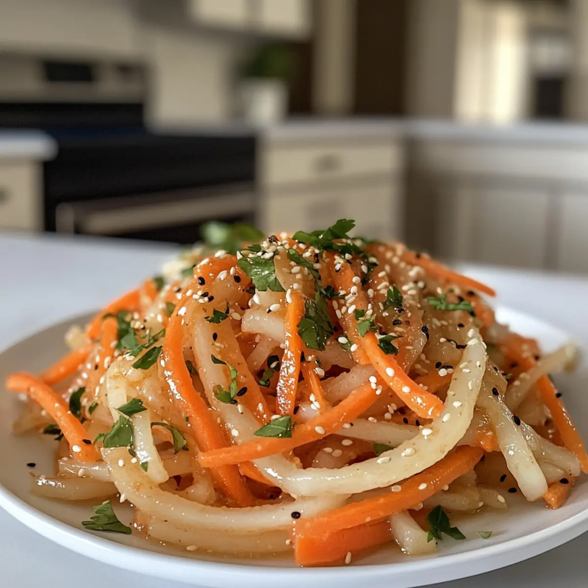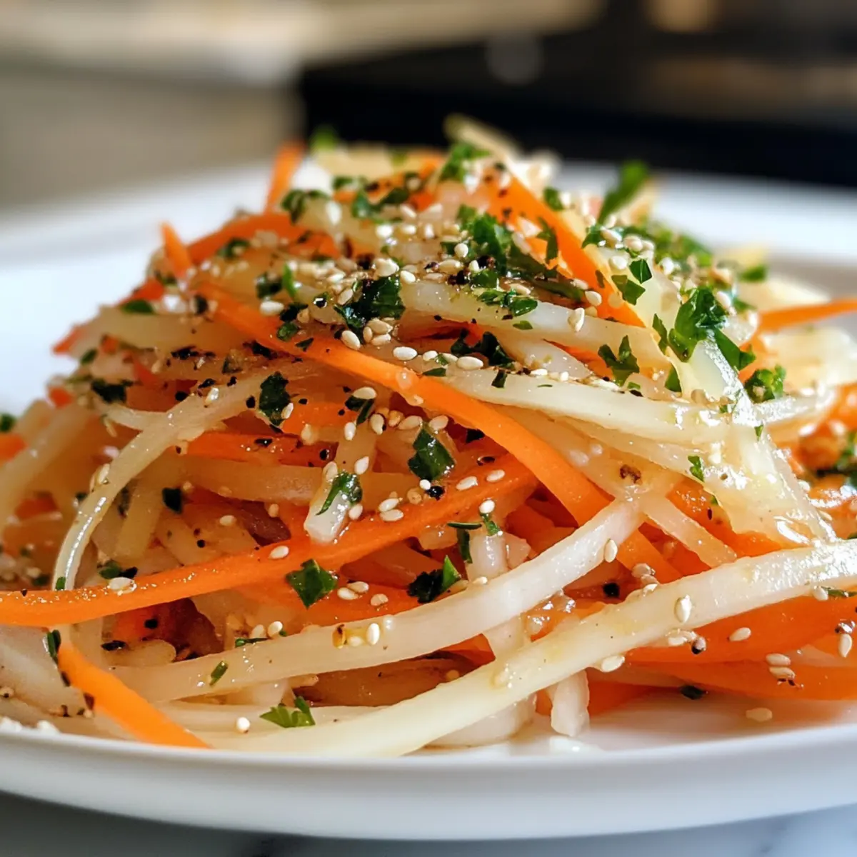 Jump to Recipe Print RecipeAs I tossed together a bright medley of colors in my kitchen, the crunch of fresh vegetables filled the air, and I knew I had stumbled upon something special. This Crunchy Daikon Carrot Salad with Sesame Ginger Dressing is a vibrant, vegan delight that’s just as satisfying to make as it is to eat. With its quick preparation of only 10 minutes, it makes a fantastic side dish for any meal or a light lunch all on its own. What’s even more exciting? You can easily swap in zucchini for daikon if that’s what you have on hand! It’s healthy, gluten-free, and packed with flavors that dance on your palate. So, are you ready to bring this refreshing salad into your culinary repertoire? Let’s dive in! Why is this salad a must-try? Vibrant Colors: The daikon and carrots create a stunning visual feast that will impress your dinner guests. Health Boost: With only 70 calories per serving, this low-carb and gluten-free salad is a guilt-free addition to your meals. Quick Prep: In just 10 minutes, you can whip up this healthy delight, saving time on busy days. Versatile Base: Substitute zucchini for daikon or toss in sliced cucumbers and nuts for an extra crunch—tailor it to your taste! Protein Pairing: Perfect alongside grilled chicken or fish, this salad complements a variety of dishes and enhances your dining experience, making it a go-to for meal prep. Add a pop of color to your plate with this delicious salad! Daikon Carrot Salad Ingredients For the Salad • Carrots – Add natural sweetness and crunch; use medium-sized, fresh carrots for the best texture. • Daikon Radish – Provides a mild flavor and satisfying crunch; if unavailable, zucchini or yellow squash can be substituted. For the Dressing • Toasted Sesame Oil – Adds rich, nutty flavor essential for the dressing; don’t skip it! • Rice Vinegar – Imparts mild acidity for balance; can substitute with freshly squeezed lime juice or apple cider vinegar (use less). • Garlic – Enhances the salad’s flavor; use grated or minced for the best results. • Ginger – Offers a fresh, spicy kick; freshly grated is preferred for maximum taste. • Salt & Pepper – Season to taste for overall flavor enhancement. For Garnish • Sesame Seeds – Provide crunch and visual appeal; toasted seeds add depth of flavor and texture in this lovely Daikon Carrot Salad. Step‑by‑Step Instructions for Daikon Carrot Salad with Sesame Ginger Dressing Step 1: Prep the Veggies Begin by thoroughly washing and peeling the fresh carrots and daikon radish. Using a vegetable peeler, shave them into thin ribbons, ensuring an even, delicate texture. Aim for about 4–5 cups combined to fill a large mixing bowl. This colorful medley should look vibrant and inviting, ready to bring a fresh crunch to your Daikon Carrot Salad. Step 2: Make the Dressing In a small mixing bowl, combine 1/4 cup of toasted sesame oil, 2 tablespoons of rice vinegar, and 1 clove of finely grated garlic, along with 1 tablespoon of freshly grated ginger. Whisk until the mixture is well blended, and then season to taste with salt and pepper. The dressing should have a fragrant, slightly nutty aroma, which will beautifully enhance the vegetables in your salad. Step 3: Combine Salad Pour the prepared sesame ginger dressing over the bowl of shaved daikon and carrot ribbons. Use a pair of tongs to gently toss the vegetables together until they are evenly coated with the dressing. This step should take just a minute or two; you want to see a beautiful glaze covering each piece without bruising the veggies, creating an enticing texture in your Daikon Carrot Salad. Step 4: Serve or Store Serve your delicious Daikon Carrot Salad immediately for the best flavor and freshness. If you prefer, you can refrigerate it in an airtight container for up to 24 hours. Just before serving, sprinkle with toasted sesame seeds to add a delightful crunch and visual appeal. The salad can be enjoyed as a bright side dish or a crisp light lunch option—perfect any time! How to Store and Freeze Daikon Carrot Salad Fridge: Refrigerate your Daikon Carrot Salad in an airtight container for up to 24 hours. Enjoy it fresh for the best crunch, adding sesame seeds just before serving. Freezer: It’s not recommended to freeze this salad, as the freshness and crunch of the vegetables will be lost when thawed. Reheating: If you’ve stored it, simply serve cold. This salad is best enjoyed chilled, straight from the fridge! Prep Tips: To maintain texture, avoid adding the dressing until ready to serve. Keep the components separate for optimal freshness. Expert Tips for Daikon Carrot Salad Fresh Ingredients: Always choose fresh, vibrant carrots and daikon for the best flavor and crunch in your salad. Quality vegetables make a huge difference! Cutting Technique: Use a mandoline or julienne peeler for even slicing; this ensures all veggies have the same texture, enhancing your overall experience of the Daikon Carrot Salad. Dress Wisely: Make the dressing in advance to let the flavors meld. Just remember to add the sesame seeds right before serving for optimal freshness! Balancing Flavors: Taste before serving; if the salad seems a bit flat, a squeeze of fresh lime juice or an extra dash of salt can elevate it beautifully. Customize Crunch: Consider adding chopped nuts or seeds for added nutrition and texture; toasted almonds or cashews provide a delightful crunch to your salad. Daikon Carrot Salad Variations & Substitutions Feel free to get creative with your Daikon Carrot Salad, transforming it to fit your tastes and needs! Zucchini Swap: Substitute sliced zucchini for daikon radish for a milder flavor and slightly different texture. This twist keeps things fresh and light! Nutty Addition: Toss in some toasted almonds or cashews for a satisfying crunch and a boost of protein. The nutty flavor beautifully complements the salad’s dressing! Heat Factor: Add sliced jalapeños or a sprinkle o