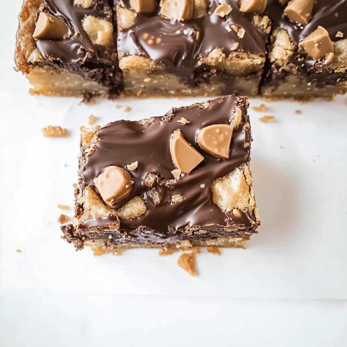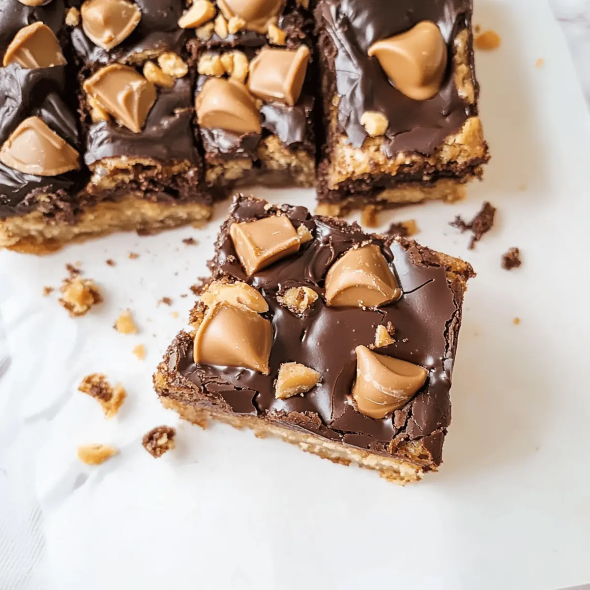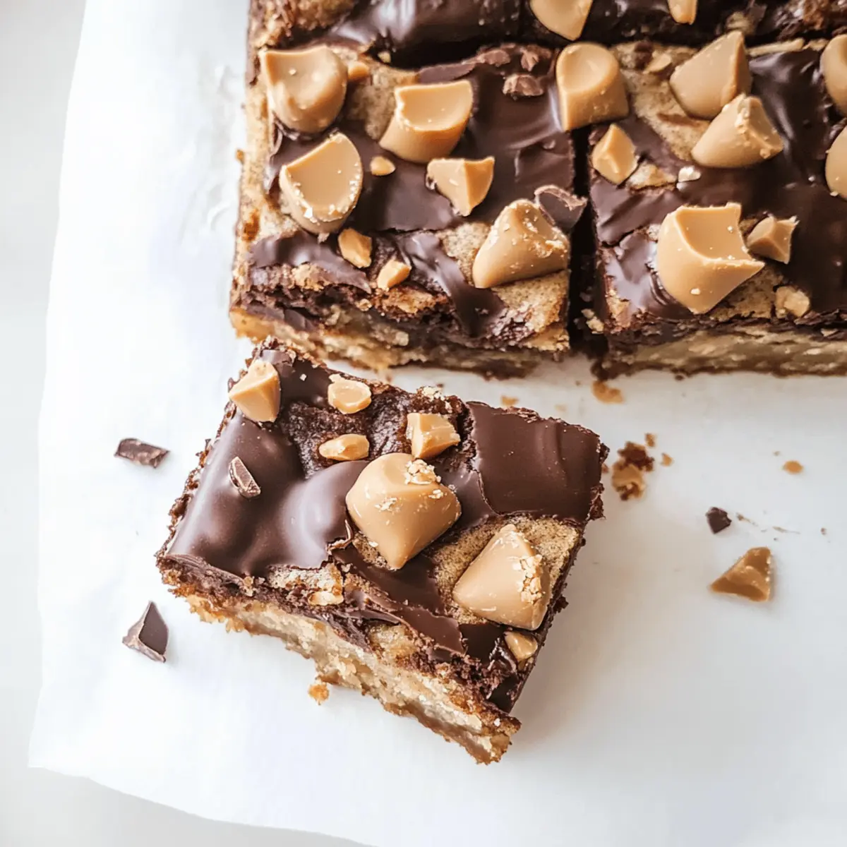 Jump to Recipe Print RecipeAs I stood in my kitchen, the sweet aroma of melted peanut butter and rich chocolate filled the air, creating a warm embrace that made my heart sing. Today, I’m excited to share my recipe for Die For Peanut Butter Chocolate Blondies, a delightful treat that combines the creamy allure of peanut butter with the indulgent charm of chocolate. With just a single bowl and minimal prep time, you can whip up these chewy bars for any occasion, and they’re bound to be a hit with family and friends! Not only are they quick to make—they’re also perfect for satisfying those late-night cravings. So, why not treat yourself and your loved ones to a flavorful adventure that’s easy and oh-so-delicious? Are you ready to indulge in this sweet bliss? Why You’ll Crave These Blondies? Irresistible Flavor: The sweet combination of creamy peanut butter and rich chocolate creates a taste that’s simply divine. One-Bowl Wonder: Quick and straightforward, this recipe minimizes mess and maximizes fun—perfect for busy chefs at home. Ultimate Comfort Food: Each bite is chewy and decadent, offering the kind of warmth that reminds you of your favorite childhood treats. Versatile Delight: Feel free to make them your own! Add chopped nuts or swap in your favorite chocolate. Easy Storage: Enjoy them fresh or stash leftovers in an airtight container for up to a week—if they last that long! Whether you enjoy them warm with a scoop of ice cream or as a simple snack, these Peanut Butter Chocolate Blondies promise to be a crowd favorite at any gathering. Die For Peanut Butter Chocolate Blondies For the Blondie Batter Unsalted Butter – Adds moisture and richness; margarine can be a good substitute if needed. Light Brown Sugar – Provides moisture and sweetness; coconut sugar offers a non-refined swap. Granulated Sugar – Sweetens and enhances texture; try stevia for a lower-calorie option. Creamy Peanut Butter – Delivers that strong peanut flavor; crunchy peanut butter gives extra texture. Large Egg – Binds everything together; a flax egg works great for a vegan variation. Egg Yolk – Enhances chewiness and moisture; omit for a vegan adaptation if desired. Vanilla Extract – Adds warmth and depth; almond extract can give a fun twist instead. All-Purpose Flour – Provides structure; consider a gluten-free flour blend if needed. Baking Powder – Helps the blondies rise perfectly; skip it for a non-leavened version. Salt – Balances out the sweetness; can be omitted for low-sodium diets. For the Ganache Topping Dark Chocolate Wafers – Forms the rich ganache topping; semi-sweet chocolate is a very tasty alternative. Heavy Cream – Creates a smooth ganache; coconut cream is a fabulous non-dairy substitute. For the Final Touch Melted Peanut Butter – Perfect for drizzling on top; feel free to use any nut butter or chocolate. Chopped Peanut Butter Cups – Adds that extra layer of peanut butter chocolate delight; chocolate bars can be used instead if preferred. Every bite of these Die For Peanut Butter Chocolate Blondies is loaded with flavor, making them an irresistible treat for any gathering or cozy night in! Step‑by‑Step Instructions for Die For Peanut Butter Chocolate Blondies Step 1: Preheat and Prepare Begin by preheating your oven to 350°F (175°C). Line an 8×8-inch baking pan with parchment paper, ensuring you grease it with cooking spray to prevent sticking. This initial setup is essential for achieving perfectly baked Die For Peanut Butter Chocolate Blondies that won’t cling to the pan. Step 2: Mix the Sugars and Butter In a large mixing bowl, whisk together the melted unsalted butter, light brown sugar, and granulated sugar until the mixture is smooth and well combined. This should take about 1-2 minutes. The consistency should be glossy and slightly thick, forming the sweet foundation for your blondies. Step 3: Incorporate the Peanut Butter After achieving a smooth sugar and butter mixture, whisk in the creamy peanut butter. Continue whisking for about 30-45 seconds until the peanut butter is fully integrated and the mixture is creamy. This will enhance the rich, nutty flavor that makes these blondies so delicious. Step 4: Add Eggs and Vanilla Next, crack in the large egg and the egg yolk, then add the vanilla extract. Whisk until everything is thoroughly combined, and the mixture appears light and fluffy. This step binds the ingredients, promoting a tender texture in your Die For Peanut Butter Chocolate Blondies. Step 5: Combine Dry Ingredients Switch your tool to a rubber spatula and gently fold in the all-purpose flour, baking powder, and salt until just combined. Be careful not to overmix; a few flour streaks are perfectly okay! The batter should be thick and will hold together nicely as you prepare to bake. Step 6: Bake the Blondies Transfer the blondie batter into your prepared pan, pressing it evenly into the corners. Place it in the preheated oven and bake for 22-25 minutes, or until the top is golden and a toothpick inserted in the center comes out with a few moist crumbs. The blondies should feel slightly springy to the touch when done. Step 7: Prepare the Ganache While the blondies are baking, heat the heavy cream in a microwave-safe bowl until it bubbles, about 1-2 minutes. Once heated, pour the hot cream over the dark chocolate wafers in a separate bowl. Allow it to sit for 5 minutes, then stir until smooth and glossy, creating a luscious ganache for your blondies. Step 8: Assemble and Cool After the blondies have cooled for about 20 minutes in the pan, pour the ganache over the top, spreading it evenly with a spatula. Drizzle melted peanut butter on top and sprinkle with chopped peanut butter cups for an extra indulgent touch. Allow the blondies to set for a few minutes before slicing into squares. Each step is designed to bring you closer to the chewy, rich goodness of Die For Peanut Butter Chocolate Blondies, perfect for satisfying those c