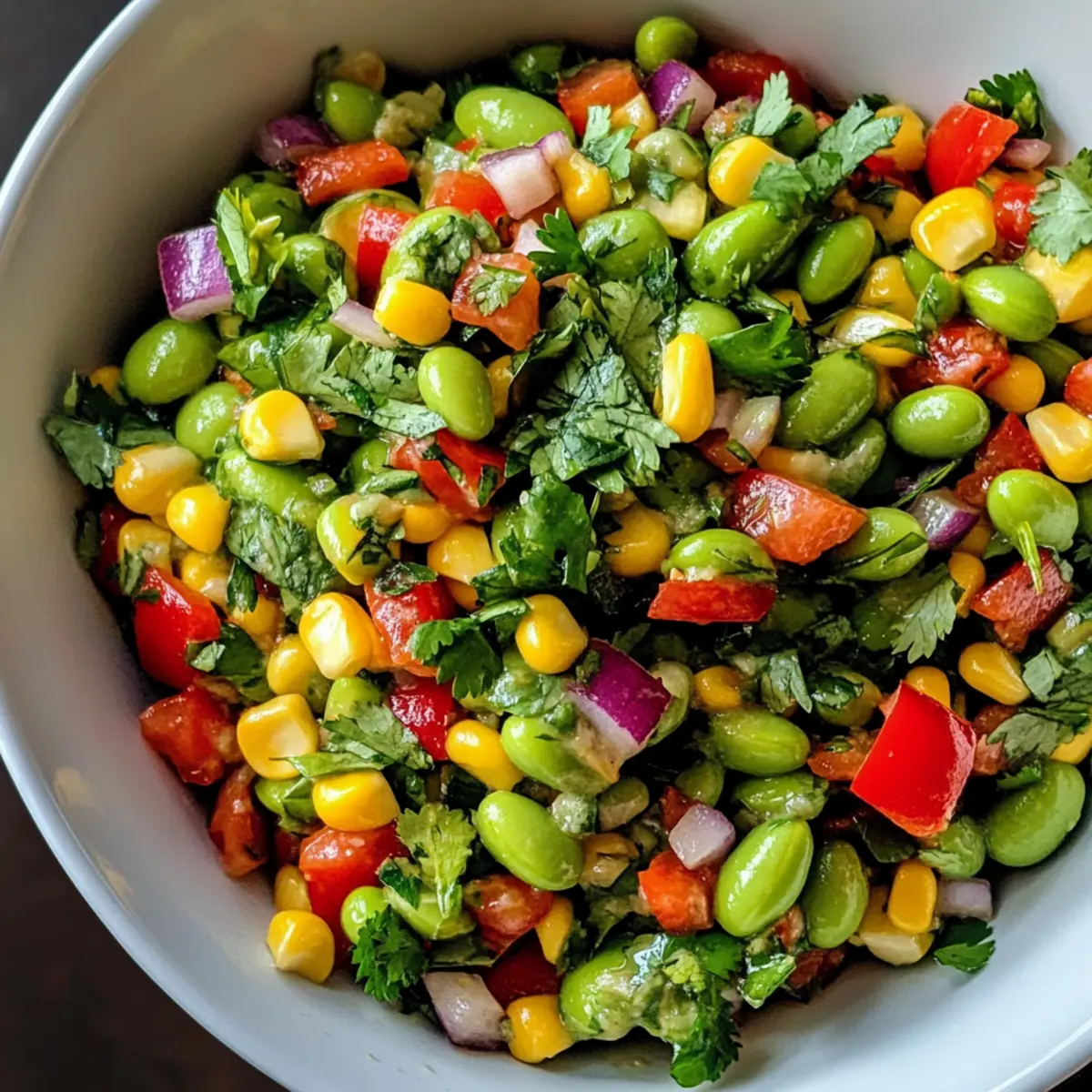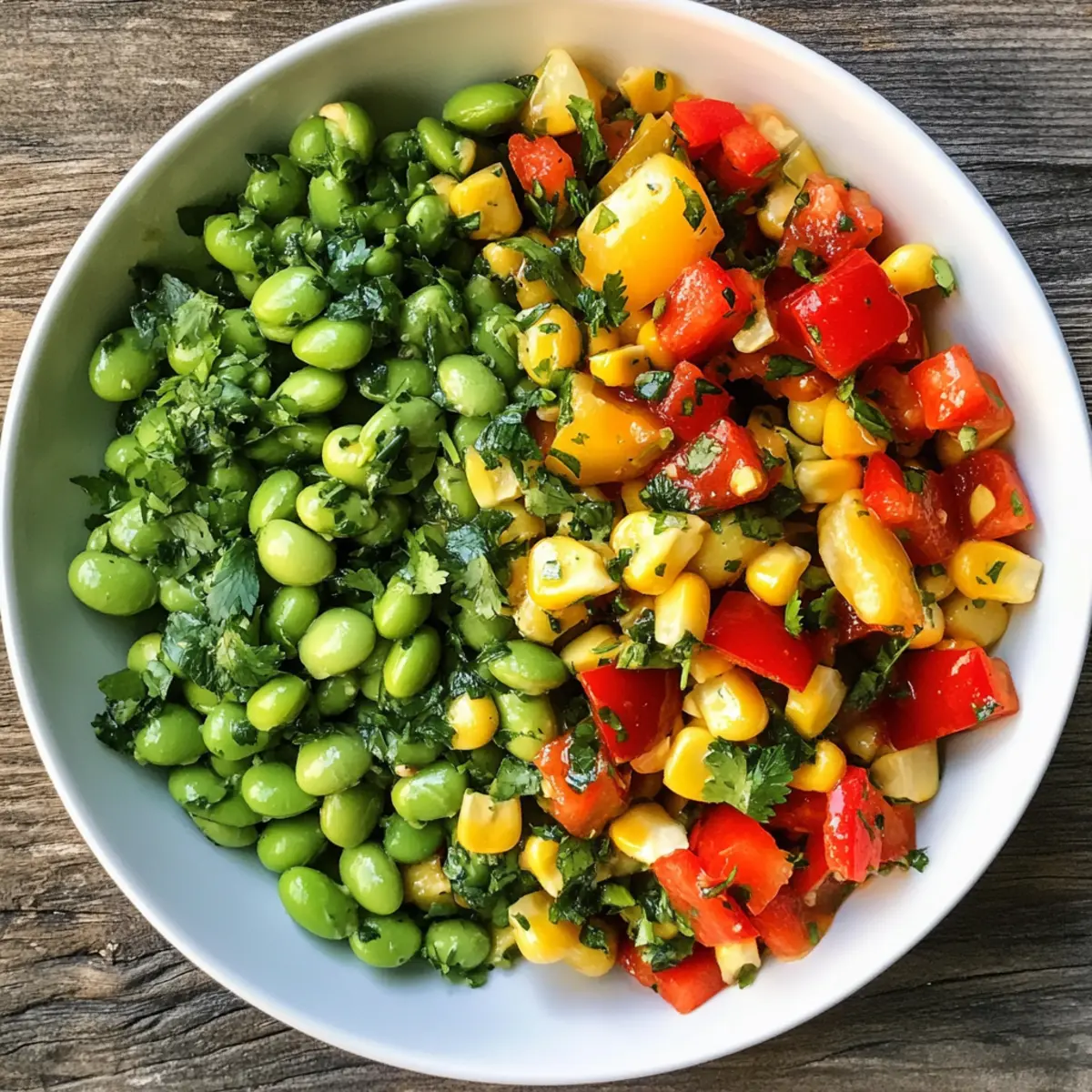 Vibrant Colors: This Edamame Salad is a feast for the eyes, showcasing a rainbow of fresh ingredients that beckon you to dig in.