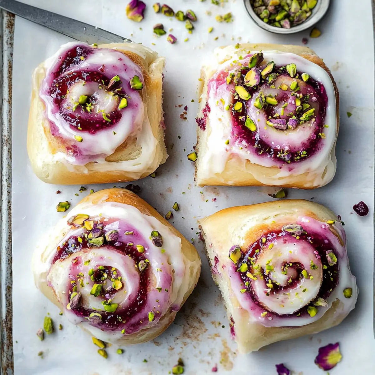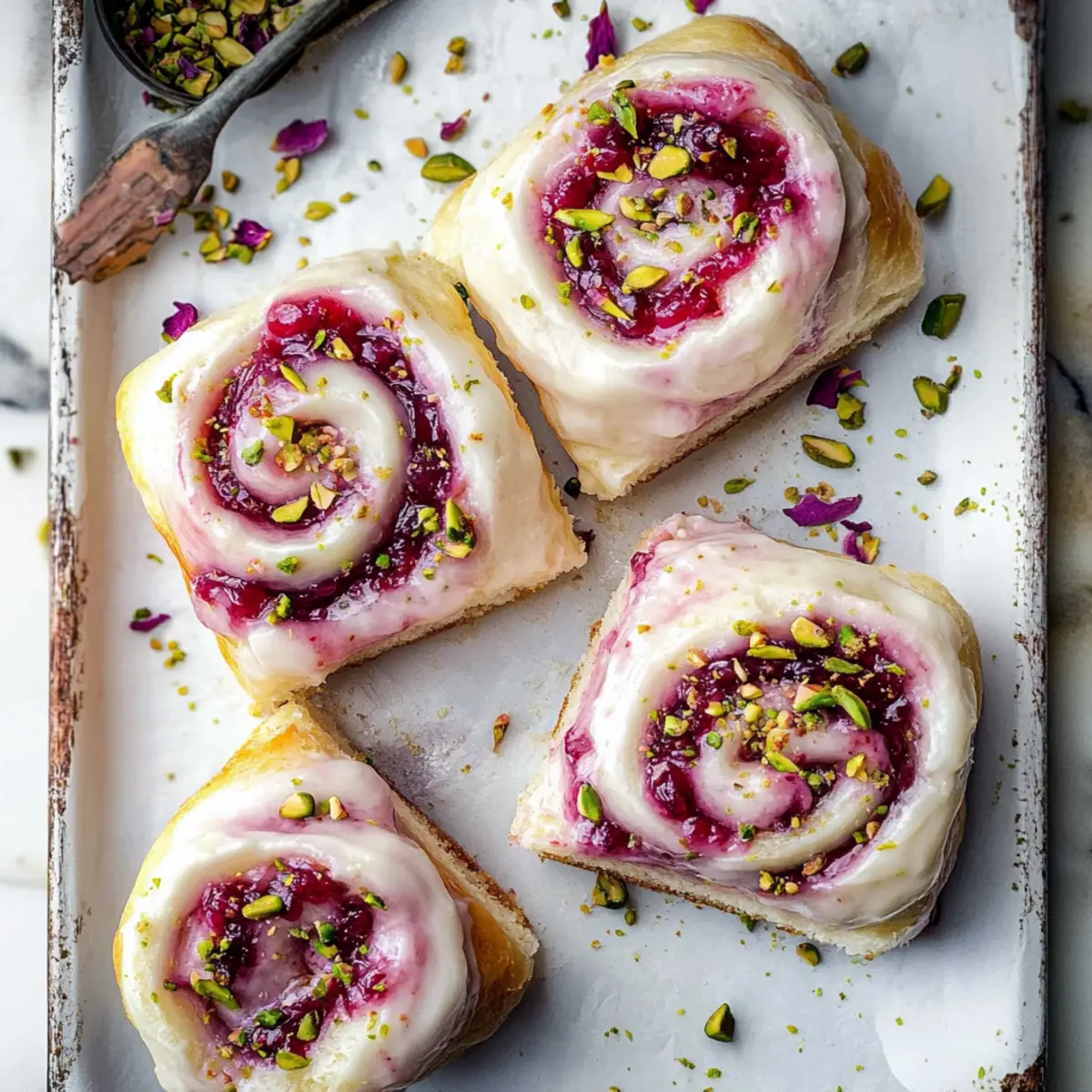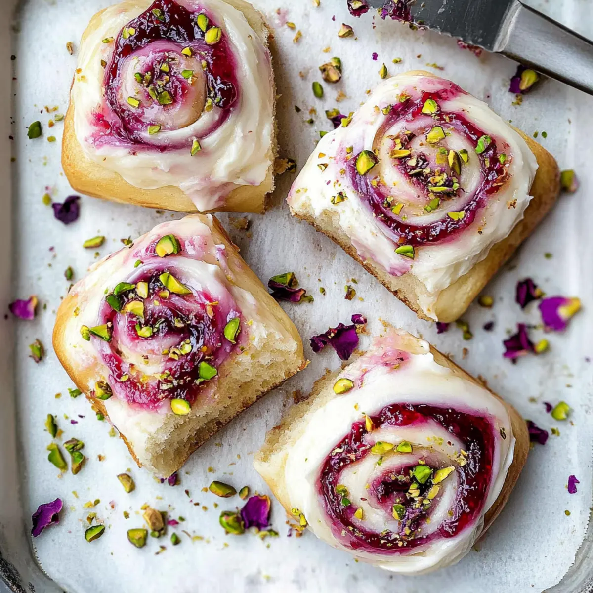 Jump to Recipe Print RecipeAs I stood in my cozy kitchen, the gentle fragrance of rosewater wafted through the air, transporting me to a quaint Parisian café. Today, I’m thrilled to share my recipe for Edd Kimber’s Raspberry and Rose Cheesecake Buns—an indulgent delight that perfectly merges the lush creaminess of cheesecake with the vibrant tartness of raspberry. These soft, fluffy buns make an impressive centerpiece for any gathering or a sweet afternoon escape from the hustle and bustle. Not only are they a feast for the eyes, but their delicate flavors also create an elegant experience that truly feels special. Whether enjoyed fresh from the oven or savored later, these buns are sure to impress your friends, family, and your taste buds! Are you ready to bring a touch of glamour into your baking routine? Why Try Edd Kimber’s Buns? Unique Flavor Fusion: These Raspberry and Rose Cheesecake Buns are not your average dessert; they marry rich cheesecake with the fragrant notes of rose and the tart burst of raspberry for a truly gourmet experience. Visual Appeal: With their soft, pillowy texture and elegant rose petal garnish, these buns are as stunning to look at as they are delicious. Baker-Friendly: The straightforward recipe allows bakers of any level to create magic in the kitchen, making it perfect for both casual afternoons and impressive gatherings. Versatile Treat: Serve them warm with a cup of tea or coffee, or pair with a side of custard for an indulgent dessert. If you enjoy exploring delightful flavors, consider also trying Strawberry Cheesecake Dump or Hawaiian Cheesecake Danish for your next baking adventure! Make-Ahead Option: These buns can be made in advance and stored for up to 3 days, making them ideal for planned gatherings or surprise guests. Heartwarming & Delicious: Every bite will evoke a sense of comfort and joy, transforming any occasion into a cherished memory. Edd Kimber’s Raspberry and Rose Cheesecake Buns Ingredients For the Dough • Strong White Bread Flour – Provides structure and texture; all-purpose flour can be used for a softer bun. • Caster Sugar – Adds necessary sweetness to the dough; granulated sugar works as a substitute. • Fine Sea Salt – Enhances flavor, so don’t skip this ingredient for the best taste. • Fast-Action Dried Yeast – Acts as a leavening agent; fresh yeast is also an option with minor adjustments. • Whole Milk – Adds moisture and richness; feel free to substitute with almond or oat milk for a dairy-free option. • Large Eggs – Binds the mixture and adds richness; use equivalent egg substitutes for an egg-free variation. • Unsalted Butter – Contributes richness and a tender crumb; margarine can replace it for a dairy-free version. For the Filling • Full-Fat Cream Cheese – Serves as the creamy base for the filling; consider low-fat alternatives, but it may affect the texture. • Raspberry Jam – Provides a vibrant fruity filling; other fruit jams or preserves can work in its place. • Lemon Juice – Adds brightness to the glaze; vinegar can be a quick substitute if needed. • Vanilla Bean Paste – Enhances flavor depth; for convenience, you can use vanilla extract. For the Glaze • Icing Sugar – Creates a sweet glaze consistency; you can powder granulated sugar at home as an alternative. • Rose Water – Infuses a floral note into the buns; omit if you don’t have it, though it may lose some fragrance. For Decoration • Edible Dried Rose Petals – Adds elegance and flavor; you can substitute with more pistachios or leave them out entirely. • Chopped Shelled Pistachios – Introduces a delightful crunch; feel free to use any nuts or seeds you prefer. Embrace the flavors of Edd Kimber’s Raspberry and Rose Cheesecake Buns—you won’t regret it! Step‑by‑Step Instructions for Edd Kimber’s Raspberry and Rose Cheesecake Buns Step 1: Prepare Dough In a stand mixer, combine strong white bread flour, caster sugar, fine sea salt, and fast-action dried yeast using the paddle attachment. Gradually add whole milk and large eggs, mixing until a dough forms. Switch to the dough hook and knead for about 10-15 minutes until smooth and elastic. Incorporate unsalted butter gradually while kneading, ensuring a soft and cohesive dough. Step 2: Chill Dough Transfer the kneaded dough into a greased bowl, covering it with a clean kitchen towel or plastic wrap. Refrigerate for at least 8 hours or overnight to allow the dough to develop flavor and chill, making it easier to roll out later. The dough should expand slightly during this time, creating a sturdy yet soft texture for the buns. Step 3: Roll Out and Fill Once chilled, turn the dough onto a lightly floured surface and roll it out into a large rectangle, approximately ¼ inch thick. Spread a generous layer of full-fat cream cheese evenly across the dough, followed by a layer of raspberry jam for an explosion of flavor. Starting from one end, roll the dough tightly into a log, sealing the edges as you go, then slice the log into 12 equal pieces. Step 4: Proof Buns Place the cut buns cut-side up into a greased baking tin, ensuring they are spaced apart. Cover the tin lightly with a towel and let the buns rise in a warm area for 45 minutes to 1 hour, until they look puffy and have doubled in size. This step is crucial for achieving that soft and fluffy texture in Edd Kimber’s Raspberry and Rose Cheesecake Buns. Step 5: Bake Preheat your oven to 190°C (375°F) while the buns are proofing. Once fully risen, place the baking tin into the preheated oven and bake for 30-35 minutes. Look for a golden-brown color and a hollow sound when tapped; this indicates that the buns are perfectly baked. Remove them from the oven and allow them to cool slightly in the tin. Step 6: Glaze and Decorate In a small saucepan, melt icing sugar with lemon juice and rose water over low heat, stirring until smooth to create a lovely glaze. Brush the warm glaze over 