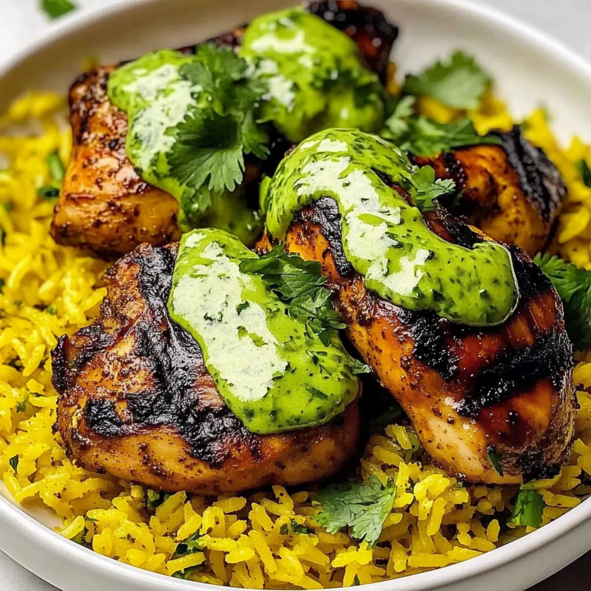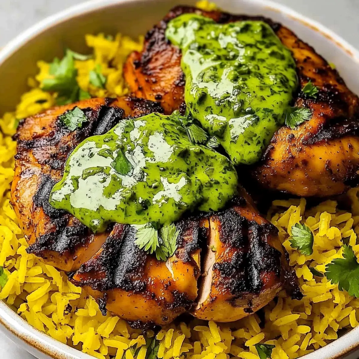 6. Serve: Plate rice, top with chicken, drizzle with green sauce, garnish with cilantro or red onion.