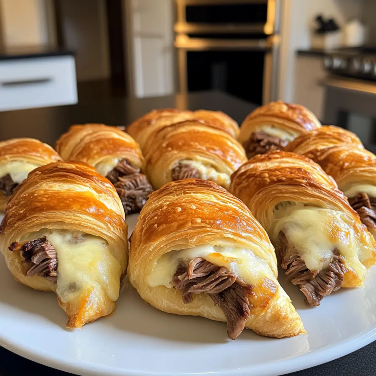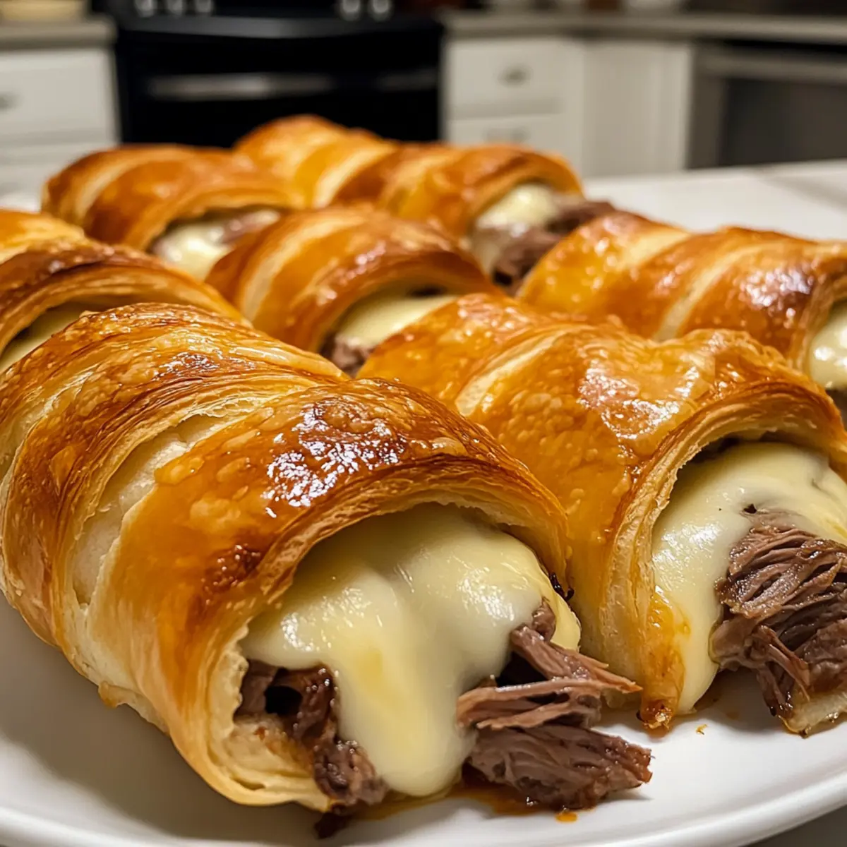 Jump to Recipe Print RecipeThe aroma of flaky pastry baking in the oven always evokes warm memories of family gatherings, and today, I’m bringing a little twist to those cherished moments with my Quick & Easy 4-Ingredient French Dip Crescents. These handheld delights wrap tender roast beef and gooey provolone cheese in a golden crescent shell—perfect for busy weeknights when you crave something satisfying yet simple. What I love most about this recipe is not just its kid-friendly appeal, but also that it’s ready in just 23 minutes! Whether you’re serving them up as party appetizers or a fun snack, these crescents are bound to win over hearts (and stomachs). Curious about how easy they are to whip up? Let’s dive in and get cooking! Why Are French Dip Crescents So Irresistible? Deliciously Quick: These crescents come together in just 23 minutes, making them a lifesaver for busy families. Kid-Friendly Fun: With their flaky crust and cheesy filling, they’re sure to delight kids and adults alike, perfect for weeknight dinners or after-school snacks. Versatile Ingredients: Feel free to swap the roast beef for turkey or add veggies like caramelized onions for a unique twist! Finger Food Perfection: Easy to hold and eat, these crescents are fantastic for parties or game days, standing out right next to classic snacks like a Savory French Onion dip! Gourmet Appeal: The blend of tender beef, melted cheese, and rich au jus offers a taste experience reminiscent of a dining out treat, all from your kitchen. Satisfying Comfort: They deliver not just flavor but also the comforting nostalgia of a traditional French dip sandwich, perfect for gathering around the table. French Dip Crescents Ingredients • Perfect for a quick meal! For the Crescents • Refrigerated Crescent Roll Dough – Provides that flaky, buttery base to hold all the goodness. Tip: Can substitute with gluten-free dough for a suitable option. • Deli Roast Beef – Adds rich, savory flavor along with protein. Substitute with turkey or chicken for a lighter twist. • Provolone Cheese – Brings a creamy texture and sharp taste that melds beautifully. Note: You can use mozzarella or Swiss cheese for a milder flavor. For Dipping • Au Jus Gravy Mix – Essential for that authentic French dip experience. Tip: Craft homemade au jus with beef broth and seasonings for an even more personalized touch! Step‑by‑Step Instructions for French Dip Crescents Step 1: Preheat Your Oven Begin by preheating your oven to 375°F (190°C). This ensures that your French Dip Crescents bake evenly and turn golden brown. While the oven is heating, gather your ingredients, and prepare a large ungreased cookie sheet, as you’ll need it ready for the crescent rolls. Step 2: Unroll the Dough Carefully unroll the refrigerated crescent roll dough onto your prepared cookie sheet, ensuring the triangles are laid out in a single layer. Keep an eye on the seams to avoid any tearing, as each piece will soon wrap around savory fillings. Feel free to smooth any jagged edges to create a neat rectangle for filling. Step 3: Add the Filling Place a slice of deli roast beef and a piece of provolone cheese on the wide end of each crescent triangle. Make sure to leave a little space at the edges to avoid spills while rolling. The savory aroma of the roast beef complemented by the melting cheese creates an enticing start to your French Dip Crescents. Step 4: Roll the Crescents Now, roll each crescent from the wide end to the narrow end, tucking in the filling just snugly. As you roll, ensure that the seams are well secured to prevent any cheese or beef from leaking out during baking. This will give you beautiful crescents that maintain their shape and flavor throughout the cooking process. Step 5: Bake to Perfection Transfer the assembled crescents to the preheated oven and bake them for 13 to 15 minutes. Watch closely as they bake; once they have risen and turned a delightful golden brown, they are ready to be removed from the oven. The enticing scent will surely fill your kitchen with warmth and comfort as they cook! Step 6: Prepare the Au Jus While the crescents are baking, prepare the Au Jus gravy according to the package instructions. Heat it gently on the stove or in the microwave until hot. This rich and flavorful dip is an essential companion for your French Dip Crescents, enhancing each bite with delicious, savory depth. Step 7: Serve Warm Once baked and golden, allow your French Dip Crescents to cool for a minute before serving. Plate them alongside the warm Au Jus for dipping, and get ready to delight your family with this handheld treat. The combination of flaky pastry with gooey cheese and savory beef will surely be a hit! French Dip Crescents Variations & Substitutions Feel free to explore these tasty twists and tailor this recipe to fit your family’s preferences! Gluten-Free: Use gluten-free crescent roll dough for a delicious alternative that everyone can enjoy. For those with dietary restrictions, gluten-free dough can provide the same flaky goodness without compromising flavor. Turkey Swap: Replace roast beef with sliced turkey for a lighter version packed with flavor. Turkey brings a lean protein option to the table, perfect for those seeking a healthier meal choice while still satisfying the taste buds. Different Cheeses: Try mozzarella or Swiss cheese for a creamier, milder flavor. While provolone shines bright, experimenting with other cheeses can provide a unique taste experience, enhancing the overall dish. Veggie Delight: Add sautéed mushrooms or caramelized onions to elevate the flavor profile. These additions not only boost taste but also add exciting textures that can transform a simple dish into something gourmet! Spicy Kick: Incorporate pepper jack cheese or jalapeños for an extra dash of heat. If you’re in the mood for spice, these ingredients will give your crescents a delightful zing that will please fiery food lovers. Hom