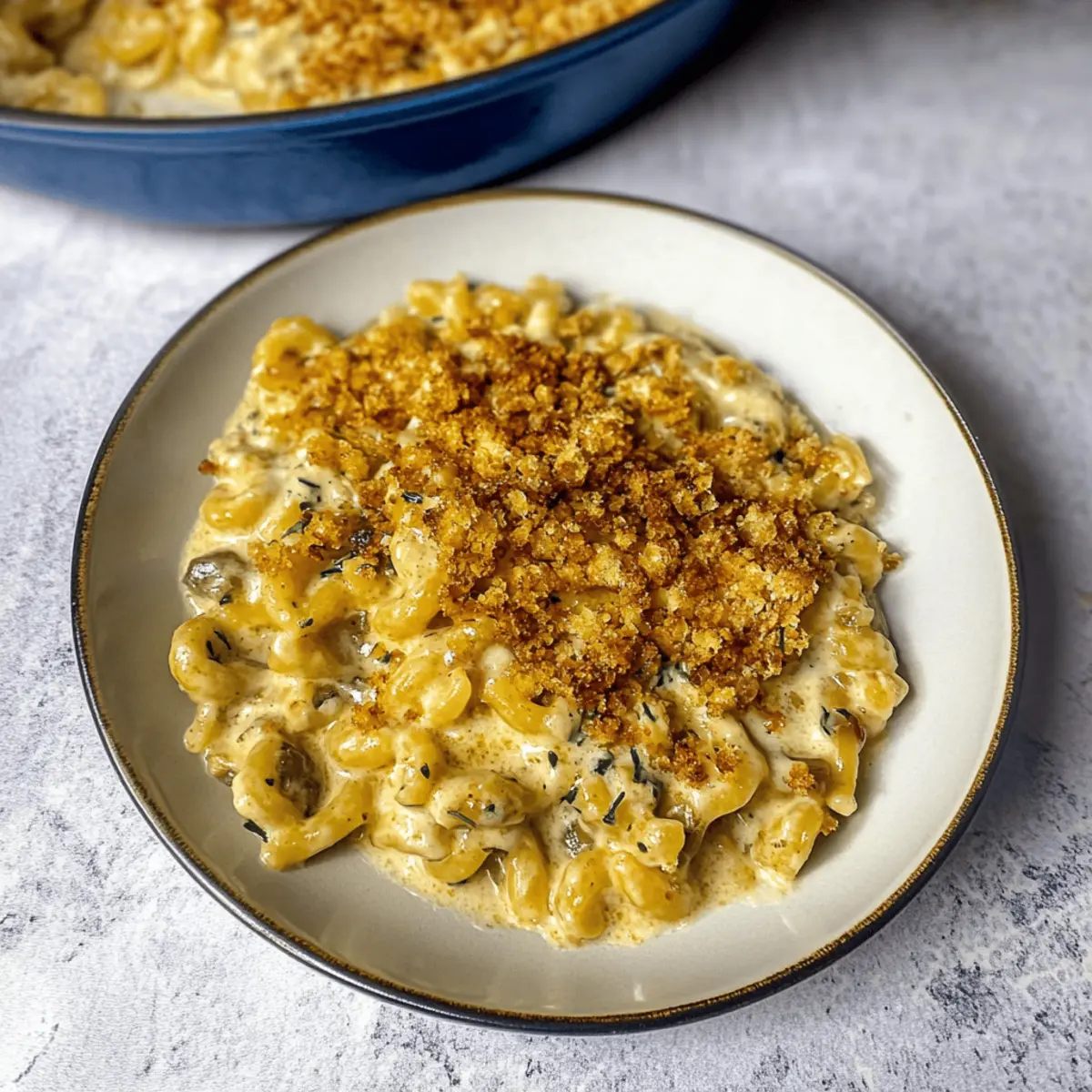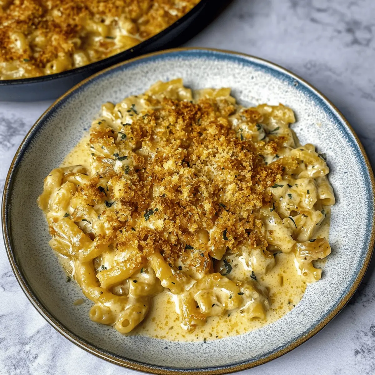 Jump to Recipe Print RecipeAs I stirred the pot, the sweet aroma of caramelized onions began to dance through the air, instantly turning my kitchen into a cozy escape. This Creamy French Onion Soup Pasta is my new go-to comfort dish, expertly blending the rich flavors of classic French onion soup with the delightful twist of creamy béchamel and pasta. It’s perfect for those evenings when you crave something heartwarming yet effortless. Not only does it come together in one pan to save you time, but this recipe also features a crispy breadcrumb topping that adds a delightful crunch, elevating your dinner experience. So, if you’re ready to impress family or just want to indulge in a warm bowl of nostalgia, stick around to discover how to create this pasta masterpiece! What’s your favorite comforting twist on a classic dish? Why Is This Pasta So Irresistible? Comforting familiarity: This Creamy French Onion Soup Pasta blends beloved elements of a classic dish with a pasta twist, ensuring it’s a crowd-pleaser. Effortless preparation: The recipe is designed for one-pan convenience, making cleanup a breeze while you enjoy cozy family dinners. Rich, layered flavors: With sweet caramelized onions and creamy béchamel, every bite is a delightful experience, reminiscent of a heartwarming bowl of soup. Customizable options: Feel free to swap pasta shapes or introduce veggies like spinach or mushrooms to suit your taste and dietary needs. Perfectly paired: Serve this dish alongside a fresh green salad or a glass of white wine for a wonderful evening vibe. French Onion Soup Pasta Ingredients Get ready to dive into the deliciousness! For the Pasta Dish Baguette – Perfect for homemade breadcrumbs; substitute with pre-made if you’re pressed for time. Olive Oil – Ideal for sautéing onions; use butter for a richer flavor if desired. Onions – The star of the show; yellow onions caramelize beautifully, enhancing the dish’s flavor. Beef Broth – Deepens the flavor while sautéing onions; switch to vegetable broth for a vegetarian option. Heavy Cream – Essential for creating that dreamy béchamel sauce; coconut milk makes a great dairy-free alternative. Parmesan Cheese – Adds depth and richness; nutritional yeast is a wonderful vegan substitute. Flour – Thickens the béchamel; all-purpose flour does the job nicely. Sugar – Helps caramelize onions; optional but can enhance their sweetness. Fresh Parsley – A sprinkle for garnish that brings a fresh touch; any herb can work well. Salt & Pepper – Essential for enhancing flavor; adjust to taste. Garlic Powder, Smoked Paprika, Nutmeg – Infuses aromatic goodness to the pasta; tweak amounts to your preference. For the Topping Additional Caramelized Onions – Layered on top for extra sweetness and flavor. Homemade Breadcrumbs – Adds that crispy, golden topping; can be made from leftover baguette. This French Onion Soup Pasta melds the comforting heartiness of classic soup with the delightful twist of pasta—prepare to be wowed! Step‑by‑Step Instructions for Creamy French Onion Soup Pasta Step 1: Caramelize Onions Start by thinly slicing 2 large yellow onions. In a large skillet over medium heat, add 2 tablespoons of olive oil and the sliced onions. Sauté for 30–40 minutes, stirring occasionally, until they become golden brown and caramelized. If they begin to stick, add splashes of beef broth to encourage the caramelization and prevent burning. Step 2: Prepare Béchamel Sauce Once your onions are perfectly caramelized and fragrant, reduce the heat to low and add 2 tablespoons of butter to the skillet. Allow it to melt, then whisk in 2 tablespoons of flour, cooking for about 2 minutes. Gradually pour in 1 cup of heavy cream, stirring continuously until the sauce thickens and becomes smooth and velvety. Stir in the caramelized onions and ½ cup of grated Parmesan cheese, seasoning with salt, pepper, and a pinch of nutmeg. Step 3: Cook Pasta While preparing the béchamel, bring a large pot of salted water to a boil. Add 8 ounces of your preferred pasta (cavatappi works wonderfully) and cook until it’s just under al dente, about 2 minutes less than package instructions. This ensures that your pasta will finish cooking while baking. Reserve a cup of pasta water and then drain the rest. Step 4: Combine In the skillet with the béchamel sauce, add the drained pasta and toss gently, ensuring every piece is well coated in the creamy goodness. If the mixture seems too thick, add a splash of reserved pasta water to loosen it up. Transfer this delightful mixture to a baking dish, spreading it out evenly. Step 5: Top & Bake Sprinkle additional caramelized onions on top along with homemade breadcrumbs, made from a 1-inch slice of baguette that you toasted and crumbed. Preheat your oven to 350°F (175°C) and bake the dish for 10–15 minutes, until the top is golden brown and crispy. Keep an eye on it, as the breadcrumbs can brown quickly. Step 6: Serve Remove the baking dish from the oven and allow it to cool slightly before serving. Garnish with chopped fresh parsley for a touch of color and flavor. Dive into your Creamy French Onion Soup Pasta while it’s warm, and enjoy the comforting flavors that remind you of classic French onion soup! What to Serve with Creamy French Onion Soup Pasta This comforting pasta dish is just waiting to be paired with delectable sides that enhance your dining experience. Crisp Green Salad: A refreshing salad with mixed greens, cherry tomatoes, and a light vinaigrette adds a bright contrast to the rich flavors of the pasta. The crunch of fresh vegetables helps balance the creamy texture. Garlic Bread: Golden-brown garlic bread, infused with butter and herbs, complements the pasta’s richness and makes for the perfect tool to soak up any leftover sauce. Each bite is a delightful combination of flavors. Roasted Vegetables: Seasoned with olive oil and herbs, roasted seasonal vegetables add a warm, earthy