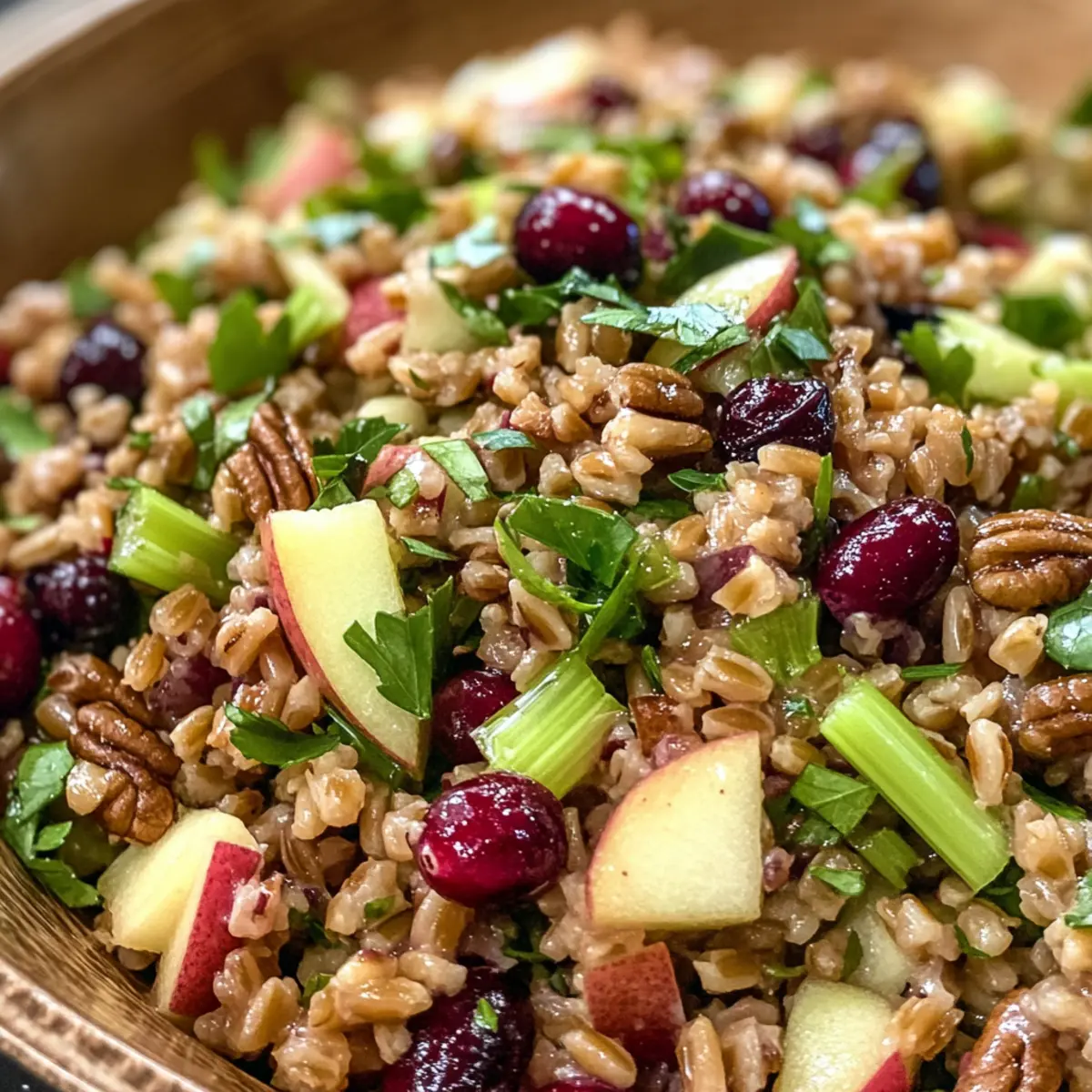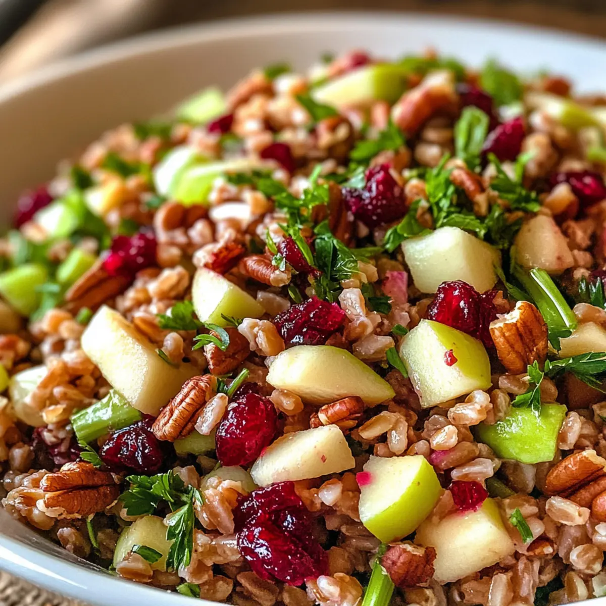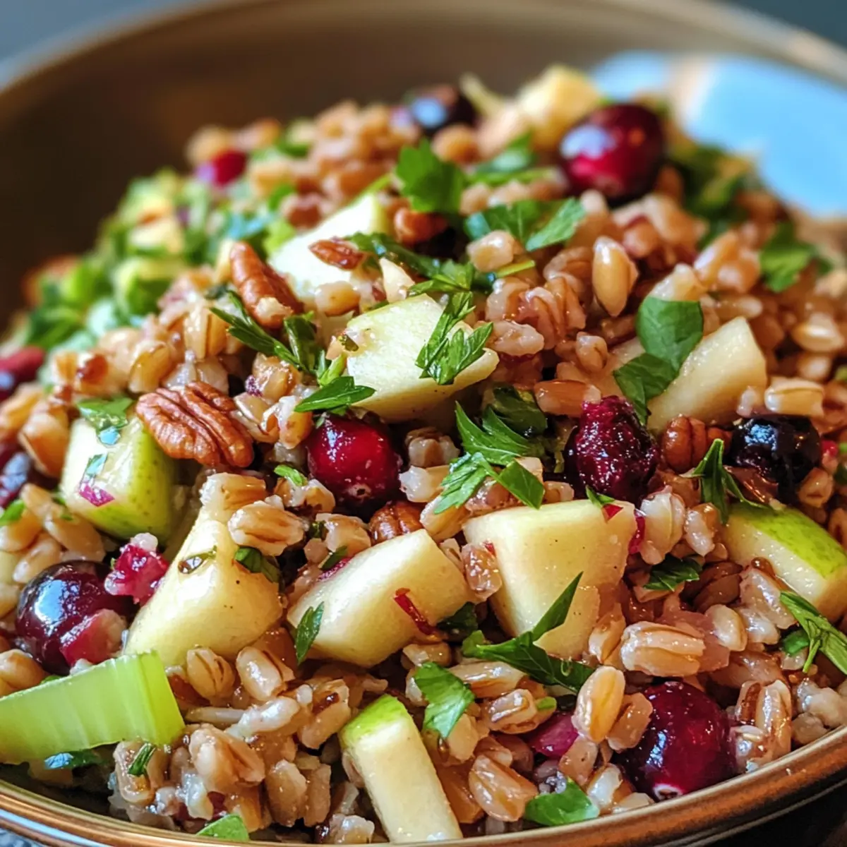 Jump to Recipe Print RecipeAs I stood at my kitchen counter, the vibrant colors of fresh produce caught my eye, sparking a delightful kitchen adventure. This Fresh Cranberry Apple Farro Salad is my secret weapon for turning ordinary meals into extraordinary culinary experiences. Packed with hearty farro, crisp apples, and crunchy toasted pecans, it strikes the perfect balance between sweet and savory. Not only is this salad a festive side dish ideal for holiday gatherings, but it also serves as a nutritious option for those busy weekdays. Plus, it’s a fantastic leftover that tastes even better the next day! How can you resist the idea of a meal that marries seasonal flavors and wholesome ingredients? Why is this salad a must-try? Vibrant colors make this Fresh Cranberry Apple Farro Salad not just a feast for your taste buds, but also for the eyes! Nutty farro adds a hearty base that keeps you feeling full longer. Sweet and tart cranberries pair beautifully with the crisp apples for a refreshing burst of flavor. Quick to prepare, it’s perfect for those weeknight dinners or paired with grilled meats. Plus, this salad is an exceptional crowd-pleaser—everyone will be asking for seconds! If you love hearty salads, try it alongside our Thai Chicken Salad with Peanut Dressing or the refreshing Herby Bean Salad. It’s a delightful addition to any meal! Fresh Cranberry Apple Farro Salad Ingredients Get ready to create a flavorful medley! For the Salad Farro – Provides a nutty flavor and serves as the salad’s hearty base. Chicken Broth – Used for cooking farro, adding depth to the flavor. Butter – Enhances richness and moisture in the farro. Fresh Thyme – Adds aromatic herbal notes. Celery – Contributes crunch and freshness. Honey Crisp Apple – Adds sweetness and texture; can substitute with another firm apple variety. Fresh Parsley – Provides color and freshness; substitute with cilantro if preferred. Fresh Cranberries – Deliver tartness; can replace with dried cranberries for a sweeter option. Toasted Pecan Pieces – Contribute crunch and richness; walnuts or sliced almonds can be substitutes. For the Cranberry Sauce Cranberry Juice Cocktail – Used in the cranberry sauce; opt for 100% juice for less sugar. Real Maple Syrup – Adds natural sweetness; can substitute with agave syrup. Red Wine Vinegar – Offers acidity; apple cider vinegar can be used as a substitute. Dijon Mustard – Imparts tanginess and depth; can substitute with whole grain mustard. Salt & Black Pepper – Enhance overall flavor. Give this Fresh Cranberry Apple Farro Salad a whirl, and watch it brighten up your table with its vibrant flavors! Step‑by‑Step Instructions for Fresh Cranberry Apple Farro Salad Step 1: Cook the Farro In a medium saucepan, combine 1 cup of farro with 4 cups of chicken broth, 1 tablespoon of butter, and a few sprigs of fresh thyme. Bring the mixture to a boil, then reduce the heat to low and cover. Simmer for about 20 minutes until the farro is tender yet chewy. Once cooked, drain excess liquid, fluff with a fork, and set aside to cool. Step 2: Prepare the Cranberry Mixture In a small saucepan, combine 1 cup of cranberry juice cocktail, ¼ cup of real maple syrup, and 1 cup of fresh cranberries. Bring to a gentle boil over medium heat and let simmer for about 5 minutes, stirring occasionally. You’ll know it’s ready when the cranberries begin to burst. Off the heat, stir in the remaining tablespoon of Dijon mustard, 2 tablespoons of red wine vinegar, and season with salt and black pepper to taste. Step 3: Combine the Salad Ingredients In a large mixing bowl, add the cooled farro. Dice 1 Honey Crisp apple and chop 2 stalks of celery, then add these to the bowl along with ¼ cup of freshly chopped parsley. Mix gently to combine, ensuring the ingredients are evenly distributed, and prepare for the next flavor boost from the cranberry mixture. Step 4: Mix in the Cranberry Sauce Pour the prepared cranberry mixture over the farro and vegetable combination in the large bowl. Gently fold everything together to ensure the salad is well-coated with the tangy sauce. This Fresh Cranberry Apple Farro Salad should have a vibrant color and inviting aroma, with the cranberries providing a sweet-tart punch that ties it all together. Step 5: Add the Nuts and Serve To finish, stir in ½ cup of toasted pecan pieces for added crunch and richness. Optionally, garnish the salad with a sprinkle of fresh parsley or thyme before serving. This salad can be enjoyed warm or chilled; either way, it’s a delightful addition to your holiday table or any weeknight dinner. How to Store and Freeze Fresh Cranberry Apple Farro Salad Fridge: Store leftover salad in an airtight container for up to 3 days. The flavors meld beautifully, making it even tastier the next day! Freezer: While fresh salads don’t freeze well, you can freeze components like cooked farro and cranberry sauce separately for up to 3 months for later use. Reheating: If enjoying the salad cold, simply take it from the fridge and serve. If you prefer it warm, gently heat the farro separately and mix with the other ingredients before serving. Expert Tips for Fresh Cranberry Apple Farro Salad Don’t Overcook Farro: Make sure to cook the farro until it’s tender yet chewy. Overcooking can lead to a mushy texture that detracts from the salad’s quality. Use Fresh Ingredients: Make sure to opt for the freshest apples, cranberries, and herbs. The freshness of ingredients greatly enhances the overall flavor of your Fresh Cranberry Apple Farro Salad. Toast Your Nuts: Toasting pecans in a dry skillet before adding them brings out their rich flavor. This simple step adds an extra layer of depth to the salad. Taste as You Go: Always taste the cranberry mixture before combining it with farro. Adjust the seasoning and sweetness to your preference for the best flavor profile. Refrigerate for Flavor Boost: This salad tastes even better the next 