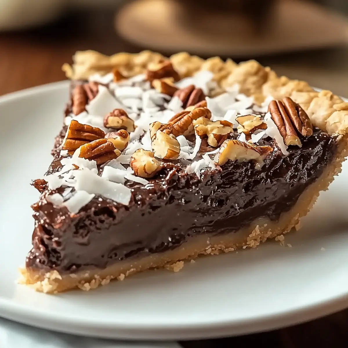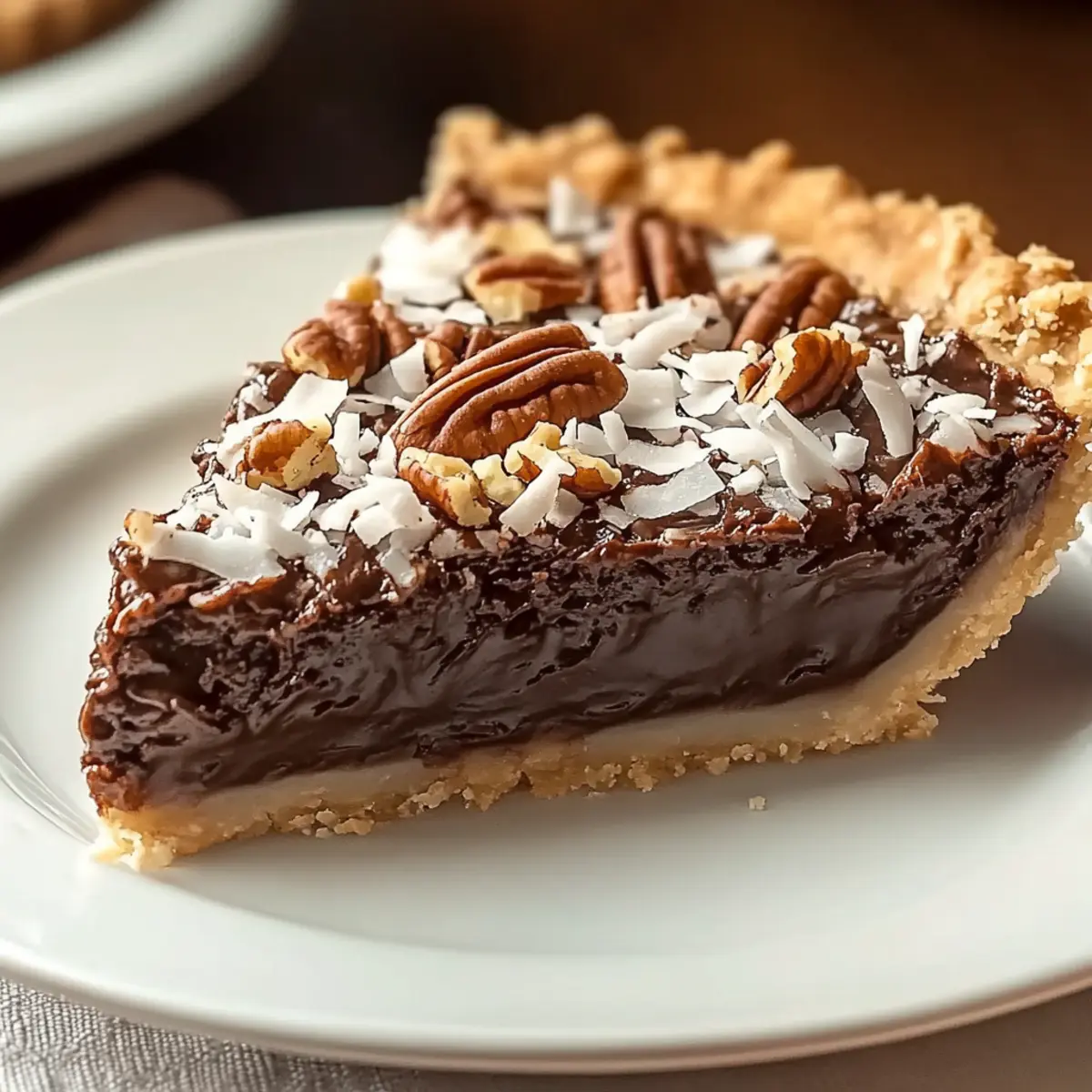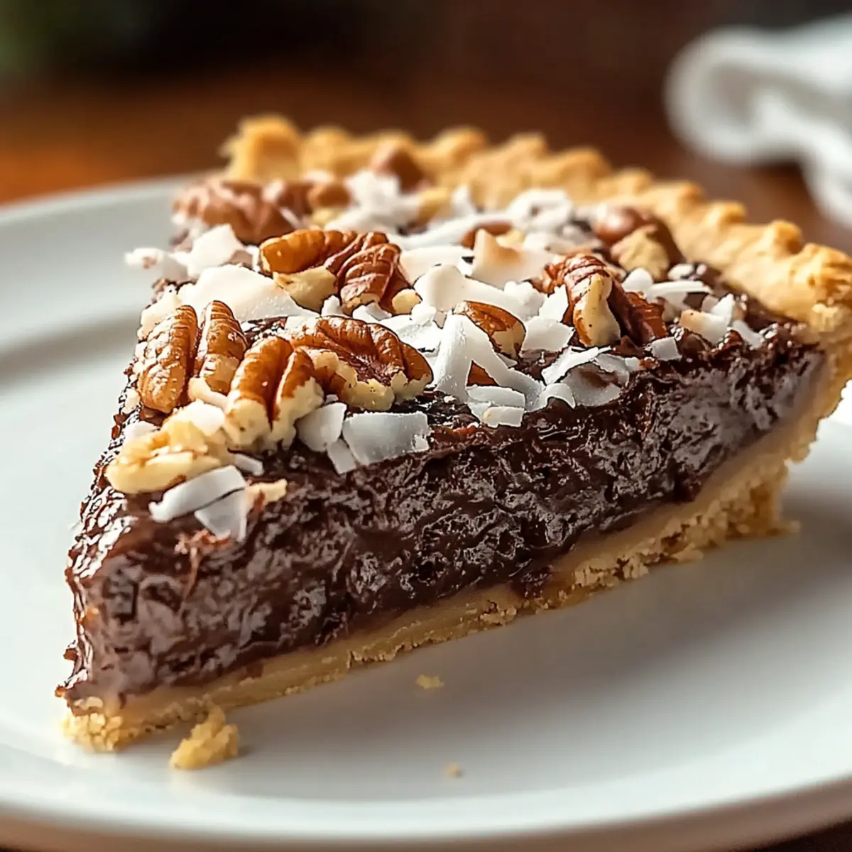 Jump to Recipe Print RecipeStepping into the world of dessert, I stumbled upon a revelation: the German Chocolate Pie. It’s not only a feast for the eyes with its elegant layers but also a symphony of flavors that effortlessly combines rich chocolate with sweet coconut and crunchy pecans. What I adore most about this easy chocolate pie is its ability to transcend ordinary gatherings—whether it’s a casual family dinner or a festive holiday feast, it always steals the spotlight. Plus, the silky chocolate filling is a breeze to whip up, making it a go-to for those busy evenings when time is tight but satisfaction remains paramount. Are you curious to discover how this heavenly treat comes together? Let’s dive into the irresistible recipe! Why is German Chocolate Pie so irresistible? Decadent, indulge in a dessert that feels luxurious yet is easy to make! Crowd-Pleasing, perfect for any gathering, this pie is bound to impress guests at potlucks and family dinners alike. Flavorful Layers, enjoy the stunning contrast of rich chocolate, sweet coconut, and crunchy pecans. Make-Ahead Delight, this recipe tastes even better the next day—ideal for preparing ahead of time. Customizable Options, feel free to try variations like a graham cracker crust or substitute almonds for pecans. Dive into dessert bliss with this cherished treat! German Chocolate Pie Ingredients For the Filling German’s Sweet Chocolate – Essential for that rich chocolate flavor; consider semi-sweet chocolate as a substitute, adding a touch of extra sugar. Butter – Adds richness; opt for unsalted for better control over overall saltiness. Large Eggs – Give structure and texture; make sure they’re at room temperature for optimal mixing. Granulated Sugar – Sweetens the filling; using brown sugar will lend a deeper, caramel-like flavor. Vanilla Extract – Elevates the flavor; pure vanilla extract is preferred for authenticity. Salt – Balances the sweetness perfectly; definitely don’t skip this vital ingredient. Heavy Cream – Provides creaminess; evaporated milk is a lighter substitute if desired. Instant Coffee (optional) – Intensifies the chocolate flavor without adding a coffee taste; feel free to leave it out if you’re not a fan. For the Topping Sweetened Flaked Coconut – Delivers delightful texture and flavor; switch to unsweetened if you prefer less sweetness. Chopped Pecans – Adds that satisfying crunch; toasting them enhances their flavor, or substitute walnuts as an alternative. Brown Sugar – Sweetens and moistens the topping; choose light or dark based on your flavor preference. Evaporated Milk – Adds creaminess to the topping; regular milk can work if you want to lighten it up. For the Crust Pre-made Pie Crust – A great time-saver; pick a store-bought varient or try a graham cracker crust for a twist. Indulge in the magic of making this blissful German chocolate pie, reminiscent of classic chocolate pecan pie recipes, that is sure to impress everyone at your table! Step‑by‑Step Instructions for German Chocolate Pie Step 1: Prepare the Crust Begin by preheating your oven to 375°F (190°C). Carefully place your pre-made pie crust in a 9-inch pie dish, crimping the edges as desired. If the crust requires pre-baking, bake it for about 10 minutes until lightly golden, then remove it from the oven and let it cool completely while you prepare the filling. Step 2: Make the Chocolate Filling In a medium saucepan over low heat, melt together 4 ounces of German’s Sweet Chocolate and ½ cup of unsalted butter, stirring constantly until smooth. In a separate mixing bowl, beat 3 large eggs with 1 cup of granulated sugar until pale and fluffy. Gradually whisk in the melted chocolate mixture, followed by ½ cup of heavy cream and 1 teaspoon of pure vanilla extract, ensuring everything is well combined. Step 3: Bake the Filling Pour the rich chocolate filling into the cooled pie crust, smoothing it evenly with a spatula. Bake in the preheated oven for 25–30 minutes, or until the filling is set but still slightly jiggly in the center. Once done, remove the pie from the oven and allow it to cool completely at room temperature, which will help it firm up further. Step 4: Prepare Coconut Pecan Topping While the pie cools, prepare the topping by combining ¼ cup of unsalted butter, ¾ cup of brown sugar, and ⅓ cup of evaporated milk in a medium saucepan. Cook over medium heat, stirring continuously until the mixture thickens, about 5–7 minutes. Once thickened, remove from heat and fold in 1 cup of sweetened flaked coconut and ¾ cup of chopped pecans, mixing until everything is fully coated. Step 5: Assemble and Serve Once the chocolate filling has fully cooled, carefully spread the coconut pecan topping over the pie, creating a lovely layer on top. Chill the entire pie in the refrigerator for at least 2 hours, allowing the flavors to meld and the pie to set even further. Once chilled, slice your decadent German Chocolate Pie and serve it chilled or at room temperature, delighting everyone with each luscious bite! What to Serve with Irresistible German Chocolate Pie? Indulging in a slice of this pie isn’t just about the chocolate; it’s about creating a complete and delightful dessert experience that tantalizes the senses. Whipped Cream: A dollop of freshly whipped cream adds a light, airy contrast to the rich pie, enhancing each bite. Vanilla Ice Cream: The creamy sweetness of vanilla ice cream beautifully complements the chocolate and nutty flavors, making for an extra indulgent treat. Fresh Berries: Raspberries or strawberries offer a juicy pop of flavor and vibrant color, cutting through the richness of the pie delightfully. Coffee: A hot cup of coffee enhances the chocolate notes in the pie, creating a comforting and cozy pairing that’s perfect for a gathering or quiet evening. Chocolate Sauce: Drizzle warm chocolate sauce over the pie for double chocolate bliss. It adds decadence
