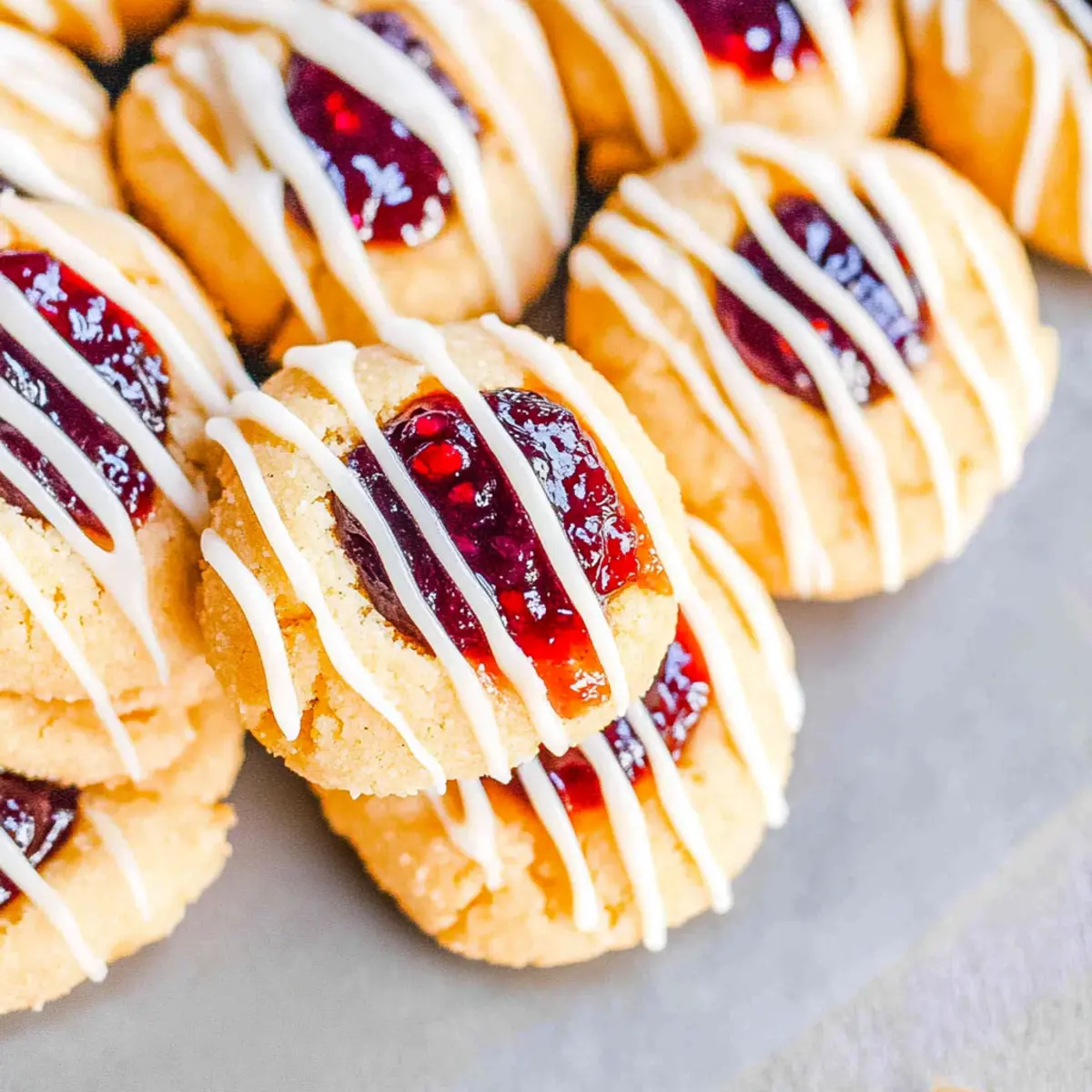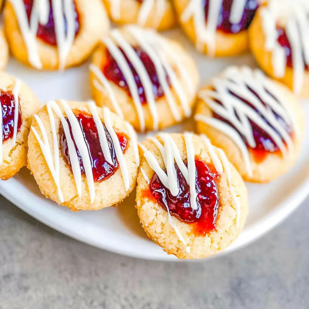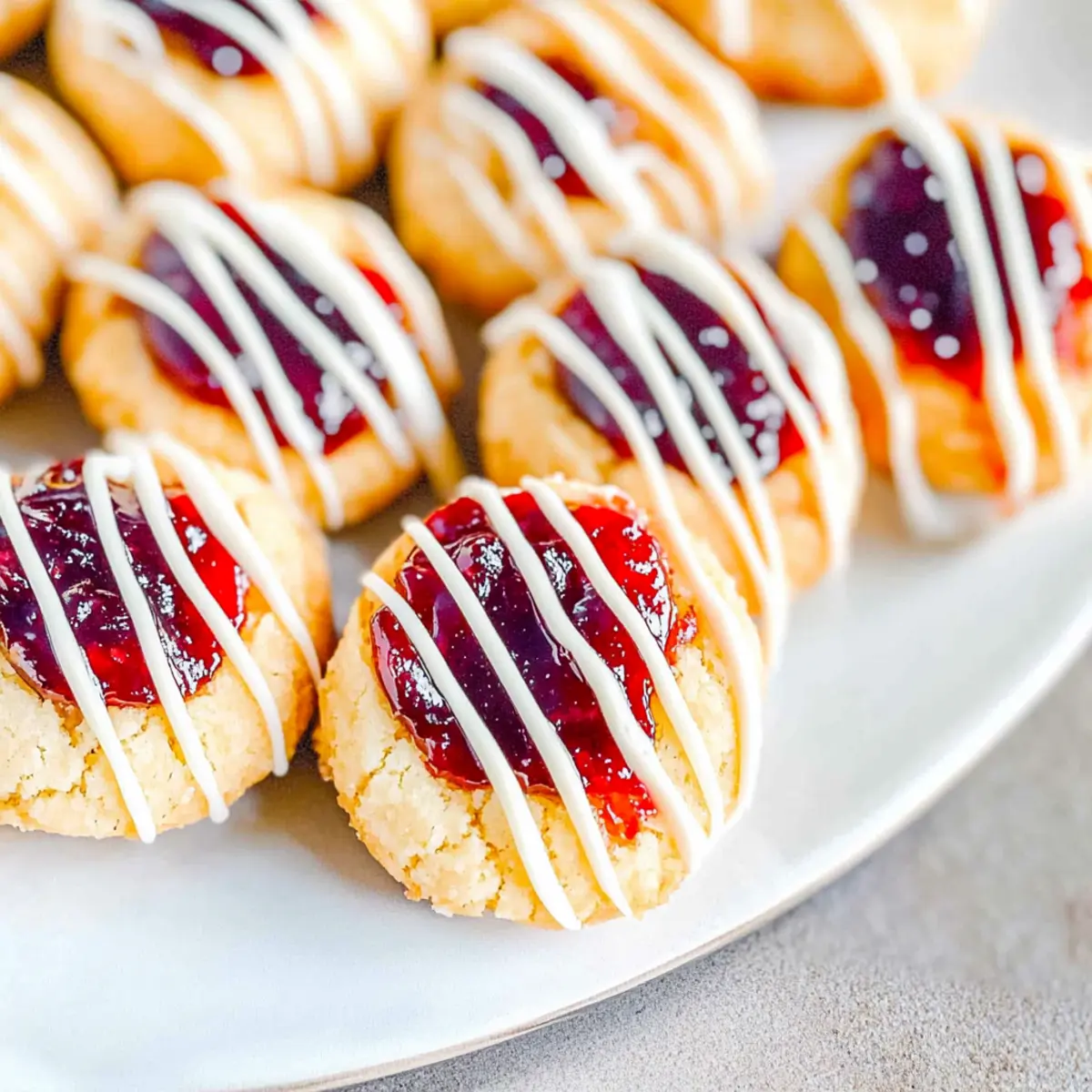 Jump to Recipe Print RecipeAs I stood in my kitchen, a delightful aroma wafted through the air, reminding me of better days spent baking with loved ones. These Gluten-Free Jam Thumbprint Cookies not only evoke nostalgia, but they also cater to gluten-free diets without compromising on taste or texture. With their buttery softness and colorful jam centers, they bring a whimsical touch to any gathering. But what’s even better? They are quick to whip up and highly customizable—perfect for impressing family and friends while keeping everyone’s dietary preferences in mind. So, whether you’re hosting a festive celebration or simply want a sweet snack, these jam-filled cookies are here to soothe your cravings. Are you ready to bring a little magic into your baking routine? Why are these cookies a must-try? Deliciously Unique: The combination of rich butter and flavorful jam creates a cookie experience that’s both nostalgic and innovative. Quick and Easy: With minimal prep time, you’ll have these gluten-free delights ready to enjoy in under 30 minutes! Customizable Flavors: Whether you prefer raspberry, apricot, or a unique jam like blueberry, achieve your desired taste with ease. Festive Touch: The drizzle of white chocolate adds an extra layer of sweetness and a stunning visual appeal perfect for celebrations. Family-Friendly: These cookies are perfect for everyone, making them an excellent addition to your sweet treats alongside other favorites like Flourless Dark Cookies or Cone Crunch Cookies. Perfect for Sharing: Soft and gooey, every bite is a treat that guests will adore, making them a hit at any gathering. Gluten-Free Thumbprint Cookie Ingredients • To make these delightful gluten-free jam-filled cookies, gather the following ingredients! For the Cookie Dough Unsalted Butter – Provides richness and moisture; substitute with vegan butter for a dairy-free option. Granulated Sugar – Sweetens the dough, helping to create a tender crumb; no direct substitutes recommended. Egg plus Egg Yolk – Adds structure and richness; for a vegan version, replace with flaxseed meal mixed with water. Vanilla Extract – Enhances overall flavor; can substitute with almond extract if desired. Almond Extract – Infuses a lovely nutty flavor; omit for nut allergies or replace with extra vanilla. Kosher Salt – Balances the sweetness and enhances flavors; no substitute needed. Gluten-Free Flour Blend – Provides structure and replaces traditional flour; ensure it includes xanthan gum if needed. Xanthan Gum – Helps bind and mimic gluten texture; omit if your flour blend already contains it. For the Flavorful Filling Jam (e.g., raspberry, apricot) – Serves as the sweet filling, offering moisture and a fruity burst; any jam can be used based on your preference. For the Optional Drizzle White Chocolate Chips (optional) – Adds delightful sweetness; substitute with dark chocolate for a richer flavor. Vegetable Shortening (optional) – Used to thin out white chocolate for drizzling; omit if not using. Get ready to bake these flavorful Gluten-Free Thumbprint Cookies that’ll surely melt hearts! Step‑by‑Step Instructions for Gluten-Free Jam Thumbprint Cookies Step 1: Preheat the Oven Begin by setting your oven to 350°F (175°C) to ensure it’s hot and ready for baking. This temperature is key for achieving that perfect golden edge on your gluten-free thumbprint cookies. While the oven heats, gather your baking sheets and line them with parchment paper to prevent sticking. Step 2: Cream the Butter and Sugar In a large mixing bowl, combine 1 cup of softened unsalted butter and 1 cup of granulated sugar. Using an electric mixer, cream them together on medium speed for about 3-4 minutes until the mixture is light and fluffy. This step is crucial, as it incorporates air for a tender cookie texture. Step 3: Add the Eggs and Extracts Next, add 1 egg, 1 egg yolk, 1 teaspoon of vanilla extract, and ½ teaspoon of almond extract to the creamed mixture. Beat everything together on low speed until fully integrated. The addition of these ingredients not only enriches the flavor but also helps to bind the dough. Step 4: Mix in the Dry Ingredients In a separate bowl, combine 2 cups of gluten-free flour blend, ½ teaspoon of kosher salt, and ¼ teaspoon of xanthan gum (if not included in your flour blend). Slowly add this dry mixture to the wet ingredients, stirring with a wooden spoon or spatula until a soft dough forms. Don’t overmix, as this can affect the crumb. Step 5: Chill the Dough Once your dough is fully mixed, wrap it in plastic wrap and place it in the refrigerator for about 10 minutes. Chilling helps the gluten-free thumbprint cookie dough firm up, preventing excessive spreading during baking and ensuring they maintain their shape. Step 6: Shape the Cookies After chilling, remove the dough from the fridge and scoop out 1-inch portions. Roll each portion into a ball and place them on the prepared baking sheet, leaving space in between. Using your thumb or a small spoon, create an indentation in each ball to hold the jam filling. Step 7: Fill with Jam Choose your favorite jam—like raspberry or apricot—and spoon it into the center of each thumbprint on the cookies. Fill the wells generously, but be careful not to overflow. This fruity filling is what makes these gluten-free thumbprint cookies so delightful! Step 8: Bake the Cookies Place your baking sheet in the preheated oven and bake for 8-10 minutes. Keep an eye on them; you want the edges to be lightly golden while the centers stay soft. The aroma of this baking will fill your kitchen with sweet anticipation! Step 9: Cool the Cookies Once baked, remove the cookies from the oven and let them cool on the baking sheet for about 5 minutes. This cooling period allows the cookies to set properly. Then, gently transfer them to a wire rack to cool completely before decorating or serving. Step 10: Optional Chocolate Drizzle If you desire a