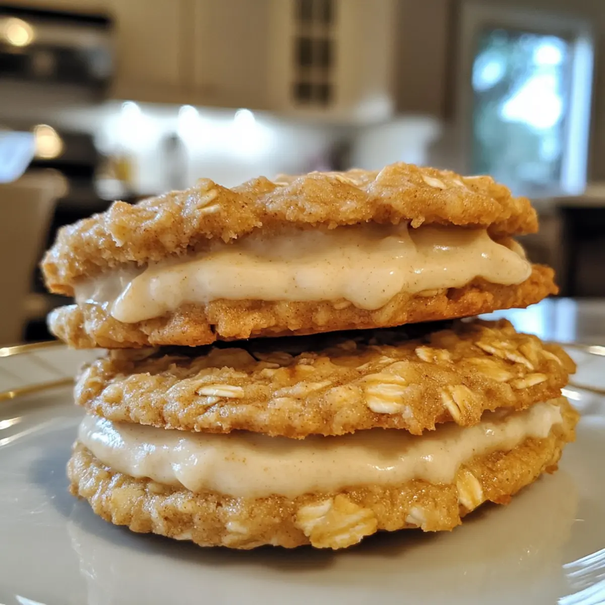 Jump to Recipe Print RecipeAs I savored the last sip of my steaming cup of chai, a thought struck me—why not infuse that same cozy warmth into a cookie? Enter the Golden Oat Masala Chai Custard Sandwich Cookies, a delightful mashup of comforting flavors and textures that will whisk you away to a blissful tea time. These cookies pack a perfect punch of spices and a creamy custard filling, making them not only a fun treat to whip up but also a guaranteed crowd-pleaser. With quick prep and an oaty chewiness bathed in warm chai aromas, they’re irresistible straight from the oven or chilled from the fridge. So, are you ready to elevate your cookie game and indulge in a delightful fusion of flavors? Let’s dive into this delicious recipe together! Why are these cookies a must-try? Irresistible Comfort: The Golden Oat Masala Chai Custard Sandwich Cookies combine the warmth of chai spices with a delightful custard filling, creating an incredibly cozy dessert that feels like a hug in cookie form. Quick Prep: These cookies come together in no time, perfect for those busy days when you crave something homemade but don’t want to spend hours in the kitchen. Unique Fusion: This recipe beautifully marries British biscuit culture with Indian chai traditions, offering a delightful twist that will surprise and impress your friends and family. Versatile Flavors: Feel free to experiment! Swap out the masala chai with Matcha for a refreshing version, or add in some nuts for extra crunch. Pair these cookies with a steaming cup of masala chai, and you’ll have the perfect afternoon treat! Golden Oat Masala Chai Custard Sandwich Cookies Ingredients For the Cookies All-Purpose Flour – Provides structure; substitute with gluten-free flour for a gluten-free version. Quick Cooking Rolled Oats – Adds chewiness and texture; traditional oats can be used for a slightly different texture. Dark Brown Sugar – Offers rich sweetness and moisture; coconut sugar makes for a great less processed alternative. White Sugar – Contributes additional sweetness; granulated sugar works perfectly here as well. Salt – Enhances flavor; it’s crucial for balancing the sweetness. Unsalted Butter – Adds richness; swap with coconut oil for a dairy-free twist. Golden Syrup/Honey – Keeps cookies moist and adds sweetness; maple syrup is a suitable alternative. Water – Used for combining ingredients; no substitutes necessary. Baking Soda – Helps cookies rise and achieve the right texture. Dry Masala Chai – Infuses the cookies with chai flavor; can be replaced with a chai tea blend or homemade spice mix. Fresh Ginger – Adds aromatic spice notes; use 1/4 teaspoon dried ginger as a substitute. For the Custard Filling Custard Powder – Creates that luscious custard texture; cornstarch can be used if desired. Egg Yolks – Provides richness and thickens the custard; use a flax egg (1 tablespoon flaxseed meal + 2.5 tablespoons water) for a vegan version. Masala Chai Spice Mix – Enhances the custard’s flavor; alternatively, use a blend of cardamom, ginger, and cinnamon. Black Pepper – Adds a gentle warmth; feel free to omit for a milder flavor. Enjoy making these Golden Oat Masala Chai Custard Sandwich Cookies that weave the warm spices of chai with a delightful custard experience! Step‑by‑Step Instructions for GOLDEN OAT MASALA CHAI CUSTARD SANDWICH COOKIES Step 1: Preheat and Prepare Baking Sheets Start by preheating your oven to 325°F (165°C). Meanwhile, line three baking sheets with parchment paper, ensuring even spacing for your cookies. This preparation helps prevent sticking and makes for easy cleanup after baking. Step 2: Mix Dry Ingredients In a large mixing bowl, whisk together the all-purpose flour, quick cooking rolled oats, dark brown sugar, white sugar, and a pinch of salt. This combination will form the dry base for your GOLDEN OAT MASALA CHAI CUSTARD SANDWICH COOKIES, creating a flavorful texture that holds up beautifully once baked. Step 3: Brown the Butter In a medium saucepan, melt unsalted butter over medium heat until it turns golden brown, producing a nutty aroma—this should take about 5 minutes. Once browned, remove it from heat and stir in the golden syrup and water, mixing until well combined. This rich mixture enhances the cookies with a delightful flavor. Step 4: Combine Wet and Dry Ingredients Pour the browned butter mixture into the bowl of dry ingredients. Stir well until a dough forms, ensuring all flour and oats are incorporated. Scoop out portions of the dough and shape them into balls using your hands—this step allows for perfectly formed GOLDEN OAT MASALA CHAI CUSTARD SANDWICH COOKIES. Step 5: Bake the Cookies Place the cookie dough balls onto the prepared baking sheets, making sure to space them about 2 inches apart. Bake in the preheated oven for approximately 8 minutes, or until the edges turn a lovely golden color, signaling that they are ready. Step 6: Cool the Cookies Once baked, let the cookies cool on the trays for a few minutes. Then gently transfer them to a wire rack to cool completely. This cooling process is essential as it allows the cookies to firm up while retaining their chewy texture. Step 7: Prepare Masala Chai Syrup In a small saucepan, add hot water, dry masala chai, and fresh ginger, bringing the mixture to a simmer over low heat. Allow it to steep for about 5 minutes before straining out the solids, leaving you with a fragrant chai infusion perfect for the custard filling. Step 8: Make the Chai Syrup Return the strained masala chai liquid to the saucepan and stir in sugar, cooking over medium heat until it reaches 240°F (115°C) on a candy thermometer. This syrup will sweeten and flavor your custard filling, adding richness to the GOLDEN OAT MASALA CHAI CUSTARD SANDWICH COOKIES. Step 9: Prepare the Custard Mixture In a mixing bowl, whisk the egg yolks and slowly incorporate the hot chai syrup. Gradually mix in the custard powder and masala chai sp