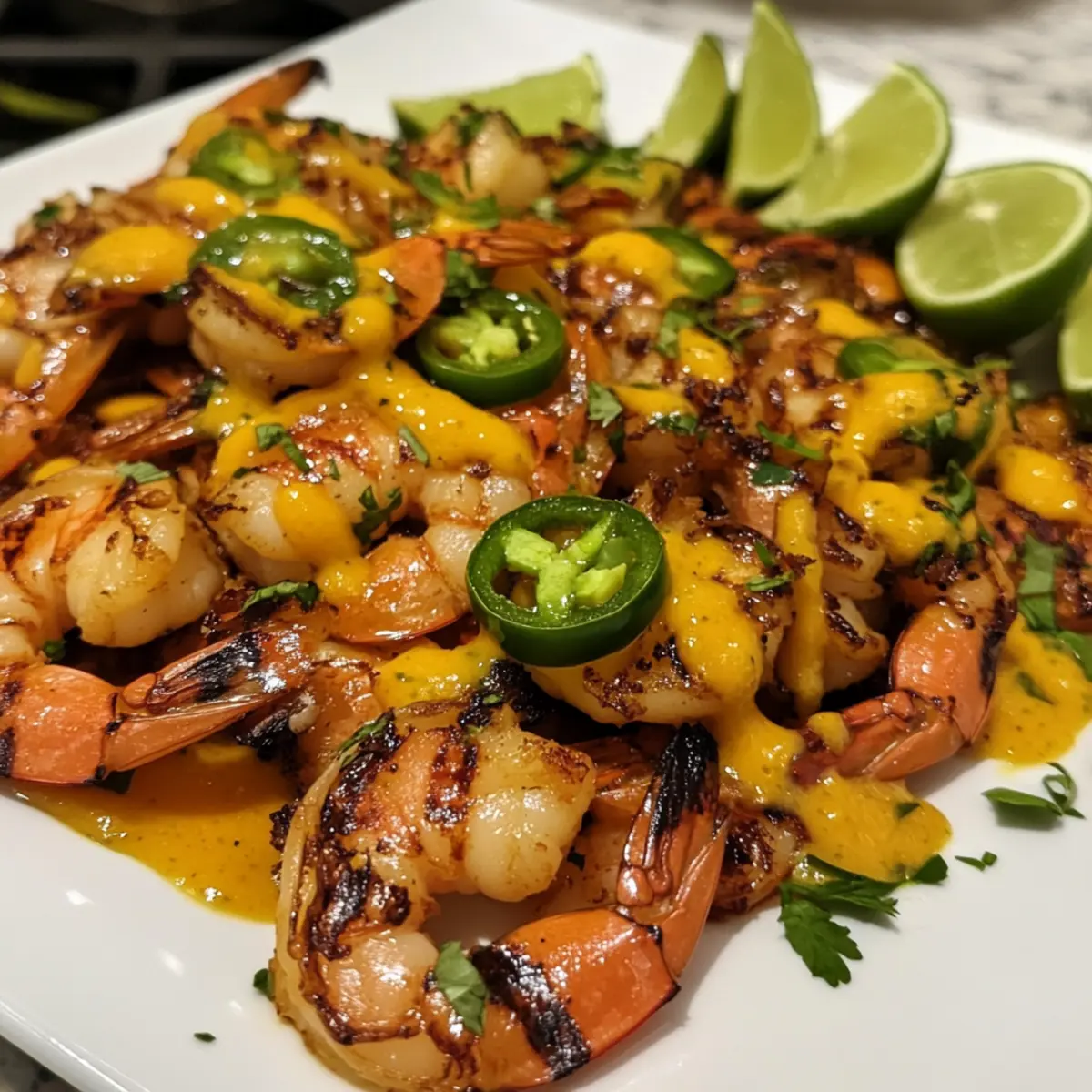 6. Transfer the grilled shrimp to a serving platter and drizzle with the mango lime coulis or serve it in a bowl on the side.