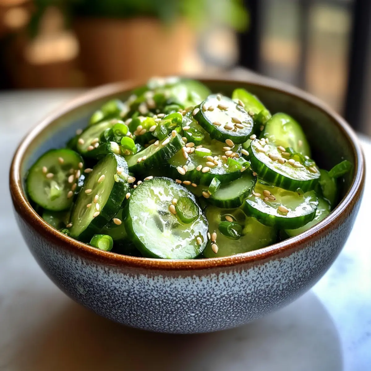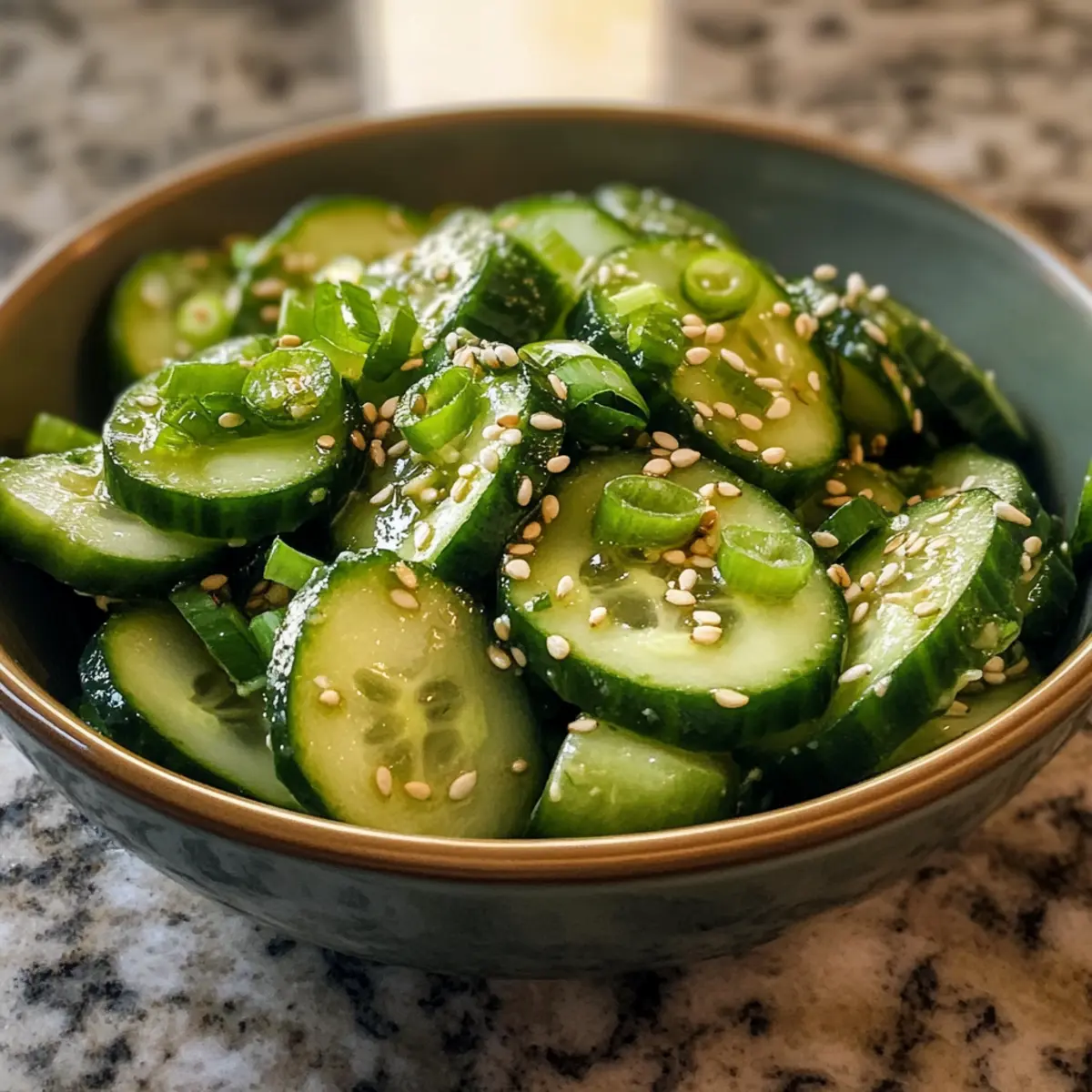 Right before serving, sprinkle a tablespoon of sesame seeds and some chopped scallions over the top of the salad for an extra touch of flavor and crunch. The contrast of the green scallions and white sesame seeds against the cucumbers adds lovely aesthetic appeal, making your salad ready to impress family and friends.