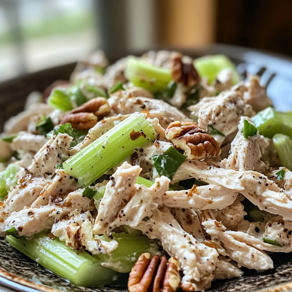 Next, finely chop the celery, ensuring it’s fresh and crisp. This adds essential crunch to your salad. With the chopped celery ready, sprinkle it over the shredded chicken in the bowl. If you’re using pecans for added texture, roughly chop them as well, and mix them into the bowl with the chicken and celery.