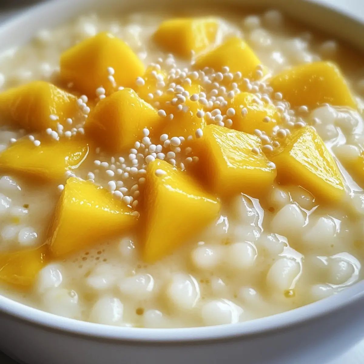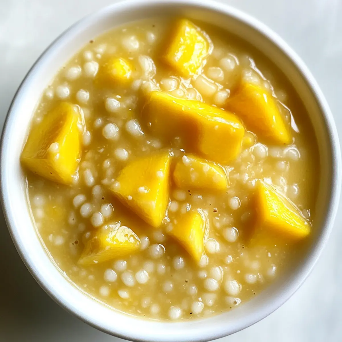 Jump to Recipe Print RecipeAs I lifted a spoonful of this vibrant Mango Sago, the world faded away, and I was transported to a tropical paradise. This easy tropical mango sago pudding takes just 30 minutes to create and perfectly balances the sweet, luscious flavors of fresh mango with the creaminess of coconut milk and chewy tapioca pearls. Whether you’re looking for a quick dessert to impress guests or a refreshing treat on a hot day, this gluten-free delight checks all the boxes. Plus, with only a handful of ingredients, it’s an effortless way to bring a taste of Asia into your kitchen. What are you waiting for? Let’s dive into this fruity adventure and whip up some Mango Sago that’s sure to delight! Why Is Mango Sago So Irresistible? Creamy, Dreamy Delight: The combination of fresh mangoes and coconut milk creates a luscious dessert that transports your taste buds straight to tropical bliss. Quick to Prepare: With only 30 minutes from start to finish, you can whip up this delicious treat without a kitchen marathon. Versatile Ingredients: Use fresh or frozen mangoes based on availability, and customize with toppings like coconut jelly or pineapple for a unique twist! Healthy Indulgence: Naturally gluten-free and balanced in nutrients, you can enjoy this treat guilt-free while impressing friends at your next gathering. Crowd Favorite: Perfect for summer parties or family gatherings, everyone will adore this refreshing dessert. For more tropical flavor inspirations, check out our delicious fruity desserts to keep your dessert game exciting! Mango Sago Ingredients For the Pudding Sago Pearls – Small tapioca pearls add delightful chewiness; swap with larger pearls for a different texture. Mango – Fresh ripe mangoes ensure vibrant flavors; frozen mangoes or mango puree are great alternatives. Coconut Milk – Full-fat coconut milk contributes dreamy creaminess, enhancing the tropical experience. Evaporated Milk – Chilled evaporated milk boosts richness; use extra coconut milk for a dairy-free treat. Condensed Milk – Adds just the right amount of sweetness; adjust to taste, or try maple syrup for a vegan option. Optional Toppings Coconut Jelly – Adds a soft texture and tropical flavor; can be left out if desired. Mango Jelly – Provides a burst of color and flavor; optional but makes for an attractive presentation. Elevate your Mango Sago experience and enjoy the refreshing tropical vibes! Step‑by‑Step Instructions for Mango Sago Step 1: Cook the Sago Pearls Begin by bringing 4 cups of water to a boil in a medium saucepan over medium-high heat. Add the sago pearls and stir gently, allowing them to cook for about 15 minutes, until they turn translucent. Keep an eye on them, stirring occasionally to prevent sticking. Step 2: Let the Sago Sit Once the sago pearls are transparent, remove the saucepan from heat. Cover the pot with a lid and let the pearls sit in the hot water for another 15 minutes. This resting period ensures they achieve the perfect chewy texture, making your Mango Sago delightfully enjoyable. Step 3: Rinse the Sago After the resting period, strain the cooked sago pearls through a fine-mesh sieve and rinse them under cold running water. This step is crucial for removing excess starch and preventing the pearls from clumping together. Set the rinsed sago aside to drain completely. Step 4: Blend the Mango While the sago is draining, peel and dice two ripe mangoes. In a blender, combine the diced mango and 1 cup of chilled evaporated milk. Blend until you achieve a smooth, creamy consistency. This delicious mango puree will form the base of your Mango Sago. Step 5: Mix the Ingredients In a large mixing bowl, add the drained sago pearls, the mango puree, and 1 cup of coconut milk. If you want to use optional jellies, add chopped pieces at this stage as well. Gently mix all the ingredients together until everything is well combined, creating a colorful tropical medley. Step 6: Adjust Sweetness After mixing, taste your Mango Sago and add condensed milk to your preferred sweetness level. This will enhance the dessert’s flavor while keeping it balanced. Stir well to ensure the sweetener is evenly distributed throughout the mixture. Step 7: Chill the Pudding Transfer the combined Mango Sago into individual serving cups or one large vessel, and cover it with plastic wrap. Chill in the refrigerator for at least 1 hour. This chilling period allows the flavors to meld together beautifully and the dessert to set for the best taste experience. Step 8: Serve and Enjoy Once chilled, your refreshing Mango Sago is ready to be served! Scoop the pudding into bowls or cups, garnishing with fresh mango pieces or any additional toppings you desire. This delightful tropical dessert is perfect for any occasion, offering a refreshing taste of paradise. Mango Sago Variations & Substitutions Feel free to get creative with this recipe and make it your own with these delightful twists! Alternative Sweeteners: Swap condensed milk with honey or agave syrup for a natural sweetness. Fruit Variations: Try using different fruits like passion fruit or ripe bananas for a unique flavor combination. Each fruit offers a delightful twist that keeps it exciting! Dairy-Free: Use only coconut milk instead of evaporated milk for a completely dairy-free treat. This enhances the tropical vibe while catering to specific dietary needs. Nutty Finish: Add a sprinkle of toasted coconut or crushed nuts for extra texture and flavor, providing a satisfying crunch with every bite. Flavor Infusion: Introduce a splash of lime juice to give your Mango Sago a zesty kick. It brightens the flavors and adds a refreshing tang that works beautifully in summer! Creamy Upgrade: Blend in some cream cheese or whipped coconut cream for an extra creamy Mousse-like texture. This makes for a rich dessert that elevates the experience! Chili Heat: For the adventurous, incorporate a pinch of chili powder or finely chopped fresh c
