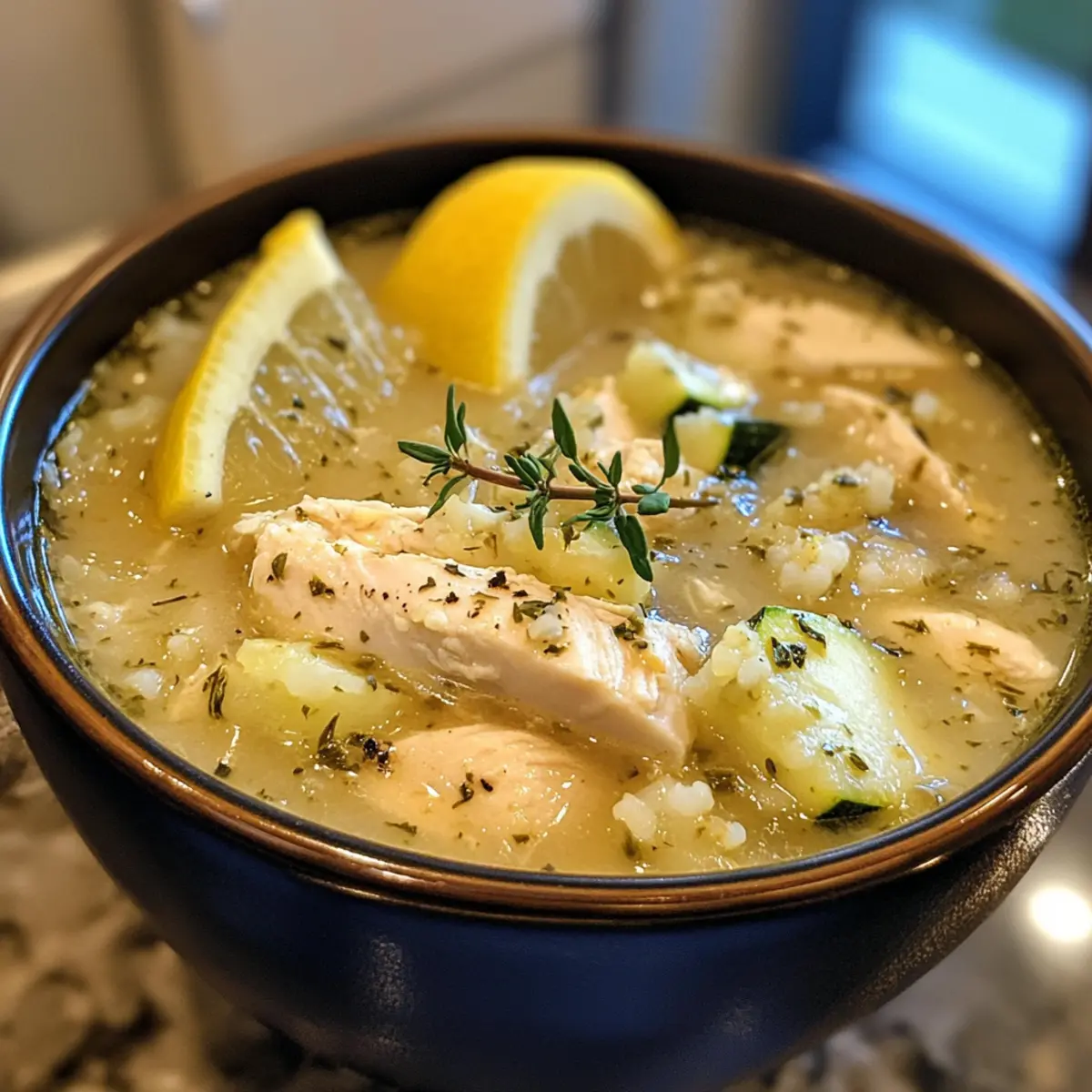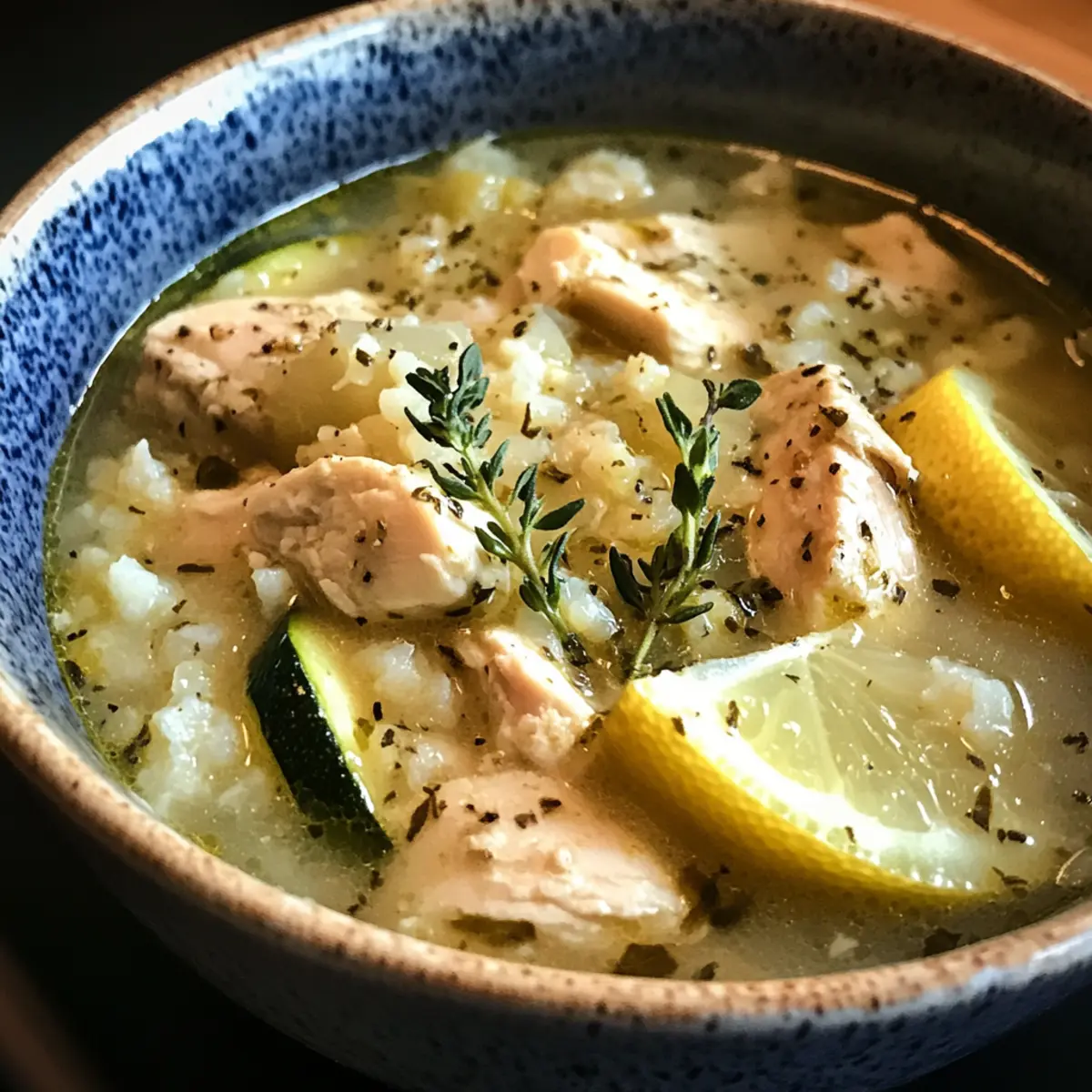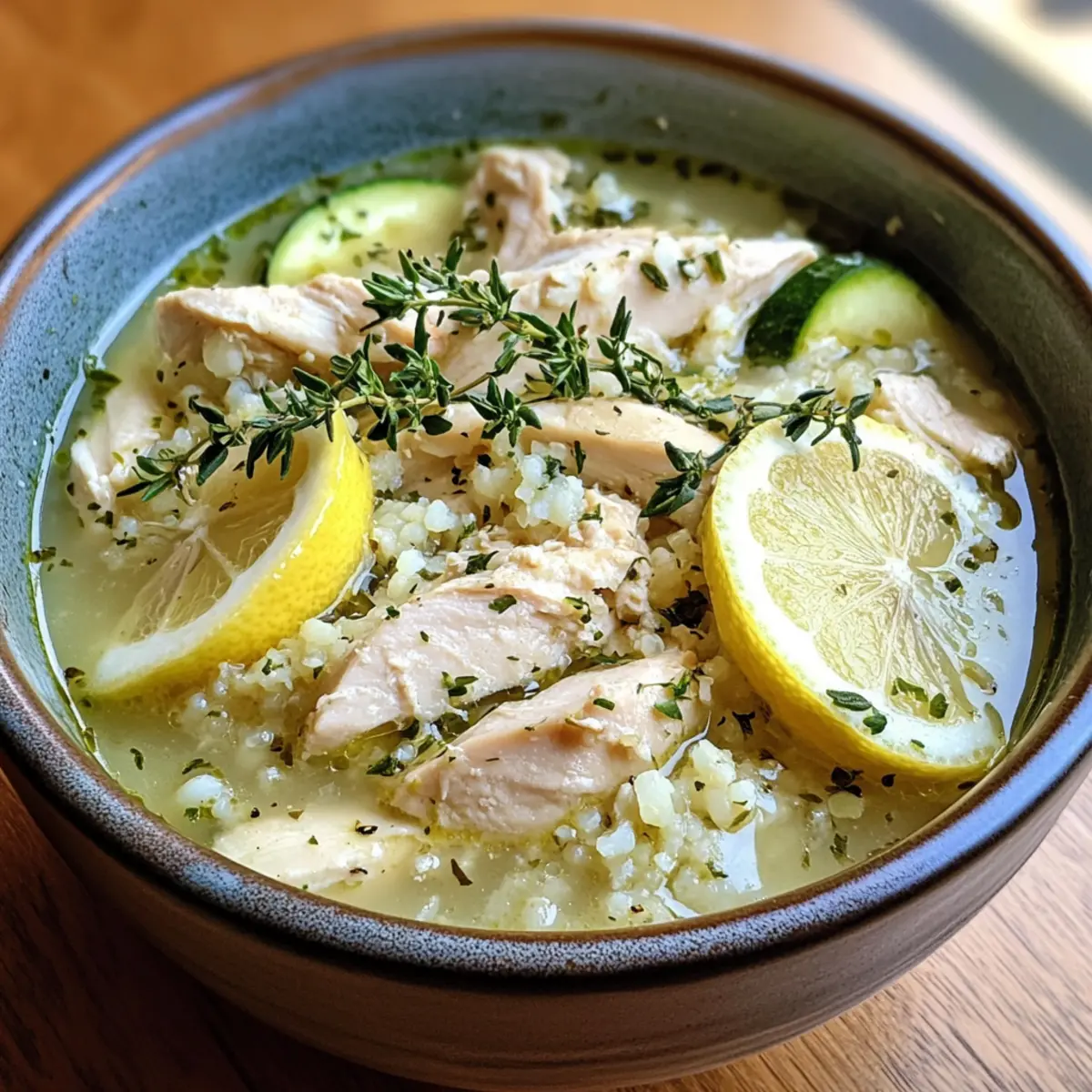Jump to Recipe Print RecipeAs the chilly air wraps around my home, I find warmth in a steaming bowl of Mediterranean Lemon Chicken Soup. This comforting dish combines tender chicken with vibrant vegetables, delivering a delightful balance of nutrition and flavor in every spoonful. What makes it even better? It’s a high-protein, quick-prep recipe that comes together in under 30 minutes, making it the perfect choice for busy weeknights when you crave something wholesome and satisfying. The refreshing zing of lemon paired with the earthiness of thyme creates a heavenly aroma that will draw everyone to the kitchen. Ready to savor a dish that’s both a cozy hug and a healthful choice? Let’s dive into this delightful recipe together! Why is Mediterranean Lemon Chicken Soup amazing? Quick preparation: This recipe is a lifesaver for busy evenings, ready in just 30 minutes! No more fast food night; enjoy healthy homemade goodness. High protein: With approximately 39g of protein per serving, it’s perfect for fitness enthusiasts or anyone wanting a nourishing meal. Vibrant flavor: Each spoonful is infused with the refreshing zing of lemon and the aromatic essence of thyme, making it a culinary delight. Versatile options: Easily customizable! Swap chicken for turkey or make it vegetarian by adding beans or lentils for a hearty twist. Crowd-pleaser: This comfort food is loved by all—from home cooks to families—guaranteeing satisfaction every time you serve it! For more quick and wholesome meals, check out my Chicken Lasagna Soup and Thai Chicken Salad with Peanut Dressing. Mediterranean Lemon Chicken Soup Ingredients For the Soup • Olive Oil – Provides healthy fats and richness; you can substitute with avocado oil for a different flavor profile. • Shallots – Adds a subtle sweetness and depth; onions can be used as an alternative if needed. • Garlic – Enhances flavor with a savory punch; fresh is preferable, but garlic powder can work in a pinch. • Salt – Enhances overall flavor; opt for sea salt or kosher salt based on your preference. • Zucchini (grated) – Contributes texture and a hint of sweetness; feel free to substitute with yellow squash if desired. • Thyme – Imparts an aromatic quality; fresh thyme is best, with dried thyme as a feasible backup (just use less). • Cooked Chicken (shredded or diced) – Central protein source; leftover rotisserie chicken works perfectly here. • Chicken Broth – The soup base that provides moisture; low-sodium chicken broth is recommended for better salt control. • Egg Yolks – Adds creaminess to the soup; these can be omitted for a dairy-free version or replaced with cream for richness. • Lemon Juice – Offers a bright, tangy flavor; freshly squeezed lemon juice is always preferable to bottled varieties. • Cauliflower Rice – Boosts nutrition while keeping it low-carb; you can use frozen or freshly made cauliflower rice. • Black Pepper – Adds a hint of spice; adjust to your desired taste. Optional Garnish • Lemon Wedges – Enhances the presentation and adds an extra citrus kick. • Thyme Leaves – For a fresh touch that complements the soup beautifully. Get ready to savor the delightful essence of this Mediterranean Lemon Chicken Soup as you gather these ingredients for a heartwarming experience! Step‑by‑Step Instructions for Mediterranean Lemon Chicken Soup Step 1: Heat the Base In a large pot, heat 2 tablespoons of olive oil over medium heat until shimmering. This should take about 1-2 minutes. Once hot, add 2 finely chopped shallots and 2 minced garlic cloves, stirring well. Sauté for approximately 1 minute until the shallots become translucent and fragrant, creating a lovely aromatic base for your Mediterranean Lemon Chicken Soup. Step 2: Add the Veggies Stir in 1 cup of grated zucchini, cooking for about 1 minute. This will soften the zucchini slightly and integrate it into your soup base. As it cooks, the zucchini’s sweetness will enhance the overall flavor. Once it’s tender, prepare to add your herbs and protein for a heartier texture. Step 3: Combine Chicken and Broth Next, add 1 teaspoon of fresh thyme, 2 cups of shredded or diced cooked chicken, and 4 cups of low-sodium chicken broth to the pot. Increase the heat and bring the mixture to a gentle boil, then reduce to a simmer. Cover the pot and let it cook for 10 minutes. During this time, the flavors will mingle and create a delightful depth in your Mediterranean Lemon Chicken Soup. Step 4: Temper the Eggs While the soup simmers, in a separate bowl, whisk together 2 egg yolks and the juice of 1 lemon until smooth. Carefully temper the egg mixture by slowly adding 1 cup of the hot broth from the soup while whisking continuously. This step is crucial to avoid scrambling the eggs and will add a creamy richness to your soup. Step 5: Mix Back into Soup Pour the tempered egg mixture back into the pot, stirring continuously to ensure a silky texture. Reduce the heat to low and allow the soup to warm through for an additional 2-3 minutes. This step enhances the creaminess while avoiding boiling, preserving the delicate balance in your Mediterranean Lemon Chicken Soup. Step 6: Finish with Cauliflower Rice Stir in 2 cups of cauliflower rice and remove the pot from the heat. Stirring gently, you’ll notice the rice absorbs some of the soup’s goodness, adding a lovely texture. This ingredient provides added nutrition while keeping the soup light and satisfying. Step 7: Season and Serve Add freshly cracked black pepper to taste and adjust seasoning if needed. Ladle the aromatic Mediterranean Lemon Chicken Soup into bowls and serve immediately, garnished with lemon wedges and fresh thyme leaves. The vibrant colors and fresh aromas will entice everyone to gather around your table! Mediterranean Lemon Chicken Soup Variations Feel free to let your creativity shine with these delightful variations that cater to different tastes and dietary needs! Tur