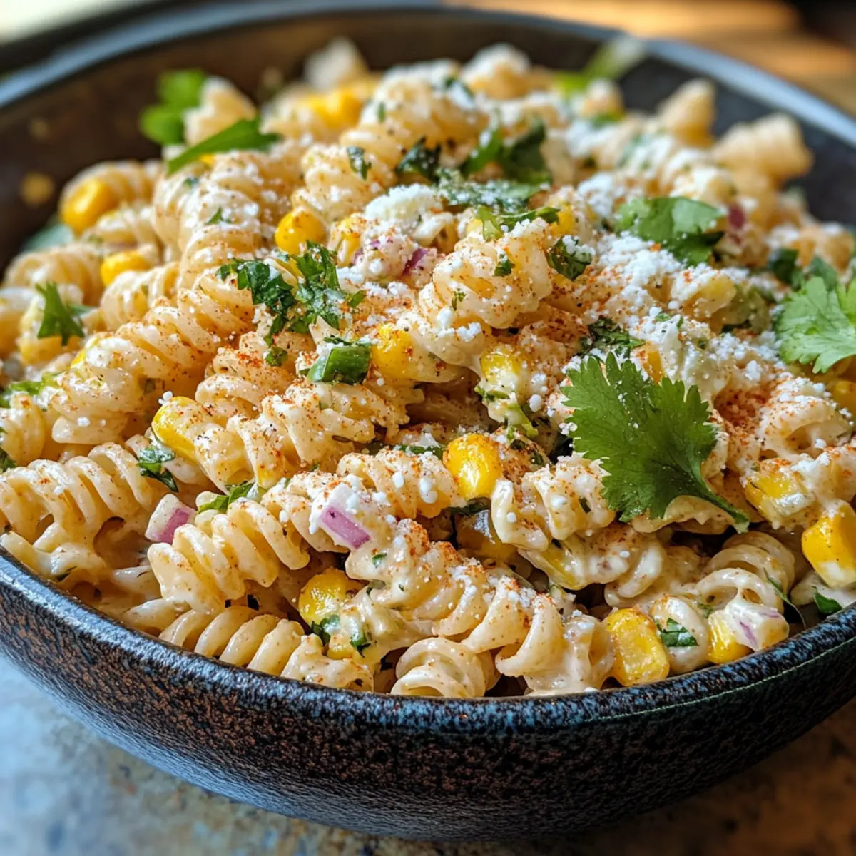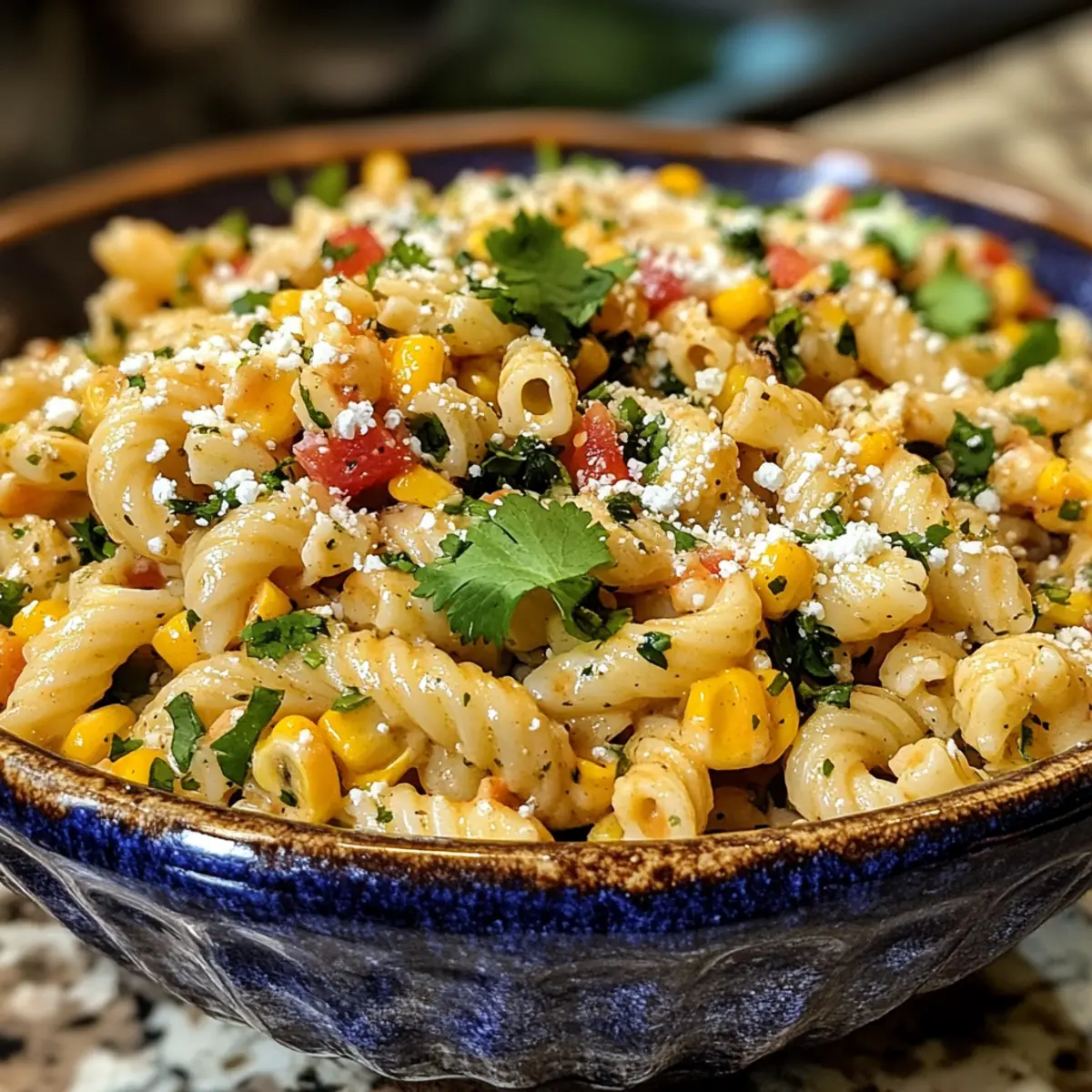 Jump to Recipe Print RecipeAs I stood in my kitchen, the sizzle of sweet corn hitting the pan filled the air with the promise of something special. This Perfect Mexican Street Corn Pasta Salad captures the essence of summer gatherings, marrying the smoky, creamy flavors of traditional elote with the comforting texture of pasta. Not only is this salad a vibrant addition to any meal, but it also shines with its quick prep time, making it the ultimate crowd-pleaser that both vegetarians and meat lovers can enjoy. You’ll appreciate the ease of customization, transforming leftovers into something new and exciting! Are you ready to discover how to turn your everyday pasta into a fiesta on your plate? Why is This Pasta Salad a Must-Try? Vibrant Flavors: This dish bursts with the smoky, creamy notes of traditional Mexican street corn, making every bite an explosion of taste. Quick Prep: Within minutes, you can whip up this delightful salad, perfect for those busy weeknights or unexpected guests. Versatile Ingredients: Easily adapt the recipe to fit your dietary needs—swap in vegan mayo and cheese for a plant-based twist! For more variations, consider adding black beans or other grilled veggies. Crowd-Pleasing Appeal: Its beautiful presentation and bold flavors make it a hit at potlucks, barbecues, or family dinners. Make-Ahead Option: Prepare it a day in advance! The flavors deepen and meld, providing a tastier dish ready when you are. Dive into this festive flavor journey and elevate your pasta game today! Mexican Street Corn Pasta Salad Ingredients • Dive into this vibrant dish with your essential ingredients! For the Pasta • Elbow Macaroni or Penne – Choose either for a comforting pasta texture that holds onto the dressing beautifully. For the Corn Mixture • Sweet Corn Kernels – Fresh (cut from the cob) delivers the best flavor, while frozen can be a convenient alternative year-round. • Jalapeño Pepper – Adds a delightful heat; simply omit for a milder flavor profile. • Butter – Enhances the corn’s flavor through charring; swap with olive oil for a vegan option. For the Dressing • Mayonnaise – Provides creaminess; substitute with vegan mayo for a dairy-free version. • Lime Juice – Infuses brightness and acidity; adjust to your taste preference. • Chili Powder & Smoked Paprika – These add depth and smokiness; vary the quantities for your desired spice level. For the Finish • Chopped Cilantro – Essential for freshness and a pop of color, bringing authenticity to your dish. • Cotija Cheese – Introduces a salty, creamy element; feta is a suitable alternative if needed. • Salt & Black Pepper – Vital for seasoning; taste to ensure a balanced flavor. Feel free to explore the delightful world of flavors in this Mexican Street Corn Pasta Salad! Step‑by‑Step Instructions for Mexican Street Corn Pasta Salad Step 1: Cook the Pasta Bring a large pot of salted water to a rolling boil over high heat. Add the elbow macaroni or penne, cooking it until al dente according to package instructions (usually about 8-10 minutes). Once cooked, drain the pasta in a colander and rinse it under cold water to halt the cooking process, setting it aside to cool while you prepare the other ingredients. Step 2: Prepare the Corn In a large skillet, melt 2 tablespoons of butter over medium heat. Add the sweet corn kernels and sauté for 8-10 minutes, stirring occasionally until they are lightly charred and golden. Once the corn is cooked, remove it from the heat and stir in chili powder, smoked paprika, and a pinch of salt for an extra flavor kick. Set aside to cool to room temperature. Step 3: Combine the Ingredients In a spacious mixing bowl, combine the cooled pasta, charred corn mixture, ½ cup of mayonnaise, the juice of one lime, chopped cilantro, crumbled cotija cheese, and diced jalapeño, if using. Gently toss everything together until well-coated, ensuring the creamy dressing envelops all the delicious elements of your Mexican Street Corn Pasta Salad. Step 4: Season and Chill Taste the mixture and season with additional salt and black pepper as needed, adjusting the flavors to suit your preference. Once seasoned, cover the bowl with plastic wrap or a lid and refrigerate the pasta salad for at least 30 minutes. This allows the flavors to meld beautifully, enhancing the overall taste. Step 5: Serve and Enjoy After chilling, give the Mexican Street Corn Pasta Salad a good stir before serving. It can be enjoyed straight from the fridge and is perfectly refreshing for warm days. For an extra touch, garnish with additional cotija cheese and cilantro on top for a vibrant presentation that delights both the eyes and the palate. Mexican Street Corn Pasta Salad Variations Feel free to get creative with this recipe and make it your own—each twist reveals new layers of flavor! Vegan Delight: Substitute mayonnaise and cotija cheese with vegan mayo and nutritional yeast for a fully plant-based option bursting with taste. Grilled Veggies: Swap the corn for a mix of your favorite grilled vegetables like zucchini or bell peppers, enhancing the smoky flavor. Creamy Avocado: Add diced avocado for a rich, creamy texture that pairs perfectly with the other ingredients. Choose ripe fruit for the best results! Protein Boost: Include canned black beans for an extra protein kick, making the salad heartier and even more fulfilling. Citrus Zing: Mix in some diced oranges or a splash of orange juice for a refreshing citrus twist that brightens the overall flavor. Herb Infusion: Experiment with different herbs like parsley or basil instead of cilantro for a uniquely aromatic experience. Each herb brings its charm! Heat It Up: For spice lovers, toss in diced serrano peppers or a sprinkle of cayenne pepper to ignite your taste buds. Cheesy Options: Swap cotija for fresh mozzarella or goat cheese for a different creamy flavor profile that adds its own delicious character. Looking to explore mor