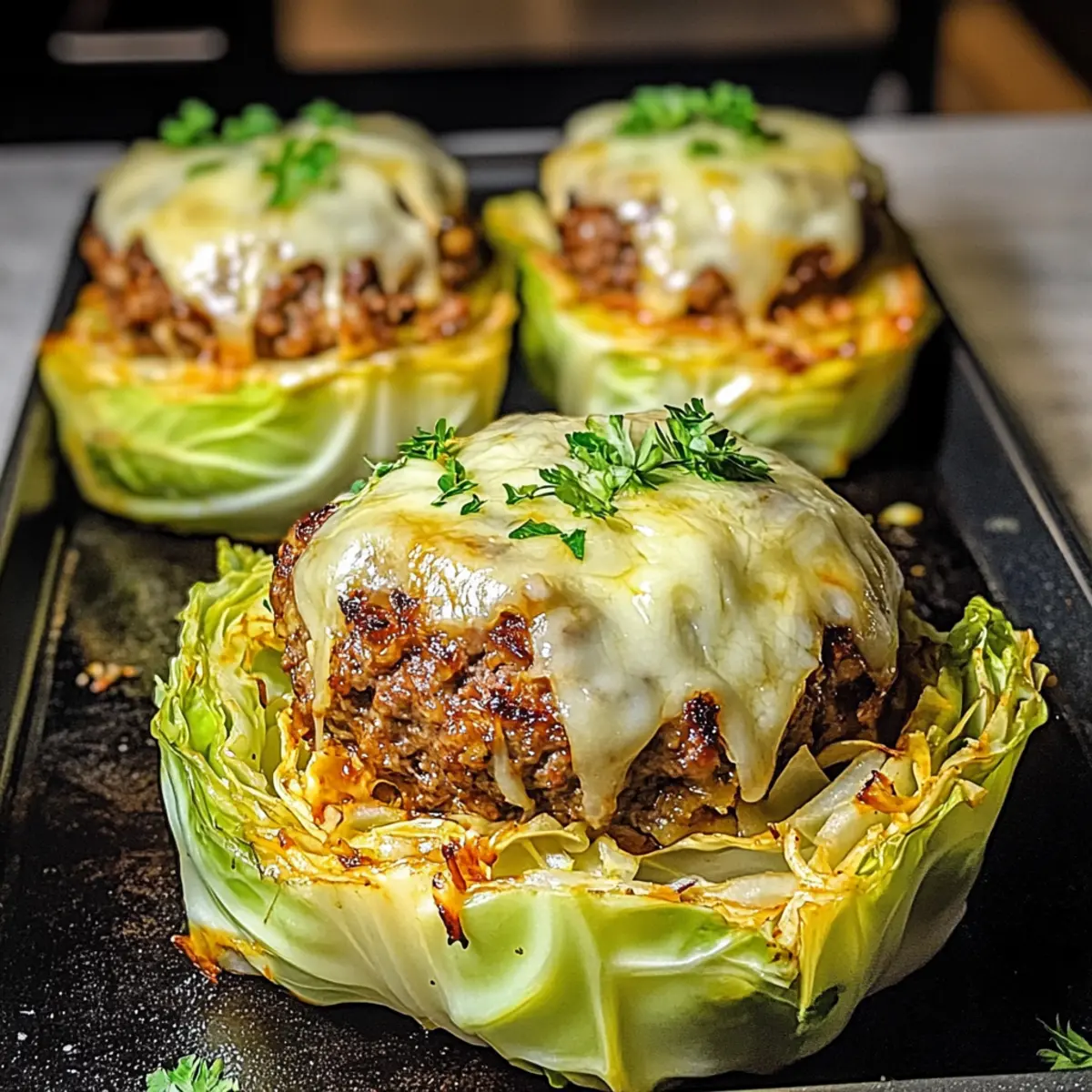 Jump to Recipe Print RecipeAs I stood in the kitchen, a delightful aroma wafted through the air, transporting me back to my childhood dinners filled with laughter and warmth. Those memories inspired my creation of Oven-Baked Cabbage Burgers—a delicious low-carb alternative that not only satisfies hunger but also fits seamlessly into any health-conscious meal plan. With juicy, seasoned meat nestled between crisp cabbage “buns,” this quick recipe makes for a fantastic weeknight dinner or a fresh lunch option. Plus, it’s a brilliant way to catch the attention of family and friends with something unexpected and mouthwatering. Are you ready to whip up something that transforms the traditional burger experience? Let’s dive into this healthier twist on a classic! Why Choose Oven-Baked Cabbage Burgers? Unique Twist: Say goodbye to traditional buns—these cabbage burgers offer a crunchy, vibrant alternative that’s sure to surprise! Healthy Choice: Each bite is low-carb and packed with flavor, making them perfect for health-conscious diners. Simple Preparation: With just a few steps, you’ll have a delicious meal ready to go, making weeknight dinners a breeze! Versatile Flavors: Whether you prefer ground beef, turkey, or a plant-based option, you can easily customize the recipe to suit your tastes. Impressive Presentation: Garnish these burgers with fresh herbs and your favorite dipping sauces to create a stunning dish that will wow your guests. Pair them with a light salad or even these White Cheddar Burgers for a complete meal experience. Enjoy! Oven-Baked Cabbage Burgers Ingredients For the Burgers Ground Beef or Turkey – Provides the main protein; feel free to substitute with chicken or vegetarian alternatives for a lighter option. Cabbage – Acts as the “burger bun,” offering a satisfying crunch; a small head will yield the best thickness for slicing. Onion – Enhances the flavor with natural sweetness; shallots can be used for a milder taste if preferred. Garlic – Infuses a savory depth; minced garlic or garlic powder works wonderfully as substitutes. Salt & Black Pepper – Crucial for seasoning; adjust to suit your personal taste preferences. Smoked Paprika – Adds a delicious smoky element; regular paprika is a suitable alternative for a lighter flavor. Worcestershire Sauce – Contributes rich umami flavor; soy sauce can be used for a different flavor dynamic. Egg (optional) – Binds the meat mixture together; omit for a lower-carb variation or replace with flaxseed meal for a vegan option. For Brushing Olive Oil – Helps achieve golden browning on the cabbage; melted butter or avocado oil can be excellent substitutes. These Oven-Baked Cabbage Burgers promise a delightful twist on your traditional burger experience, making them a healthy and flavorful choice for any meal! Step‑by‑Step Instructions for Oven-Baked Cabbage Burgers Step 1: Preheat the Oven Begin by preheating your oven to 375°F (190°C). This temperature is ideal for achieving crispy cabbage while ensuring the meat cooks thoroughly. While the oven warms up, gather your ingredients and equipment, making sure you have a baking sheet lined with parchment paper or aluminum foil ready for the cabbage burgers. Step 2: Prepare the Cabbage Carefully slice a small head of cabbage into thick slices, about ½ inch wide. You want enough thickness to hold the meat without falling apart. Brush both sides of these cabbage slices with olive oil until lightly coated; this will help them brown beautifully in the oven, enhancing their crunch as part of your delicious Oven-Baked Cabbage Burgers. Step 3: Mix the Burger Filling In a large mixing bowl, combine your choice of ground beef or turkey with finely chopped onion, minced garlic, salt, black pepper, smoked paprika, Worcestershire sauce, and the egg (if using). Mix everything together with your hands or a spoon until well blended. This will create a flavorful filling that complements the crunch of the cabbage in your burgers. Step 4: Shape the Burgers Take a handful of the meat mixture and press it down onto each cabbage slice, forming rustic patties. Ensure that the meat covers most of the cabbage, creating a hearty burger structure. Repeat this process until all the cabbage slices are topped with the meat mixture, ready to be baked into tasty Oven-Baked Cabbage Burgers. Step 5: Bake the Burgers Place your prepared cabbage burgers onto the lined baking sheet, ensuring they have a little space between them. Bake in the preheated oven for about 25 minutes. You’ll know they are done when the meat reaches an internal temperature of 160°F (71°C) and the cabbage is slightly golden and crispy on the edges. Step 6: Broil with Cheese After baking, remove the cabbage burgers from the oven and sprinkle some cheese on top of each burger. Return the tray to the oven and broil for an additional 3-5 minutes, or until the cheese is melted and bubbly with a golden finish. This adds a delightful cheesy layer to your already delicious Oven-Baked Cabbage Burgers. Step 7: Serve and Garnish Once done, take the baking sheet out of the oven and let the cabbage burgers cool for a few minutes. Garnish them with freshly chopped parsley and serve with your favorite dipping sauces. These healthy burgers are ready to impress both family and friends with their wonderful flavors and textures! Variations & Substitutions for Oven-Baked Cabbage Burgers Get ready to personalize your Oven-Baked Cabbage Burgers with these creative twists and simple swaps that will excite your taste buds! Ground Turkey: Swap ground beef for lean ground turkey for a lighter option, bringing a different flavor while keeping it healthy. Enjoy the same savory taste with fewer calories! Chicken Alternative: Use ground chicken for a tender, juicy burger that’s still full of flavor. Perfect for those who love poultry—this variation feels like a comforting hug on your plate. Veggie Delight: Opt for a plant-based 