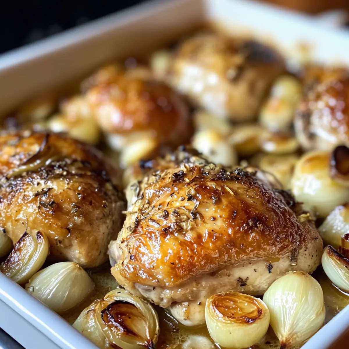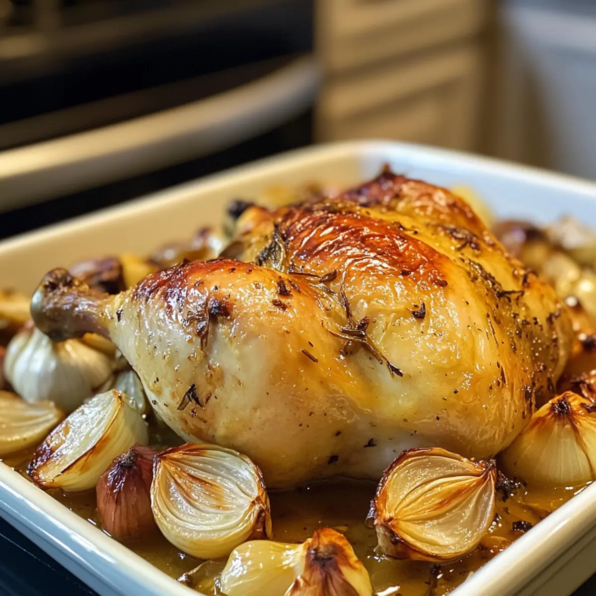 Jump to Recipe Print RecipeThe aroma of roasted garlic brings back memories of family gatherings, where laughter fills the air and delicious dishes take center stage. My Easy Oven-Roasted French Garlic Chicken is the perfect way to recreate those moments. With tender, juicy chicken infused with garlic, shallots, and fragrant herbs, this recipe transforms a simple weeknight dinner into a gourmet experience. It’s a crowd-pleaser that not only promises crispy skin but also lets you focus on what matters most—sharing quality time with your loved ones around the table. Plus, it’s quick to whip up, giving you the freedom to enjoy a cozy evening rather than stressing over dinner. So, are you ready to elevate your chicken game and impress your family? Let’s dive in! Why Is This Chicken Recipe So Irresistible? Simplicity at its finest: This Easy Oven-Roasted French Garlic Chicken comes together effortlessly, making it perfect for busy weeknights or leisurely weekends. Rich, Bold Flavor: The combination of roasted garlic, shallots, and herbs creates a depth of flavor that will impress even the pickiest eaters. Family-Friendly: Designed to please everyone, from kids to adults, this dish brings everyone to the table for a delightful shared meal. Versatile Pairings: Serve it alongside mashed potatoes, roasted veggies, or a fresh salad for a complete dinner experience. You can even explore other recipes like French Apple Cider chicken for variety! Make-Ahead Friendly: Prepare the chicken in advance and refrigerate until you’re ready to roast, streamlining your cooking process. This recipe not only promises delicious results but also allows you to savor those precious moments with family without the fuss! Oven-Roasted French Garlic Chicken Ingredients For the Chicken • 2 1/2 to 3 lbs bone-in, skin-on chicken – This is the star of the dish, giving rich flavor and moisture. Substitute boneless chicken for a quicker meal, but adjust cooking times. For the Oil & Seasoning • 1/4 cup avocado or olive oil – Adds richness and helps achieve crispy skin. Vegetable oil works as a substitute if needed. • Sea salt & ground black pepper – Essential for enhancing the dish’s overall flavor, adjust to your taste. For the Aromatics • 3 medium shallots, thinly sliced – They bring a sweet and subtle onion flavor; sweet onions can be used if shallots are unavailable. • 20 to 25 garlic cloves, whole – These impart deep garlic flavor; reduce the amount for a milder taste. For the Herbs • Small bunch fresh thyme – Provides a fresh herb flavor; substitute with 1 tsp dried thyme if fresh is not available. • 3 to 4 sprigs fresh rosemary – Adds aromatic depth; can be omitted if you’re out. For Moisture & Flavor • 1/2 cup chicken broth – Keeps the chicken moist, with the option to use vegetable broth for a non-meat choice. • 1/2 cup white wine (Chardonnay or Pinot Grigio) – Elevates the dish’s flavor; for a non-alcoholic option, mix lemon juice with broth. This Oven-Roasted French Garlic Chicken is your ticket to a mouthwatering family dinner that will have everyone coming back for seconds! Step‑by‑Step Instructions for Oven-Roasted French Garlic Chicken Step 1: Preheat Your Oven Begin by preheating your oven to 400°F (204°C). This ensures that your Oven-Roasted French Garlic Chicken cooks evenly and achieves that delightful crispy skin. While the oven heats up, you can prepare your casserole dish and the chicken, saving time for later. Step 2: Prepare Casserole Dish Line a large casserole dish with Reynolds Wrap® Heavy Duty Foil for easy cleanup. This will prevent the chicken from sticking and allow for a hassle-free cooking experience. Ensure the foil is secured in place, creating a neat base for layering all your delicious ingredients. Step 3: Layer Ingredients Spread the thinly sliced shallots evenly across the bottom of the prepared dish. Next, add half of the whole garlic cloves on top, followed by a sprinkle of fresh thyme and rosemary. These aromatics will infuse the chicken with delightful flavors as it bakes, enhancing the overall taste of your Oven-Roasted French Garlic Chicken. Step 4: Season Chicken Place the bone-in, skin-on chicken on top of the layered shallots and garlic. Drizzle with avocado or olive oil, ensuring each piece is coated to promote crispy skin. Generously season with sea salt and ground black pepper, allowing the flavors to penetrate the chicken and elevate your dish. Step 5: Add Remaining Ingredients Sprinkle the remaining garlic cloves and thyme over the chicken, adding an extra layer of flavor. Pour chicken broth and white wine around the edges of the dish, ensuring moisture is retained during baking. This will keep your Oven-Roasted French Garlic Chicken juicy and add a rich depth to the sauce. Step 6: Roast Chicken Carefully place the casserole dish in the preheated oven and roast uncovered for 1 hour. The chicken skin should turn golden and crispy, reaching an internal temperature of 165°F (74°C) for safety. If you desire even crispier skin, broil the chicken for an additional 5-7 minutes to achieve that perfect finish. Step 7: Serve and Enjoy Once roasted to perfection, remove the chicken from the oven and let it rest for a few minutes. Spoon the pan sauce over the chicken and serve with your favorite side dishes. This Oven-Roasted French Garlic Chicken is now ready to bring joy to your family dinner table! Expert Tips for Oven-Roasted French Garlic Chicken Quality Ingredients: Use fresh herbs and high-quality chicken. This enhances the flavors and ensures your oven-roasted French garlic chicken is truly delicious. Mind the Temperature: Always check the internal temperature of the chicken. It should reach 165°F (74°C) to ensure it’s safe and juicy without being overcooked. Crispy Skin Secret: For that irresistible crispy skin, drizzle enough oil and consider broiling for the last few minutes of cooking. Just keep an eye on it! F