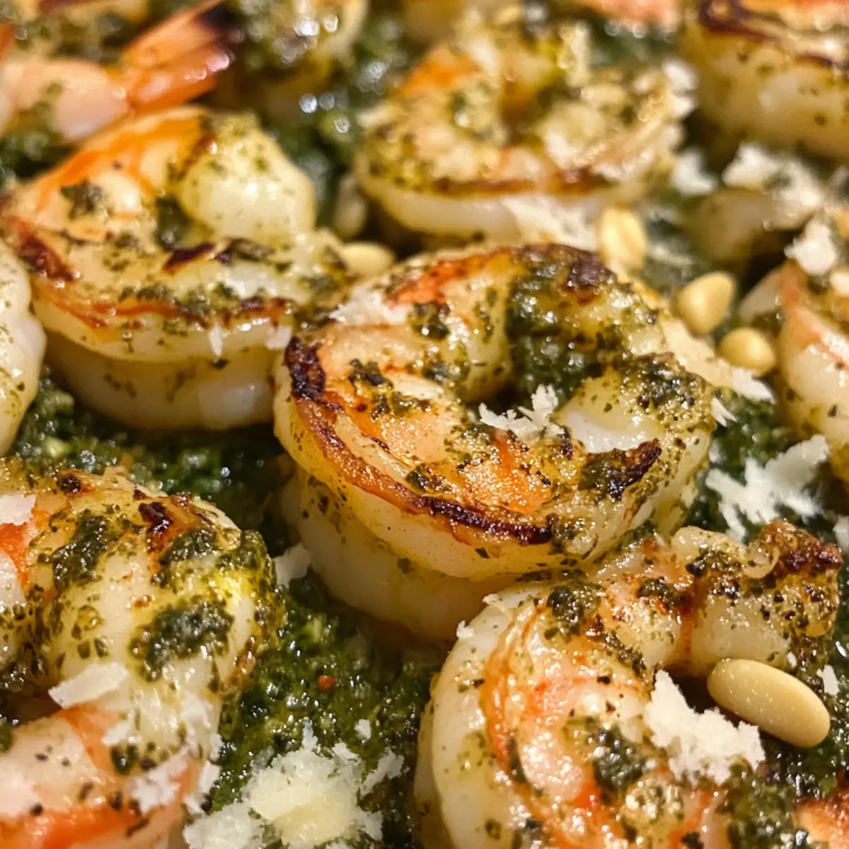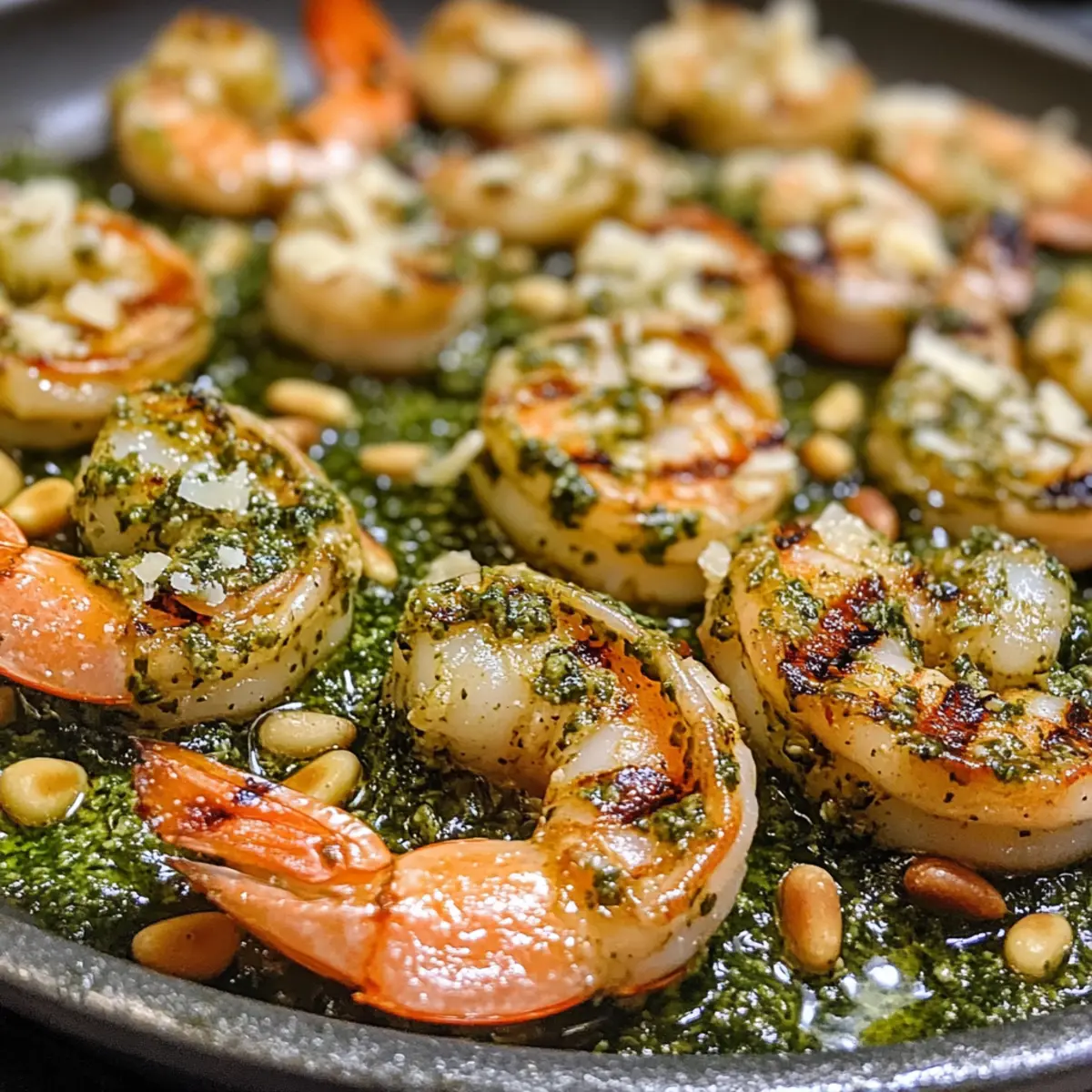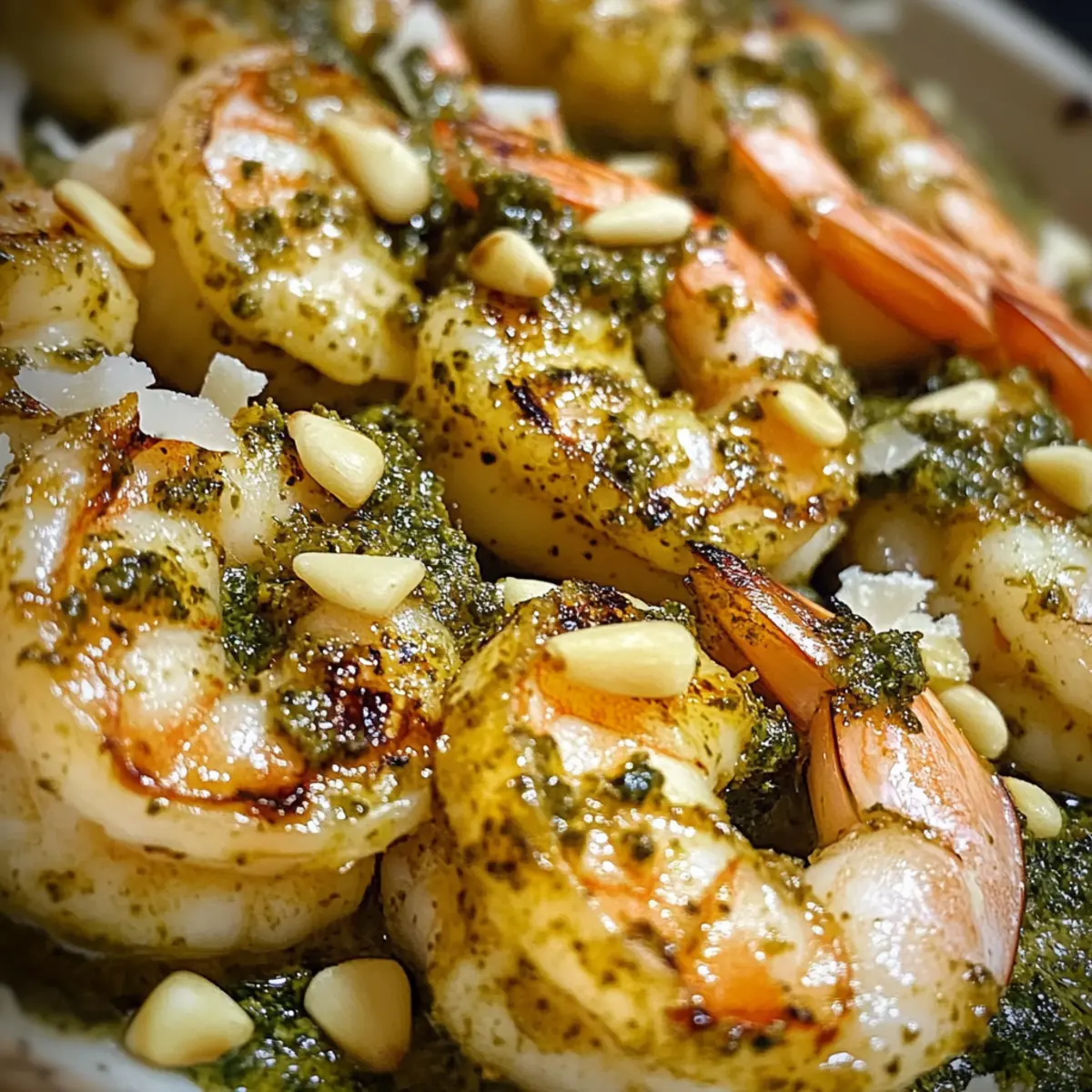 Jump to Recipe Print RecipeThe sizzling sound of shrimp hitting the grill is one of those joyful moments that always brings me back to sunny afternoons spent cooking outdoors. Today, I’m excited to share my recipe for Pesto Grilled Shrimp, a dish that perfectly combines the rich, herbaceous flavors of basil pesto with tender, succulent shrimp. Not only is this recipe a breeze to prepare, making it an effortless choice for busy weeknights, but it’s also a guaranteed crowd-pleaser at any gathering. The vibrant colors and enticing aroma promise a Mediterranean escape with every bite. Ready to elevate your grilling game and impress your family or friends? Let’s dive into this delightful recipe! Why Pesto Grilled Shrimp is Irresistible? Simplicity and Ease: With minimal prep time and just a few ingredients, this recipe is perfect for busy weeknights or last-minute gatherings. Bursting with Flavor: The vibrant basil pesto infuses every bite, offering a fresh and herbaceous punch that will have your taste buds dancing. Perfectly Cooked Shrimp: Grill until they are just pink and opaque, delivering juicy, tender morsels that are hard to resist. Serve it Your Way: Whether as a standalone dish or paired with a refreshing salad or a side of quinoa, the options are endless. Looking for more seafood inspiration? Check out our Spicy Calabrian Shrimp or Parmesan Baked Shrimp. Crowd-Pleasing Appeal: This dish is guaranteed to impress friends and family, making it a staple at summer barbecues and cozy dinners alike. Pesto Grilled Shrimp Ingredients For the Shrimp • Shrimp – Fresh shrimp is the star of the dish; thawed frozen shrimp works too but will require slightly longer cooking times. For the Pesto • Basil Pesto – This vibrant paste is the key flavor; feel free to use homemade or store-bought for convenience. • Toasted Pine Nuts – These add a satisfying crunch; you can also use walnuts if you prefer. • Grated Parmesan Cheese – A sprinkle of this rich cheese enhances the umami flavor, but can be left out for a lighter dish. For Grilling • Olive Oil – Use it to lightly coat the shrimp and prevent sticking on the grill; feel free to choose flavored oils for added depth. Each bite of your Pesto Grilled Shrimp will be a delightful journey through Mediterranean flavors—perfect for impressing guests! Step‑by‑Step Instructions for Pesto Grilled Shrimp Step 1: Prepare the Shrimp Start by cleaning and deveining the shrimp if necessary. Rinse them under cold water, then pat them dry with a paper towel. This is crucial, as excess moisture can prevent a good sear. Once prepped, place the shrimp in a large mixing bowl, ready to absorb the robust flavors of the basil pesto. Step 2: Mix with Pesto In the same mixing bowl, add the basil pesto, ensuring every piece of shrimp is coated generously. Toss in optional ingredients like toasted pine nuts and grated Parmesan cheese for enhanced flavor and texture. Let this mixture sit for about 15 minutes, allowing the shrimp to marinate and soak in those delicious Mediterranean flavors while you prepare the grill. Step 3: Preheat the Grill As the shrimp marinates, preheat your grill to medium-high heat, around 400°F (200°C). Clean and oil the grates to prevent sticking—this is essential for achieving those beautiful grill marks. Use a paper towel dipped in olive oil held with tongs to wipe the grill grates. When ready, you should feel a warm heat radiating from the cooking surface. Step 4: Grill the Shrimp Carefully place the marinated shrimp on the hot grill in a single layer. Grill them for 2-3 minutes on each side, or until they turn pink and opaque. Look for that enticing char and visible grill marks for the best results. Be mindful not to overcook; shrimp can become tough when grilled too long, so keep a close eye on them! Step 5: Serve Immediately Once cooked to perfection, remove the shrimp from the grill. They should glisten with the fragrant pesto and have a smoky aroma. Serve the succulent Pesto Grilled Shrimp immediately while hot, alongside a fresh salad or vegetables for a complete Mediterranean experience. Get ready to impress everyone with your flavorful creation! Make Ahead Options These Pesto Grilled Shrimp are perfect for meal prep enthusiasts looking to save time! You can marinate the shrimp in basil pesto for up to 24 hours in advance, which enhances the flavor and makes for a quick grill session later. Simply clean and devein the shrimp, then toss them with the pesto and any optional ingredients like pine nuts and Parmesan cheese, and refrigerate. When you’re ready to serve, just preheat your grill and cook the shrimp for 2-3 minutes per side until pink and opaque. This method ensures your Pesto Grilled Shrimp will be just as delicious as if they were made fresh on the spot, making your busy weeknights a breeze! What to Serve with Pesto Grilled Shrimp Transform your summer meal into a Mediterranean feast with delightful pairings that enhance every bite of succulent shrimp. Creamy Risotto: The rich, creamy texture of risotto provides a comforting base that perfectly complements the vibrant flavors of the grilled shrimp. A sprinkle of fresh herbs on top will elevate this dish further. Garlic Herb Quinoa: This light and nutty side is a fantastic way to soak up the delicious juices from the shrimp. Its fluffy texture contrasts beautifully with the tender shrimp, creating a satisfying meal. Mediterranean Salad: Crisp greens, cucumbers, and cherry tomatoes tossed in a tangy vinaigrette will refresh and balance the rich flavors of the pesto shrimp. Add some feta cheese for an extra burst of flavor. Grilled Vegetable Skewers: Colorful veggies like bell peppers, zucchini, and red onion, grilled to perfection, add both visual appeal and a smoky flavor that beautifully complements the shrimp. Herbed Couscous: Fluffy couscous mixed with fresh herbs adds a nutty flavor that pairs well with the basil pesto, making it an easy and el