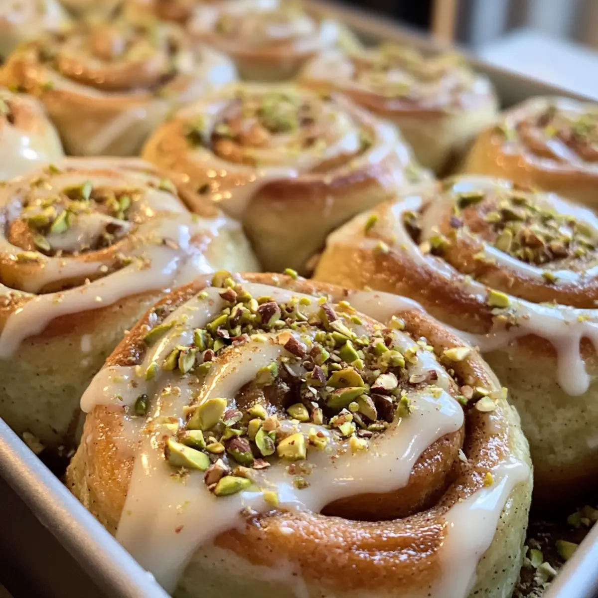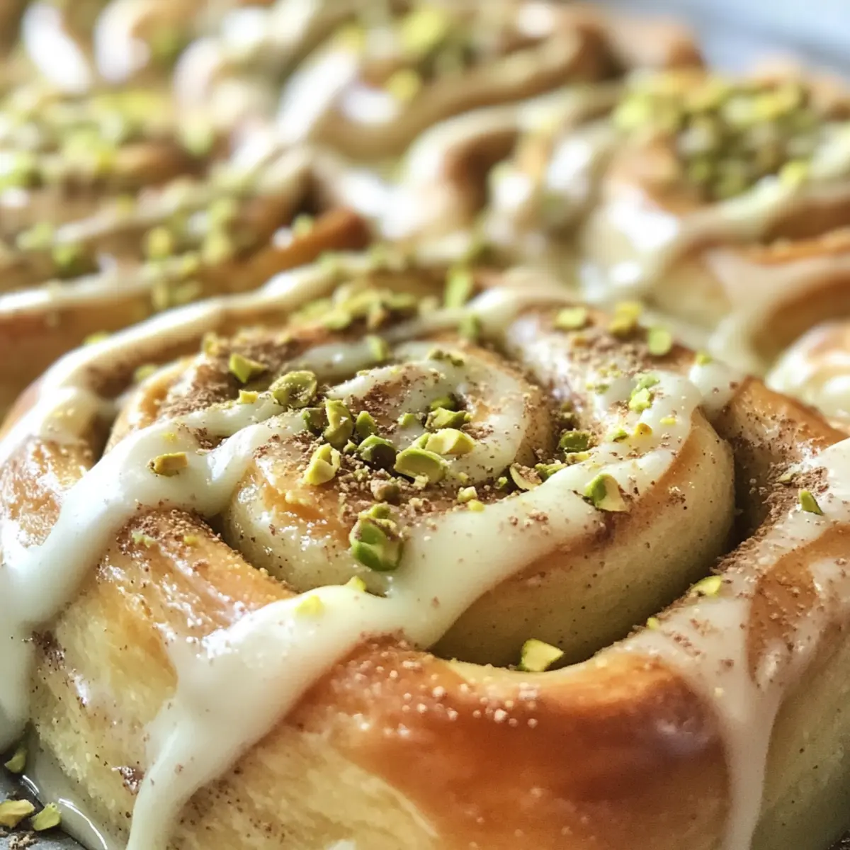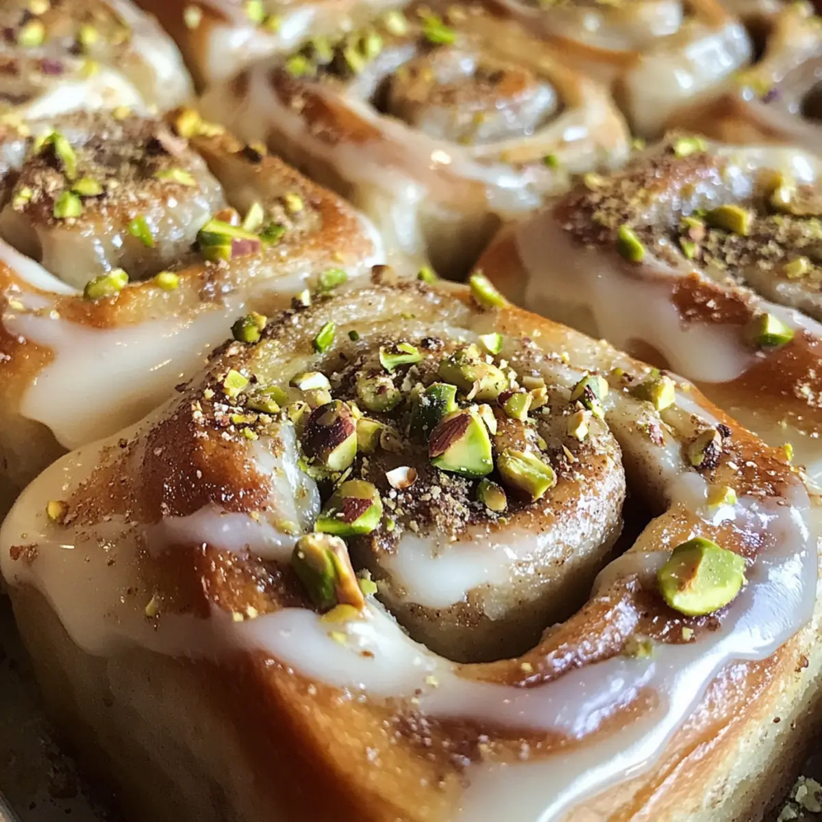 Jump to Recipe Print RecipeAs the sweet aroma of cinnamon dances through the kitchen, I can’t help but feel a wave of nostalgia wash over me. These Small Batch Pistachio Cream Cinnamon Rolls are not just a treat; they’re a warm hug for the soul. With a fluffy, tender texture and a creamy pistachio filling, each bite offers a delightful balance of flavors that elevate the everyday breakfast or snack. Plus, this small batch recipe means you get all the indulgence without the worry of wasting leftovers—perfect for those cozy mornings or spontaneous afternoon cravings. And for those with dietary preferences, rest assured, these rolls can easily adapt to be gluten-free or vegan. What adventures will you embark on with this delicious twist on a classic? Why Is This Recipe a Game Changer? Small Batch Convenience: Perfect for when you want just enough deliciousness without the excess. Unique Flavor Fusion: The combination of warm cinnamon and rich pistachio creates a taste sensation like no other—truly a standout! Versatile Options: Easily modify to be gluten-free or vegan, ensuring everyone can enjoy these delightful rolls. Memorable Textures: Enjoy the contrast of fluffy dough filled with creamy pistachio goodness, topped with luscious icing for a full sensory experience. Quick and Easy: With simple ingredients and straightforward steps, you’ll be indulging in these mouthwatering rolls in no time! Pair them with your favorite beverage, or check out my Pumpkin Spice Gooey cake for another scrumptious treat. Pistachio Cream Cinnamon Roll Ingredients For the Dough Whole Milk – Provides moisture and activates yeast; use non-dairy alternatives for vegan options. Yeast – Essential for dough rise; always check expiration to ensure it’s active. Egg – Contributes to structure; substitute with a flax egg for vegan needs. Butter – Adds richness to the dough; can be replaced with margarine for dairy-free. All-Purpose Flour – Provides structure; swap with gluten-free flour blends for a gluten-sensitive option. Sugar – Sweetens the dough; brown sugar adds a deeper flavor. Salt – Enhances overall flavor; important for balancing the sweetness. For the Filling Pistachio Butter – The star ingredient, imparts nutty flavor and creaminess in each roll. Brown Sugar – Enhances the filling with caramel notes; add for extra sweetness. Ground Cinnamon – Adds warmth and spice; consider using Vietnamese cinnamon for a bolder flavor. For the Icing Cream Cheese – Creates a luscious icing; substitute with mascarpone or non-dairy cream cheese for vegan. Powdered Sugar – Sweetens the icing; you can use coconut powdered sugar to keep it vegan. Vanilla Extract – Adds a lovely flavor to the icing; opt for pure vanilla for the best taste. Heavy Cream – Gives the icing a nice creaminess; non-dairy cream can work for vegan options. Step‑by‑Step Instructions for Pistachio Cream Cinnamon Rolls Step 1: Make the Dough Start by warming 1/2 cup of whole milk in a saucepan until just warm to the touch, around 110°F (43°C). Remove from heat, sprinkle 2 teaspoons of active dry yeast over the milk, and let it bloom for about 5 minutes until frothy. In a mixing bowl, combine the yeast mixture with 1 beaten egg and 2 tablespoons of softened butter. Gradually mix in 2 cups of all-purpose flour, 1/4 cup of sugar, and a pinch of salt until a sticky dough forms. Step 2: First Rise Transfer the sticky dough into a lightly oiled bowl, covering it with a damp cloth or plastic wrap. Allow it to rise in a warm, draft-free area for approximately 1 hour, or until it has doubled in size. You want it to be pillowy and slightly sticky to the touch—this indicates a successful first rise! Step 3: Prepare the Filling While the dough rises, prepare the pistachio cream filling. In a mixing bowl, blend together 1/2 cup of pistachio butter, 1/4 cup of brown sugar, and 1 tablespoon of ground cinnamon until smooth and creamy. If desired, fold in a handful of chopped pistachios for added texture. Set this filling aside to ensure it’s ready when the dough has finished rising. Step 4: Shape the Rolls Once the dough has risen beautifully, transfer it to a floured surface. Roll the dough into a rectangle, approximately 10×8 inches. Spread the pistachio filling evenly over the dough, leaving a small border around the edges. Carefully roll the dough tightly from one long end to the other, creating a log. Use a sharp knife to slice the log into 4-6 even pieces and place them in a greased baking dish. Step 5: Second Rise Cover the sliced rolls with a clean kitchen towel and allow them to rise again in a warm location for 30-45 minutes, until they appear puffy and have expanded. This step is crucial to achieving fluffy Pistachio Cream Cinnamon Rolls, so be patient and let them rise properly. Step 6: Bake Preheat your oven to 350°F (175°C) while the rolls are finishing their second rise. Bake the rolls for 23-30 minutes, or until they are golden brown and the tops are slightly firm to the touch. The aroma of cinnamon and pistachio will fill your kitchen as they bake—a delightful treat is on its way! Step 7: Make Icing As the rolls cool slightly, prepare the icing. In a mixing bowl, beat together 4 ounces of cream cheese, 1 cup of powdered sugar, 1 teaspoon of vanilla extract, and 2 tablespoons of heavy cream until smooth and creamy. This icing will bring an extra layer of indulgence to your Pistachio Cream Cinnamon Rolls. Step 8: Ice & Serve Once the rolls have cooled a bit, generously spread the icing over the warm rolls. For an added touch, sprinkle some chopped pistachios on top. These delightful small batch Pistachio Cream Cinnamon Rolls are now ready to be savored, offering a luscious combination of flavors that you won’t soon forget! What to Serve with Small Batch Pistachio Cream Cinnamon Rolls These delightful rolls can transform a simple breakfast into a cozy feast full of flavor and comfort. Rich Coffee: A smoot