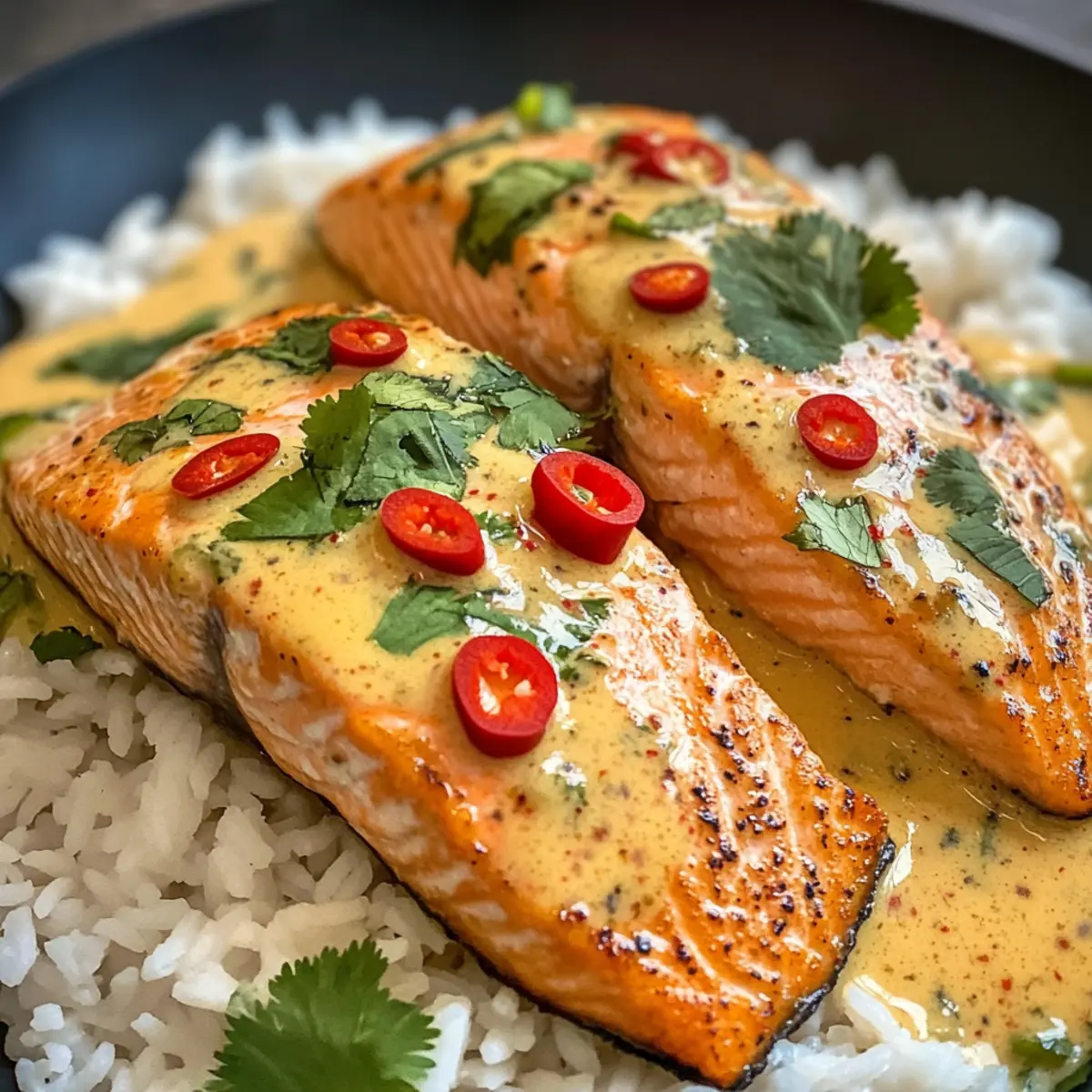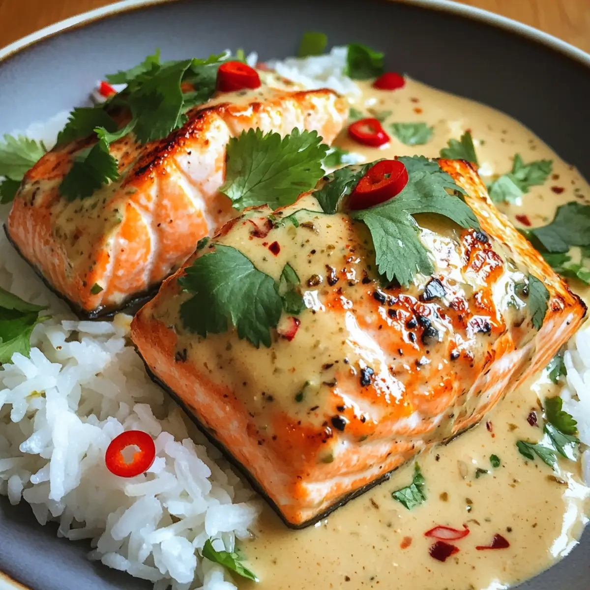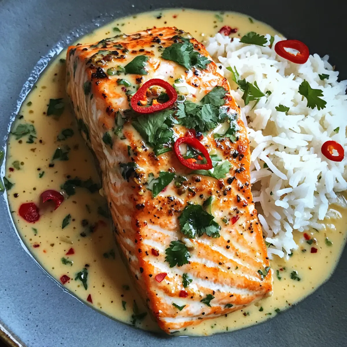 Jump to Recipe Print RecipeThe tantalizing scent of garlic and ginger wafts through the kitchen, sparking a culinary adventure that promises to turn dinner into a delightful experience. I’m eager to share my recipe for Poached Salmon in Coconut Lime Sauce, a creation that embodies the vibrant flavors of Southeast Asia, all while being quick and easy enough for any busy weeknight. In just 20 minutes, you’ll be indulging in succulent salmon bathed in a creamy coconut sauce enriched with fresh lime and aromatic herbs. This dish not only impresses with its bright flavors but also packs a healthy punch, thanks to its Omega-3 richness. Perfect for those looking to swap out takeout for a homemade masterpiece, my poached salmon will enchant your taste buds and leave your dinner guests asking for more. Curious to learn how to bring this vibrant dish to your table? Let’s dive in! Why is this salmon dish a must-try? Quick & Easy: This recipe simplifies cooking with an effortless 20-minute prep time, making it perfect for busy weeknights. Exquisite Flavors: The combination of coconut milk, lime, and fresh herbs creates a vibrant, aromatic sauce that elevates your salmon to restaurant-quality. Nutritious Delight: Packed with Omega-3 fatty acids, this dish not only tastes great but also boosts your health—an excellent choice for those seeking a wholesome meal. Versatile Options: Swap salmon for shrimp or chicken as you like, ensuring everyone at the table finds something to love. Crowd-Pleasing Appeal: Serve over fluffy rice or vermicelli noodles—it’s a meal guaranteed to impress your family or guests, just like our Chicken Kofta Sauce or Cheesy Baked Sauce. Poached Salmon in Coconut Lime Sauce Ingredients For the Salmon • Salmon Fillets – Main protein; provides Omega-3 fatty acids. Preferably skinless for better sauce absorption. • Salt and Pepper – Essential seasoning to enhance natural flavors. • Oil – Used for searing the salmon; contributes to a golden browning. For the Sauce • Garlic (2 cloves) – Adds depth with its aromatic essence. • Ginger (2 tsp) – Infuses warmth and a slight spice, enhancing the coconut flavor. • Lemongrass (1 stalk) – Provides a citrusy fragrance; substitutable with lemongrass paste (1 tbsp). • Brown Sugar (1 tbsp) – Balances the sauce flavors and aids in caramelization. • Chilli Garlic Paste (1 tsp) – Adds heat; can replace with Sriracha or other chili sauces for desired spice level. • Coconut Milk (400 g/14 oz) – Creamy base providing richness; low-fat option available but may lack flavor. • Fish Sauce (1 tbsp) – Enhances umami; substitute with soy sauce for a gluten-free option. • Lime Zest (2 tsp) & Lime Juice – Adds necessary acidity and brightness to elevate the dish. For Garnish • Fresh Coriander/Cilantro – Gives a fresh flavor and visual appeal. • Red Chillies – Optional; for an extra kick and vibrant color. For Serving • Vermicelli Noodles or Steamed Rice – Base for serving; can swap with other preferred grains or noodles. Step‑by‑Step Instructions for Poached Salmon in Coconut Lime Sauce Step 1: Prepare Salmon Season your salmon fillets generously with salt and pepper on both sides. Heat 1 tablespoon of oil in a skillet over medium-high heat until shimmering. Sear the salmon fillets for about 1.5 minutes on one side until golden, then carefully flip them and sear for an additional minute. The center should still be slightly undercooked; remove from heat and set aside. Step 2: Make Sauce Lower the heat to medium-low and add a bit more oil to the same skillet. Sauté the minced garlic, ginger, and finely chopped lemongrass for about 1 minute until they turn golden and aromatic. Stir in 1 tablespoon of brown sugar, allowing it to caramelize slightly, which should take around 20 seconds. This will create a rich base for your Poached Salmon in Coconut Lime Sauce. Step 3: Add Coconut Milk Pour in the coconut milk and fish sauce, scraping the bottom of the skillet to incorporate the flavorful browned bits. Bring the mixture to a gentle simmer for 2-3 minutes, stirring occasionally until everything blends beautifully and the sauce begins to thicken slightly. This luscious sauce will envelop your salmon later for a delightful finish. Step 4: Simmer Salmon Return the seared salmon fillets to the skillet, nestling them gently in the sauce. Cover the skillet and let it simmer on low for about 4 minutes, or until the salmon is cooked through and flakes easily with a fork. The sauce will infuse the fish with vibrant flavors while keeping it moist and succulent. Step 5: Finish & Serve Stir in the lime zest and lime juice to brighten the sauce, adjusting the seasoning with salt and pepper as necessary. For a stunning presentation, serve your flavorful Poached Salmon in Coconut Lime Sauce over a bed of vermicelli noodles or steamed rice, topping it generously with the aromatic sauce. Garnish with fresh coriander or cilantro for a pop of color and flavor. Make Ahead Options These Poached Salmon in Coconut Lime Sauce are ideal for meal prep, allowing you to enjoy a delicious dinner without the fuss! You can prepare the sauce up to 3 days in advance; simply cook the garlic, ginger, and lemongrass, then stir in the coconut milk, fish sauce, and brown sugar, allowing it to cool before refrigerating. To prevent browning, store in an airtight container. When you’re ready to serve, just reheat the sauce gently, then add the seared salmon and simmer until cooked through. This way, you’ll have a vibrant, flavorful dish while saving precious time during busy weeknights! Helpful Tricks for Poached Salmon in Coconut Lime Sauce Hot Skillet: Ensure your skillet is hot enough before searing the salmon, which helps achieve a lovely golden crust and enhances flavor. Perfectly Poached: Avoid overcooking the salmon; it should be tender and slightly undercooked in the center. Aim for an internal temperature of 125°F/52°C fo