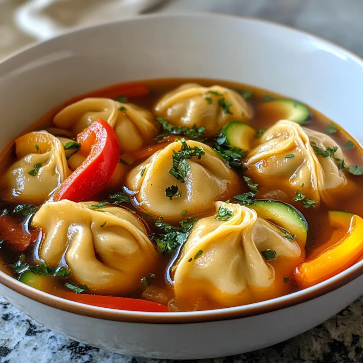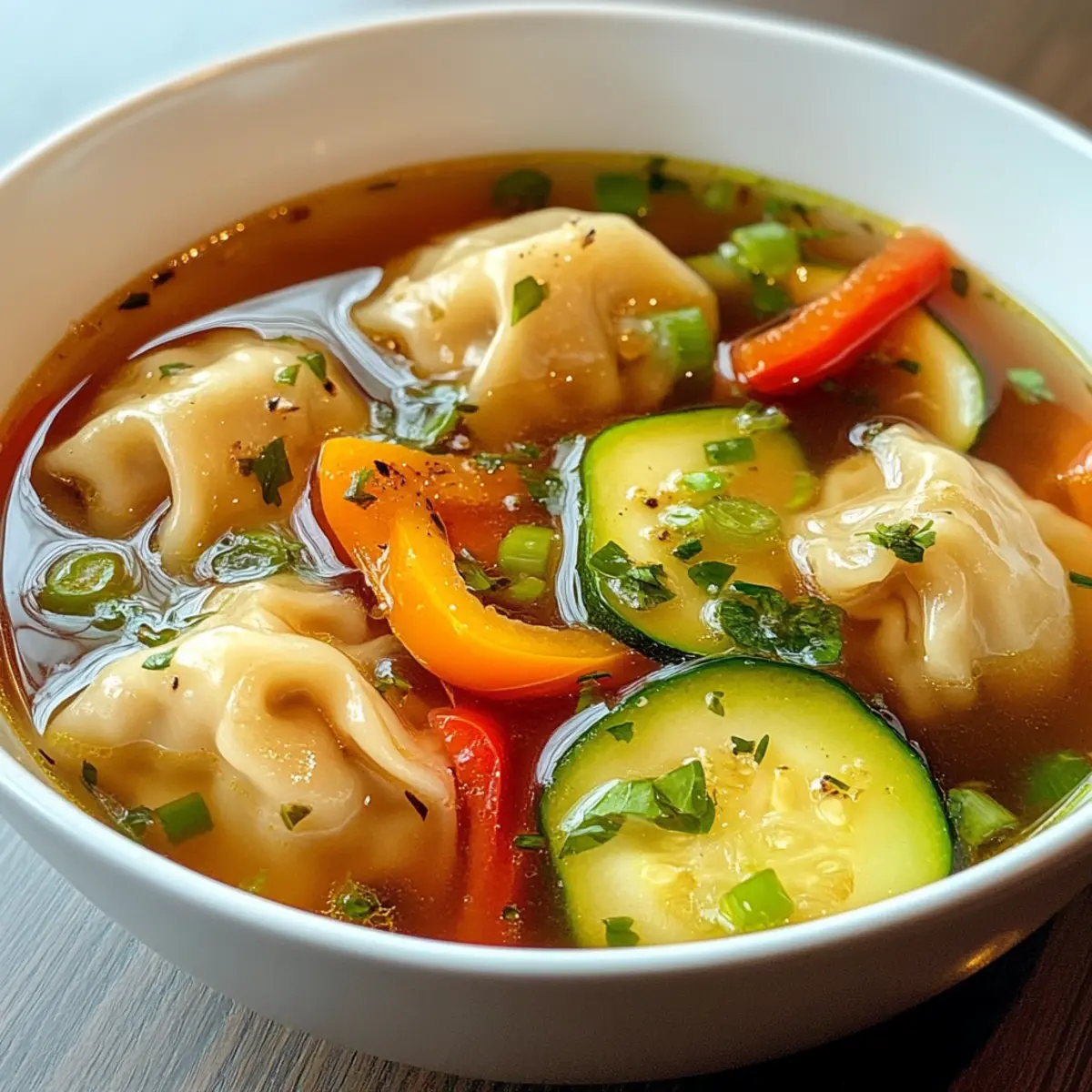 Jump to Recipe Print RecipeAs I rummaged through my pantry one chilly evening, I stumbled upon a package of potstickers that had been waiting for their moment in the spotlight. This discovery inspired me to whip up a cozy delight: Potsticker Soup. This fast and easy dish features tender dumplings swimming in a rich, aromatic broth—perfect for those busy weeknights when you crave something heartwarming but don’t want to spend hours in the kitchen. Not only is it customizable to suit your taste buds with an array of veggies or proteins, but it also promises a comforting experience that will leave you feeling satisfied. Are you ready to transform your weeknight meals? Let’s dive into this deliciously simple recipe! Why is Potsticker Soup a must-try? Comforting in every way, this Potsticker Soup is your new go-to for cozy evenings! Quick and easy, it’s ready in under 30 minutes, perfect for those hectic weeknights. Customizable to fit any palate, you can mix in your favorite veggies or proteins, ensuring every bowl is uniquely yours. Crowd-pleaser at its best, this dish will impress family and friends alike. Try it alongside some Asian-style salad for a fresh twist! Don’t miss out on the warmth and flavor packed into this delightful soup. Potsticker Soup Ingredients For the Potstickers • Potstickers – the star of the soup, choose from various fillings like chicken, pork, shrimp, or vegetables for an enjoyable bite. For the Broth • Broth (Vegetable or Chicken) – provides a rich base; using low-sodium options can enhance your dish without the extra salt. • Soy Sauce – adds depth and umami to your potsticker soup; opt for low-sodium to keep it healthy. For Added Nutrition • Vegetables (e.g., Bell Peppers, Zucchini, Snap Peas, Corn) – fresh veggies boost nutrition and flavor; feel free to swap in your favorites! To Thicken the Soup • Cornstarch – create a slurry to deliver a perfectly thickened broth that clings to your cheerful dumplings. For Flavor Enhancement • Kombu, Shiitake Mushrooms, or Miso Paste – these optional ingredients can elevate your broth, giving it a wonderfully rich taste. Transform your weeknight dinners into something truly delicious with this comforting potsticker soup — it’s a delightful meal that unites simplicity with flavor! Step‑by‑Step Instructions for Potsticker Soup Step 1: Prepare the Broth In a large pot, pour in 6 cups of vegetable or chicken broth and bring it to a gentle simmer over medium heat. Allow the broth to warm up for about 5 minutes, watching for small bubbles forming on the surface. This fragrant base will set the stage for your comforting Potsticker Soup. Step 2: Add Potstickers and Vegetables Once the broth is simmering beautifully, carefully add your potstickers along with your choice of chopped vegetables, such as bell peppers and zucchini. Avoid excessive stirring to keep the potstickers intact. Let these ingredients simmer together for another 5–7 minutes, until the potstickers are tender and heated through. Step 3: Thicken the Soup To achieve the perfect consistency in your Potsticker Soup, mix 1 tablespoon of cornstarch with 2 tablespoons of cold water to create a slurry. Gradually pour this mixture into the simmering broth, stirring gently to combine. Allow the soup to cook for an additional 1–2 minutes, until it thickens slightly and clings lovingly to the dumplings. Step 4: Adjust Seasoning After thickening, taste your savory concoction and adjust the seasoning with about 2 tablespoons of soy sauce for a boost of umami flavor. If desired, add a bit more broth or water to reach your preferred taste and consistency. Give the soup a gentle stir to ensure the flavors meld together, creating a rich and satisfying Potsticker Soup. Step 5: Serve and Enjoy Ladle your warm and comforting Potsticker Soup into bowls, ready to be savored! For an extra touch, consider serving it with a side of steamed rice or crispy wonton strips. This delightful meal is perfect for cozy evenings, providing a delicious, ready-to-enjoy bowl of comfort that’s rich in flavor and warmth. What to Serve with Potsticker Soup? Complete your comforting bowl of Potsticker Soup with delightful side dishes and refreshing drinks that enhance your meal experience. Steamed Rice: This simple yet perfect pairing absorbs the rich broth, making every bite more satisfying. A fluffy side of rice complements the soup’s flavor, helping to round out the meal. Crispy Wonton Strips: Add a delightful crunch with wonton strips, enhancing the texture of your warm soup. These crispy delights provide a delightful contrast to the tender potstickers and silky broth. Asian-Style Salad: A fresh salad with a tangy ginger dressing brightens up the meal, adding vibrant flavors. Crisp vegetables, like cucumber and carrots, can offer a refreshing balance to the warmth of the soup. Pickled Ginger: Serving pickled ginger alongside provides a sweet-tart zing that cleanses the palate. Its bright notes can brighten up the flavors, inviting each new bite of your potsticker soup. Chili Oil: Drizzle some chili oil over your soup for an extra kick and layer of flavor. The spiciness of the oil mingles beautifully with the comforting broth, igniting your taste buds. Green Tea: A warm cup of green tea adds a gentle, soothing element to your meal. Its earthy tones beautifully complement the flavors of the potsticker soup, creating a harmonious dining experience. Expert Tips for Potsticker Soup • Seal Perfectly: Ensure potstickers are well-sealed to prevent any filling leaks during cooking, keeping your soup flavorful. • Veggie Choices: Opt for vegetables that hold their texture well, like bell peppers and snap peas, to avoid mushiness in your Potsticker Soup. • Thickening Technique: Mix the cornstarch with cold water thoroughly for a smooth slurry; lumps can ruin the soup’s consistency, so stir well! • Timing Matters: Add potstickers just before serving to preven