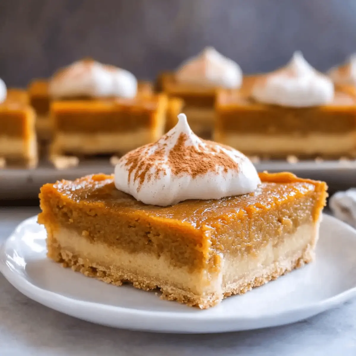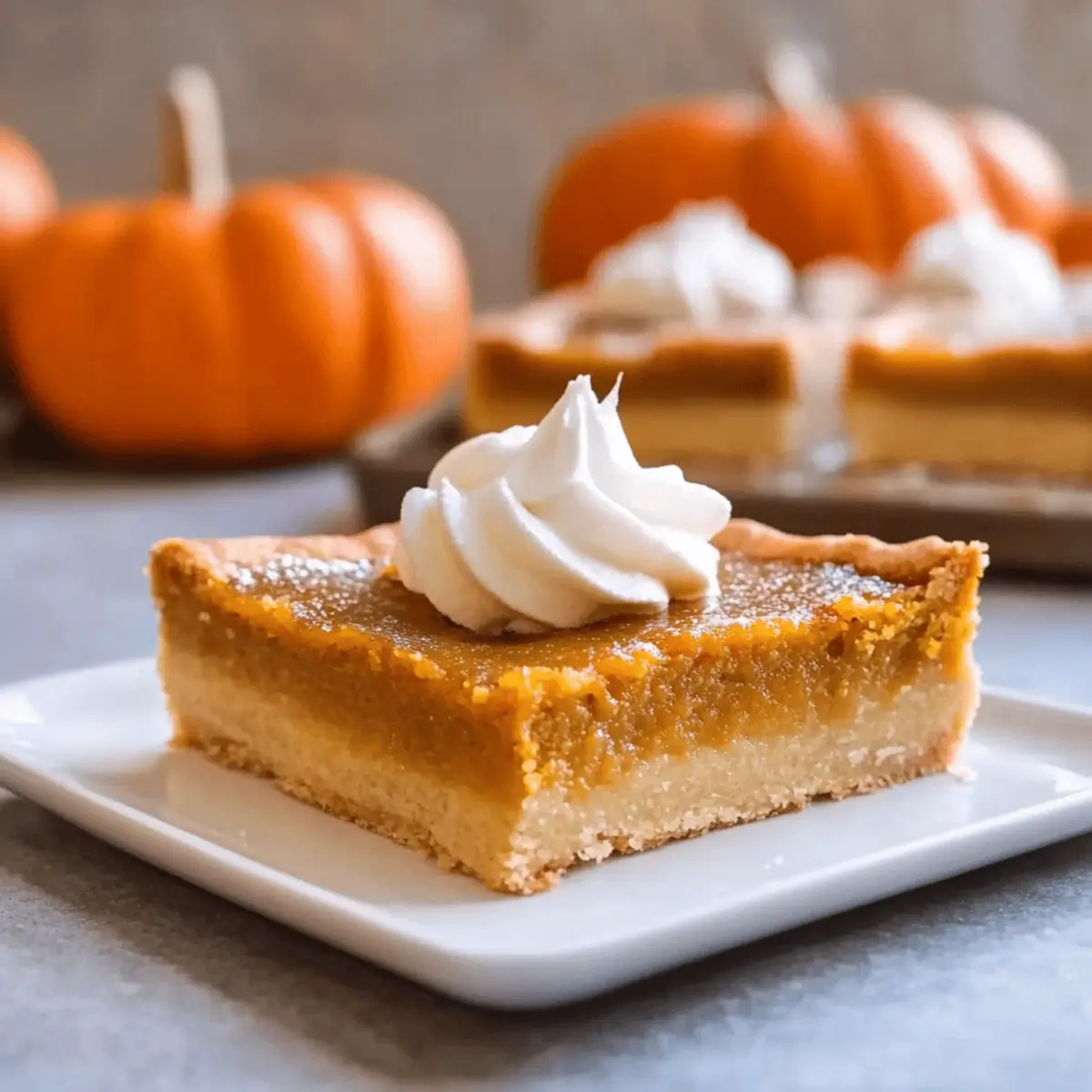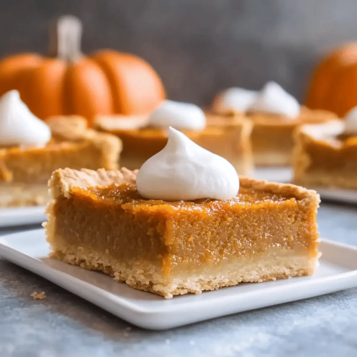 Jump to Recipe Print RecipeAs the leaves turn and the air gets crisp, the scent of baking spices beckons us back to the kitchen. These Pumpkin Pie Shortbread Bars strike the perfect balance between nostalgia and convenience, combining the rich, spiced pumpkin filling we cherish with a buttery, melt-in-your-mouth shortbread crust. Not only are they a delightful twist on traditional pumpkin pie, but they also offer a no-bake element that makes preparation a breeze. Ideal for Thanksgiving gatherings or cozy autumn evenings, these bars are guaranteed to be a crowd-pleaser, satisfying even the most discerning sweet tooth. Have you ever thought about how a simple dessert can evoke warm memories and create new ones? Let’s dive into creating these irresistible treats together! Why You’ll Crave These Bars Flavorful Fusion: Experience the delightful blend of a buttery shortbread crust and rich pumpkin filling that captures the essence of fall. No-Bake Ease: Enjoy the convenience of a recipe that’s as simple as it is scrumptious—perfect for those busy Thanksgiving prep days! Festive Crowd-Pleaser: With a well-loved flavor profile, these bars are sure to impress family and friends at any gathering. Customizable Touch: Want to jazz them up? Consider adding chocolate chips or a cream cheese layer for a personalized twist. These Pumpkin Pie Shortbread Bars are a must-try, especially alongside other seasonal favorites like Cider Pumpkin Waffles or Soft Pumpkin Pull Apart Rolls! Pumpkin Pie Shortbread Bars Ingredients For the Crust All-Purpose Flour – Provides structure to the crust; substitute with gluten-free flour for a gluten-free version. Cornstarch – Enhances the tenderness of the shortbread crust; no direct substitution needed. Salted Butter – Adds flavor and richness; use unsalted butter plus a pinch of salt if preferred. Sugar – Sweetens the crust; for a healthier option, consider using coconut sugar or reducing the quantity. Egg – Acts as a binder; can be replaced with a flax egg for a vegan alternative. Vanilla Extract – Enhances flavor; use vanilla bean paste for a more intense taste if desired. For the Filling Brown Sugar – Sweetens the pumpkin filling; light or dark brown sugar can be used interchangeably. Pumpkin Purée – The hero ingredient for flavor and texture; ensure it’s pure pumpkin purée, not pie filling. Salt – Balances sweetness and enhances flavor; essential for the filling, do not omit. Ground Cinnamon, Ginger, Nutmeg, Cloves – Adds warmth and depth; customize spice levels to your preference. Evaporated Milk – Adds creaminess to the filling; substitute with half cream and half milk for richness. For Serving Whipped Cream – Optional topping; can also use cream cheese frosting for a different flavor profile. Step‑by‑Step Instructions for Pumpkin Pie Shortbread Bars Step 1: Preheat Oven & Prepare Pan Begin by preheating your oven to 350°F (175°C). While the oven warms up, line a 9-inch square baking pan with aluminum foil, leaving some overhang for easy removal later. Lightly spray the foil-lined pan with cooking spray to prevent sticking. This initial setup is crucial for your Pumpkin Pie Shortbread Bars! Step 2: Make Shortbread Crust In a mixing bowl, combine all-purpose flour and cornstarch, whisking them together until well blended. In a separate large bowl, use a hand mixer to beat together the salted butter and sugar until creamy and smooth. Add the egg and vanilla extract, mixing until combined. Gradually fold in the flour mixture using a spatula until just incorporated. Press this dough firmly into the prepared pan, then prick the surface with a fork. Bake for 13-15 minutes until the edges are set and lightly golden. Step 3: Cool Crust Once the shortbread crust is out of the oven, take a moment to prick it with a fork again if any air bubbles have formed. Allow the crust to cool completely in the pan on a wire rack. This cooling step is essential as it will help your Pumpkin Pie Shortbread Bars maintain their shape when you pour in the filling. Step 4: Prepare Pumpkin Filling In a large mixing bowl, beat together the eggs and brown sugar until the mixture is light and fluffy. Slowly add the pumpkin purée and your chosen spices—cinnamon, ginger, nutmeg, and cloves—stirring gently. Next, gradually pour in the evaporated milk while mixing until everything is smooth. Be careful not to whisk aggressively to avoid incorporating air bubbles in the filling. Step 5: Bake Filling With the crust fully cooled, pour the creamy pumpkin filling over the crust, spreading it evenly with a spatula. Bake the assembled Pumpkin Pie Shortbread Bars in the oven for 45-50 minutes. You’ll know they’re done when the filling is set in the center and slightly puffed, with a gentle jiggle remaining. Step 6: Cool & Serve After baking, remove the bars from the oven and let them cool completely in the pan on a wire rack. Once cooled, carefully lift the bars out using the foil overhang and slice them into squares. For a delightful finishing touch, serve with a dollop of whipped cream on top, if desired, and enjoy these Pumpkin Pie Shortbread Bars! Make Ahead Options These Pumpkin Pie Shortbread Bars are perfect for meal prep, saving you time during busy holiday gatherings! You can prepare the shortbread crust up to 24 hours in advance; simply let it cool completely and store it tightly wrapped in the refrigerator to maintain its buttery texture. The pumpkin filling can also be mixed ahead of time and refrigerated for up to 3 days before pouring it into the crust. When you’re ready to serve, pour the filling over the crust and bake as directed. This method ensures your bars turn out just as delicious and fresh, allowing you to enjoy family time without the last-minute stress! Variations & Substitutions for Pumpkin Pie Shortbread Bars Feel free to let your creativity shine by customizing these delightful bars with your own personal twist! Gluten-Free: Subs