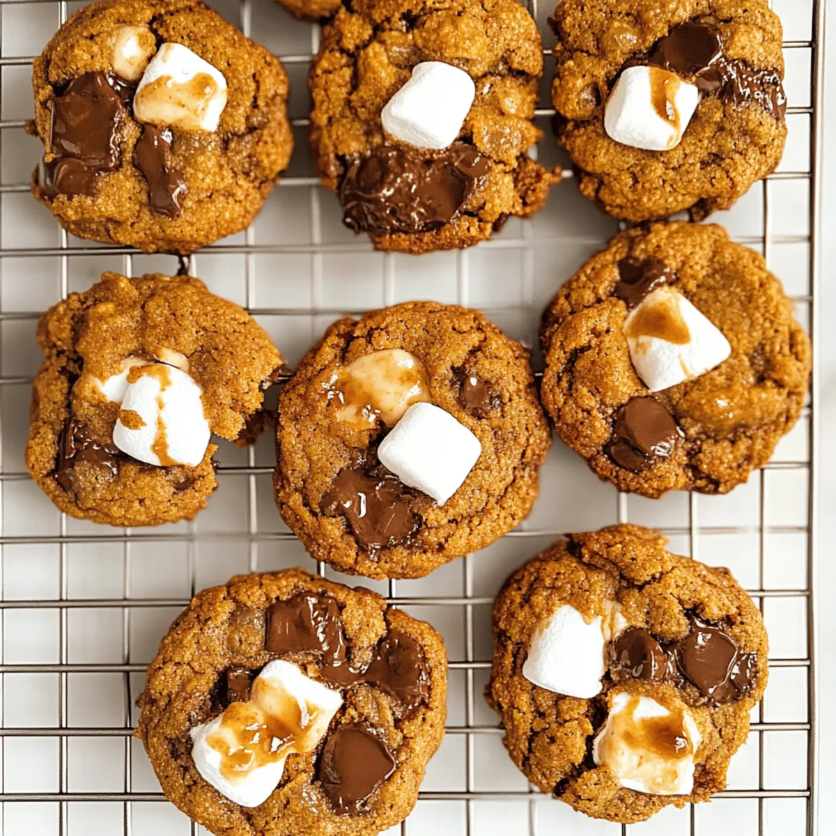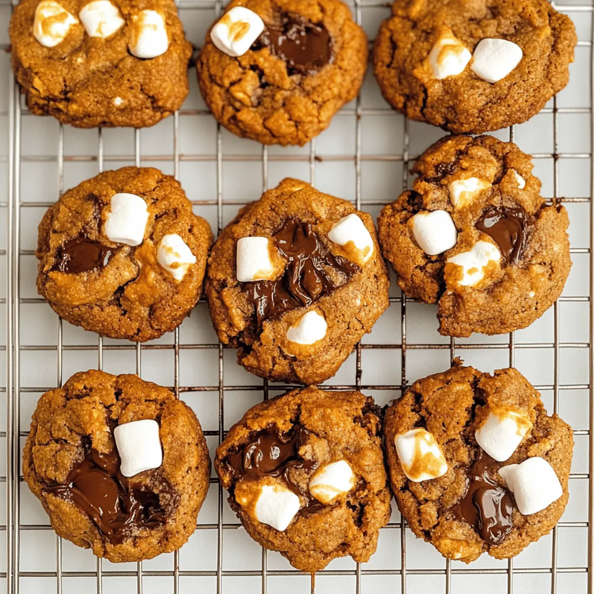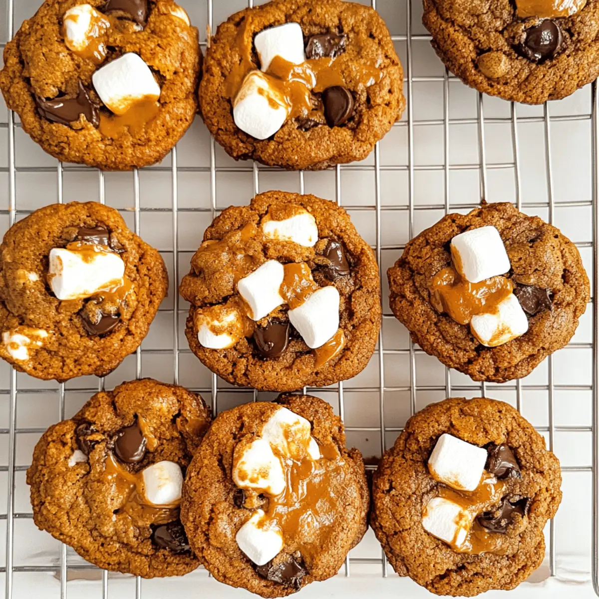 Jump to Recipe Print RecipeIt’s that magical moment when the warmth of autumn meets the sweetness of summer. Imagine biting into a Pumpkin S’mores Cookie, where the nostalgia of campfire evenings collides with the essence of pumpkin spice in every crumb. These gluten-free delights are not just another treat; they’re a heartfelt embrace on a chilly day. You’ll love how easy it is to whip them up—with just a handful of ingredients, you’ll create thin, crispy cookies with a delightful, gooey marshmallow and chocolate core. Plus, they’re lower in sugar, ensuring you can enjoy a bit of indulgence without the guilt. Ready to savor this cozy fusion? Let’s dive into the recipe and unleash the magic of Pumpkin S’mores Cookies! Why are Pumpkin S’mores Cookies special? Delightful Fusion: These cookies combine the cozy vibes of autumn with the playful essence of summer s’mores, making them irresistible year-round. Health-Conscious Treat: With gluten-free, low-sugar, and vegan options, they cater to various diets without compromising on flavor. Easy to Make: This straightforward recipe requires minimal ingredients, so you can whip them up anytime. Crowd-Pleasing: Perfect for gatherings, these cookies will impress friends and family just like our Cider Pumpkin Waffles or Soft Pumpkin Pull. Irresistible Texture: Crispy on the edges and soft in the center, each bite offers a perfect melt of chocolate and marshmallow. Customizable: Feel free to add nuts or spice up the flavor with more pumpkin pie spice—creativity is encouraged! Pumpkin S’mores Cookies Ingredients • Here’s everything you need to make these delightful treats! For the Cookie Base Creamy Unsweetened Almond Butter – Provides moisture and richness; substitute with tahini or sunbutter if nut allergies are a concern. Light Brown Sugar – Adds sweetness and moisture; can be swapped with coconut sugar for a lower glycemic index. Egg – Binds the ingredients together and helps in rising; use a flax egg (1 tablespoon ground flaxseed + 2.5 tablespoons water) for a vegan option. Pumpkin Puree – Contributes flavor and moisture; both canned or homemade options work perfectly. Vanilla Extract – Enhances flavor; no substitutes are necessary. Almond Flour – Acts as the primary flour ingredient, ensuring the cookies remain gluten-free; can be replaced with gluten-free all-purpose flour for a different texture. Pumpkin Pie Spice – Provides that warm, cozy spice flavor; feel free to create your own mix with cinnamon, nutmeg, and ginger. Baking Soda – Helps the cookies rise and adds a light texture. Salt – Balances the flavors; no substitutions necessary. For the Filling Vegan Mini Marshmallows – Adds gooey texture without committing to a melt; be sure to avoid regular marshmallows to keep it gluten-free. Semi-Sweet Chocolate Chips or Chunks – Offers sweetness and richness; opt for dark chocolate chips for a healthier twist. Now that you have all the ingredients handy, you’re just steps away from creating the most scrumptious Pumpkin S’mores Cookies! Let’s keep the magic going in your kitchen. Step‑by‑Step Instructions for Pumpkin S’mores Cookies Step 1: Preheat the Oven Begin by preheating your oven to 375°F (190°C). While the oven warms up, line a baking sheet with parchment paper. This will help the cookies bake evenly and prevent sticking. Make sure your baking sheet is ready, as you’ll need it shortly for the delicious Pumpkin S’mores Cookies. Step 2: Mix Wet Ingredients In a large mixing bowl, combine 1 cup of creamy unsweetened almond butter, ¾ cup of light brown sugar, ½ cup of pumpkin puree, 1 teaspoon of vanilla extract, and 1 egg (or flax egg for a vegan option). Use a sturdy whisk or spatula to mix until the ingredients are well blended and smooth, which should take about 2-3 minutes. Step 3: Combine Dry Ingredients In a separate bowl, whisk together 2 cups of almond flour, 1 teaspoon of pumpkin pie spice, ½ teaspoon of baking soda, and a pinch of salt. Ensure there are no lumps in the dry mixture for a consistent cookie texture. This step is essential for achieving the perfect balance of flavors in your Pumpkin S’mores Cookies. Step 4: Mix Wet and Dry Ingredients Slowly pour the dry mixture into the wet ingredients, stirring gently until fully combined. Make sure there are no dry pockets left in the dough. Once well mixed, fold in 1 cup of semi-sweet chocolate chips or chunks for that rich chocolate flavor, ensuring even distribution throughout the dough. Step 5: Shape the Dough Using a cookie scoop or tablespoon, portion out the dough onto the prepared baking sheet, placing them about 2 inches apart. For that signature s’mores twist, add 2-3 vegan mini marshmallows on top of each cookie dough mound. This will create a delightful gooey center as they bake, making your Pumpkin S’mores Cookies something special. Step 6: Add Extra Chocolate If you desire a more indulgent treat, feel free to sprinkle additional chocolate chips on top of the cookies before baking. This little step adds extra richness and charm to your Pumpkin S’mores Cookies, making them irresistibly delicious. Step 7: Bake the Cookies Place the baking sheet in the preheated oven and bake for 10-12 minutes. Keep an eye on the edges, which should turn a light golden brown. Once done, the center will still appear soft but will firm up as they cool; this ensures the perfect chewy texture for your Pumpkin S’mores Cookies. Step 8: Cool and Serve Remove the baking sheet from the oven and allow the cookies to cool on the pan for about 5 minutes. This resting time is crucial for the cookies to set and develop a delicious texture. Afterward, transfer the cookies to a wire rack to cool completely. Dive into these delightful treats once they’re warm! Expert Tips for Pumpkin S’mores Cookies Choose the Right Marshmallows: Use vegan mini marshmallows for best results; regular ones will melt completely and lose thei