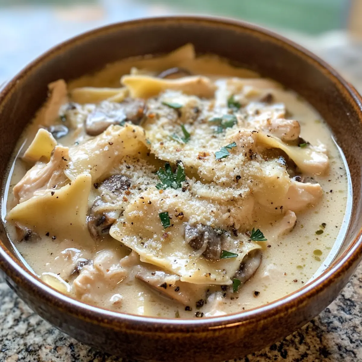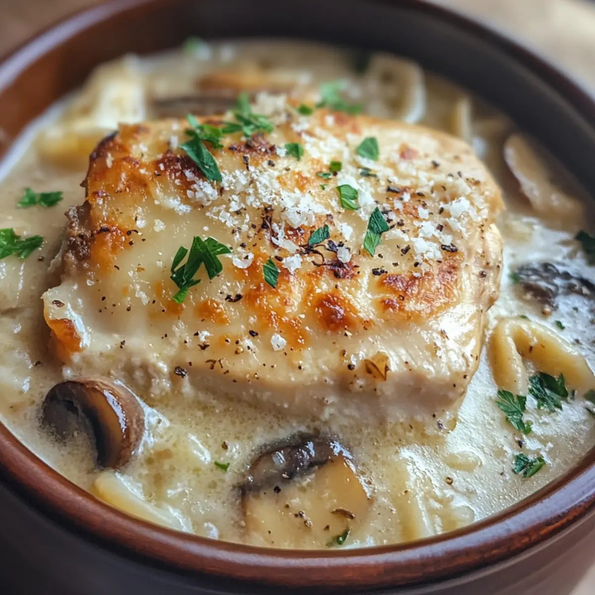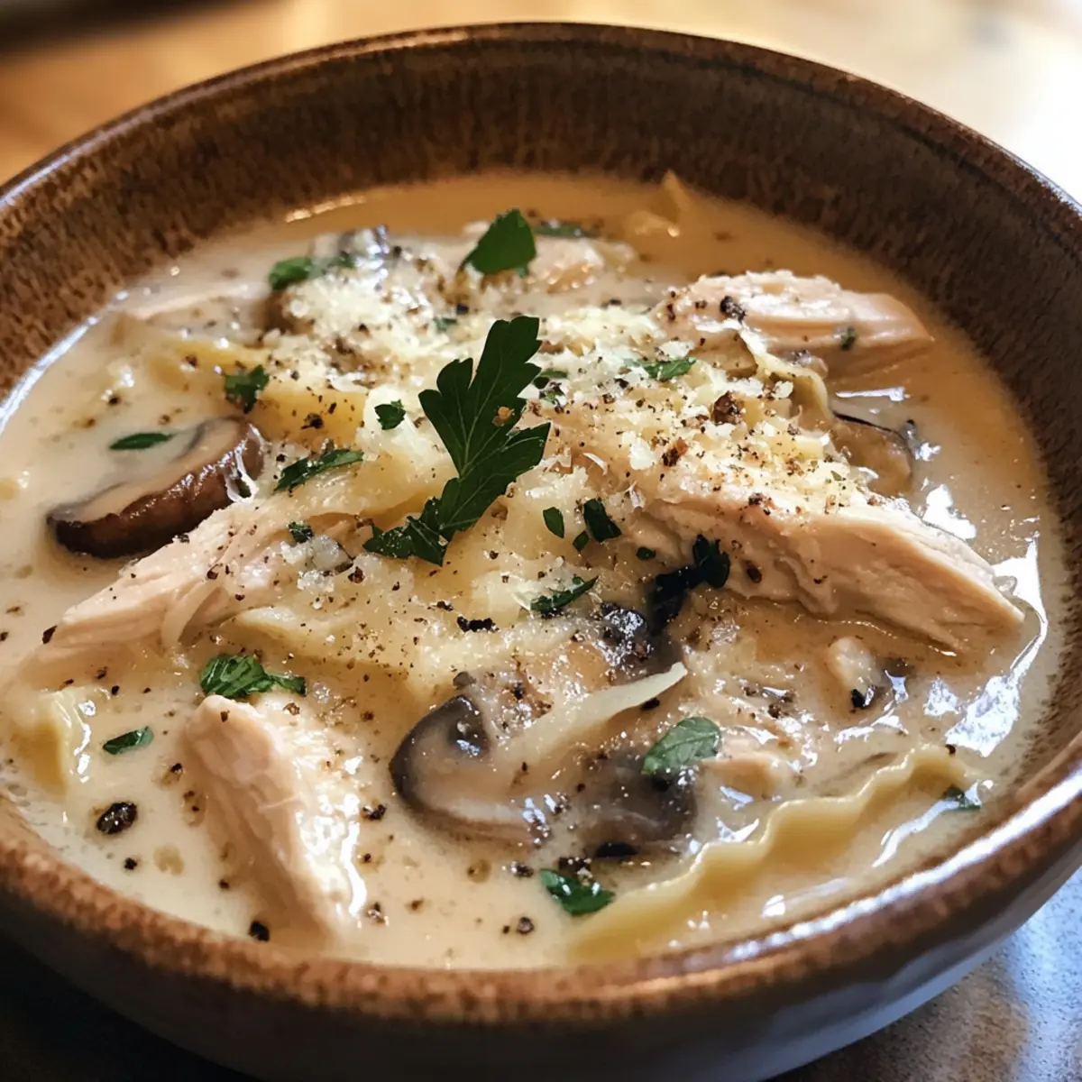 Jump to Recipe Print RecipeAs I stood in my kitchen, the delectable aroma of roasted garlic began to envelop my senses, instantly transporting me to my favorite family dinners. This is the magic behind my Roasted Garlic White Chicken Lasagna Soup—a cozy, creamy gem that transforms classic lasagna into a delightful bowl of warmth. Not only is it a hearty hug for the coldest nights, but it also brings the joy of quick prep—taking less than 45 minutes from start to finish. Perfect for feeding hungry families, it adapts easily to meet dietary needs, whether you’re looking for a vegetarian twist or a way to use up leftover chicken. Ready to whip up a comforting meal that will leave everyone asking for seconds? Let’s dive into this delicious recipe! Why is this soup a must-try? Comforting Warmth: Each spoonful of this Roasted Garlic White Chicken Lasagna Soup provides warmth on chilly evenings, making it a perfect family favorite. Rich, Creamy Flavor: The creamy blend of Alfredo sauce and roasted garlic creates a luxurious taste that will have your taste buds dancing. Quick Prep: In under 45 minutes, you’ll have a nourishing meal ready, perfect for busy weeknights or unexpected guests! Versatile Options: Easily make it vegetarian or adjust based on your pantry staples—try substituting chicken with canned chickpeas for a delicious twist. Family-Approved: This dish is guaranteed to impress all ages, just like our delightful White Mushroom Lasagna. Perfect Pairing: Serve alongside garlic bread or a crunchy salad for a well-rounded dinner that everyone will love! Roasted Garlic White Chicken Lasagna Soup Ingredients • Gather these delightful ingredients for a flavorful experience! For the Soup Base Roasted Garlic – Adds a deep, rich flavor; use store-bought for convenience or roast your own for a fresher taste. Olive Oil – Perfect for sautéing; it provides richness and depth to the soup. Chicken Breast – The protein star; can be precooked or canned for a quick shortcut. Mushrooms (Baby Bella or White) – Enhance texture and flavor; sauté until golden for the best taste. For the Creamy Sauce Alfredo Sauce – Creates that luscious creaminess; homemade or store-bought works great! Half & Half – Boosts creaminess; substitute with heavy cream or milk for a lighter option. For the Noodles and Seasoning ad Lasagna Noodles – The heart of the soup; swap for short pasta shapes like farfalle or rotini if desired. Nutmeg – Adds warmth and depth; optional based on your personal taste. Salt & Pepper – Essential for seasoning; adjust to elevate the overall flavor. For the Finishing Touches Parmesan Cheese – A delightful garnish that introduces an extra layer of flavor; fresh or pre-grated is both lovely! This delightful Roasted Garlic White Chicken Lasagna Soup is just waiting to sweep you off your feet with its cozy flavors! Step‑by‑Step Instructions for Roasted Garlic White Chicken Lasagna Soup Step 1: Roast the Garlic Preheat your oven to 375°F (190°C). Slice the top off a head of garlic, drizzle with olive oil, and wrap it tightly in foil. Place in the oven for about 45-55 minutes, until the cloves are soft and golden. This will infuse your Roasted Garlic White Chicken Lasagna Soup with a deliciously rich flavor. Step 2: Sauté the Mushrooms In a large Dutch oven, heat a tablespoon of olive oil over medium heat. Add in your sliced mushrooms and sauté for about 5-7 minutes, stirring occasionally, until they turn golden brown. This step adds depth to your Roasted Garlic White Chicken Lasagna Soup, creating a savory base that enhances the overall taste. Step 3: Cook the Chicken After the mushrooms are nicely browned, add diced chicken breast to the pot. Cook for approximately 5-8 minutes, stirring frequently, until the chicken is golden and fully cooked through. This step builds heartiness in your Roasted Garlic White Chicken Lasagna Soup, making it comforting for any family meal. Step 4: Blend in the Creamy Sauce Once the chicken is cooked, squeeze the roasted garlic cloves out of their skins and stir them into the pot. Pour in the Alfredo sauce and half & half, mixing well until the soup is thick and creamy, which should take about 3-4 minutes. This richness will elevate your Roasted Garlic White Chicken Lasagna Soup to new heights of flavor. Step 5: Add the Noodles Break the cooked lasagna noodles into bite-sized pieces and stir them into the soup, allowing them to soak up all that creamy goodness. Cook for an additional 2-3 minutes to heat through. The noodles will add a delightful texture to your Roasted Garlic White Chicken Lasagna Soup, making it a satisfying dish for everyone. Step 6: Season to Perfection Finally, season your Roasted Garlic White Chicken Lasagna Soup with salt, pepper, and a pinch of nutmeg, if desired. Taste and adjust the seasoning as needed. This last step ensures each spoonful is bursting with flavor, perfect for comforting nights around the dinner table. Step 7: Serve and Garnish Ladle the soup into bowls and finish with a sprinkle of freshly grated Parmesan cheese for added flavor. Serve warm, perhaps alongside garlic bread or a crunchy salad, to create a delightful and satisfying meal. Enjoy your homemade Roasted Garlic White Chicken Lasagna Soup! Tips for the Best Roasted Garlic White Chicken Lasagna Soup Noodle Texture: Cook noodles separately and add them just before serving to prevent mushiness when reheating. This keeps your Roasted Garlic White Chicken Lasagna Soup delightful for days. Creamy Consistency: Blend half the soup mixture if you prefer a thicker texture. This can really enhance the richness and makes every spoonful extra creamy. Flavor Boost: Don’t skip the nutmeg! Just a pinch adds warmth and depth; remember to taste and adjust your seasonings for a perfect balance. Freezer Friendly: If you plan to freeze the soup, store the noodles and soup separately. This will maintain the noodles’ texture, ensuring your Roasted Ga