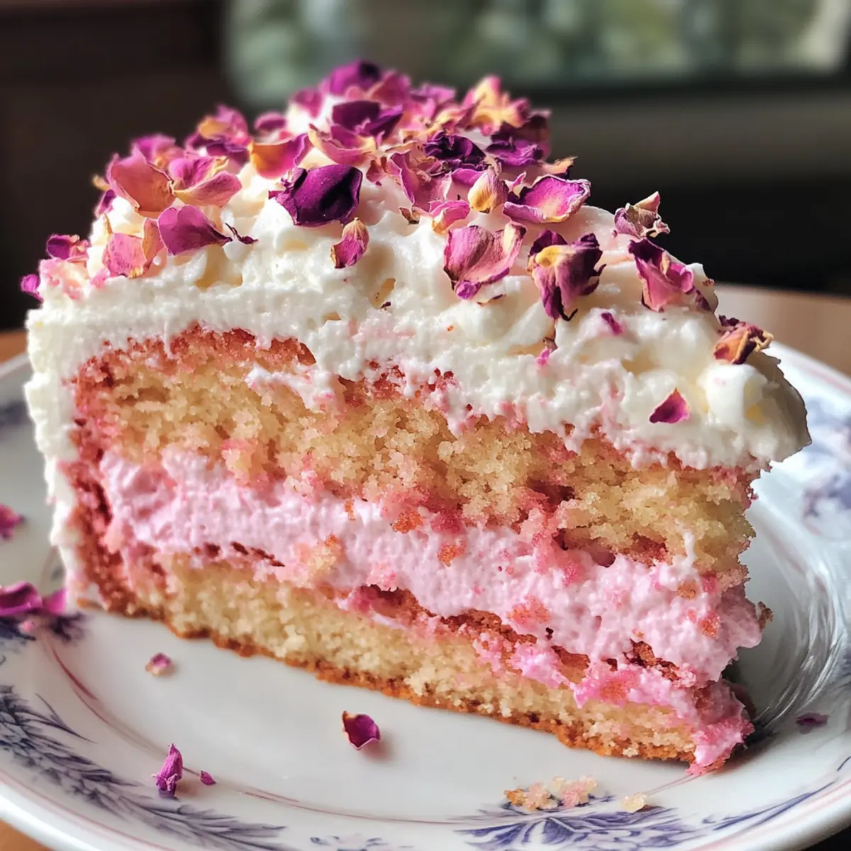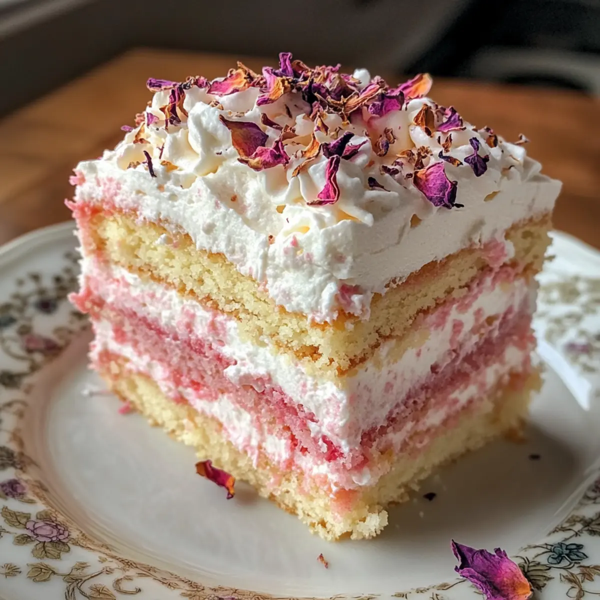 Jump to Recipe Print RecipeAs I stood in my kitchen, the aromatic scent of fresh roses wafted through the air, transforming my simple baking session into something magical. This Soft and Fluffy Rose Poke Cake captures that enchanting feeling, offering a delightful twist on a classic dessert. Infused with delicate rose flavor and drizzled with a milky rose mixture, this cake promises to be a showstopper that’s oh-so-moist and fluffy. Not only is it easy to whip up using pantry staples, but it also creates an elegant centerpiece for any gathering or intimate dinner. And let’s not overlook that luscious whipped cream frosting—it’s the cherry on top of this delightful creation! Are you ready to elevate your dessert game and impress everyone with this stunning cake? What Makes This Cake So Special? Delightful flavors: The fragrant infusion of rosewater creates a unique dessert experience that elevates any occasion. Effortless elegance: This cake is simple to make yet looks impressively sophisticated, making it a perfect choice for gatherings. Moist and fluffy: Soaked in a milky rose mixture, each bite delivers an incredibly tender texture that’s hard to resist. Versatile presentation: Dress it up with fresh or dried roses for a stunning finish, or try variations like adding citrus zest for a fresh spin. Perfect pairing: Serve it with herbal tea or as a sweet addition to brunch, making it the ideal dessert for a memorable meal. You might also enjoy trying variations of this delightful cake like Lemon Blueberry Cake or the indulgent Brownie Refrigerator Cake for your next get-together! Rose Poke Cake Ingredients For the Cake Cake Flour – Essential for structure and light texture; replace with all-purpose flour if desired, but the cake may be denser. Baking Powder – Provides leavening to make the cake rise; monitor the expiration date for effectiveness. Salted Butter – Adds moisture and rich flavor; unsalted butter can be used, but add a pinch of salt to the recipe. Granulated Sugar – Sweetener that helps create a tender cake; can be substituted with a sugar alternative based on preference. Vegetable Oil – Adds moisture and softness to the cake; can be replaced with melted coconut oil or melted butter for a different flavor. Eggs – Bind the ingredients and provide structure; use room temperature eggs for better incorporation. Buttermilk – Contributes to moisture and acidity, enhancing tenderness; regular milk mixed with vinegar can serve as a substitute. Rosewater – Provides the signature rose flavor; adjust to taste for more or less intensity. Pink Pitaya Powder (optional) – For color enhancement; can be omitted or substituted with similar food coloring. For the Soaking Liquid Sweetened Condensed Milk – Acts as a soaking liquid that keeps the cake moist; can be swapped with a dairy-free alternative for lactose-intolerant individuals. For the Frosting Heavy Whipping Cream – Needed to create the fluffy topping; non-dairy whipping alternatives may also be used. Powdered Sugar – Sweetens the whipped cream and adds stability; use less if you prefer a less sweet topping. For Decoration Dried or Fresh Roses – Optional decorative element that enhances presentation and ties into the rose theme. With these simple ingredients, you’re on your way to creating a stunning Rose Poke Cake that’s sure to impress your guests! Step‑by‑Step Instructions for Rose Poke Cake Step 1: Preheat the Oven Start by preheating your oven to 350°F (180°C). Meanwhile, grease a 9×13 inch cake pan with butter or non-stick spray to ensure that your Soft and Fluffy Rose Poke Cake releases effortlessly after baking. This initial preparation sets the stage for a perfectly baked cake with a golden top. Step 2: Prepare the Dry Ingredients In a medium mixing bowl, whisk together 2 cups of cake flour, 2 teaspoons of baking powder, and optional pink pitaya powder. This mixture not only provides structure but also gives you a beautiful color. Set this bowl aside, allowing the leavening agents to blend with the flour, creating a fluffy texture for your cake. Step 3: Cream the Butter and Sugar In a large mixing bowl, beat ½ cup of softened salted butter with 1 cup of granulated sugar and ¼ cup of vegetable oil. Use an electric mixer on medium speed for about 3 minutes, until the mixture is light and fluffy. This step incorporates air, vital for achieving a tender Soft and Fluffy Rose Poke Cake. Step 4: Add the Eggs Add 3 large room temperature eggs to the butter and sugar mixture, one at a time. Beat well after each addition, scraping down the bowl as needed. This ensures proper incorporation, giving your cake the ideal structure. The mixture should become smoother and creamier as you go. Step 5: Combine Dry Ingredients With Wet Mixture Mix half of the dry flour mixture into the creamed ingredients until just combined. Then, add 1 cup of buttermilk and 2 teaspoons of rosewater, stirring thoroughly to incorporate. This combination enhances the cake’s moisture and adds that unforgettable rose flavor that makes this cake special. Step 6: Complete the Batter Add the remaining dry ingredients to the batter and mix gently until smooth. Be careful not to overmix, which can lead to a dense texture. The batter should be thick and creamy, with no visible flour pockets. This will lead to a soft and fluffy outcome for your Rose Poke Cake. Step 7: Bake the Cake Carefully pour the batter into the prepared cake pan, spreading it evenly with a spatula. Place it in your preheated oven and bake for 30-35 minutes. To check for doneness, insert a toothpick into the center; it should come out clean or with a few moist crumbs attached—this signals a perfectly baked cake. Step 8: Poke Holes in the Cake Once out of the oven, let the cake cool for about 10 minutes. Use a wooden spoon handle to poke holes all over the top of the cake. This will allow the milky rose mixture to penetrate the cake, keeping it moist and